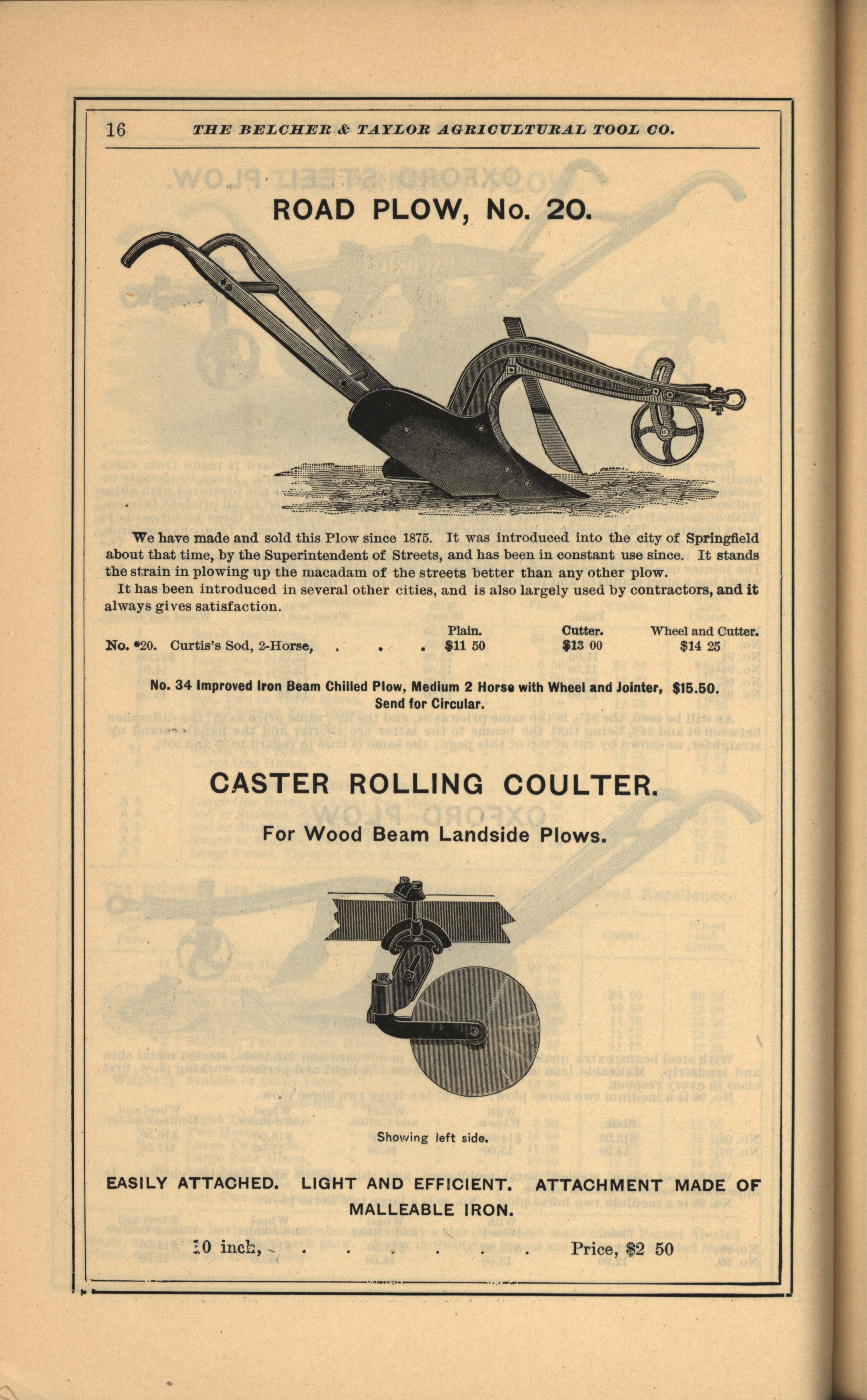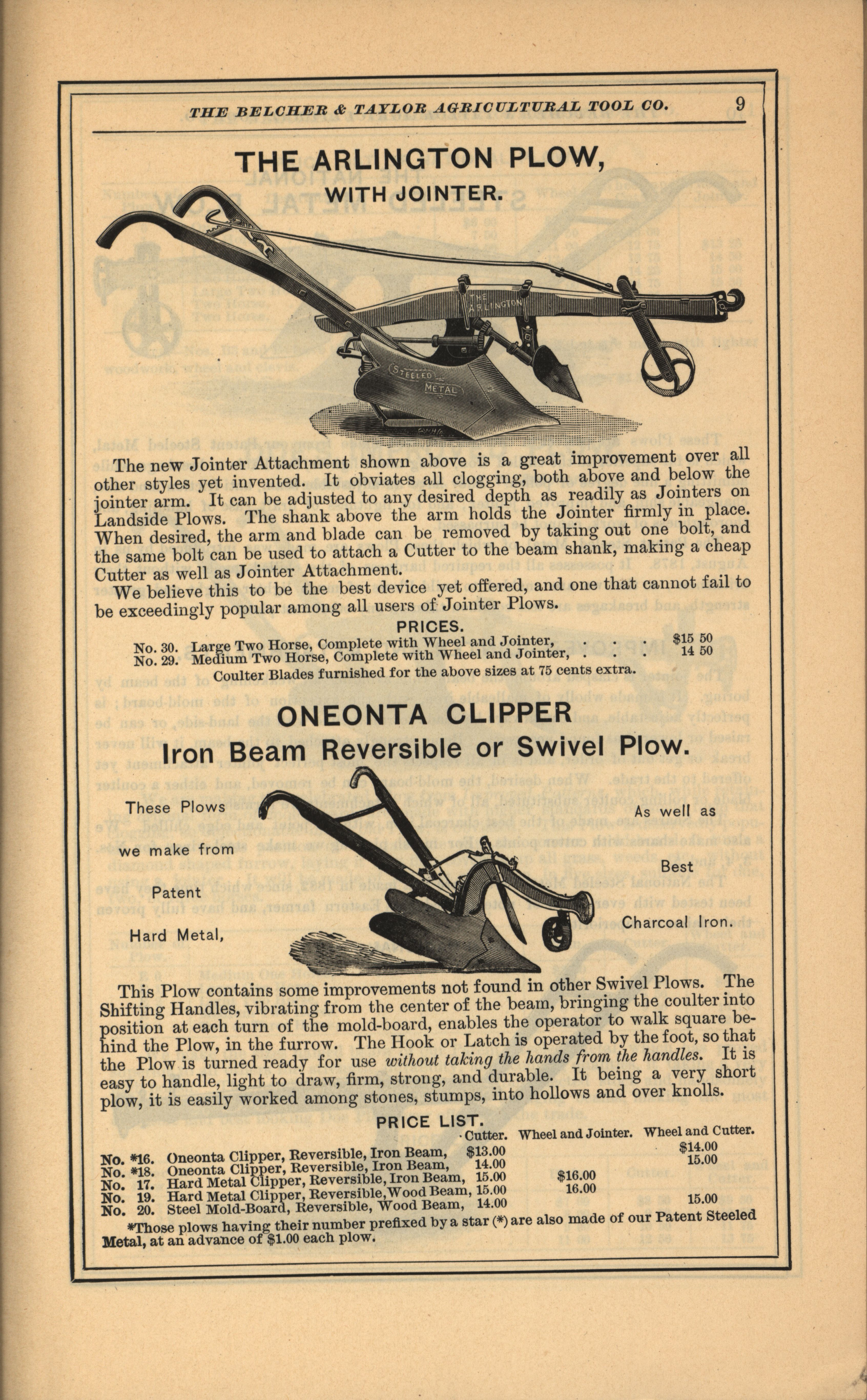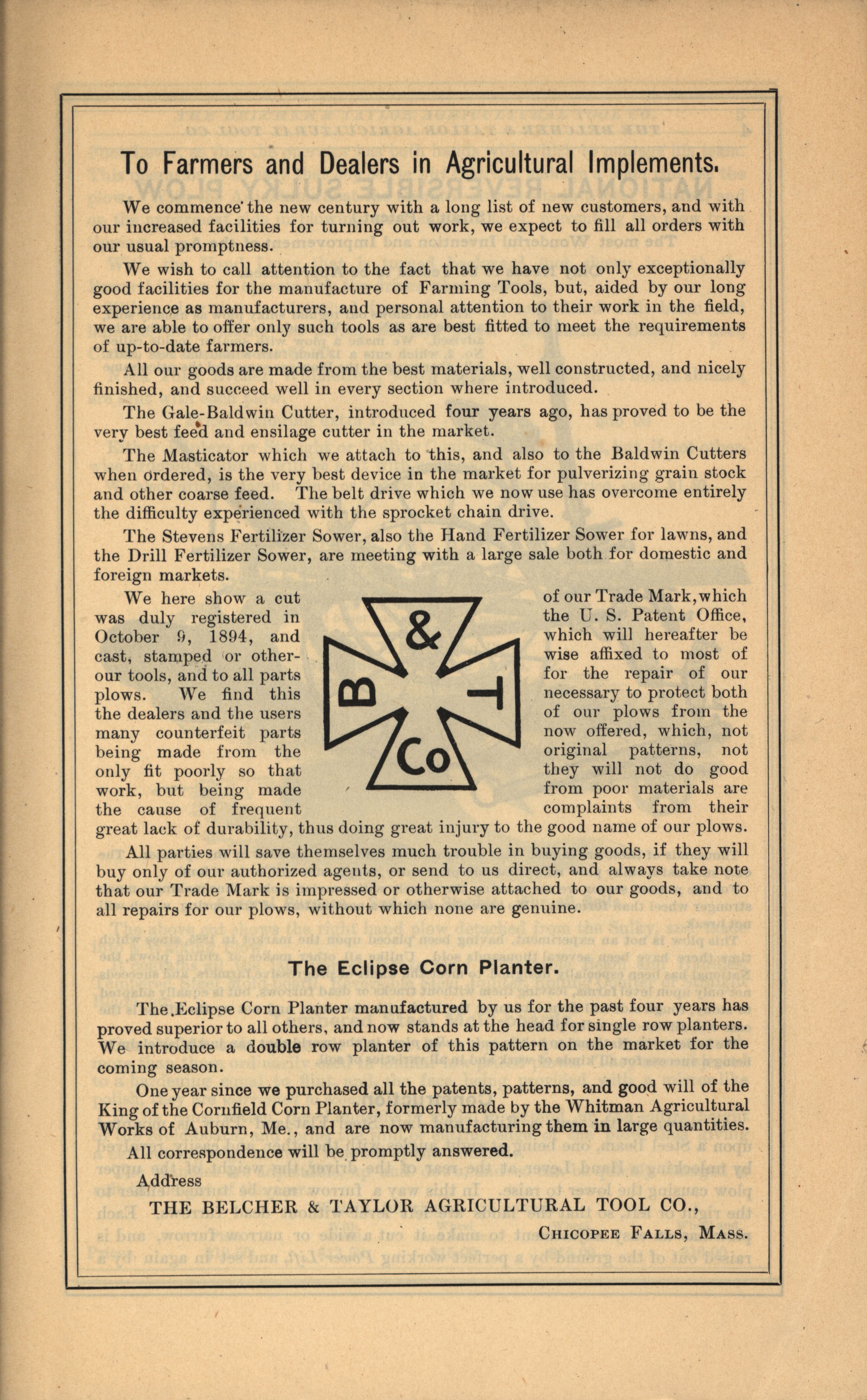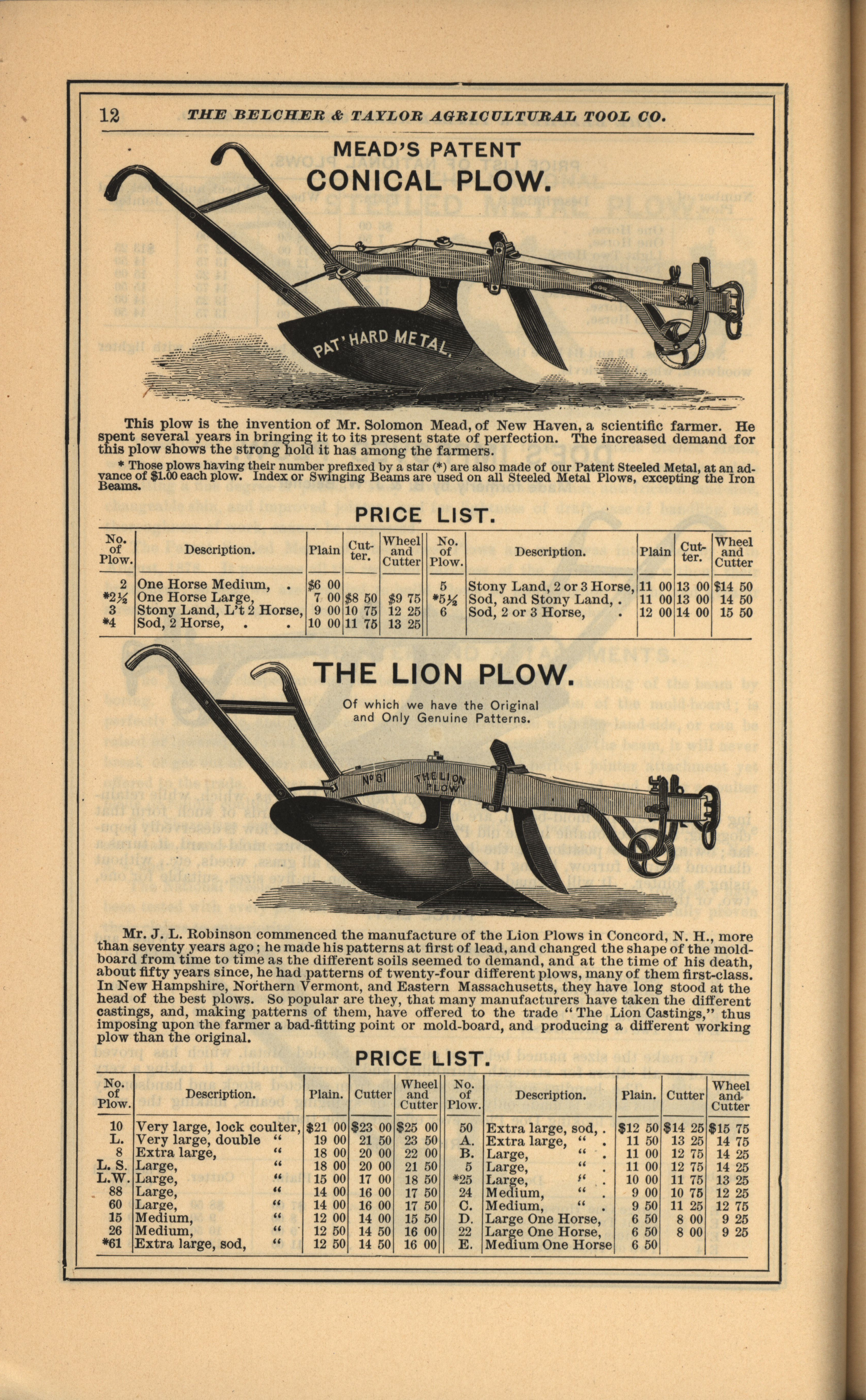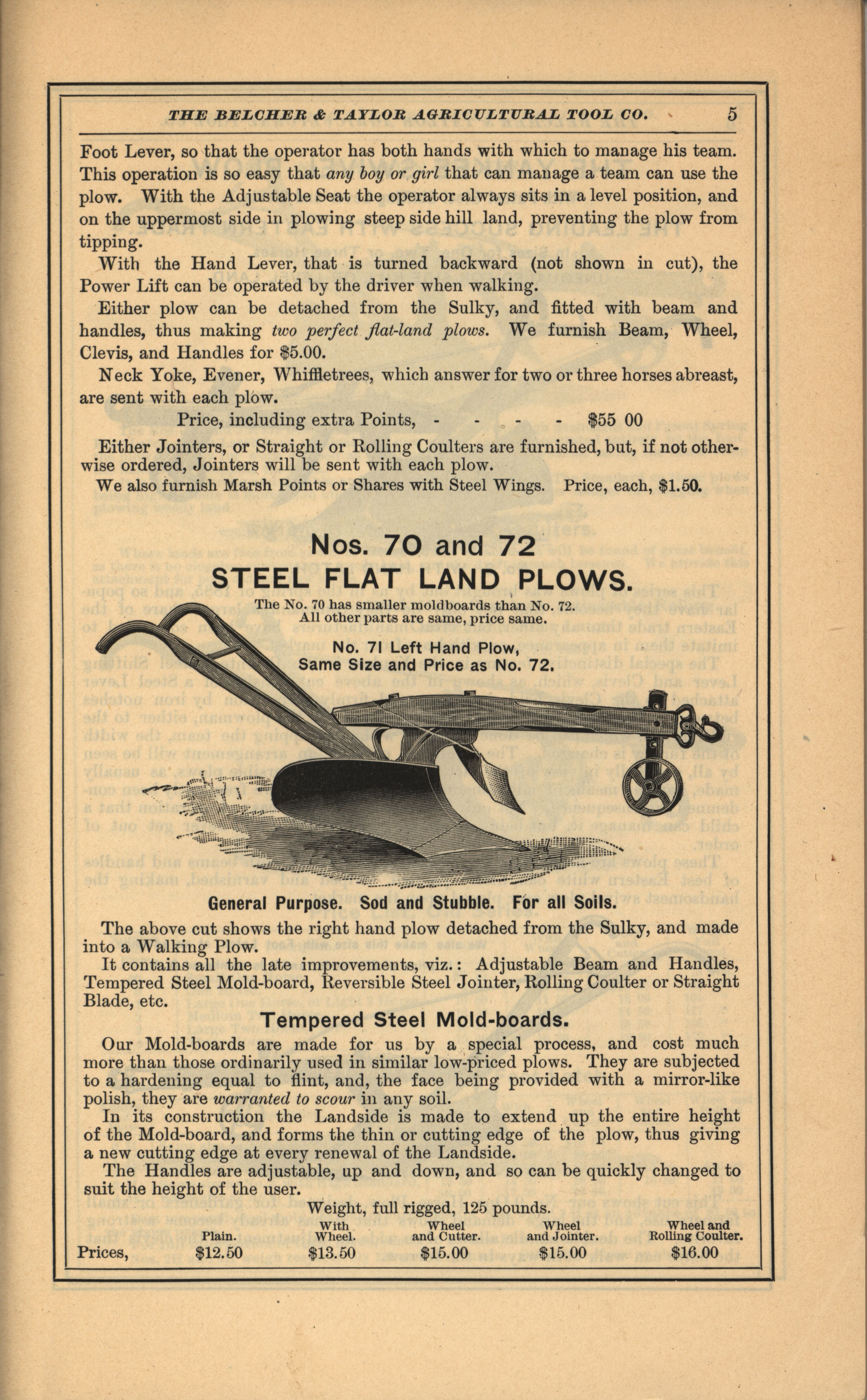 - Catalog describing agricultural products offered by the Belcher and Taylor Agricultural Tool Company, includes illustrations.