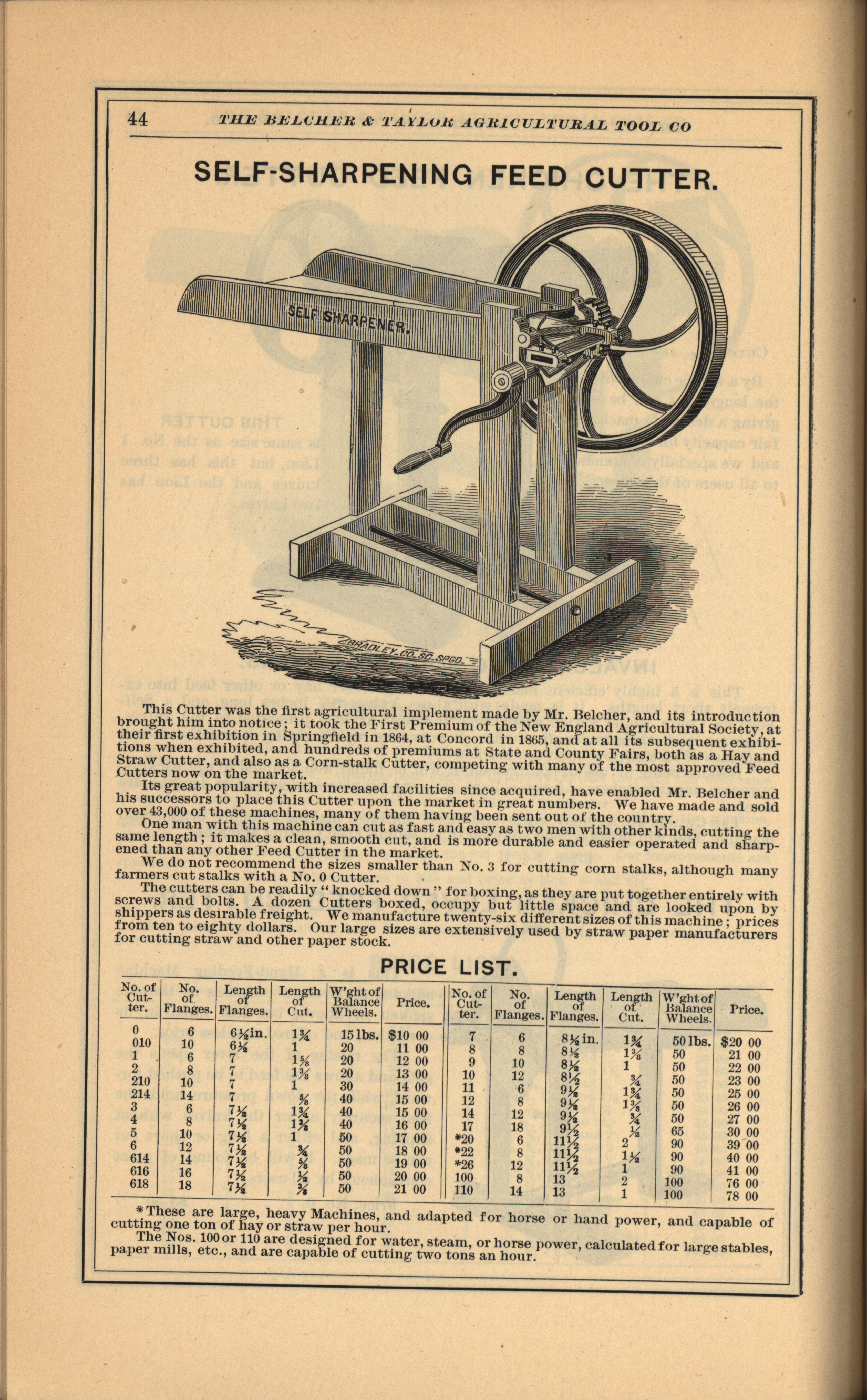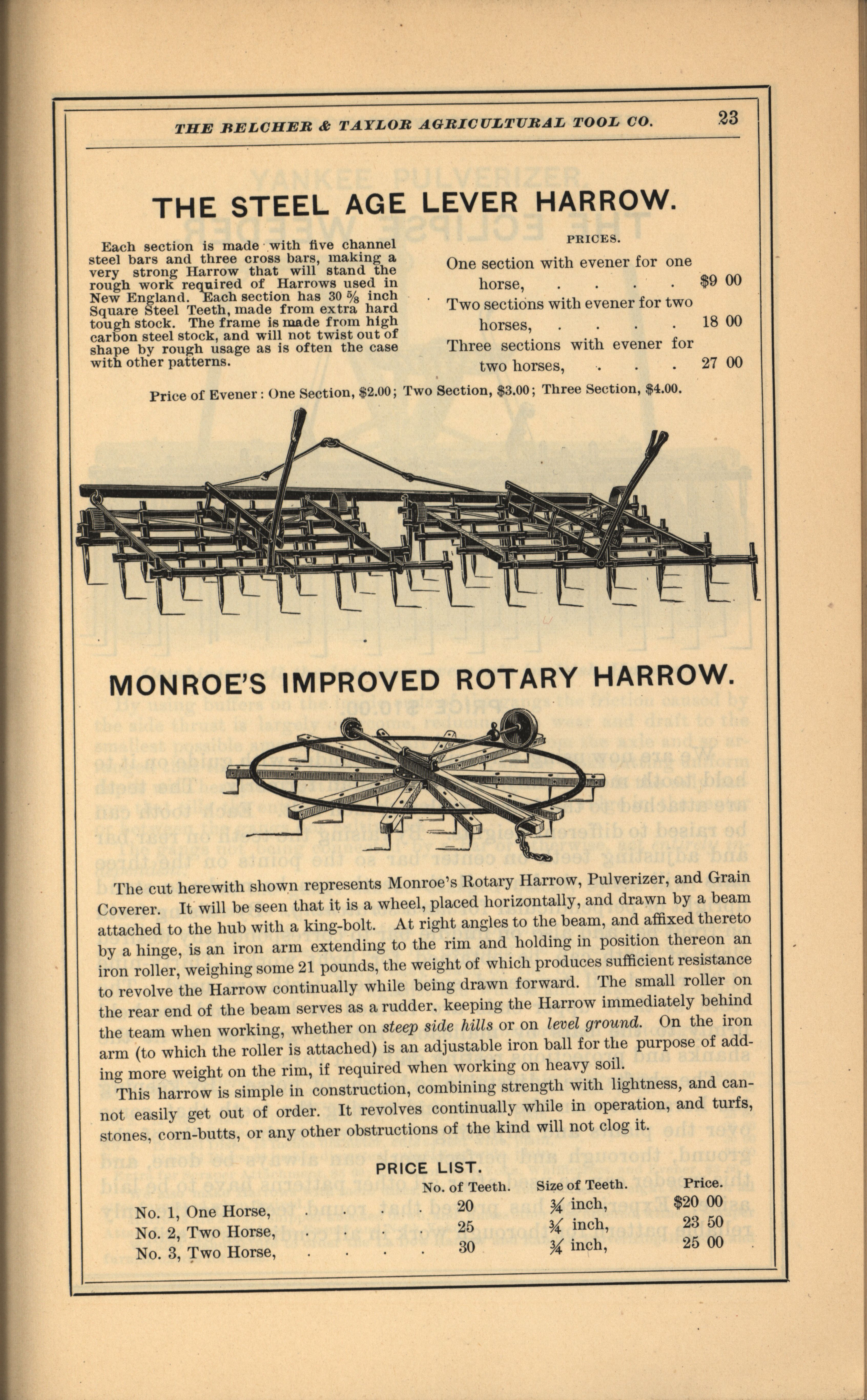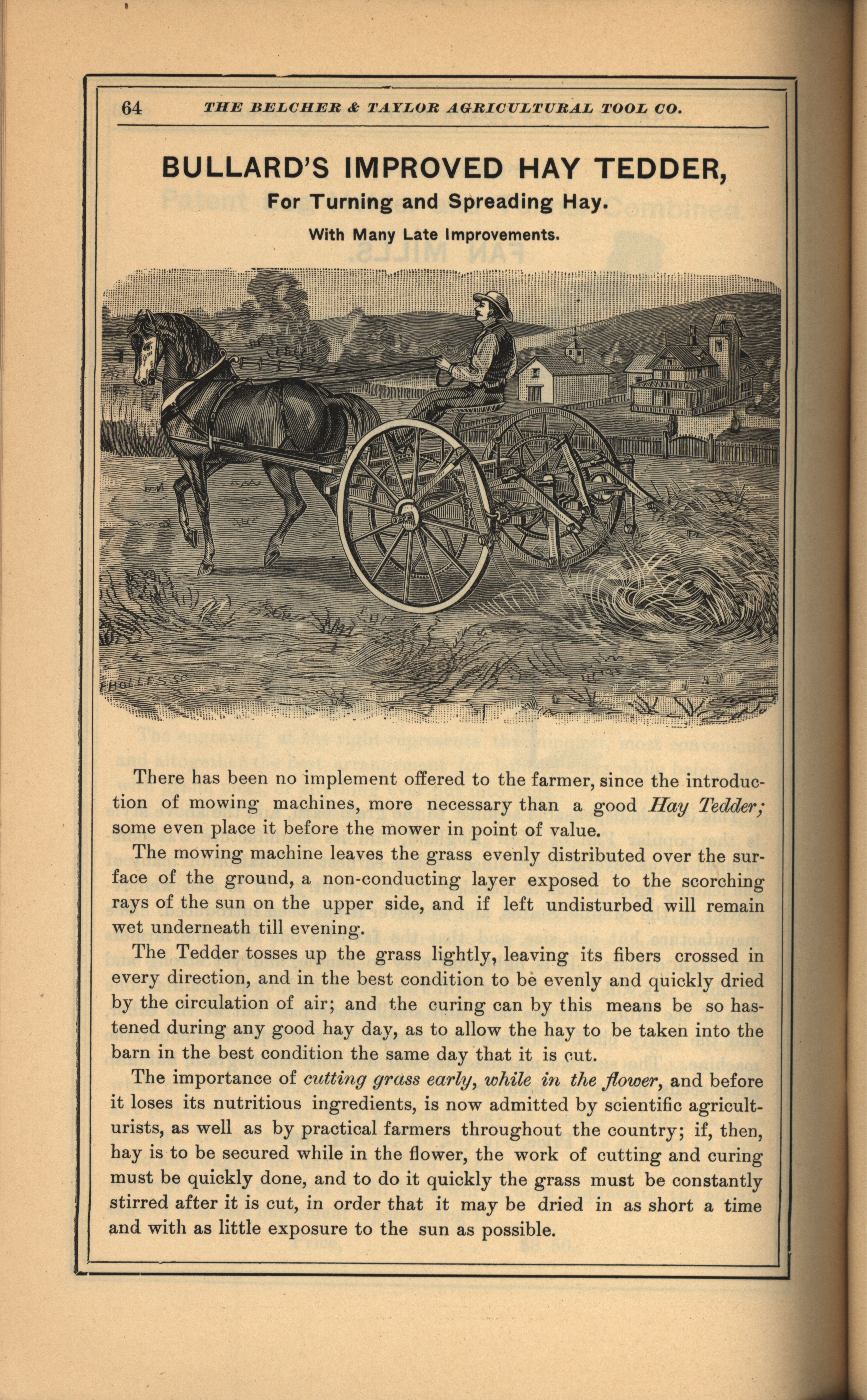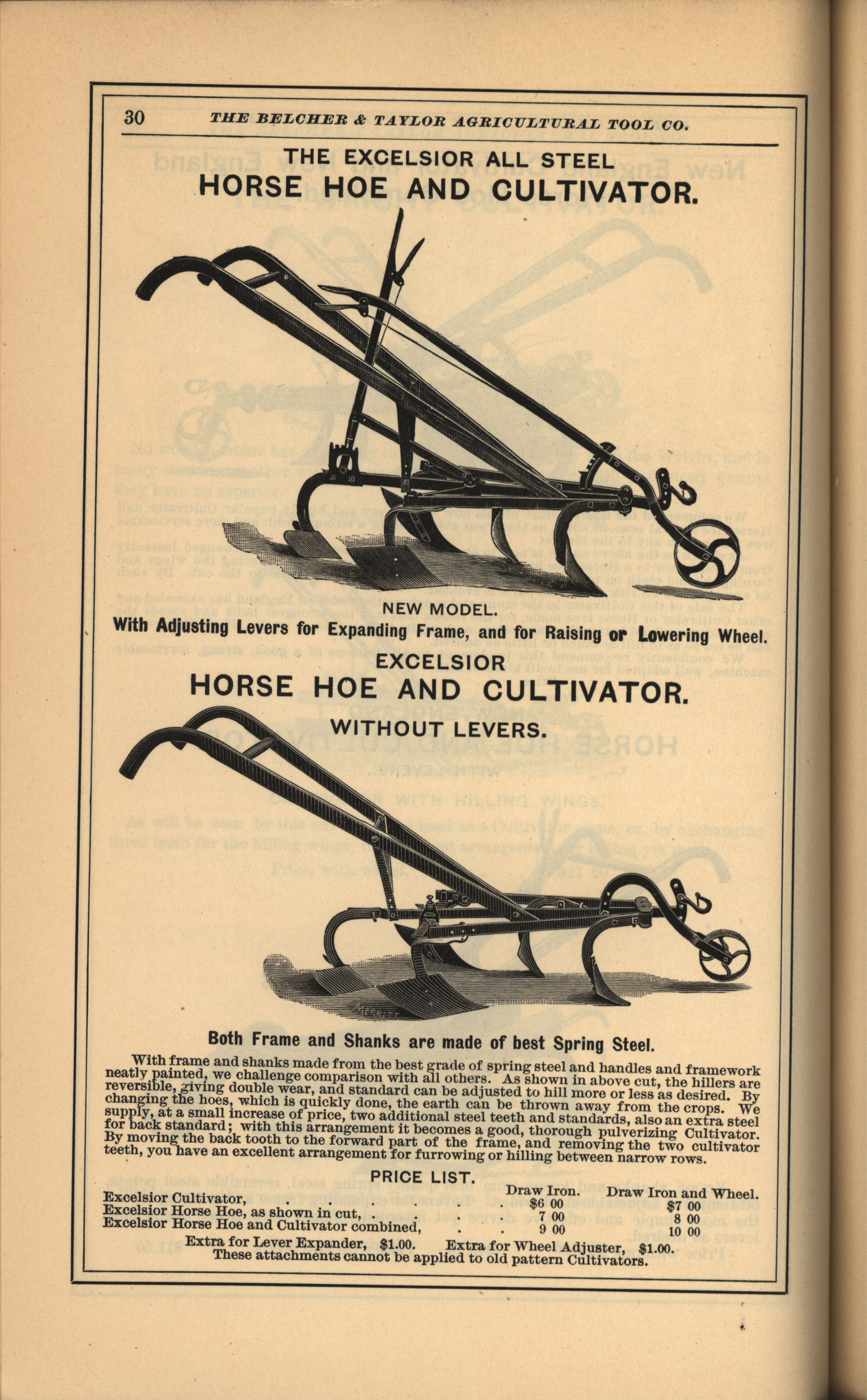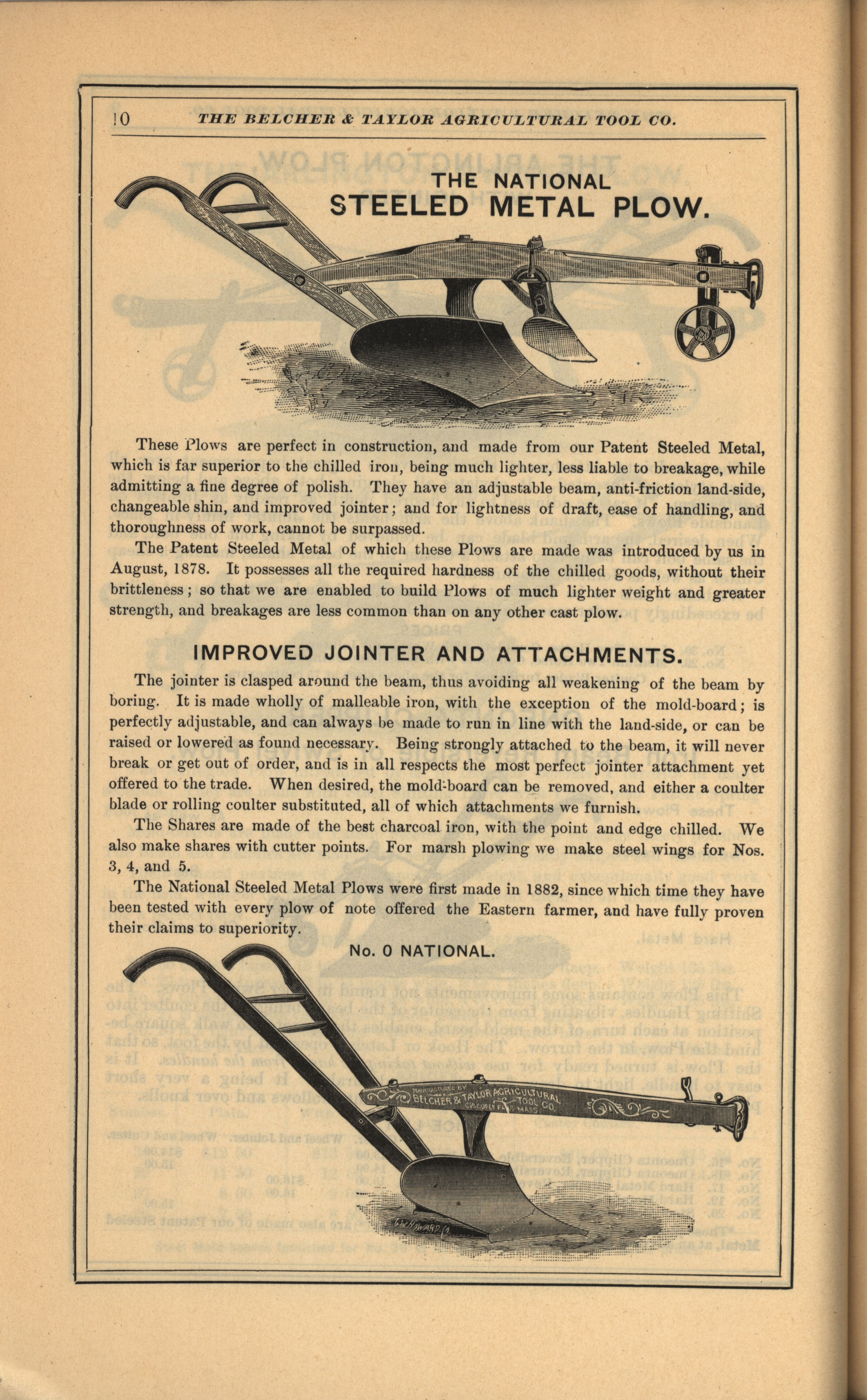 - Catalog describing agricultural products offered by the Belcher and Taylor Agricultural Tool Company, includes illustrations.