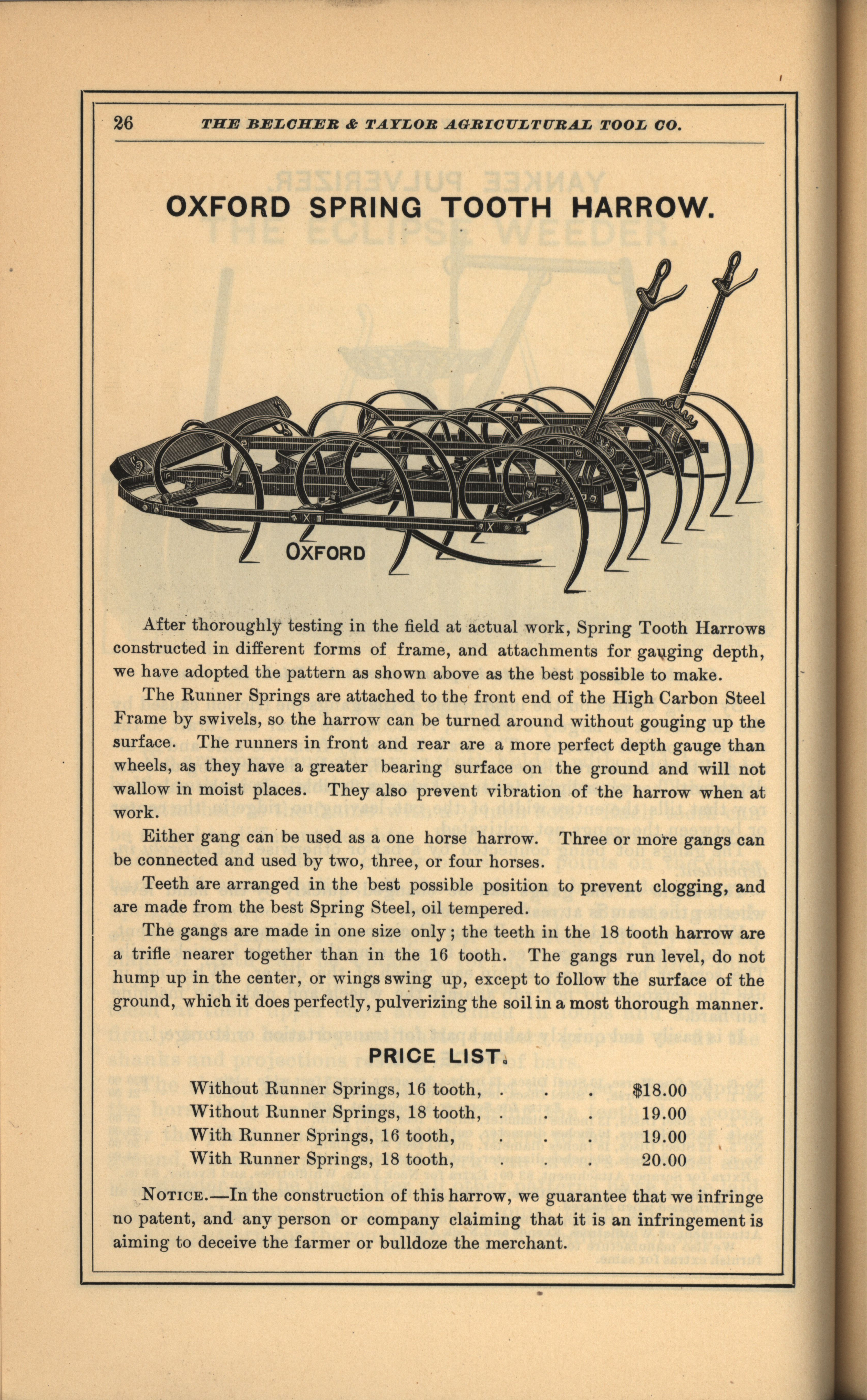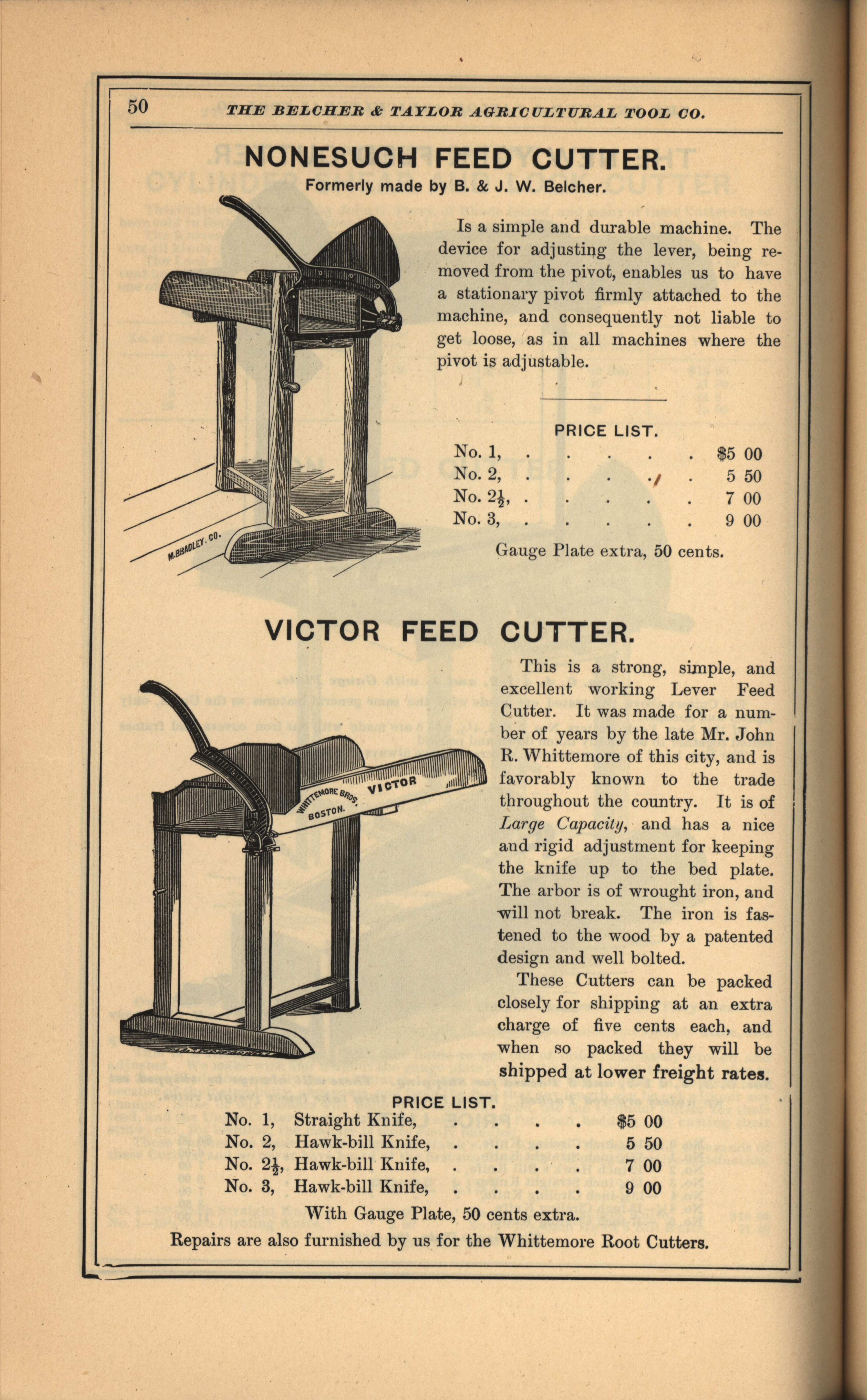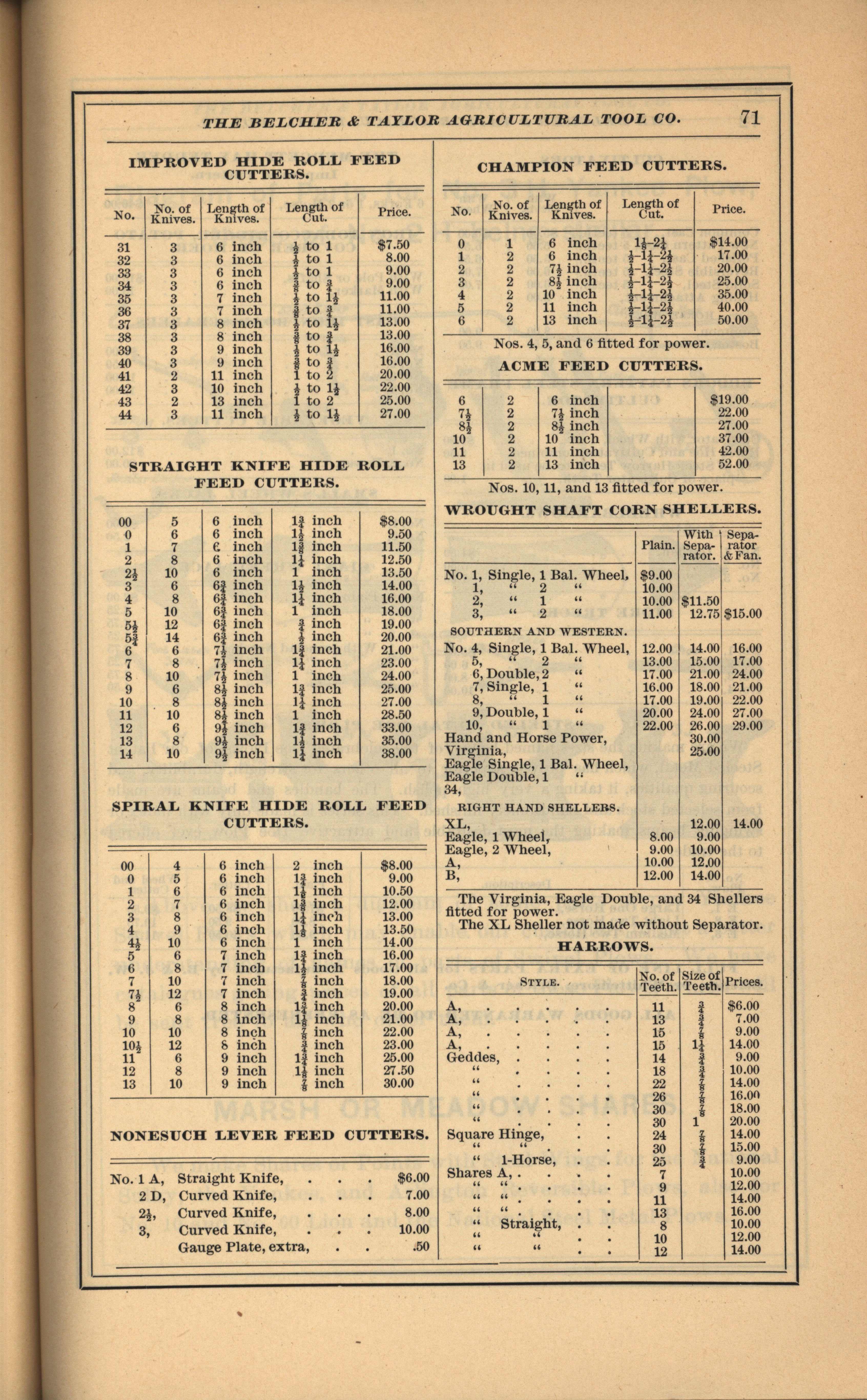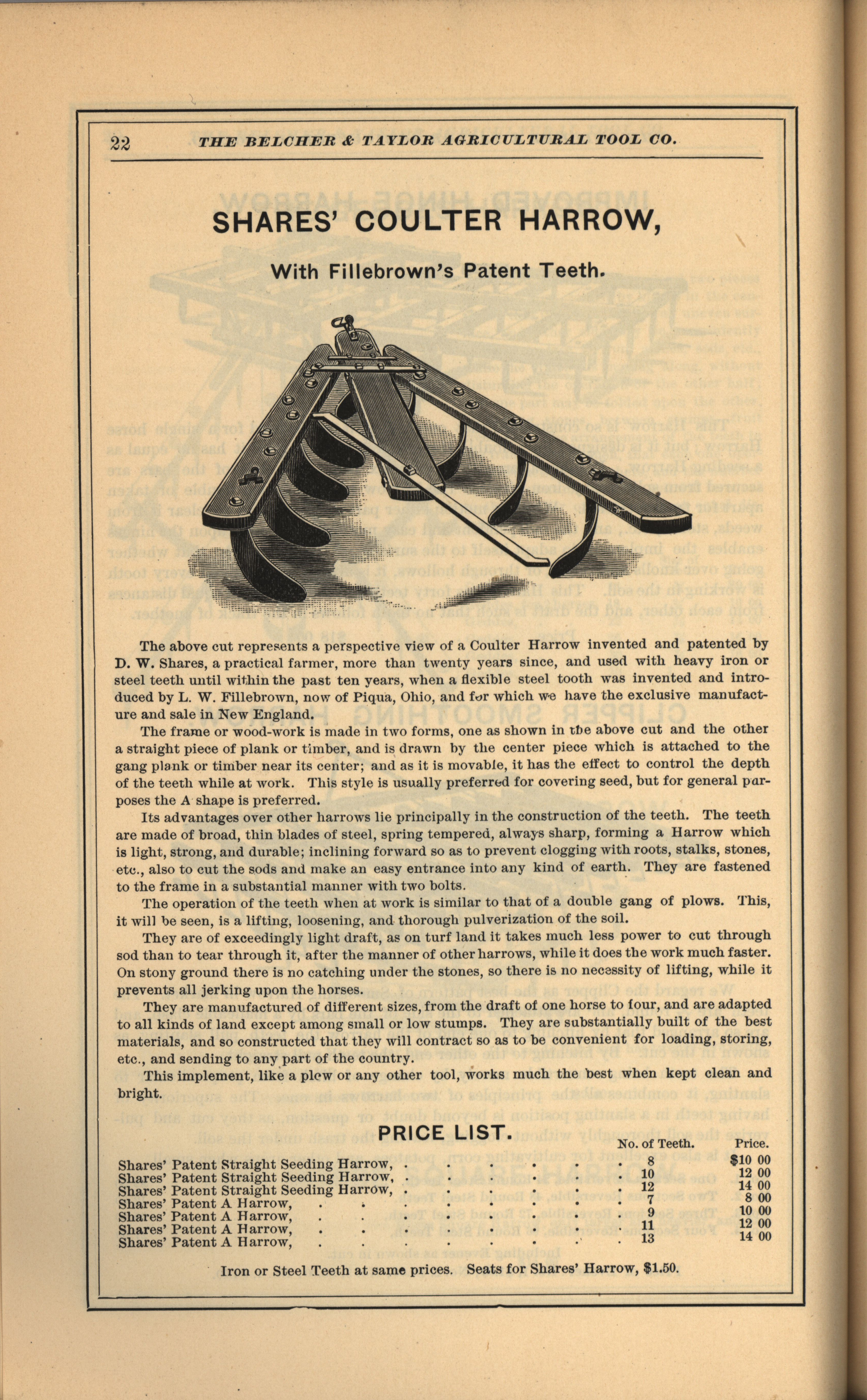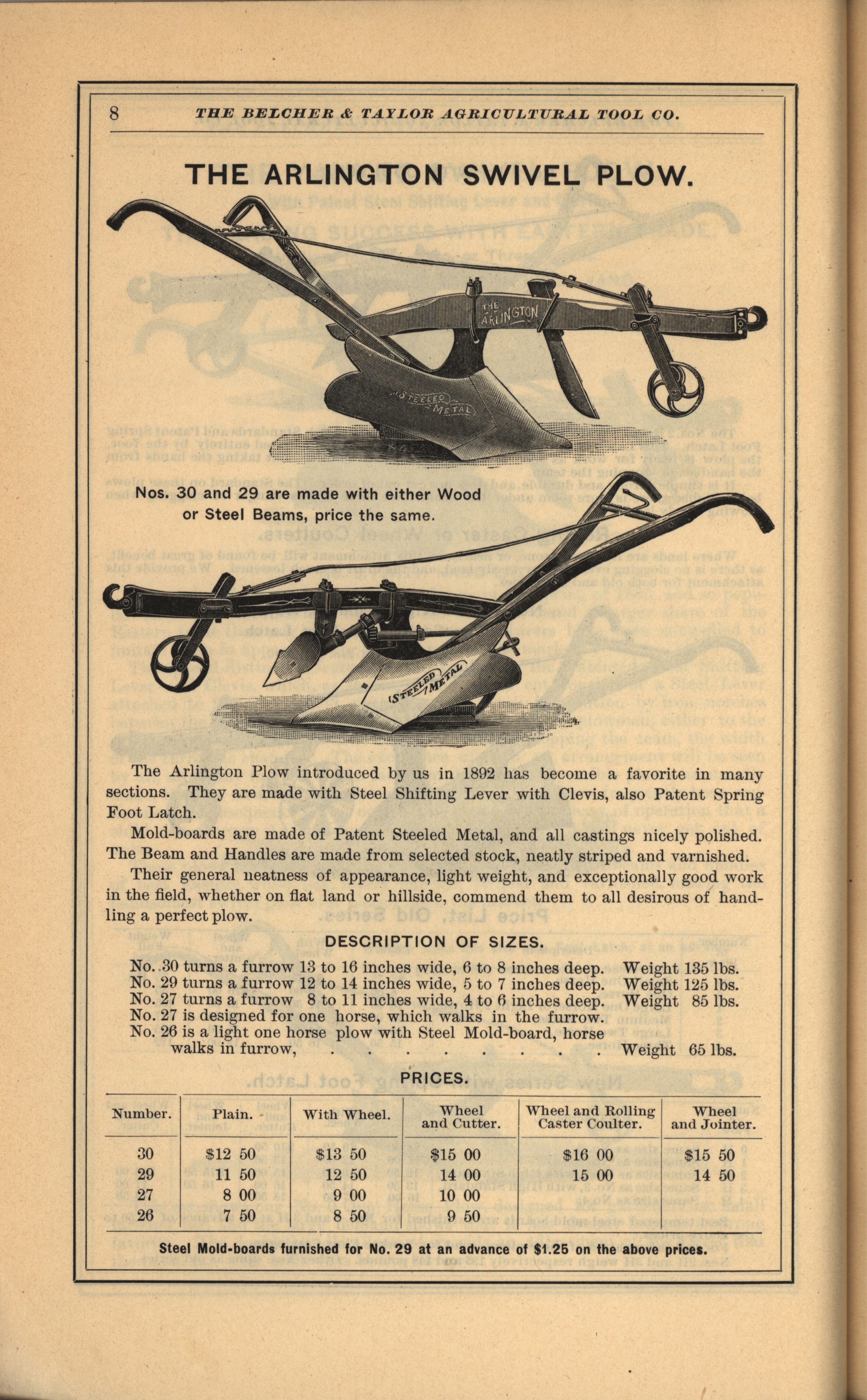 - Catalog describing agricultural products offered by the Belcher and Taylor Agricultural Tool Company, includes illustrations.