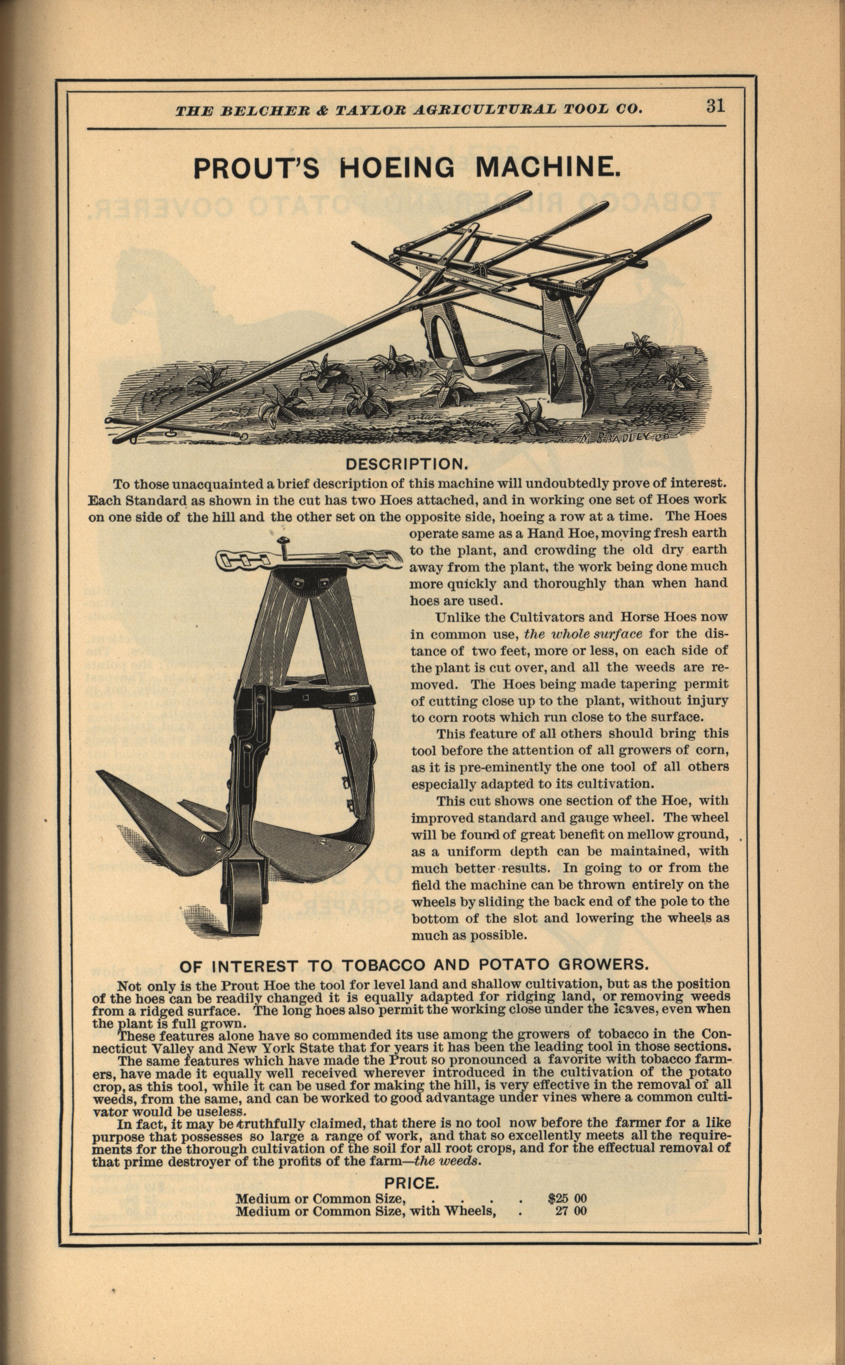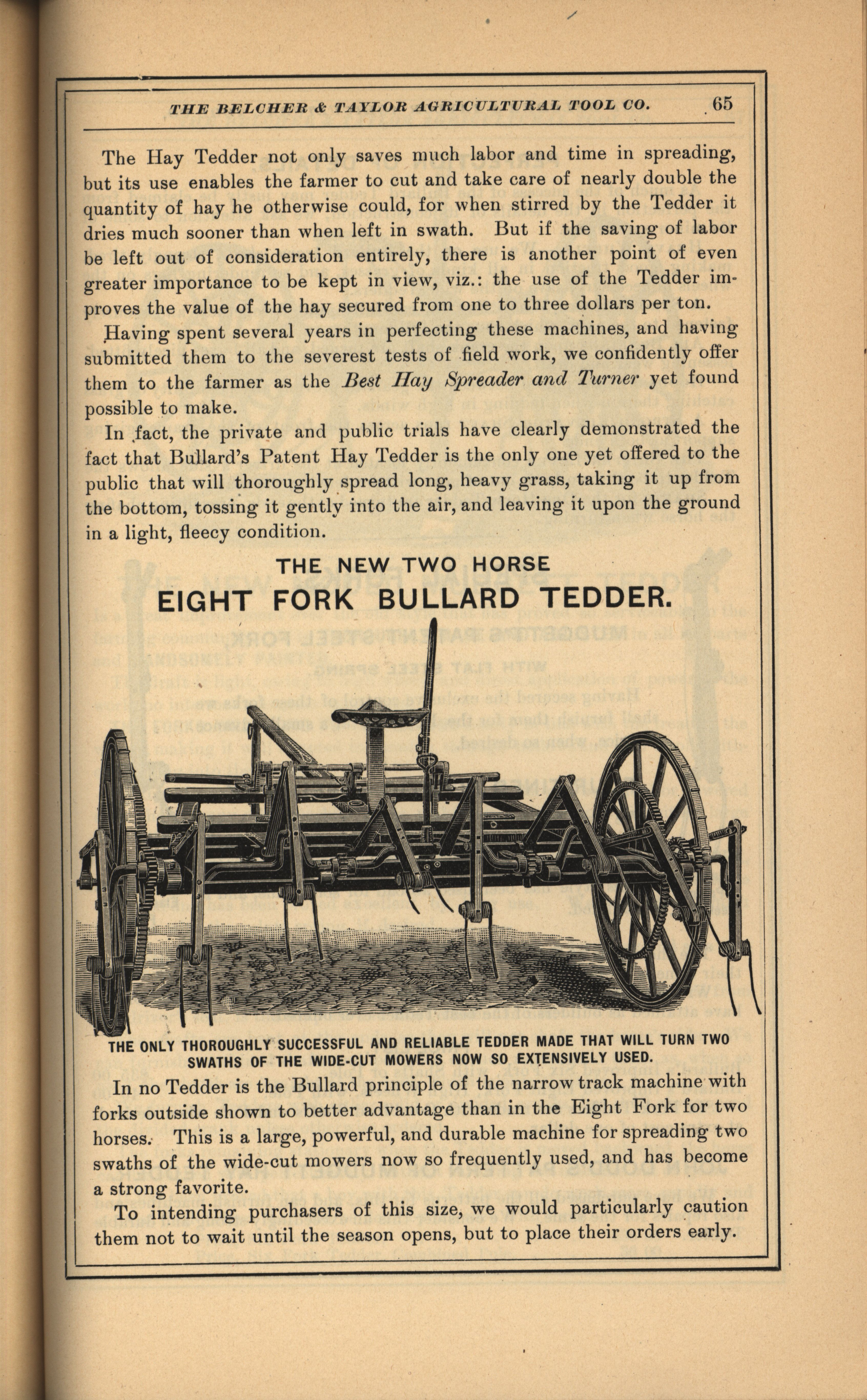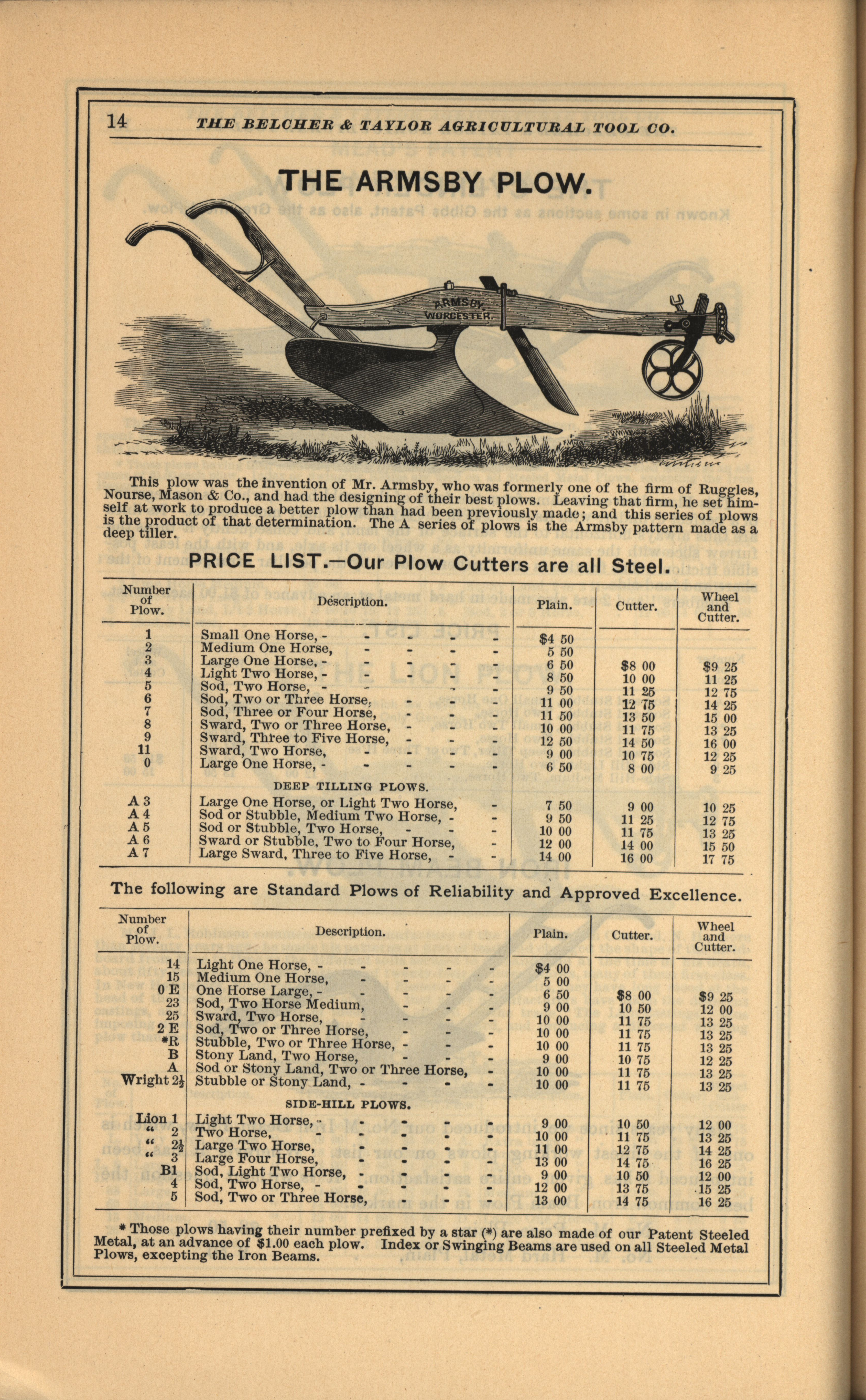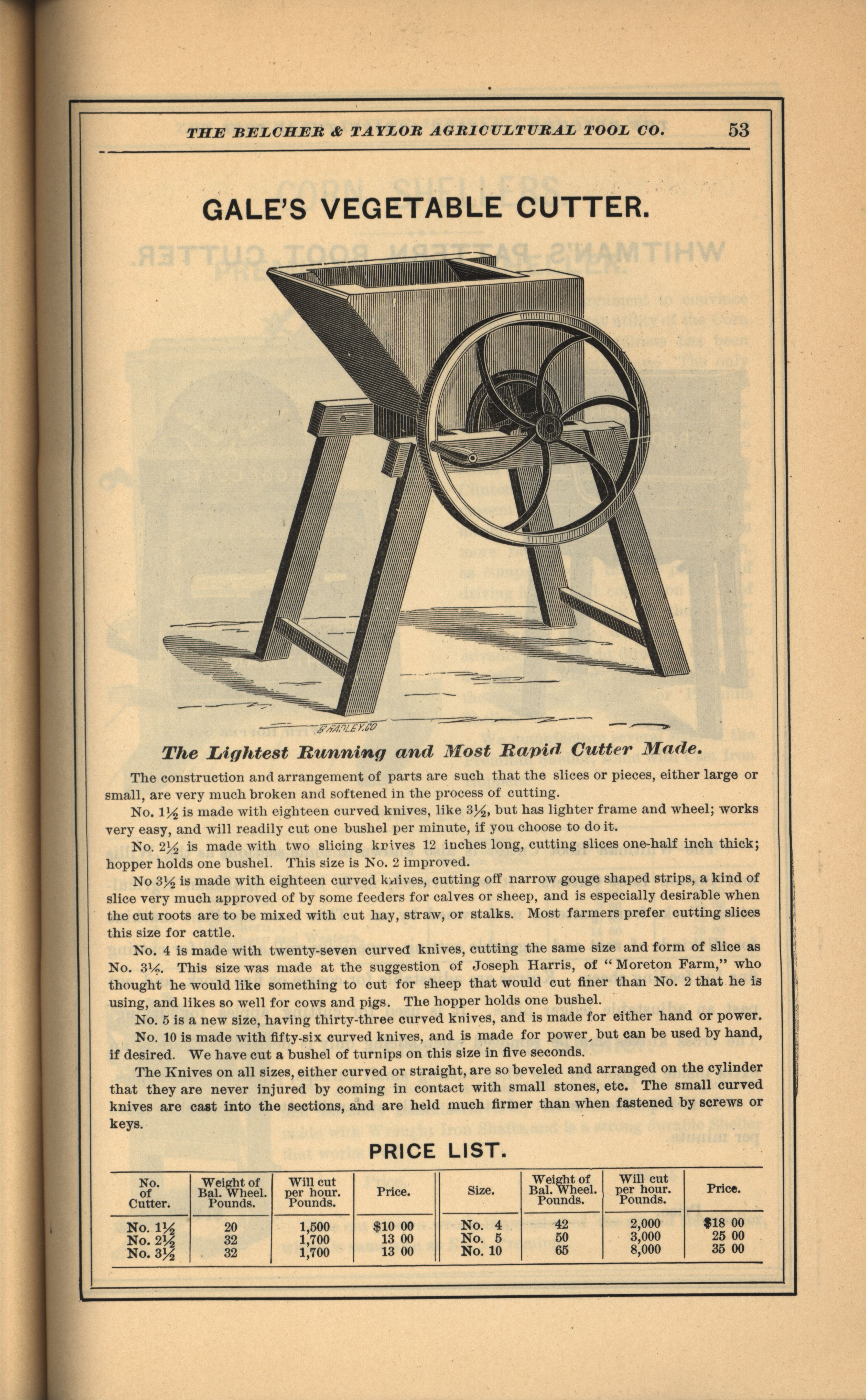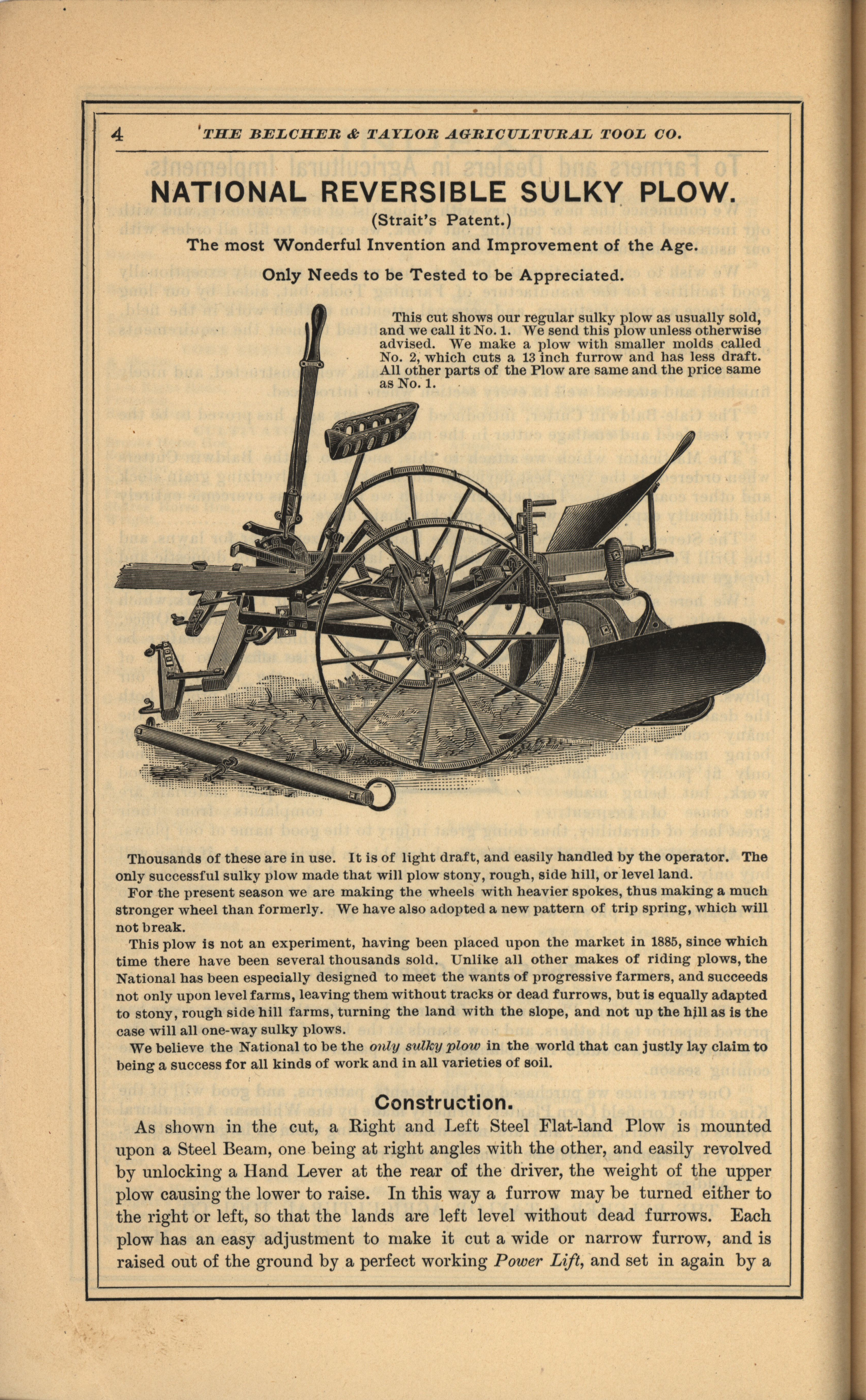 - Catalog describing agricultural products offered by the Belcher and Taylor Agricultural Tool Company, includes illustrations.
