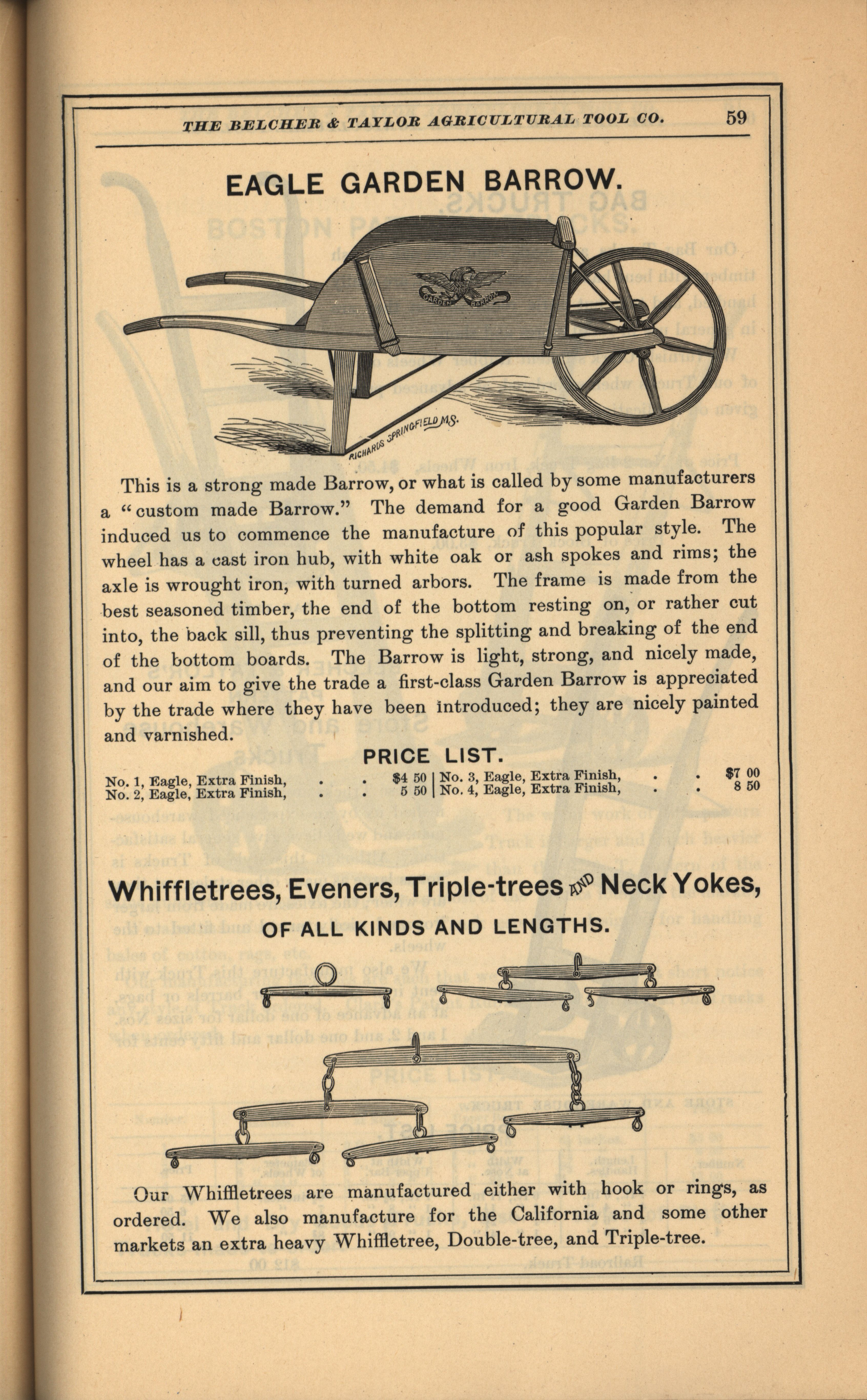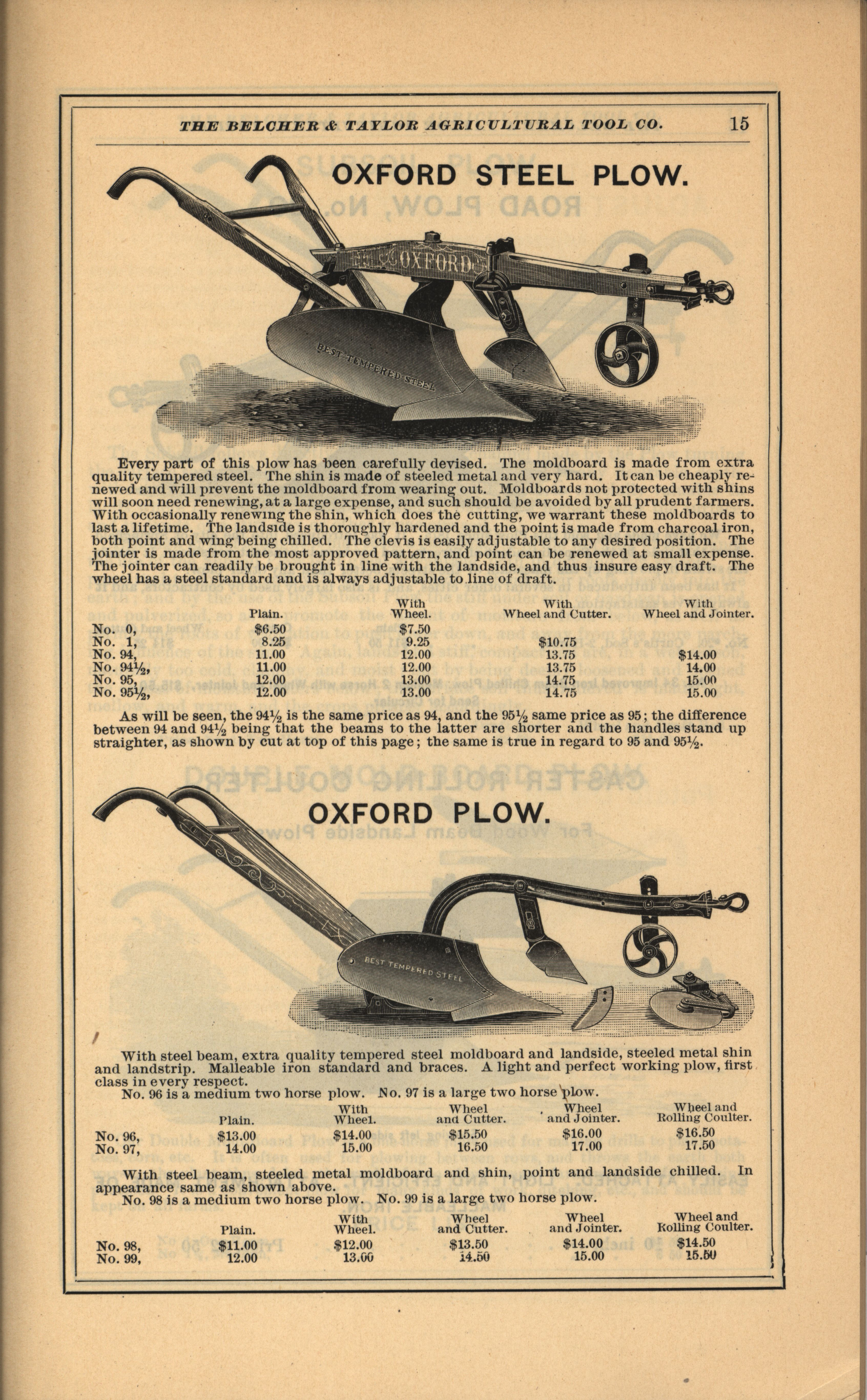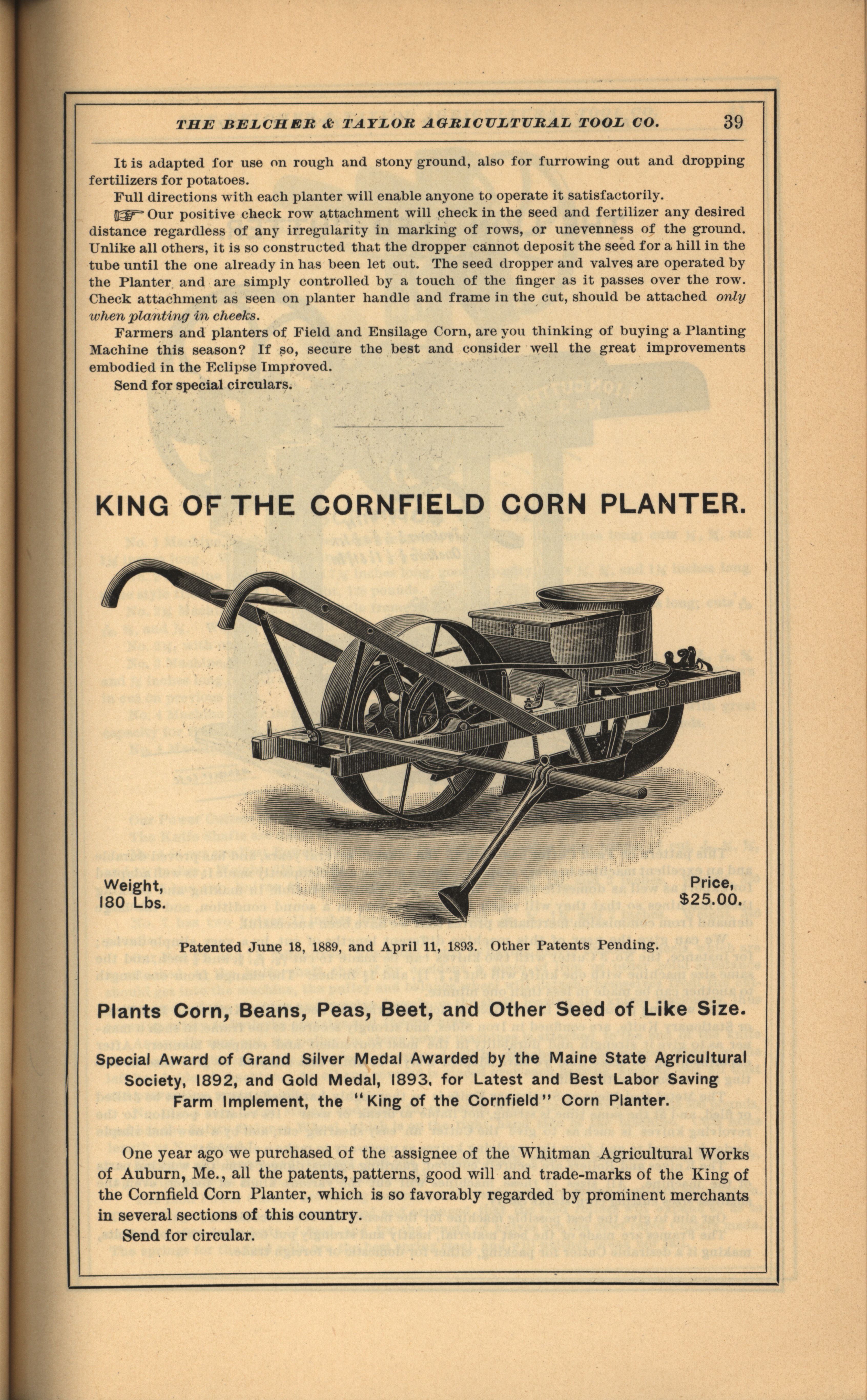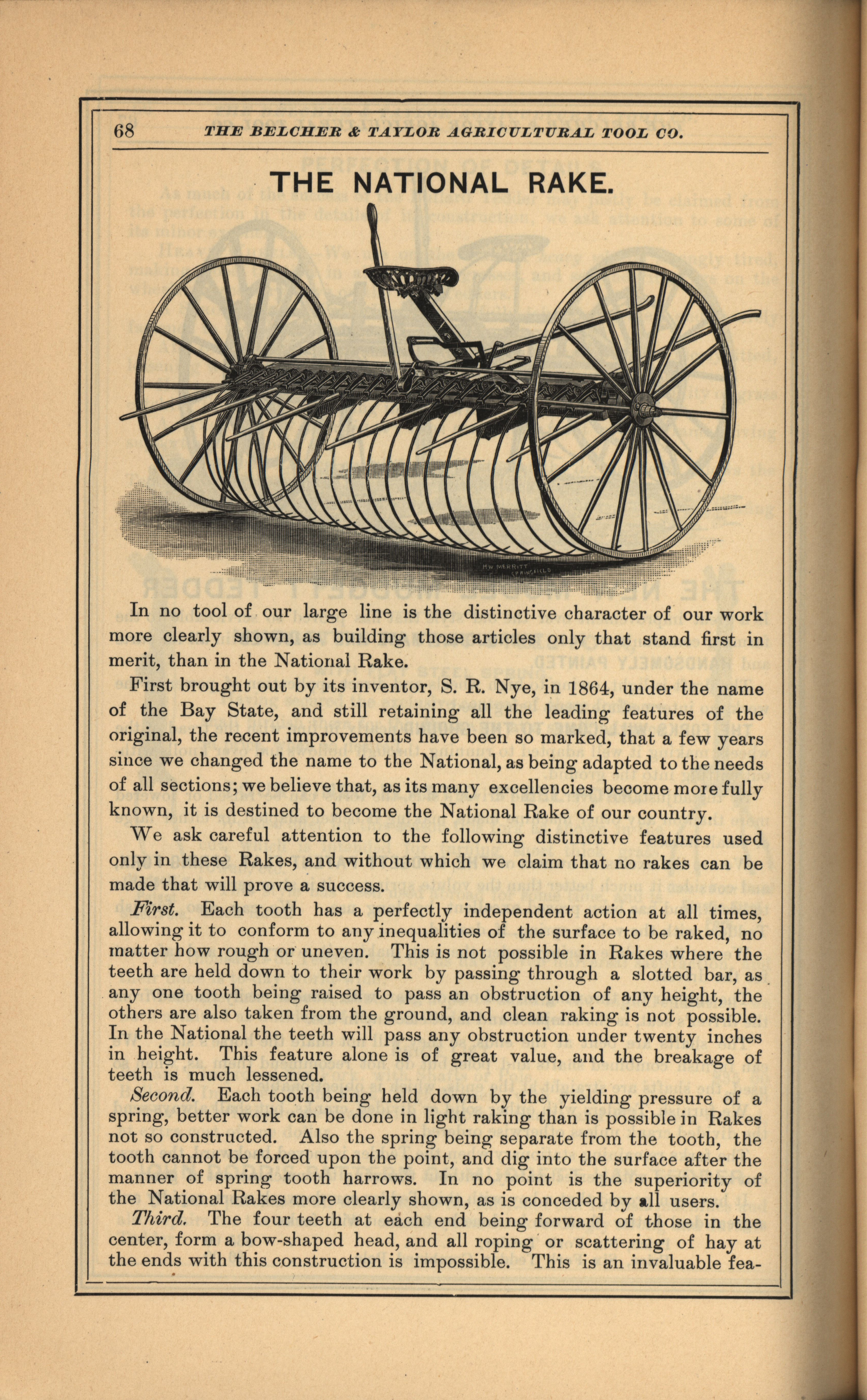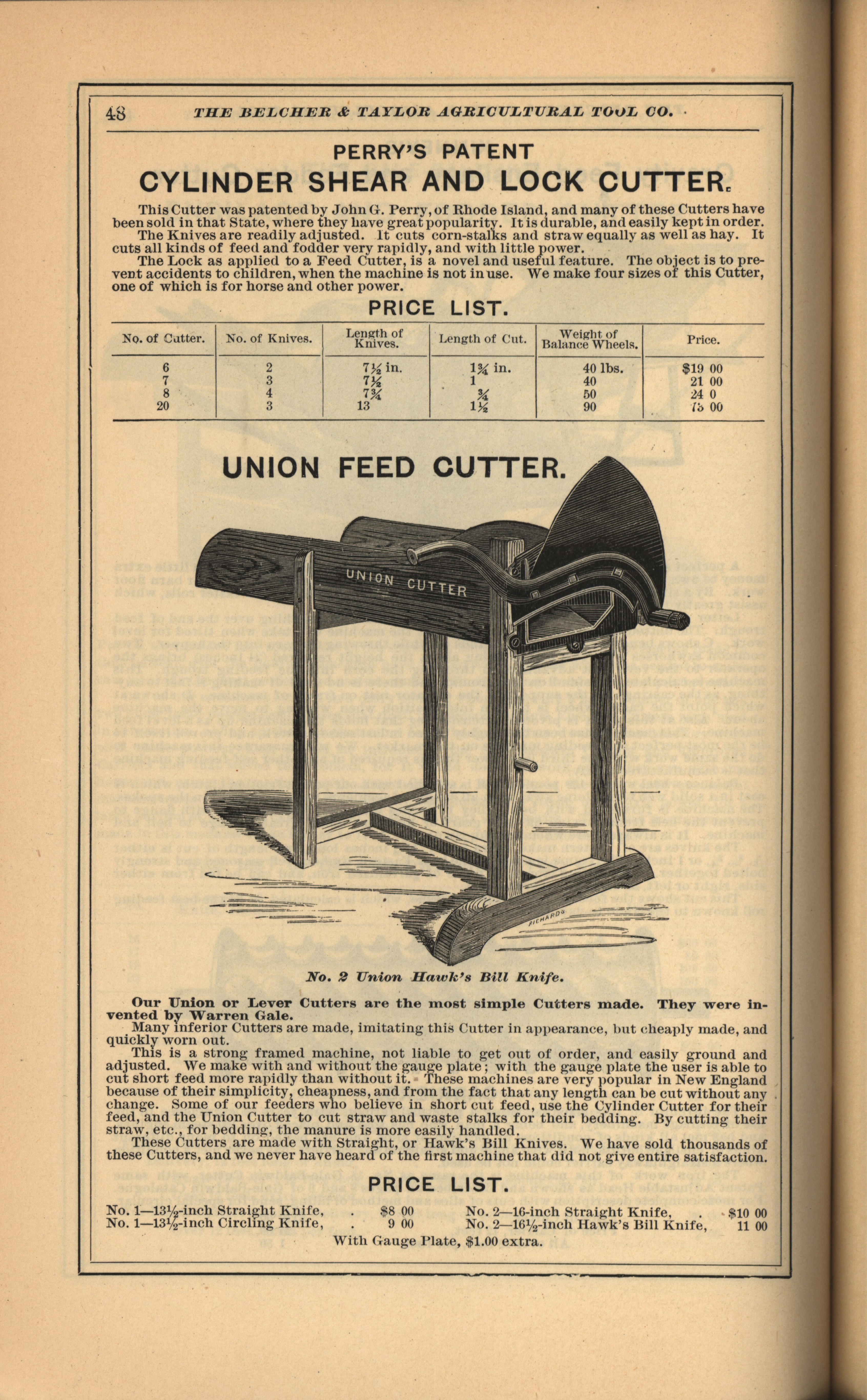 - Catalog describing agricultural products offered by the Belcher and Taylor Agricultural Tool Company, includes illustrations.