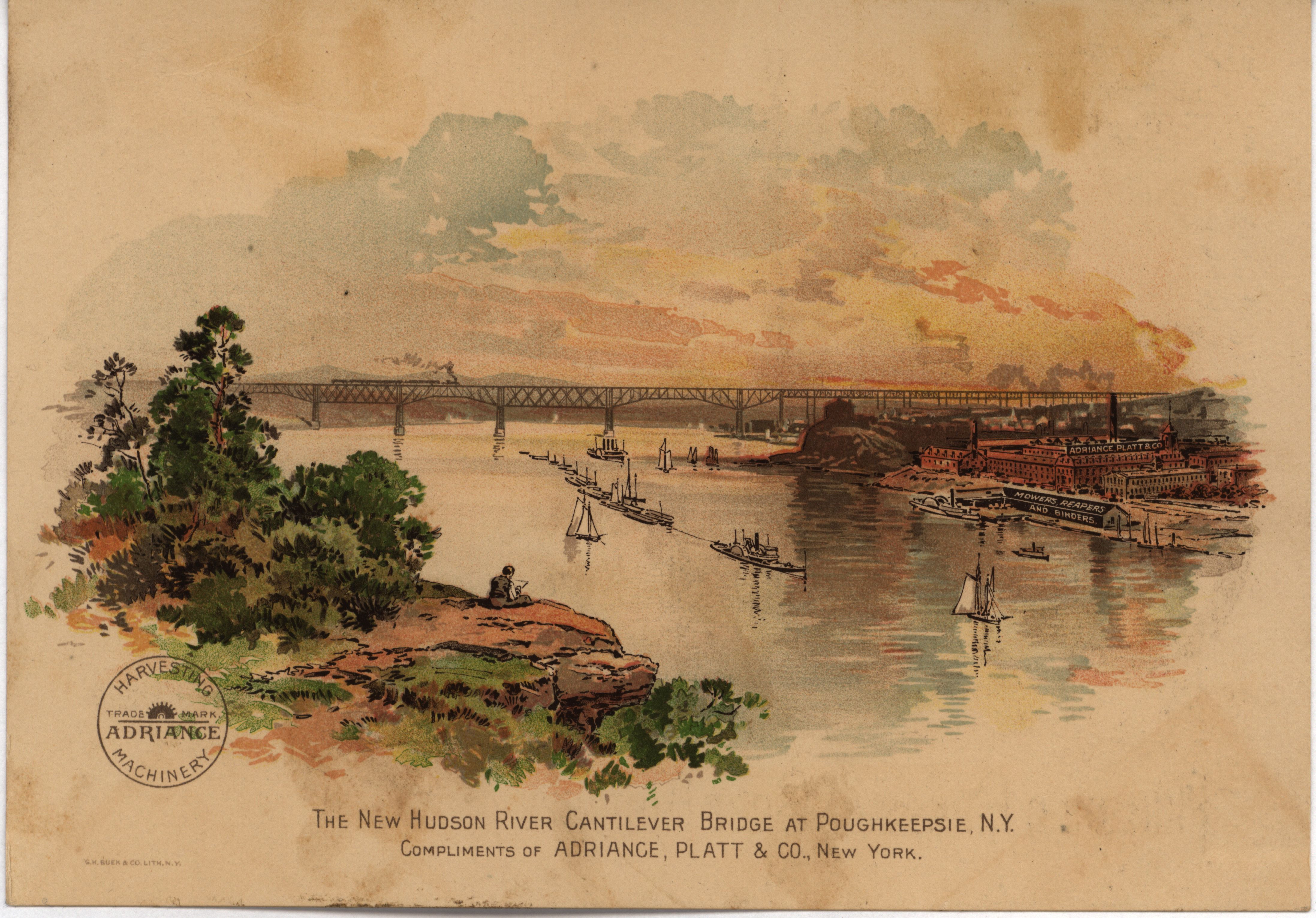 - Illustrated advertisement for Encased Gear Mowers offered by Adriance, Platt and Company. Includes a view of the bridge at Poughkeepsie, New York on backside of the advertisement.