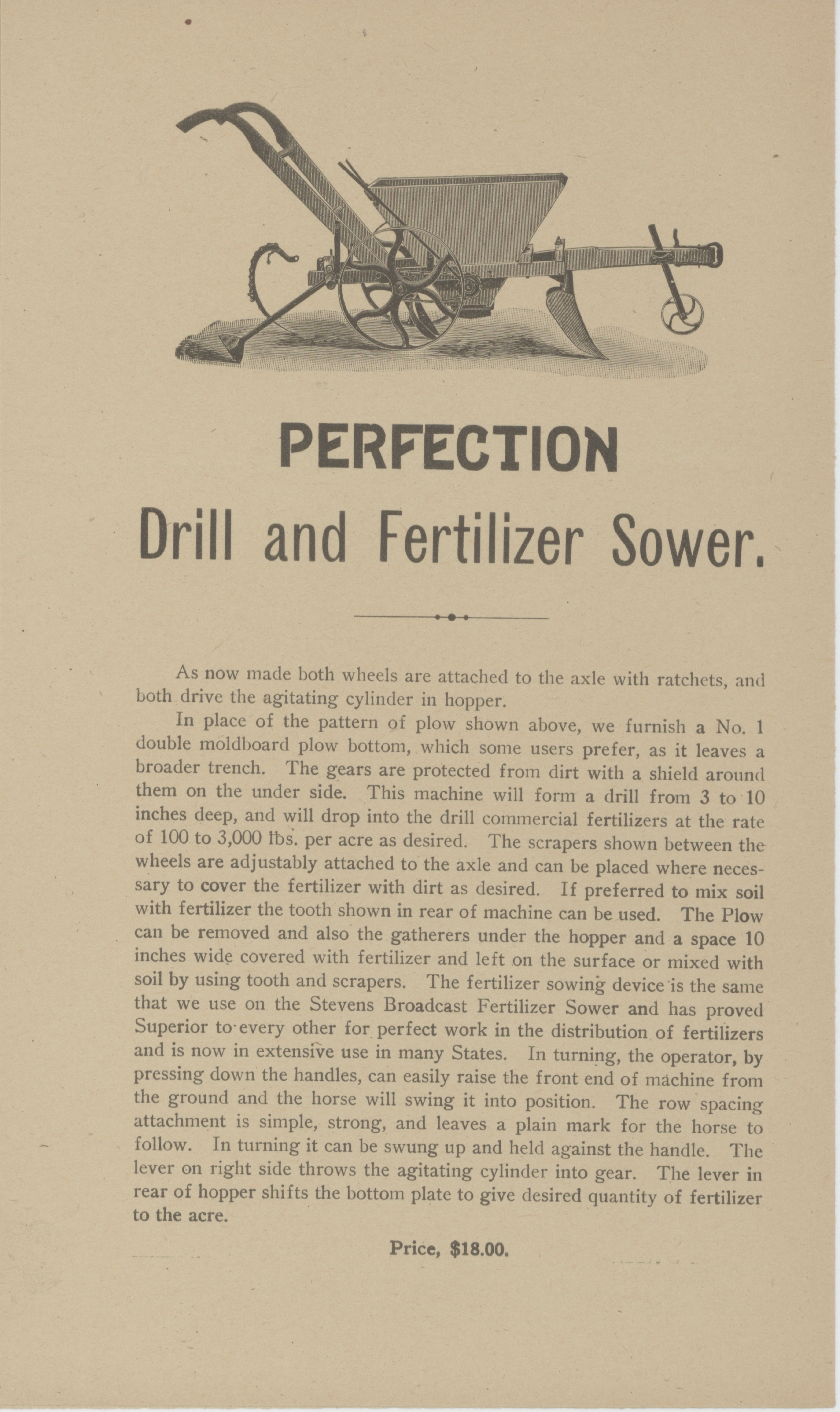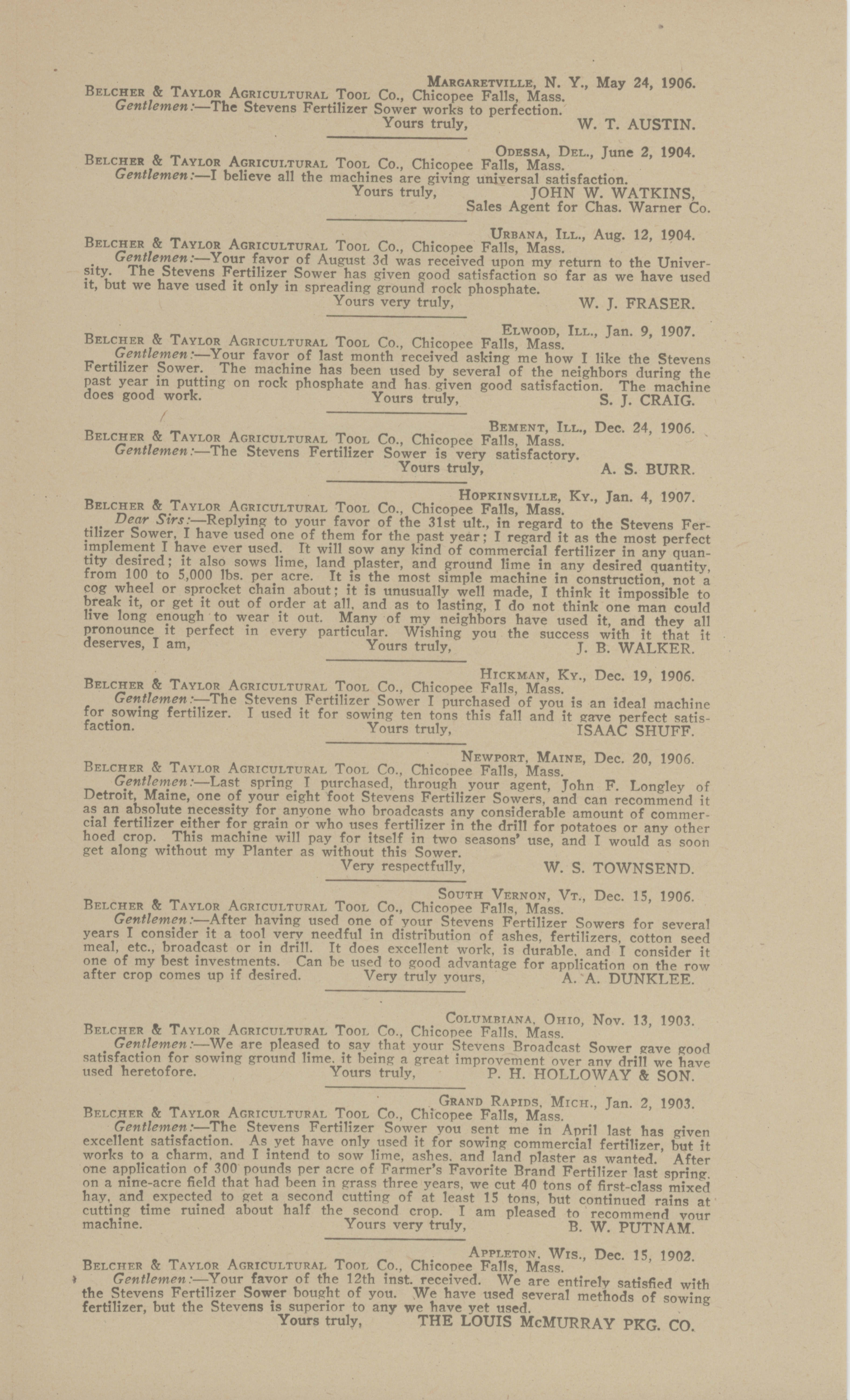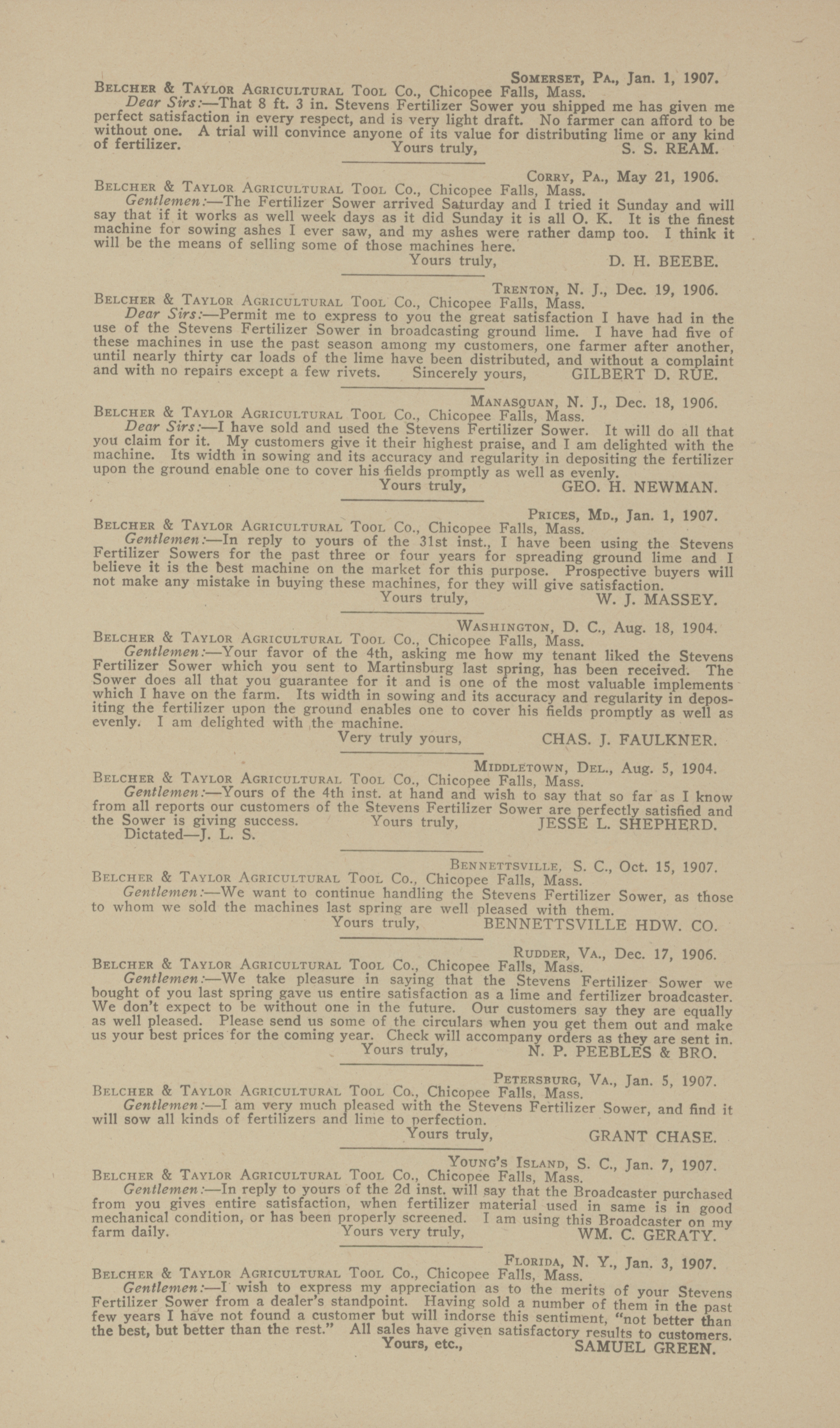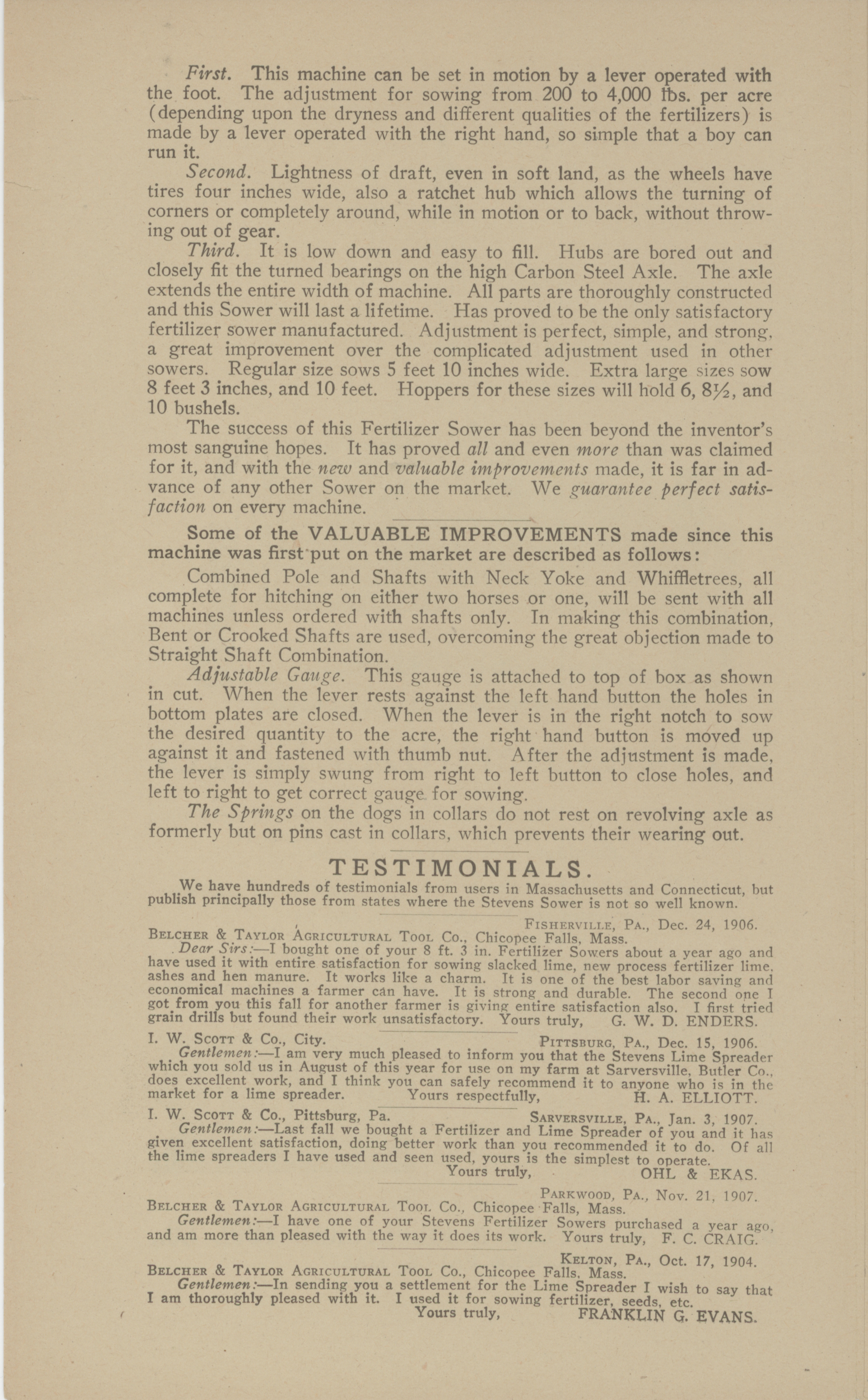 - Illustrated catalog describing fertilizer sower products offered by Belcher and Taylor Agricultural Tool Company in 1907.