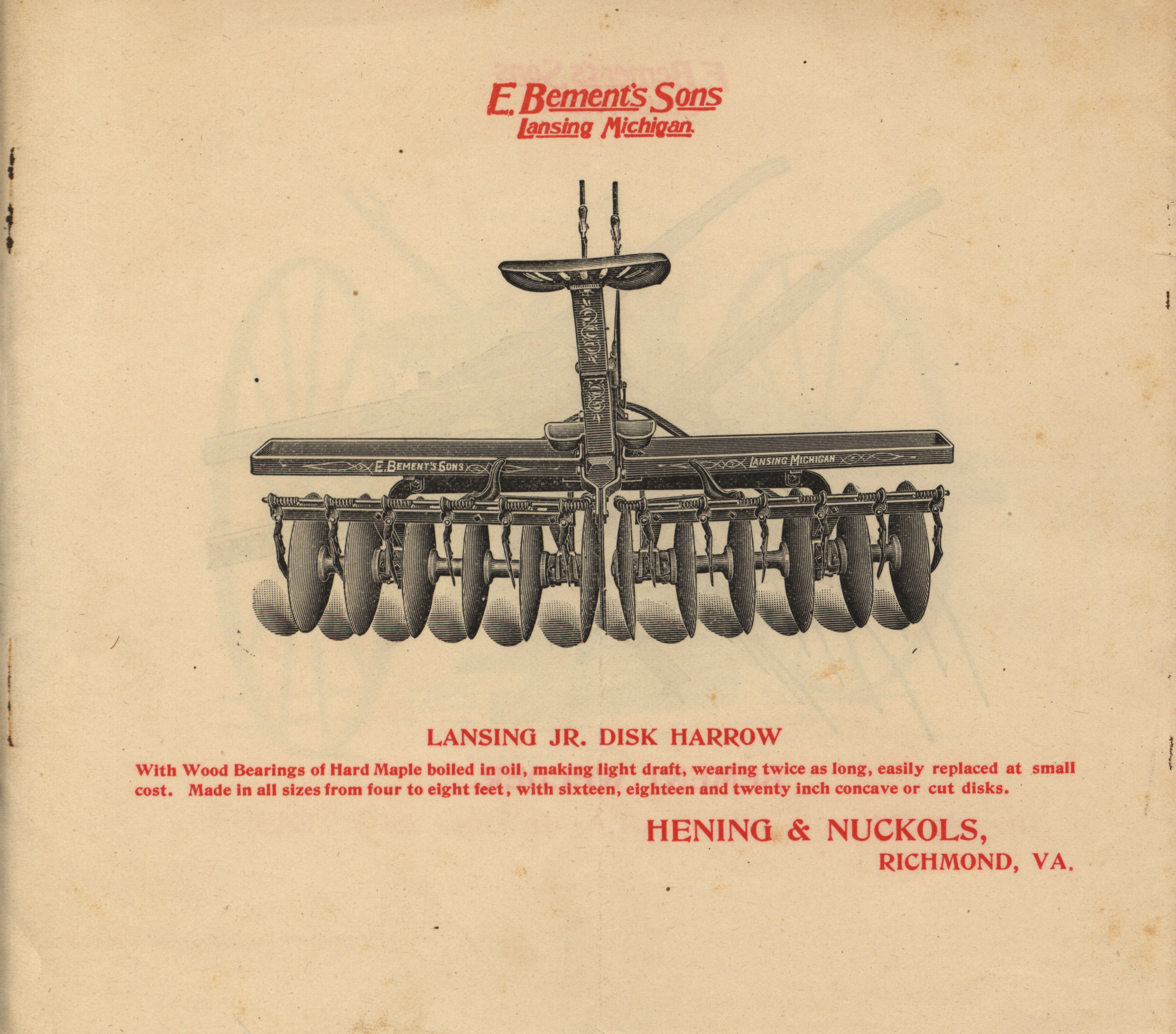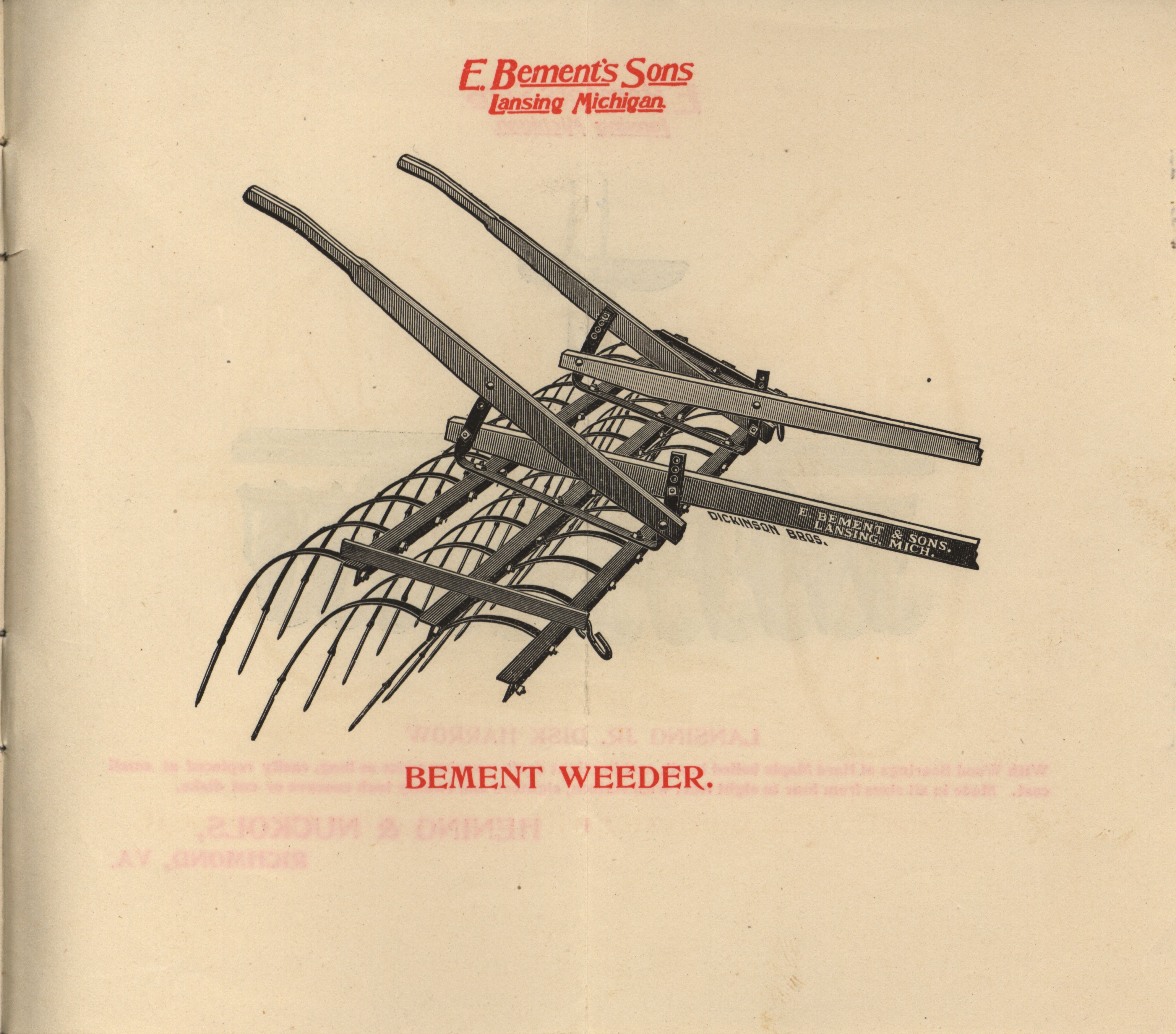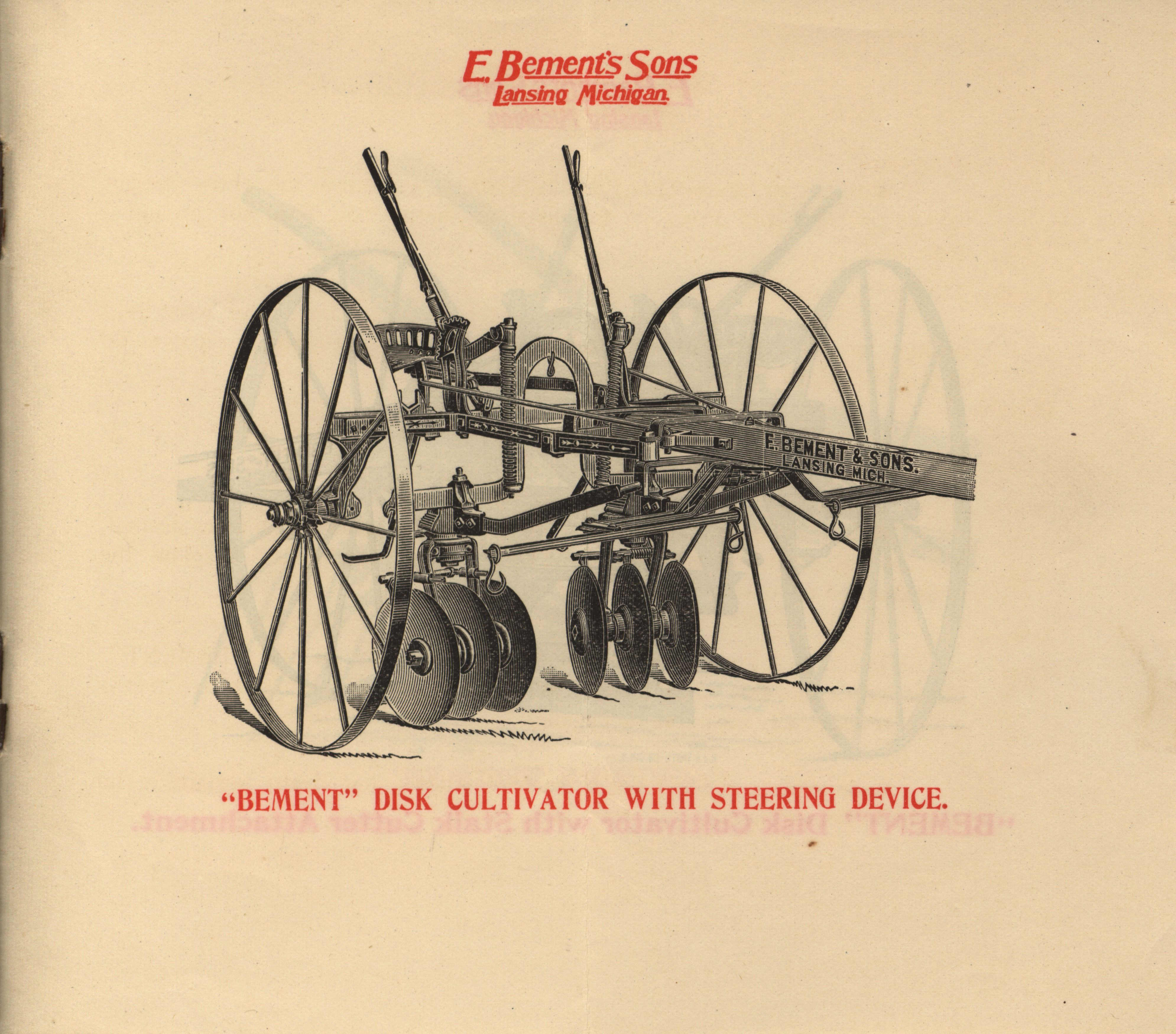 - "E. Bement's Sons 'The Bement' 3 in 1 Disk Cultivator, Disk Harrow, Stalk Cutter catalog", Agricultural Machinery Literature Collection, Iowa State University Library Digital Collections