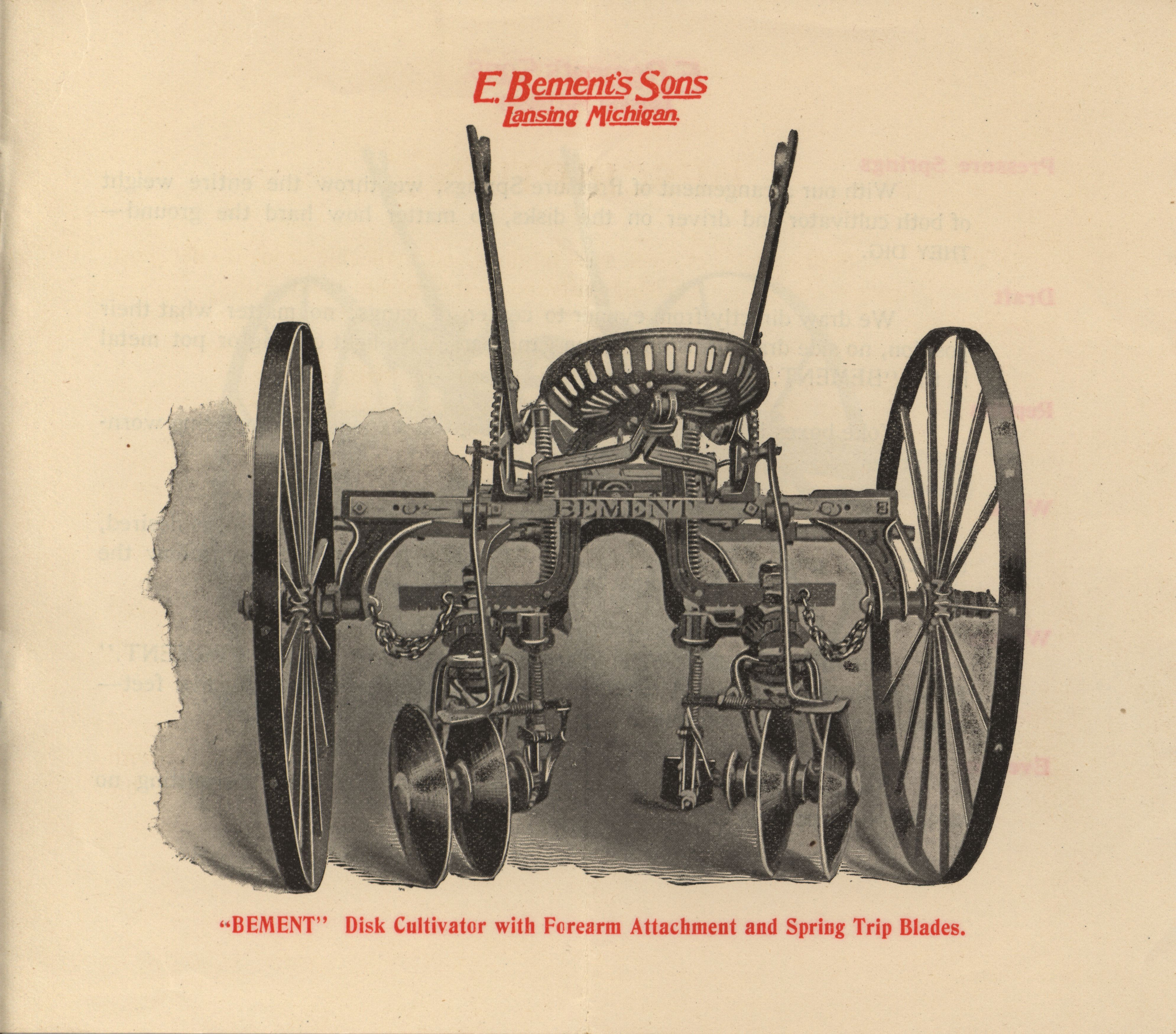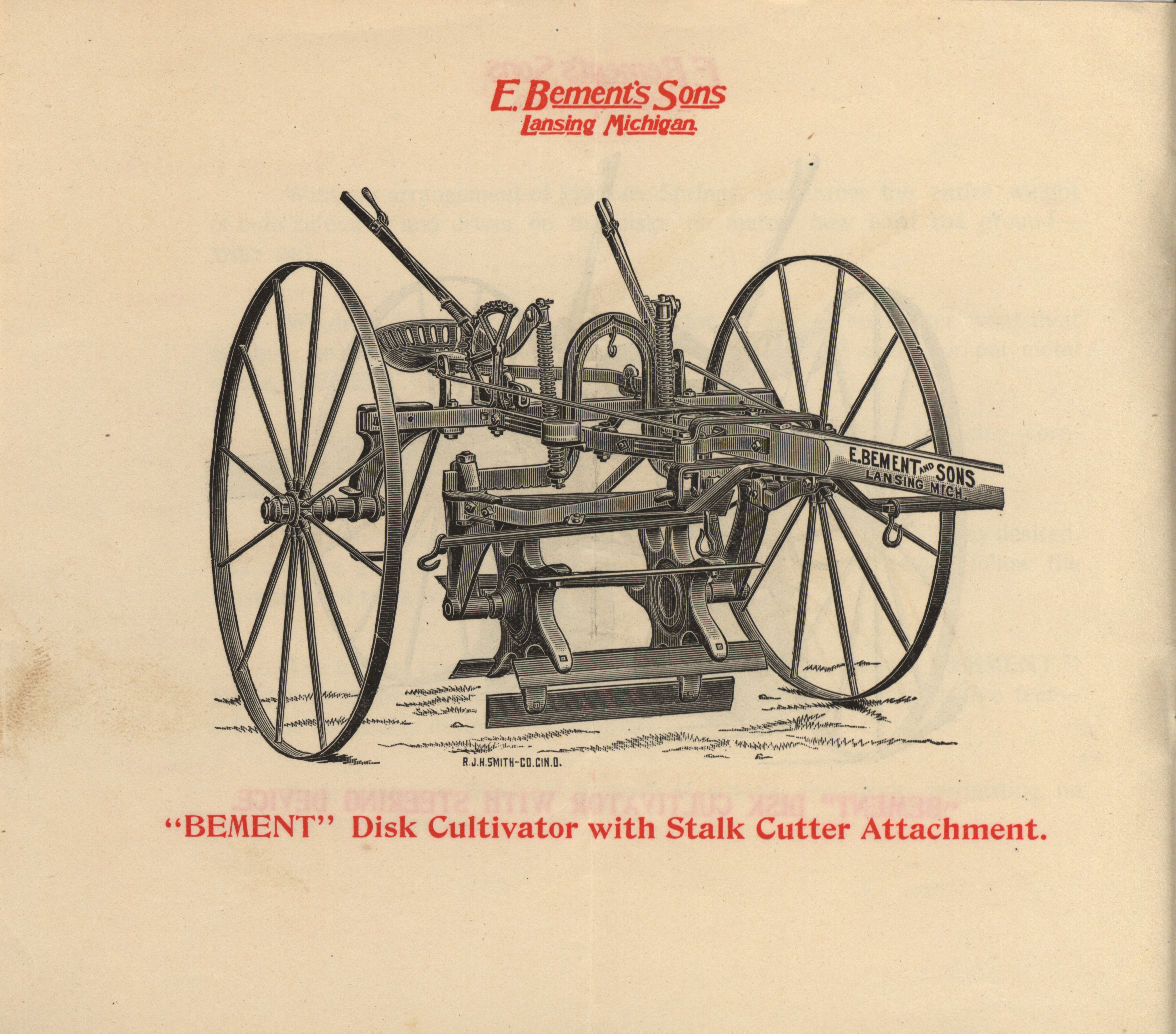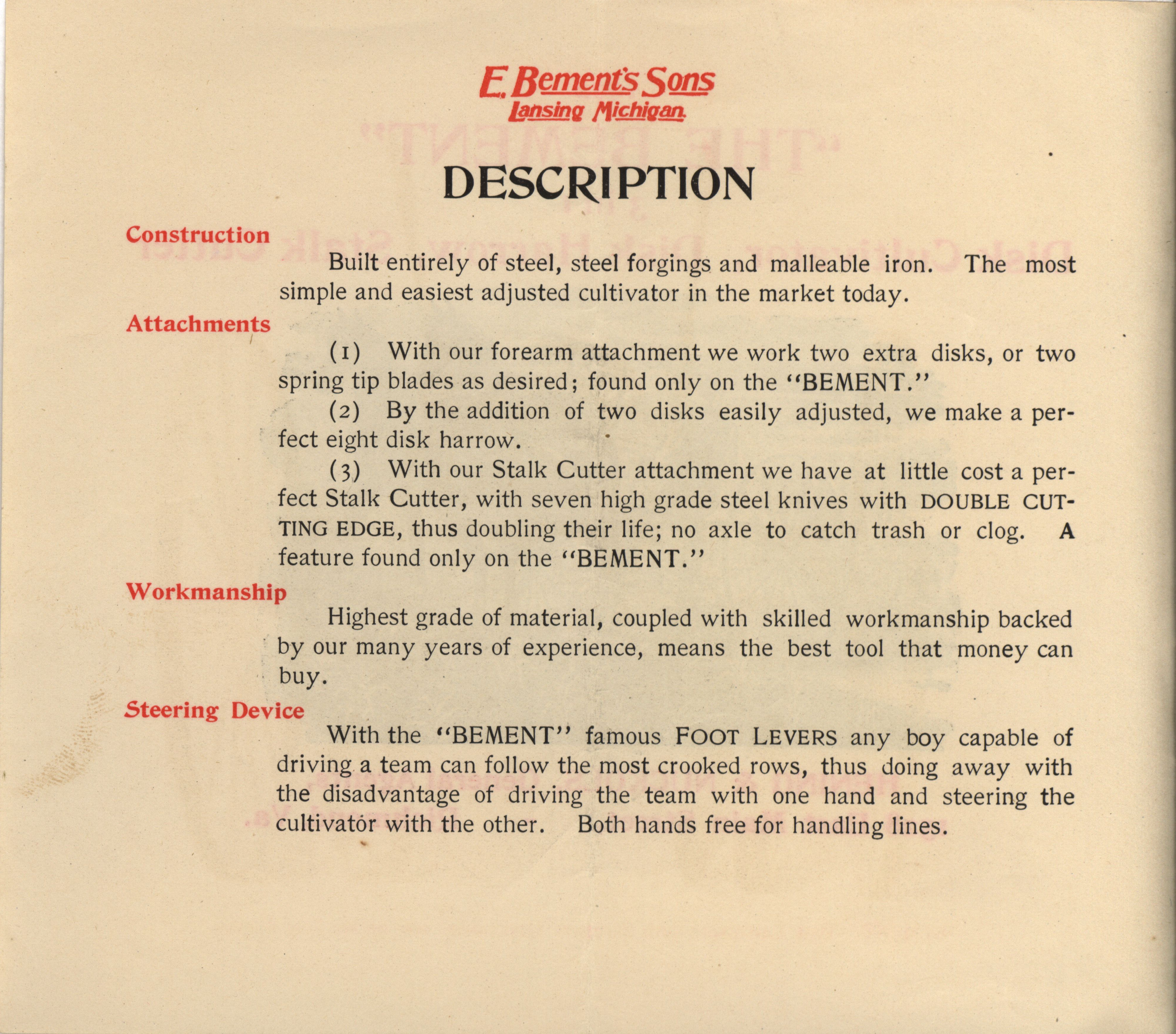 - "E. Bement's Sons 'The Bement' 3 in 1 Disk Cultivator, Disk Harrow, Stalk Cutter catalog", Agricultural Machinery Literature Collection, Iowa State University Library Digital Collections