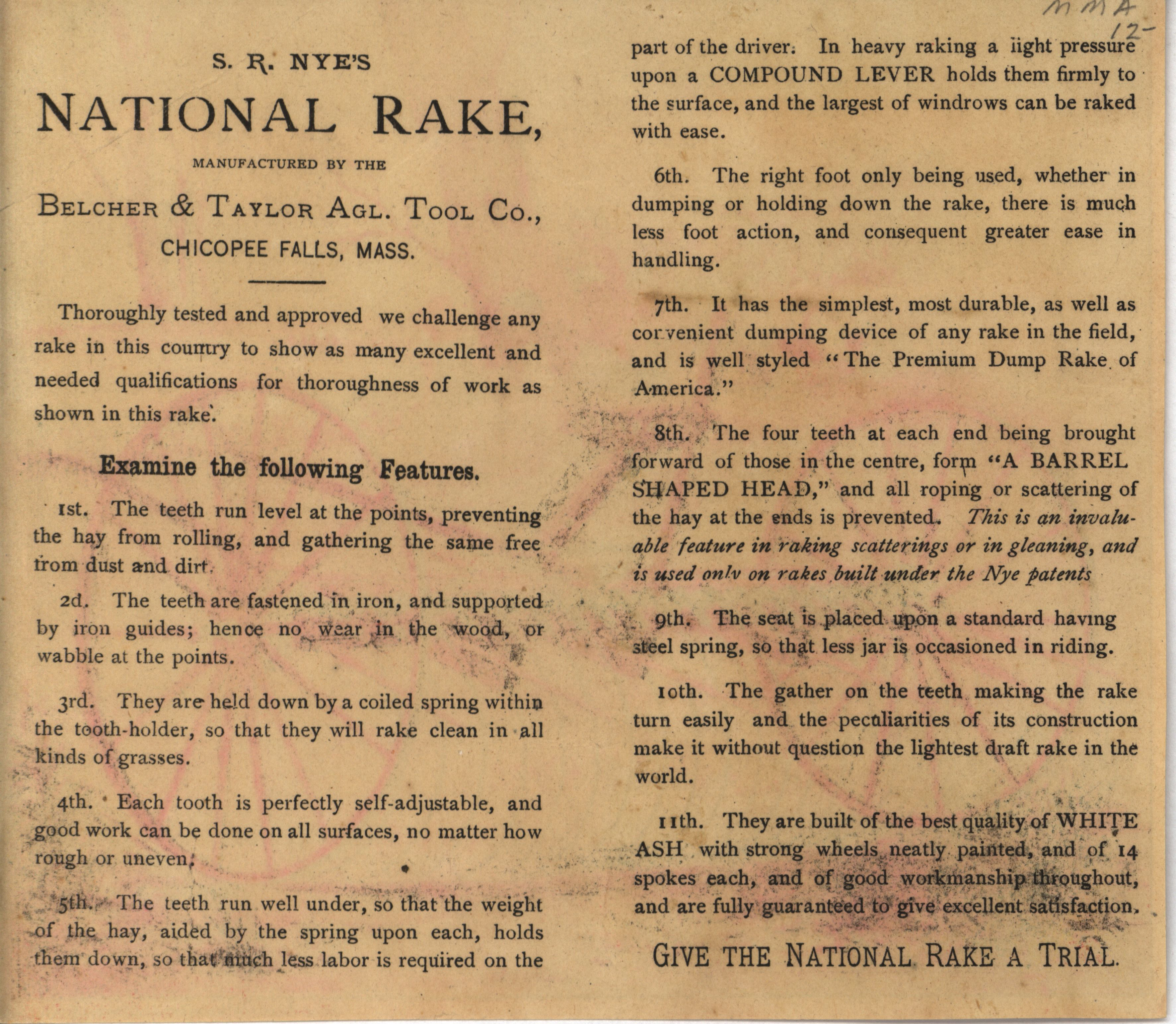 - Advertisement card for the national rake offered by the Belcher and Taylor Agricultural Tool Company with illustration and description of features.