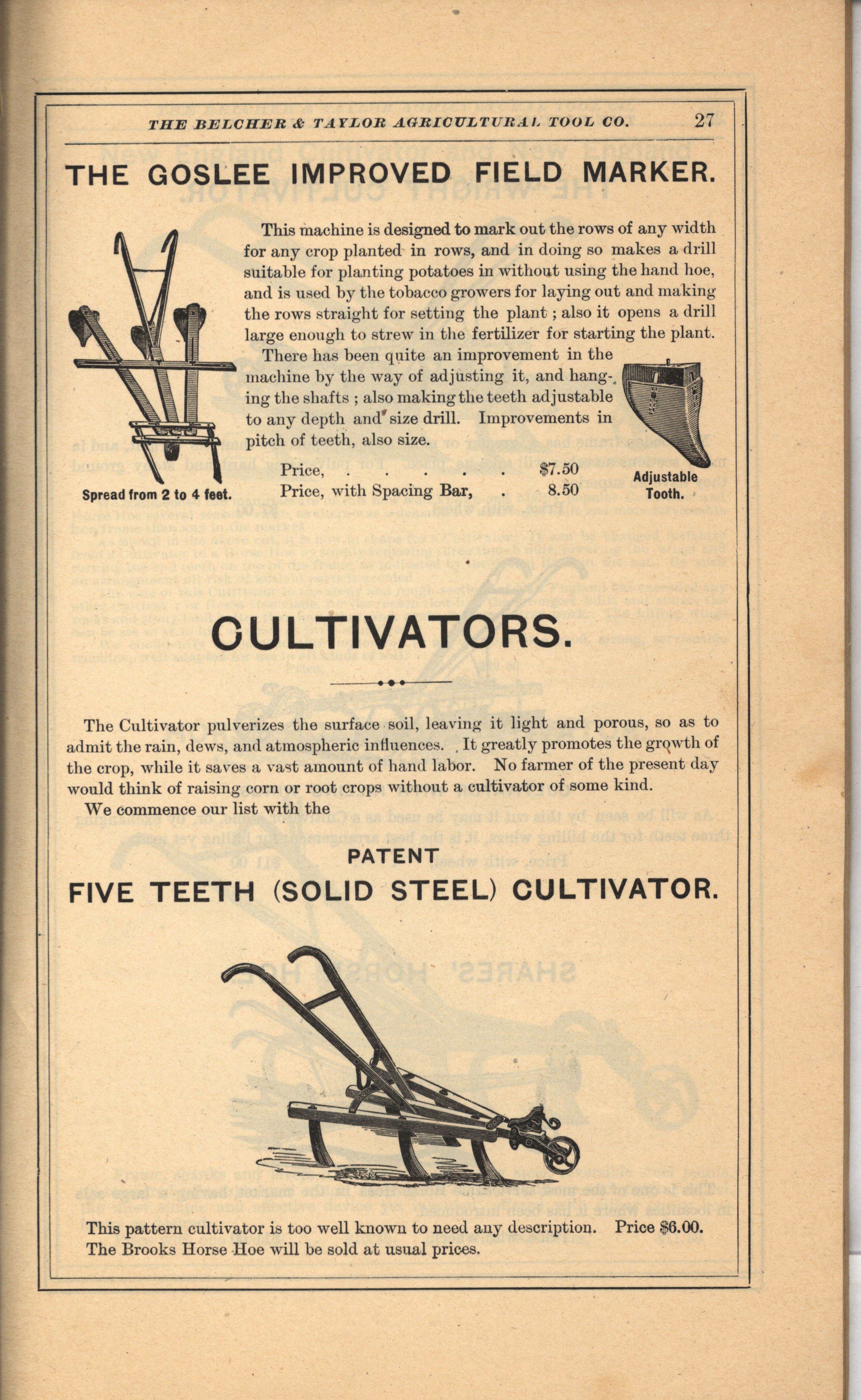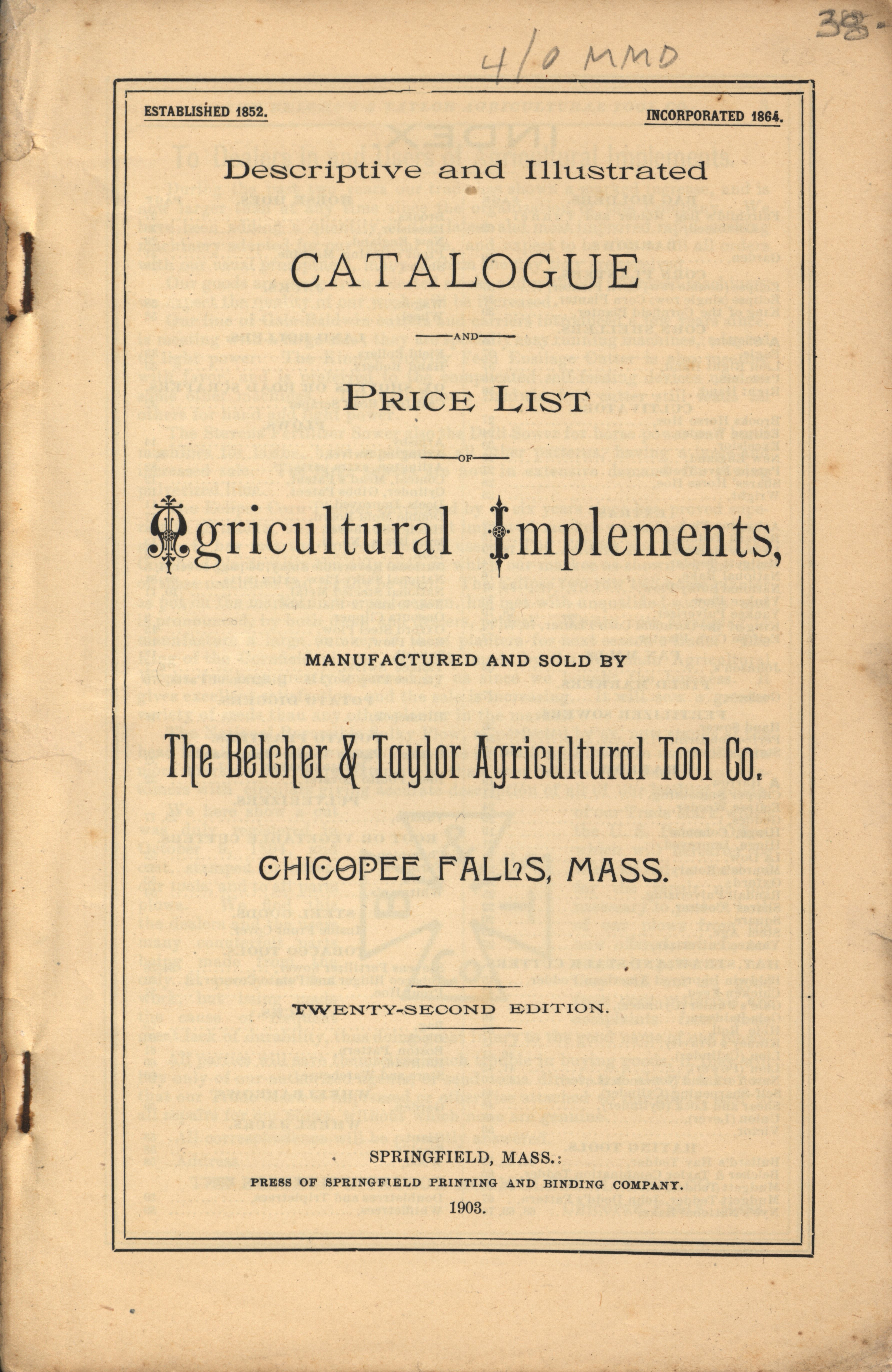 - Catalog describing agricultural products offered by Belcher and Taylor Agricultural Tool Company from 1903, includes illustrations.