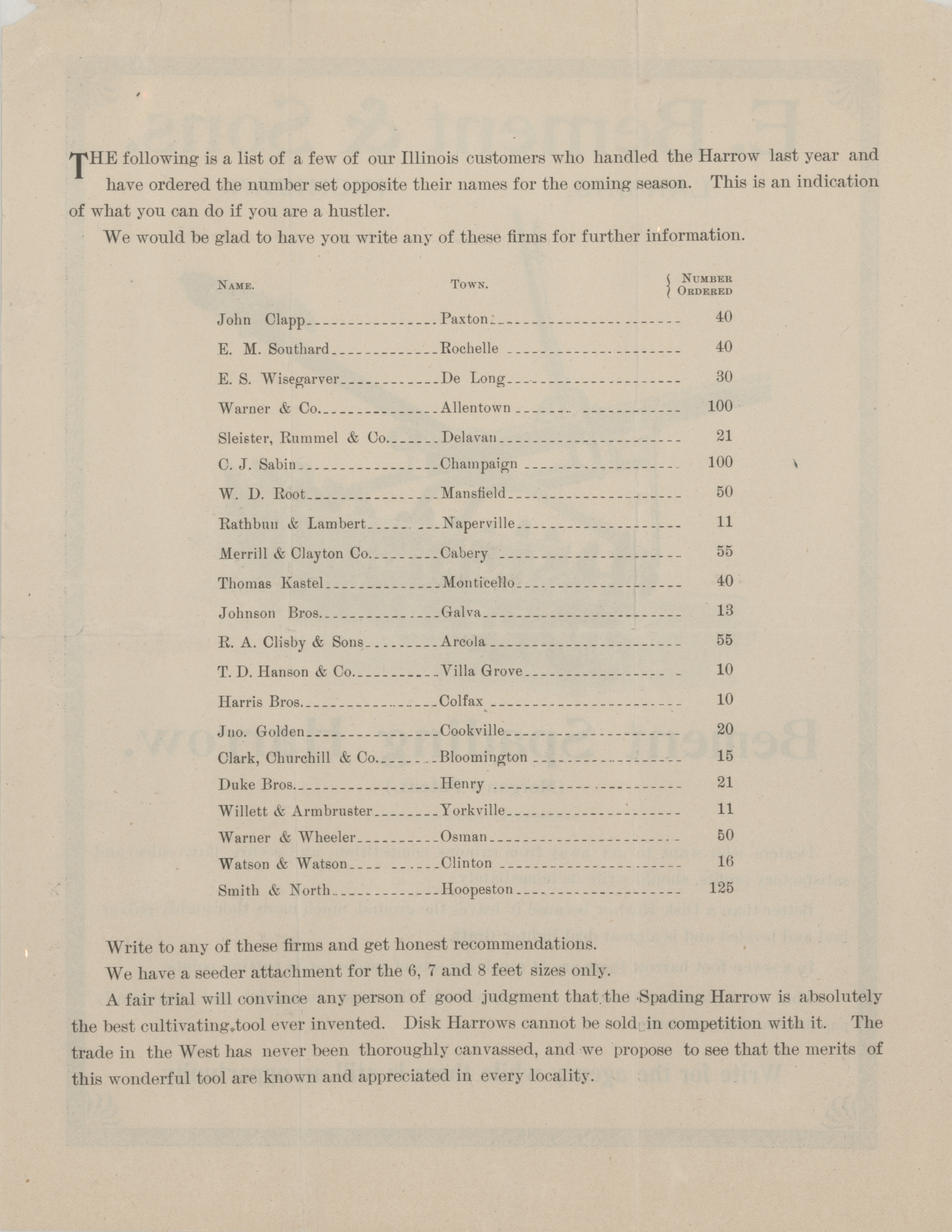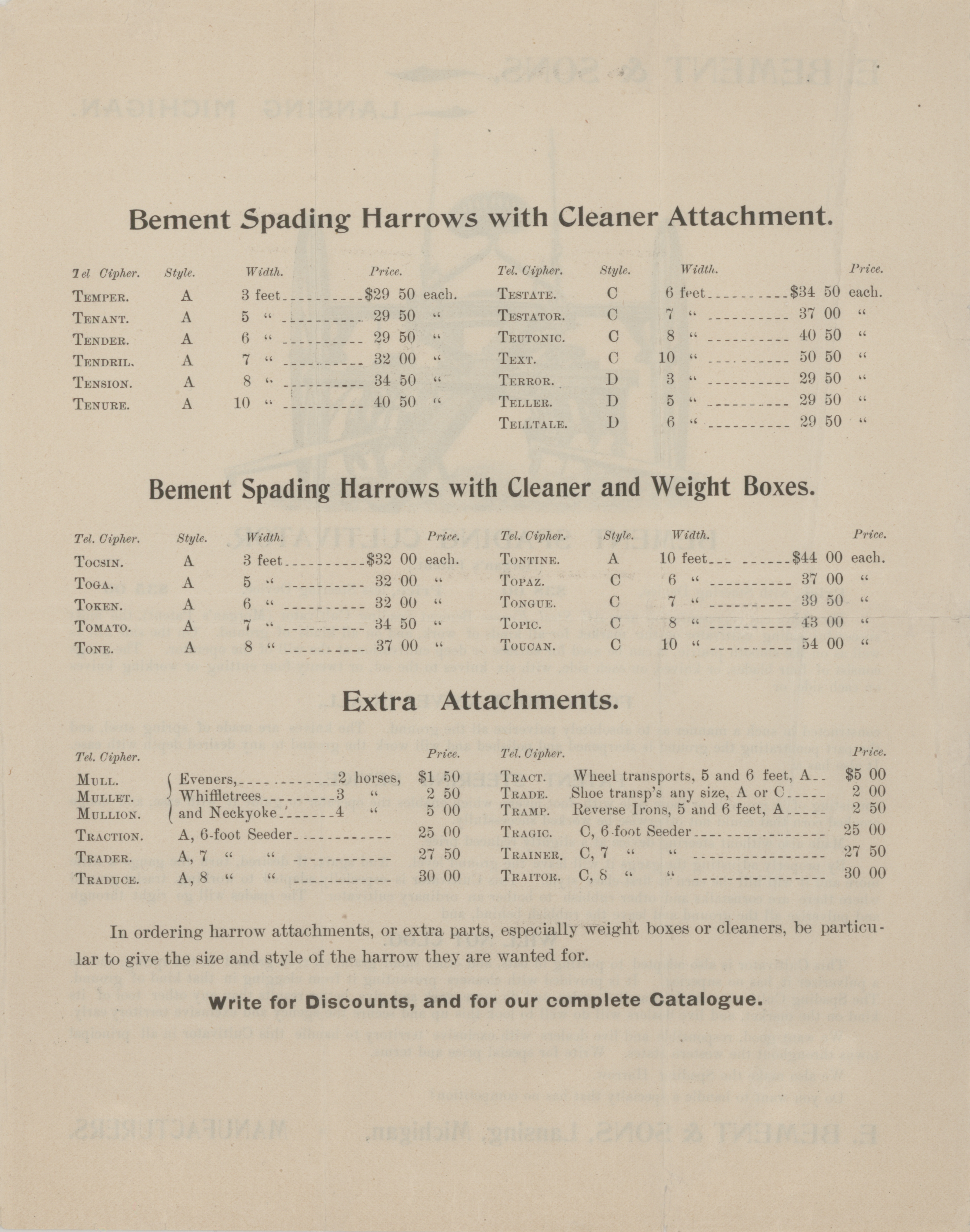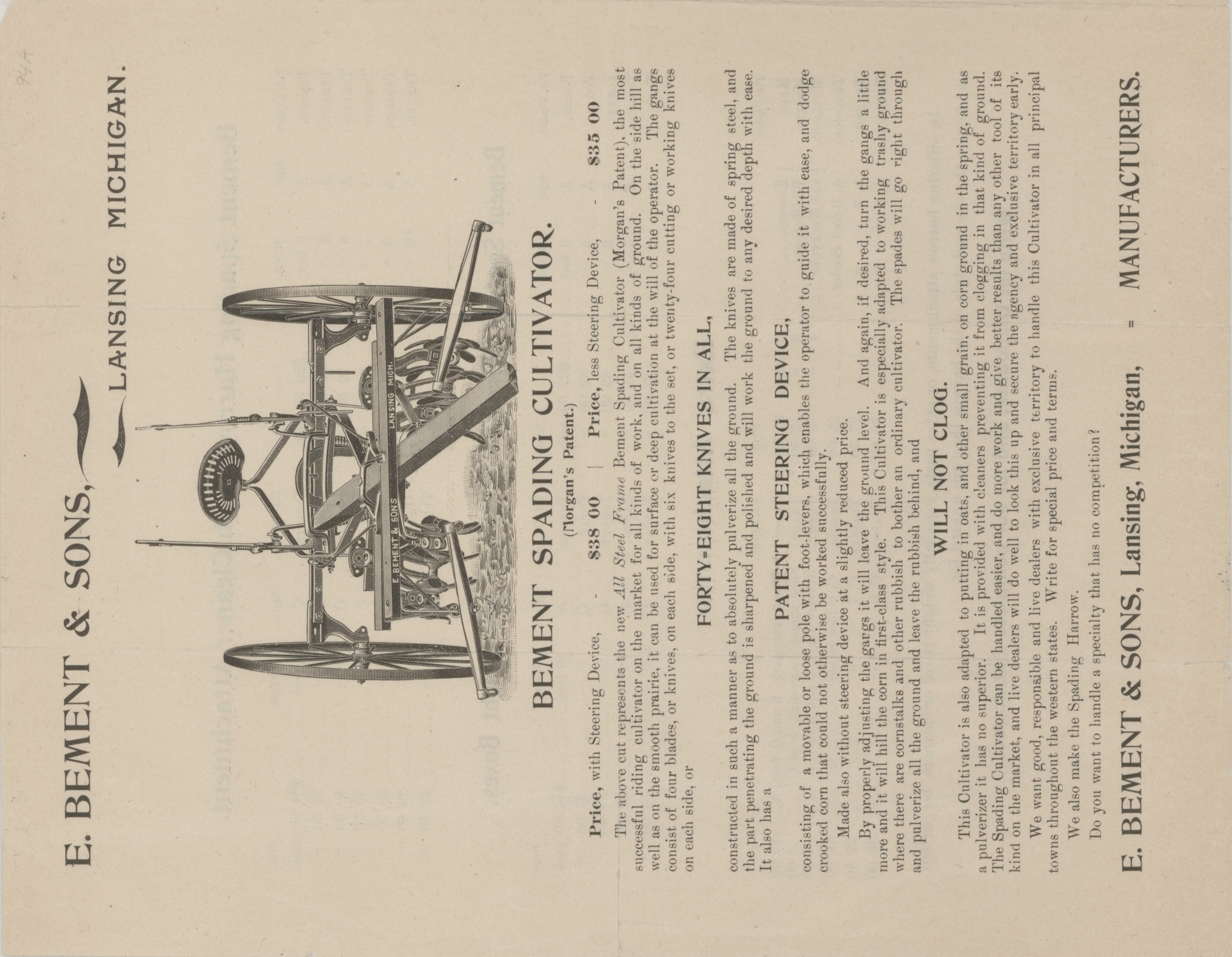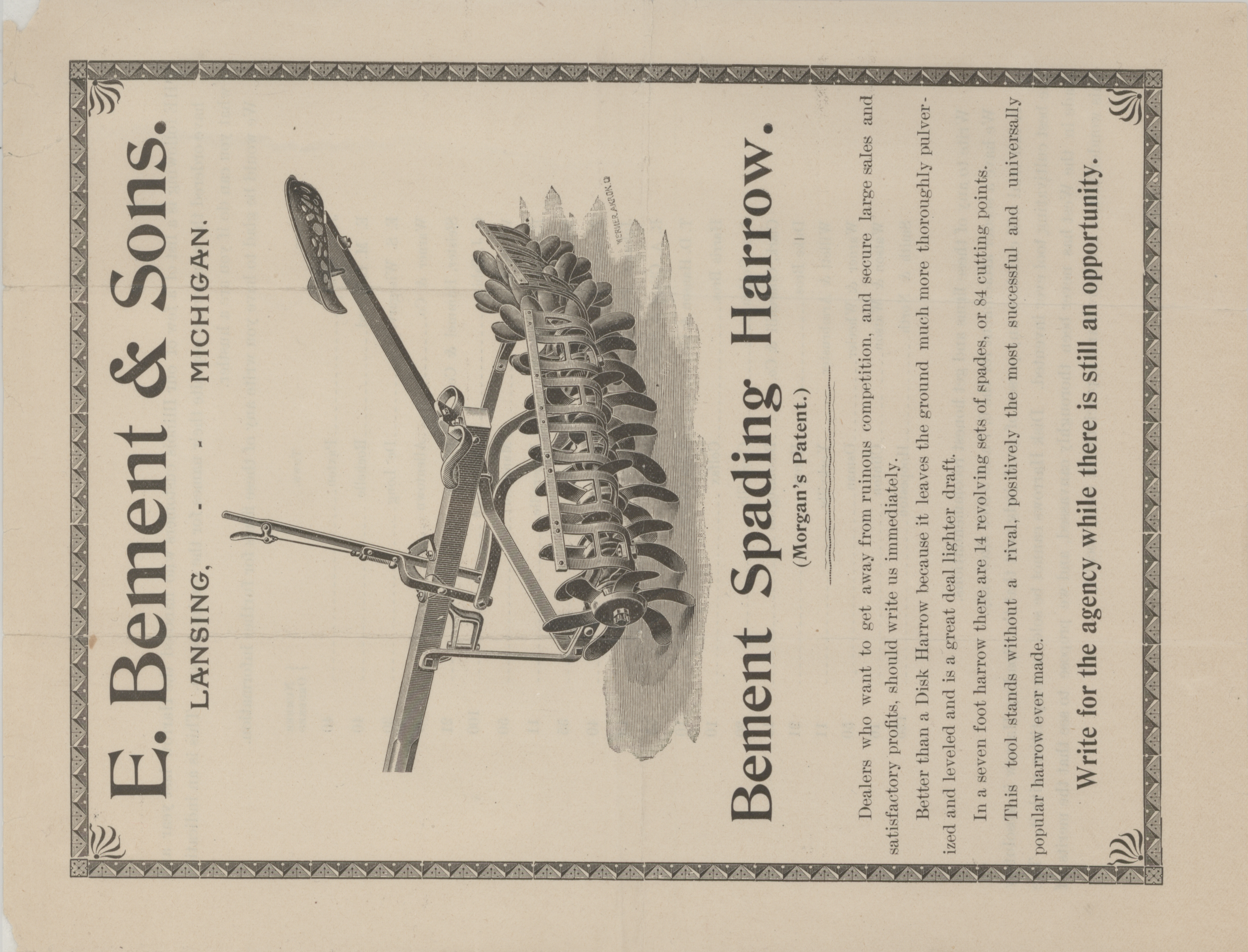 - Illustrated catalog describing the Bement Spading Harrow offered by E. Bement and Sons.