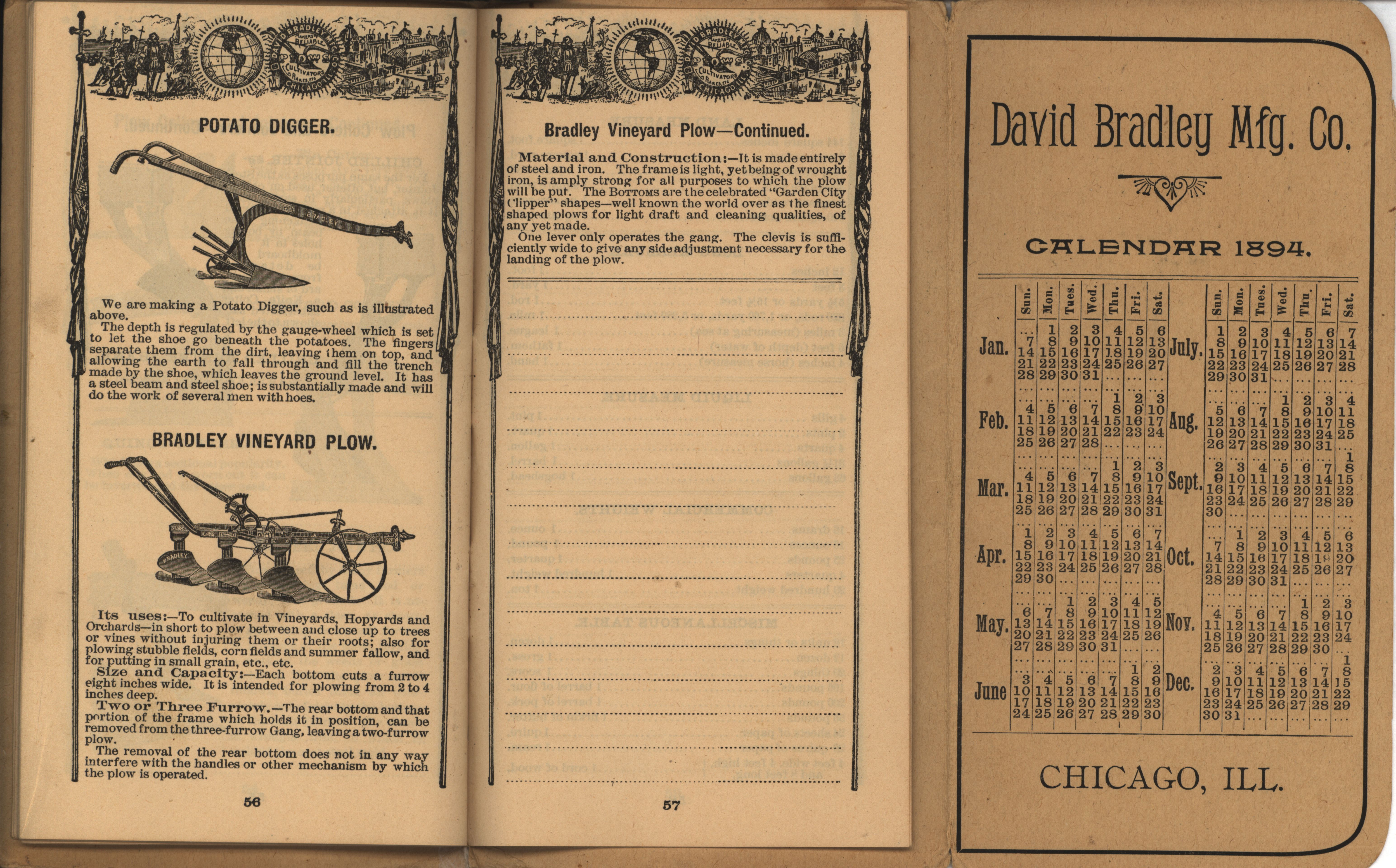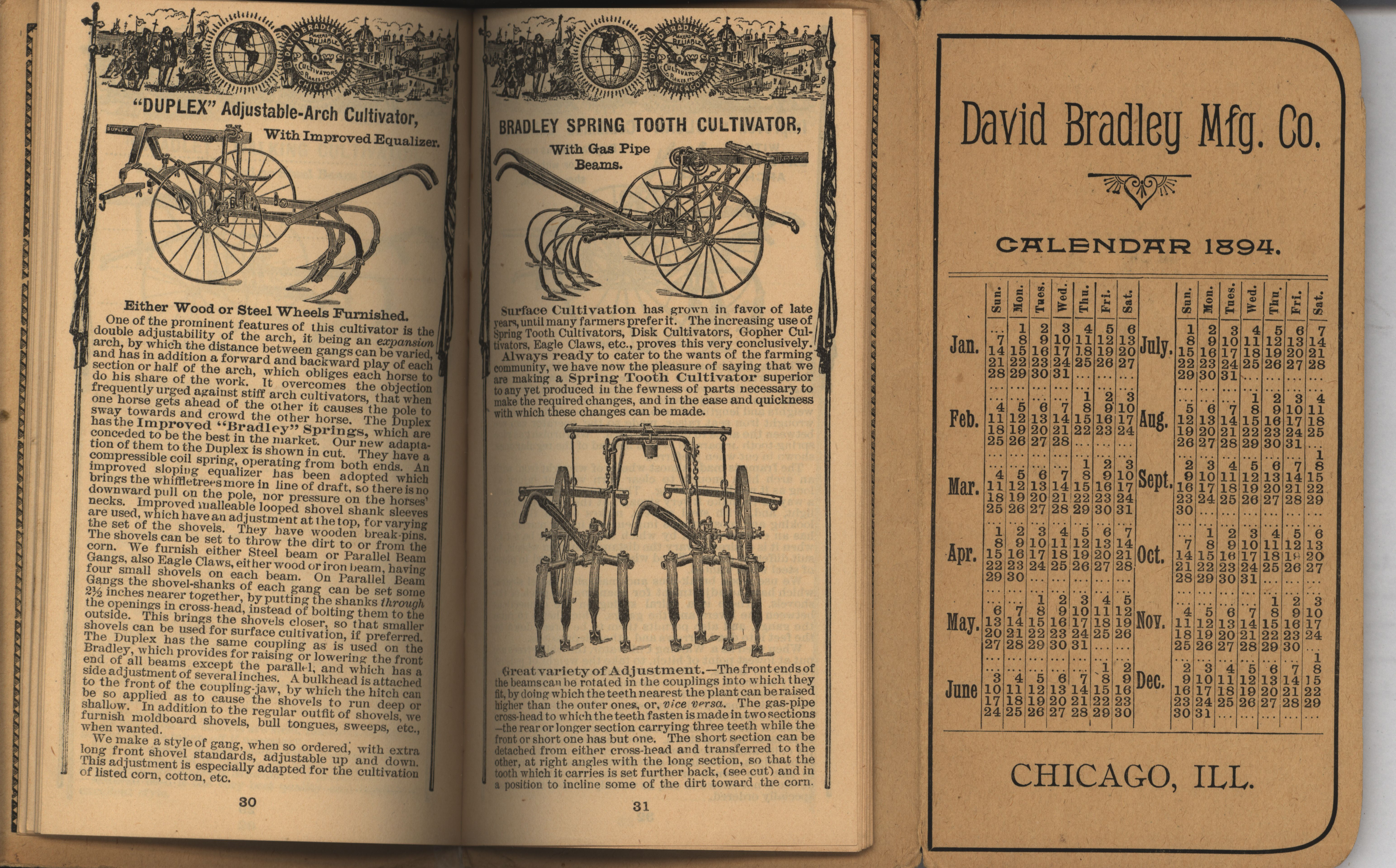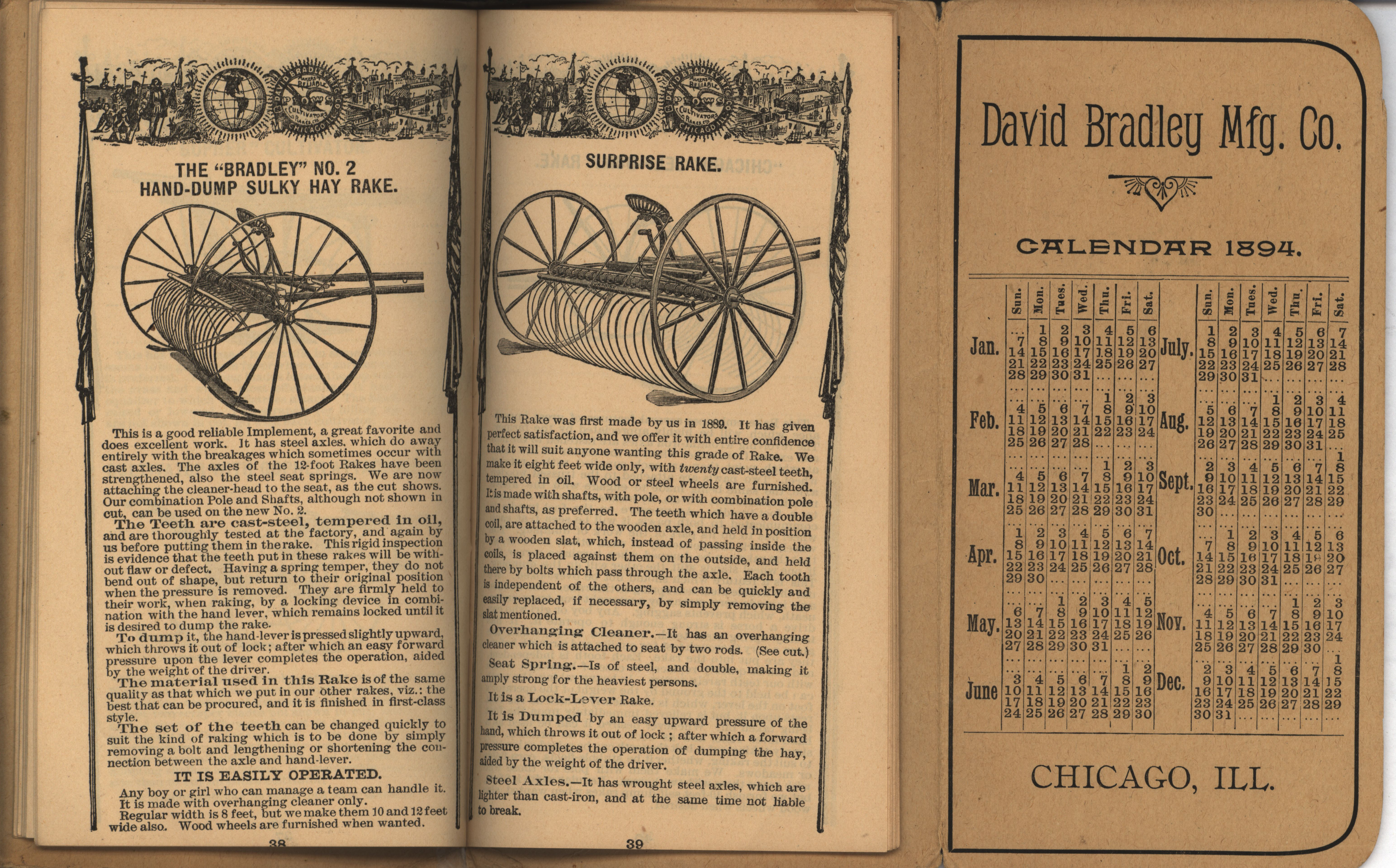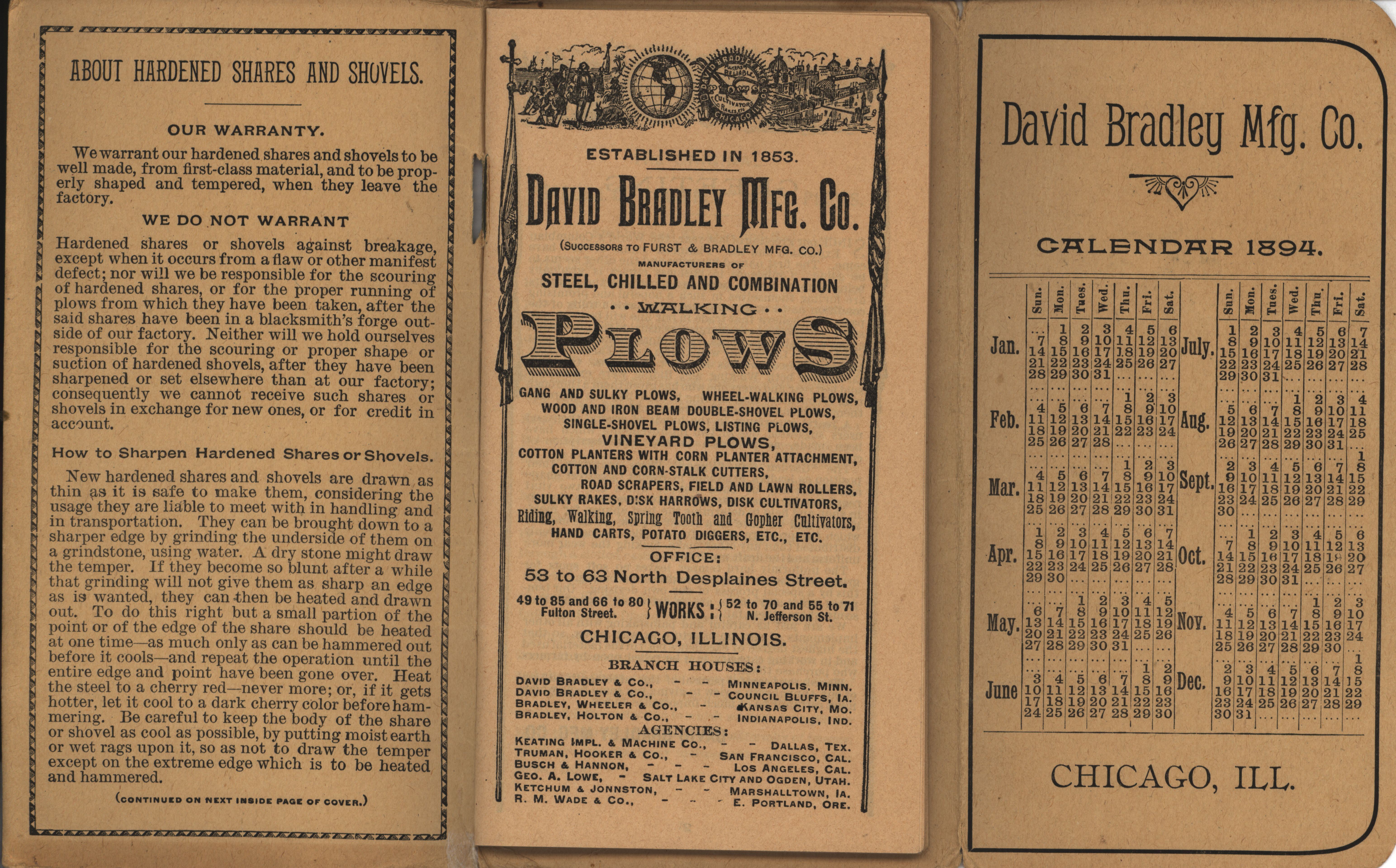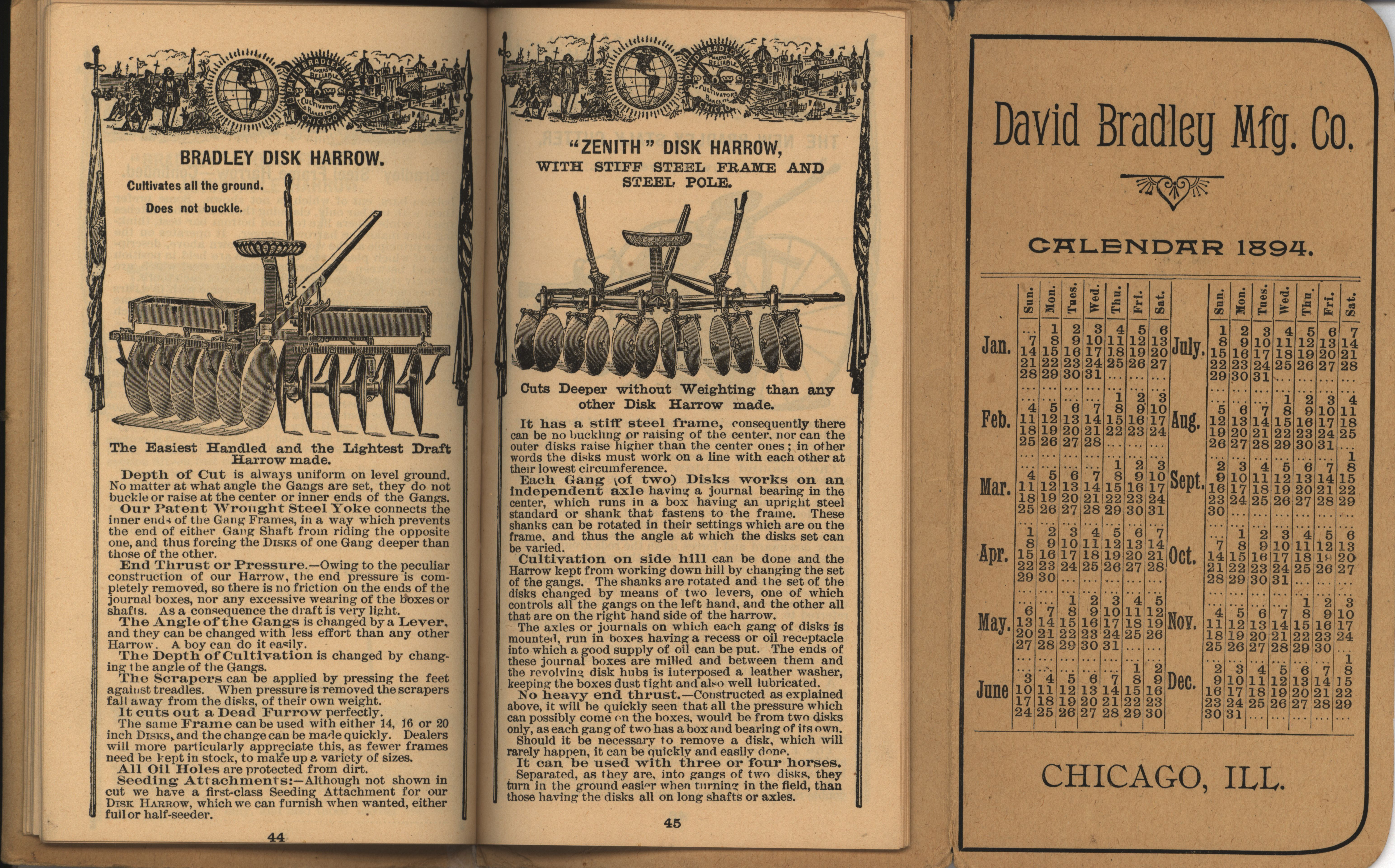 - Illustrated pocket annual catalog describing the plows, cultivators, rakes and other agricultural products offered by David Bradley Manufacturing Company in 1894.