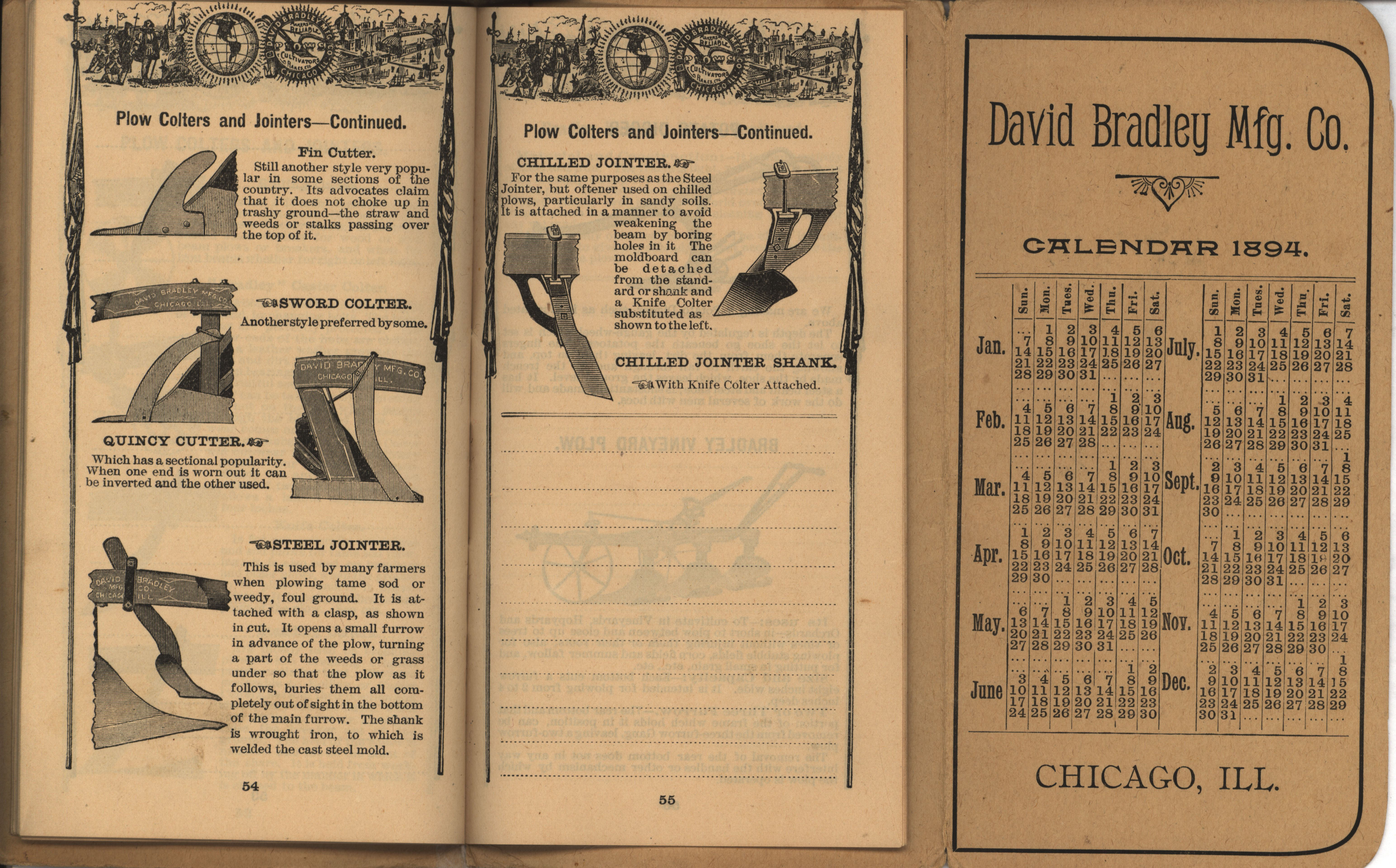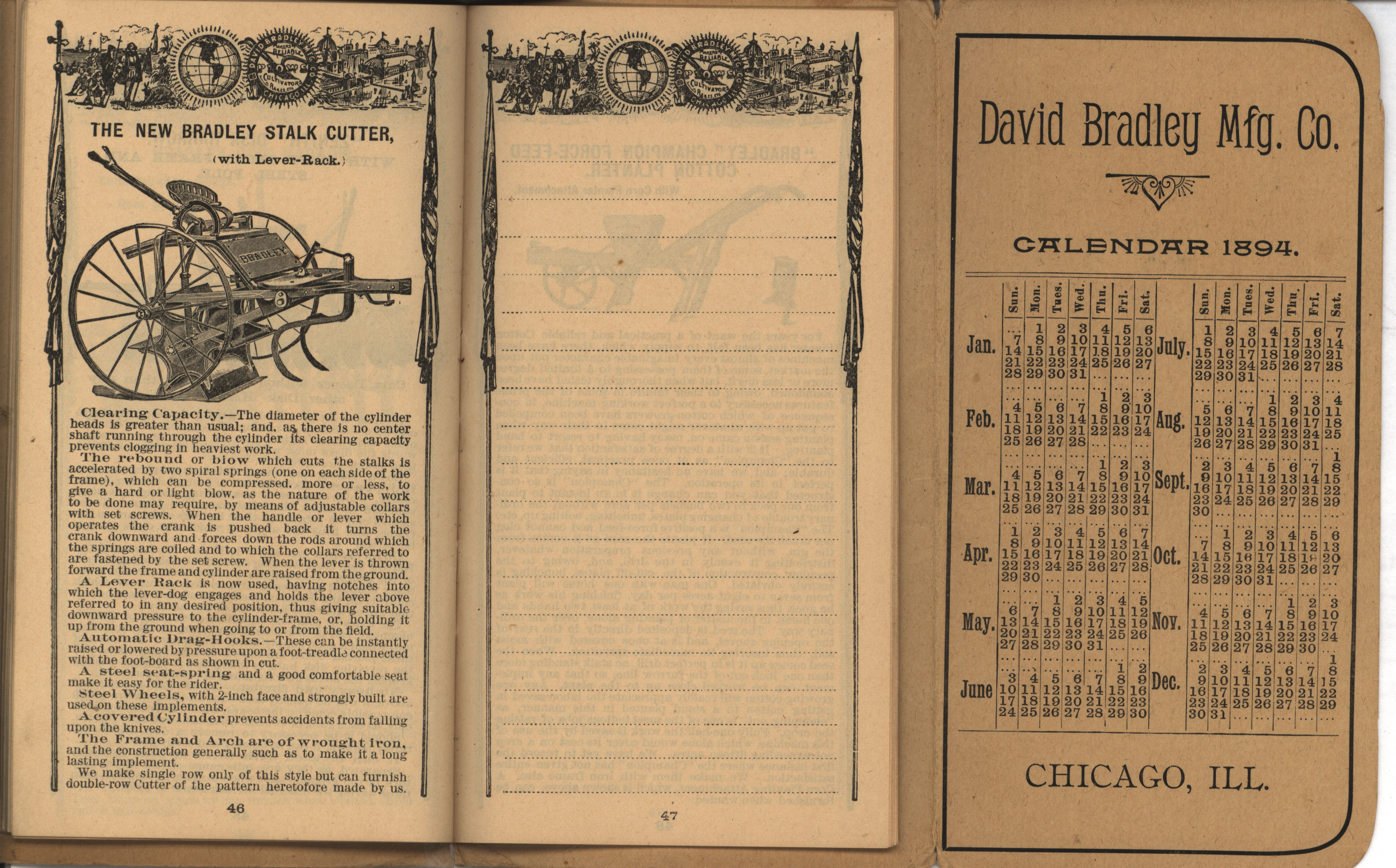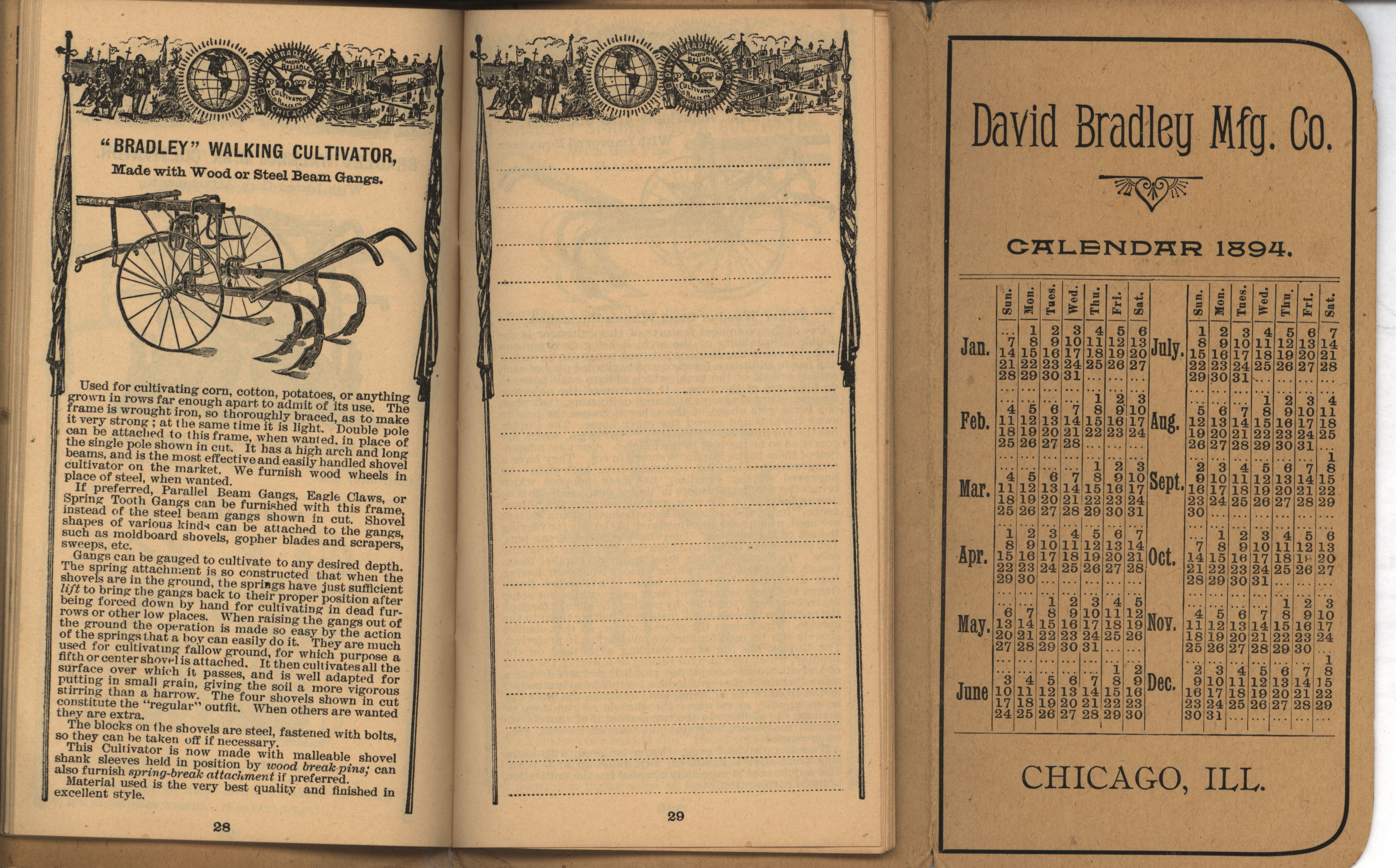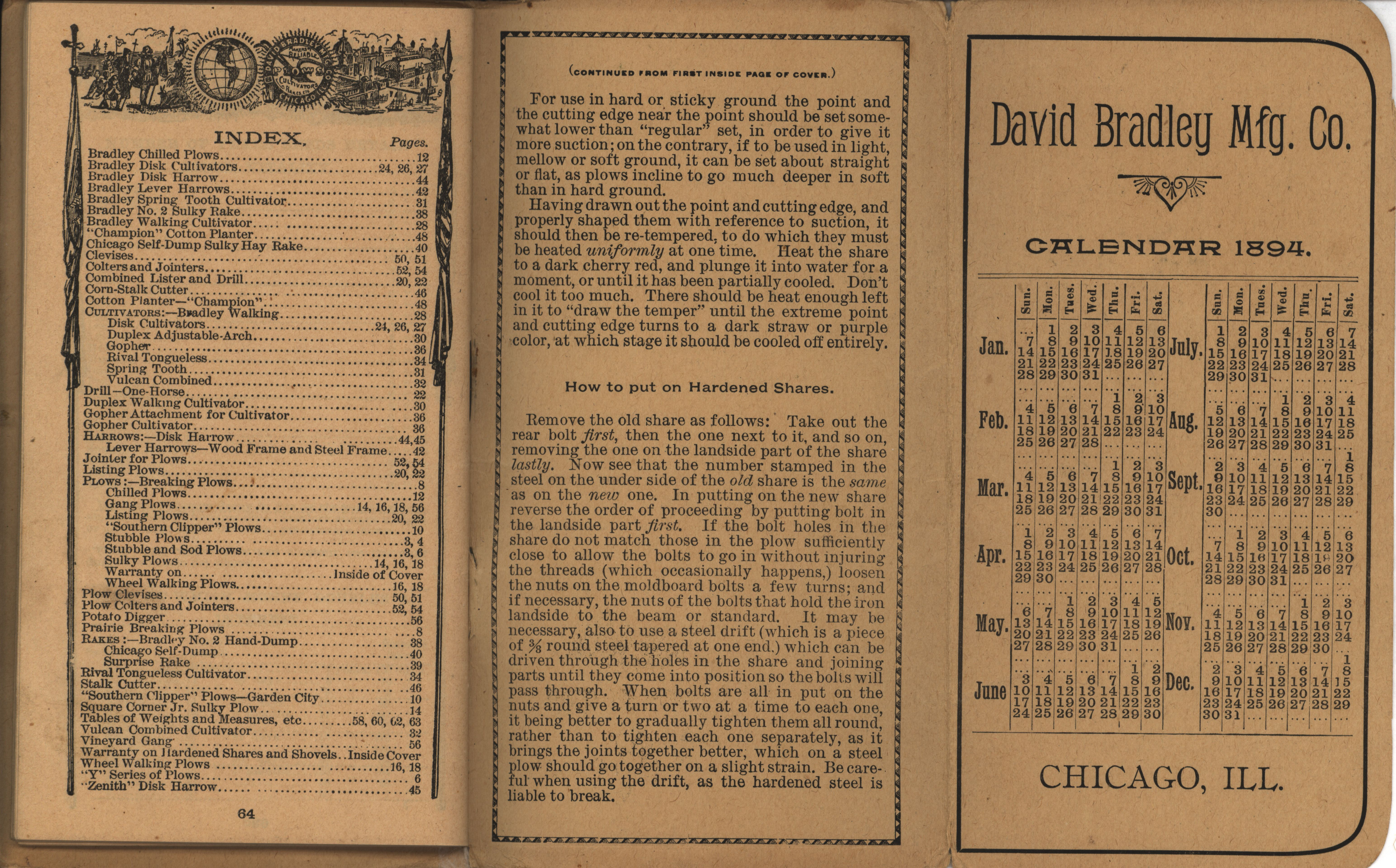 - Illustrated pocket annual catalog describing the plows, cultivators, rakes and other agricultural products offered by David Bradley Manufacturing Company in 1894.