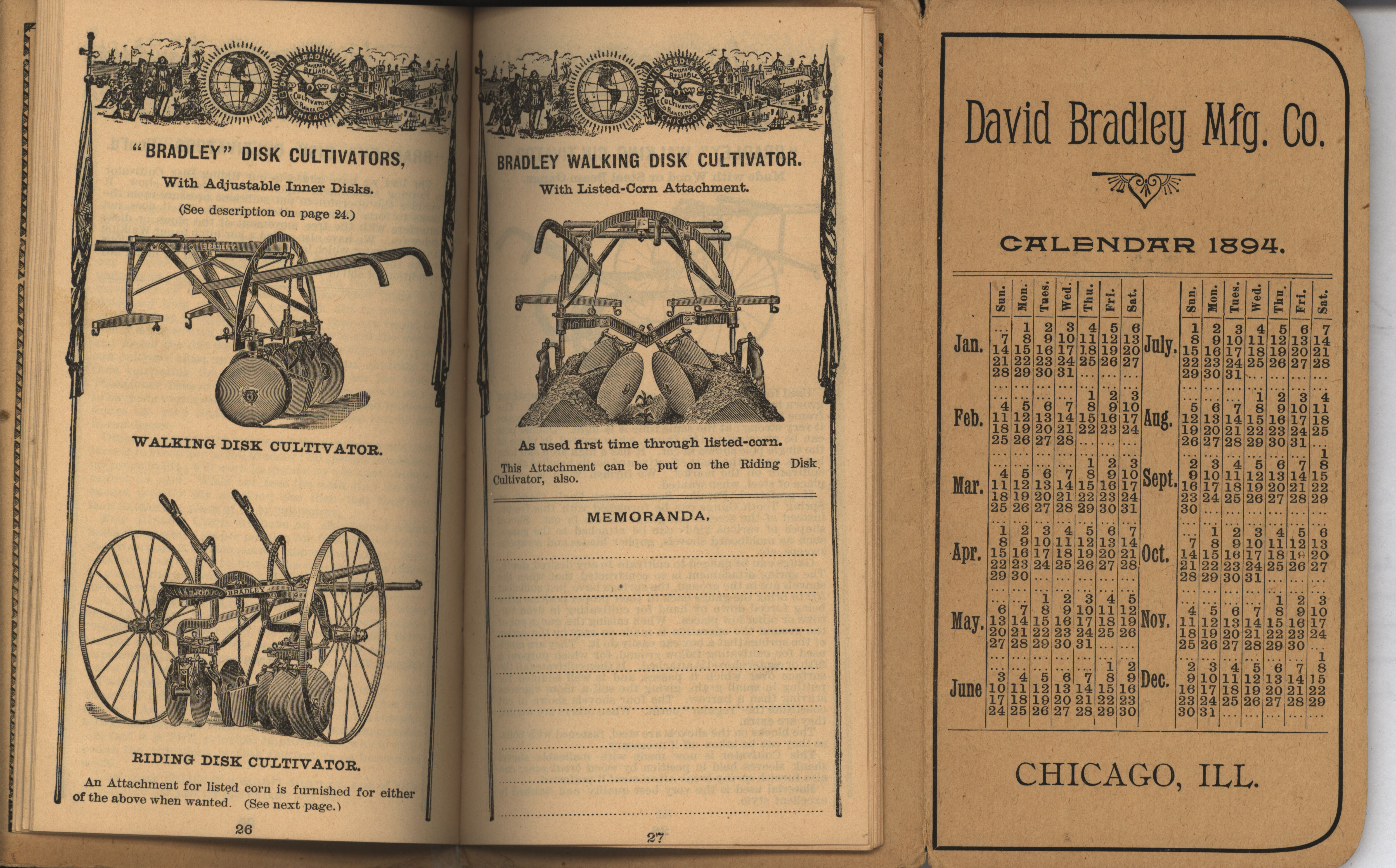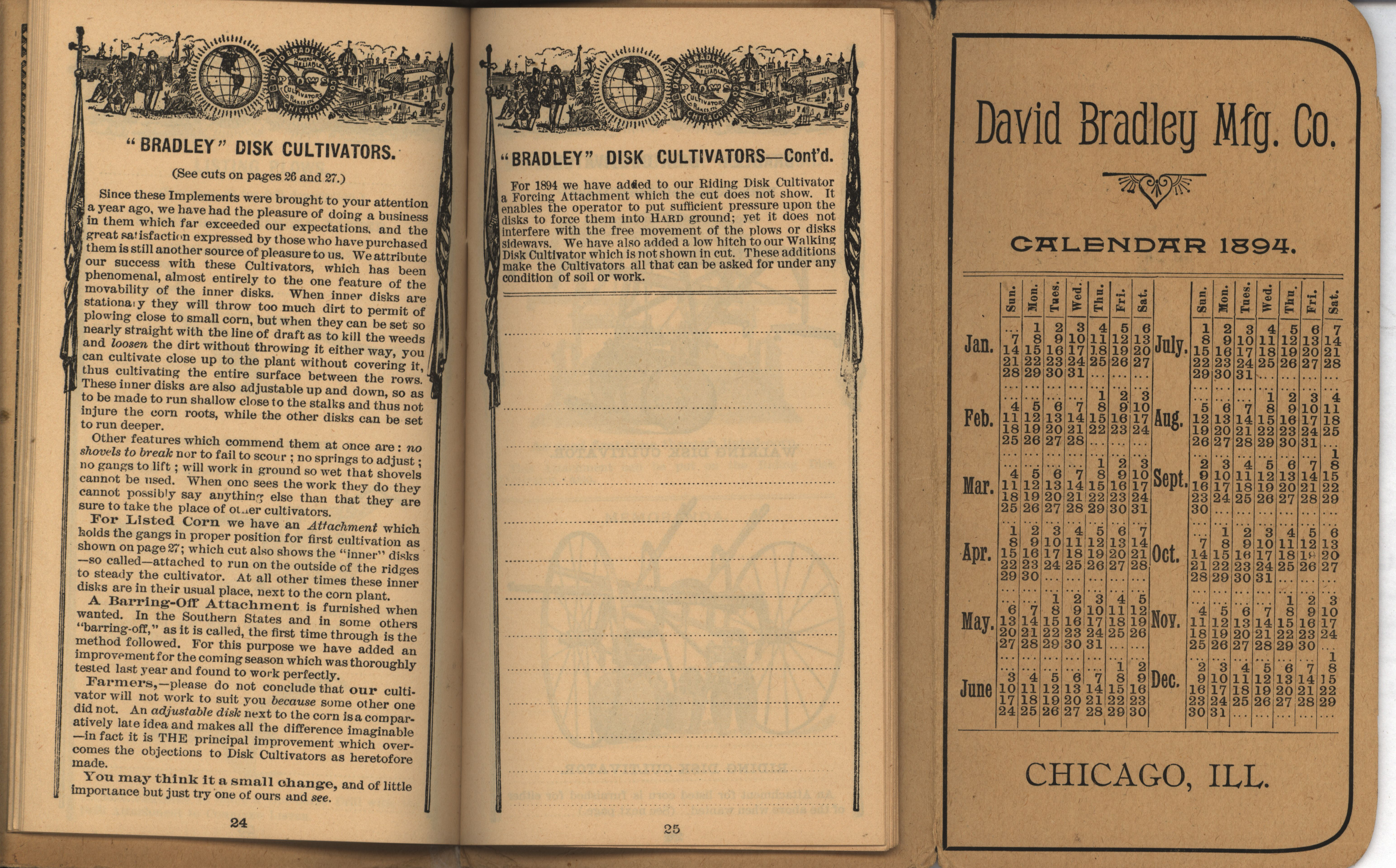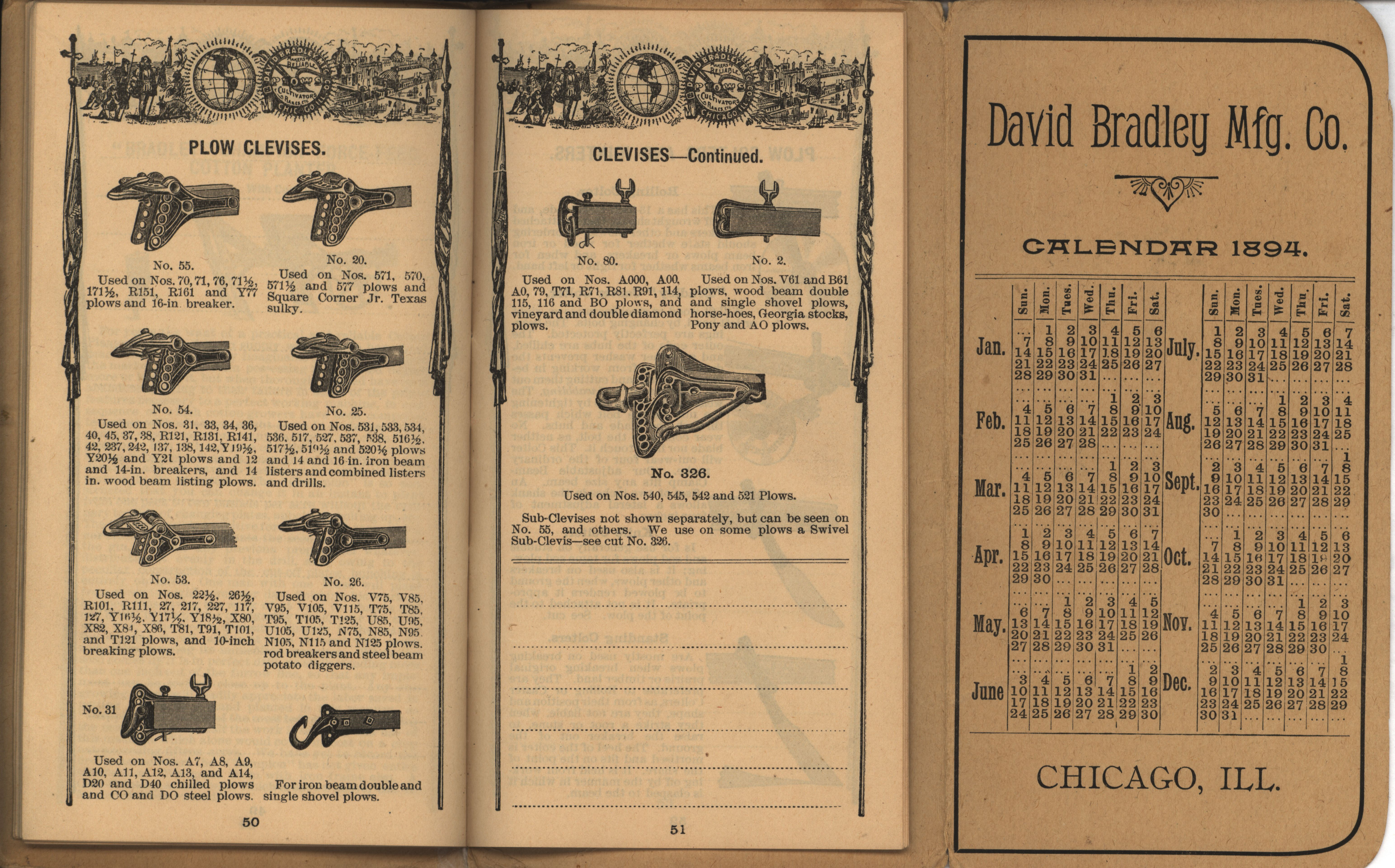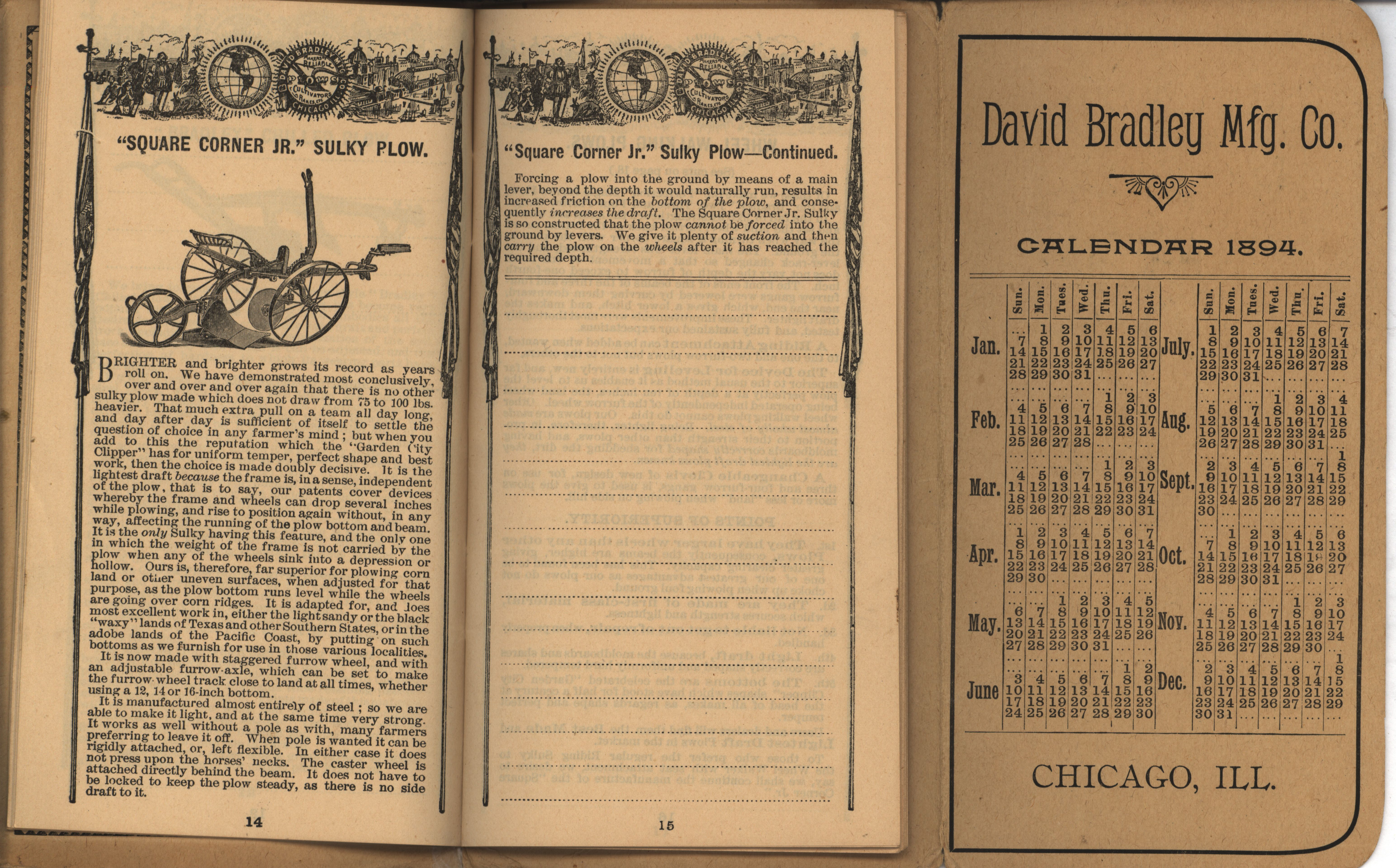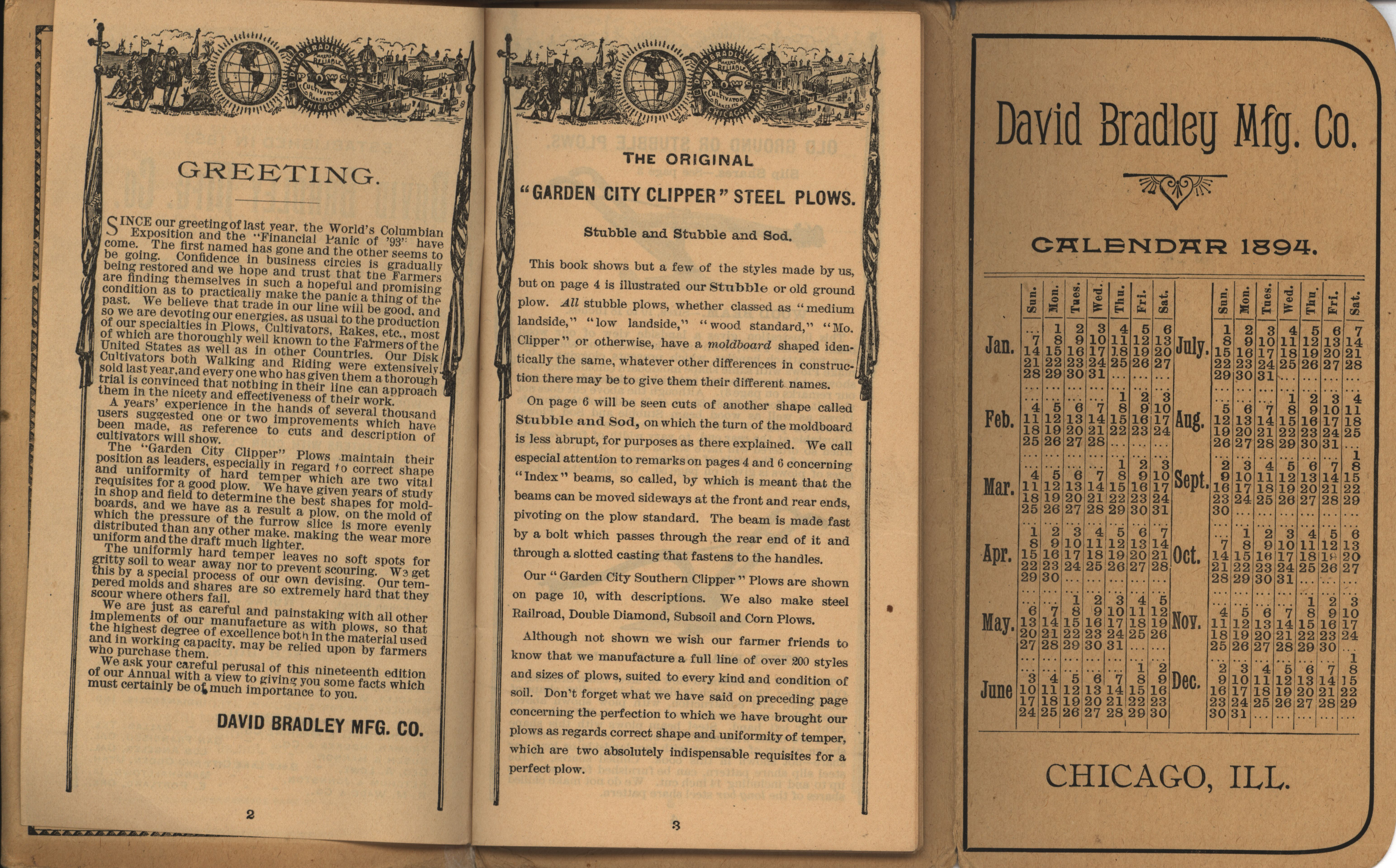 - Illustrated pocket annual catalog describing the plows, cultivators, rakes and other agricultural products offered by David Bradley Manufacturing Company in 1894.