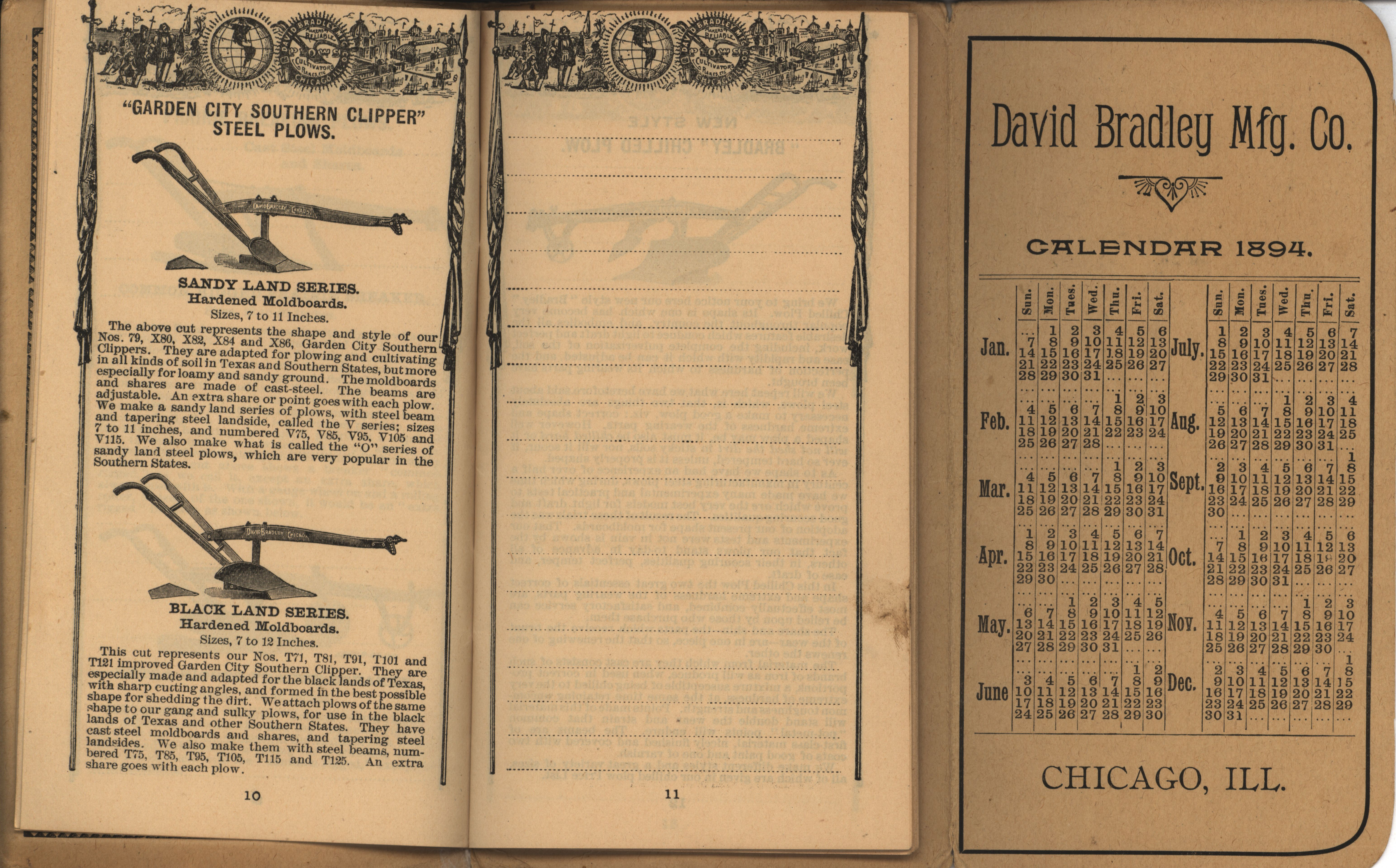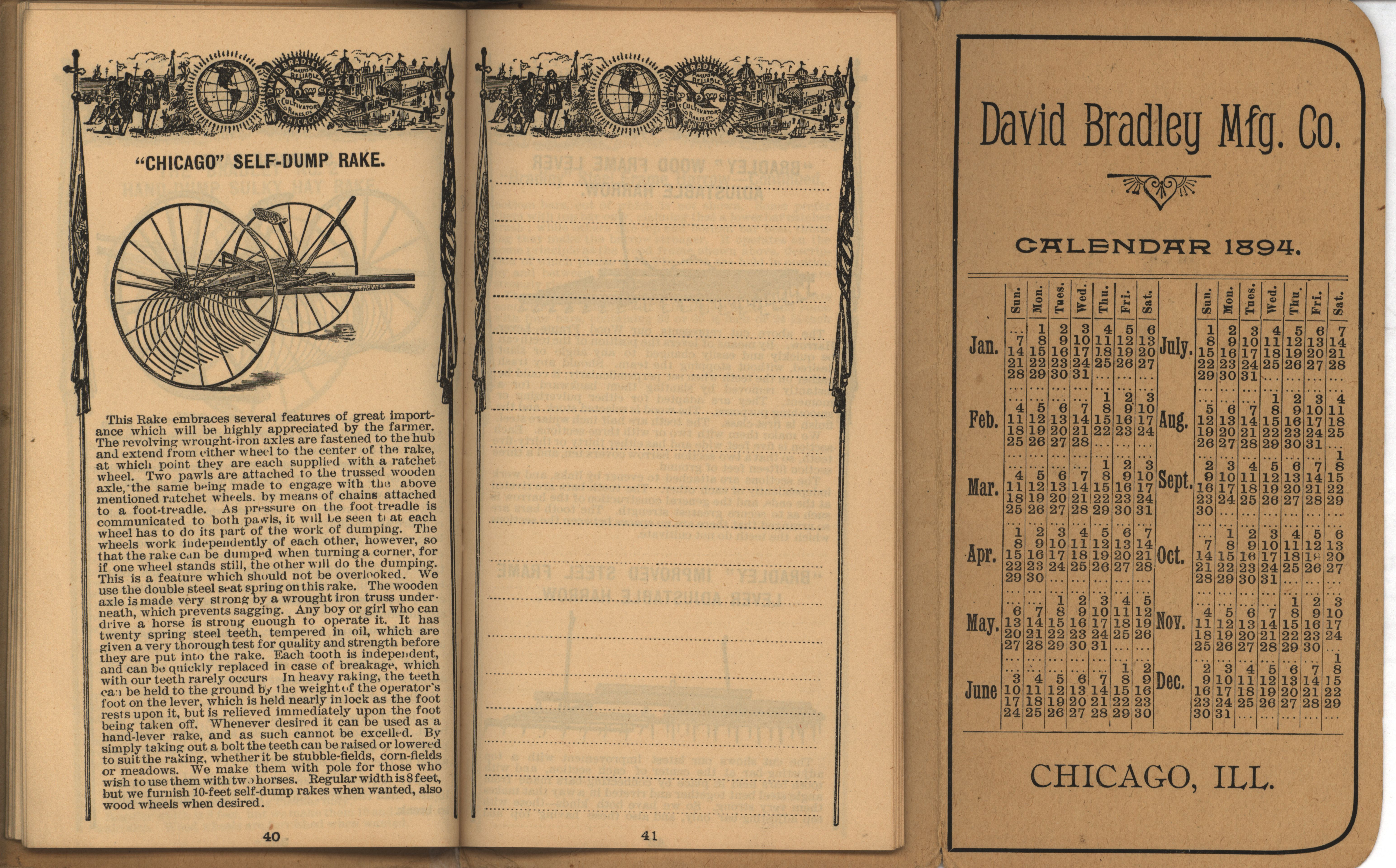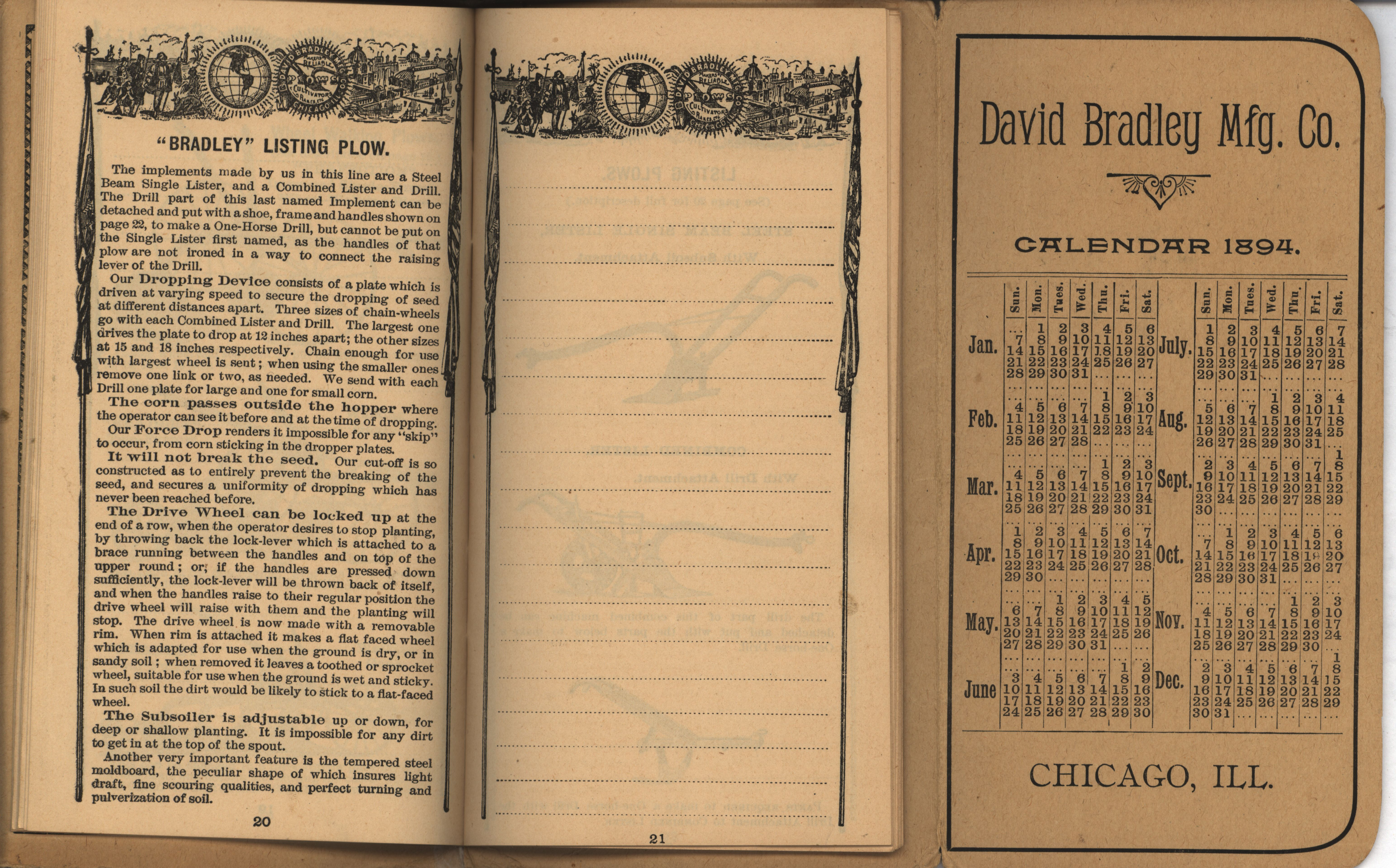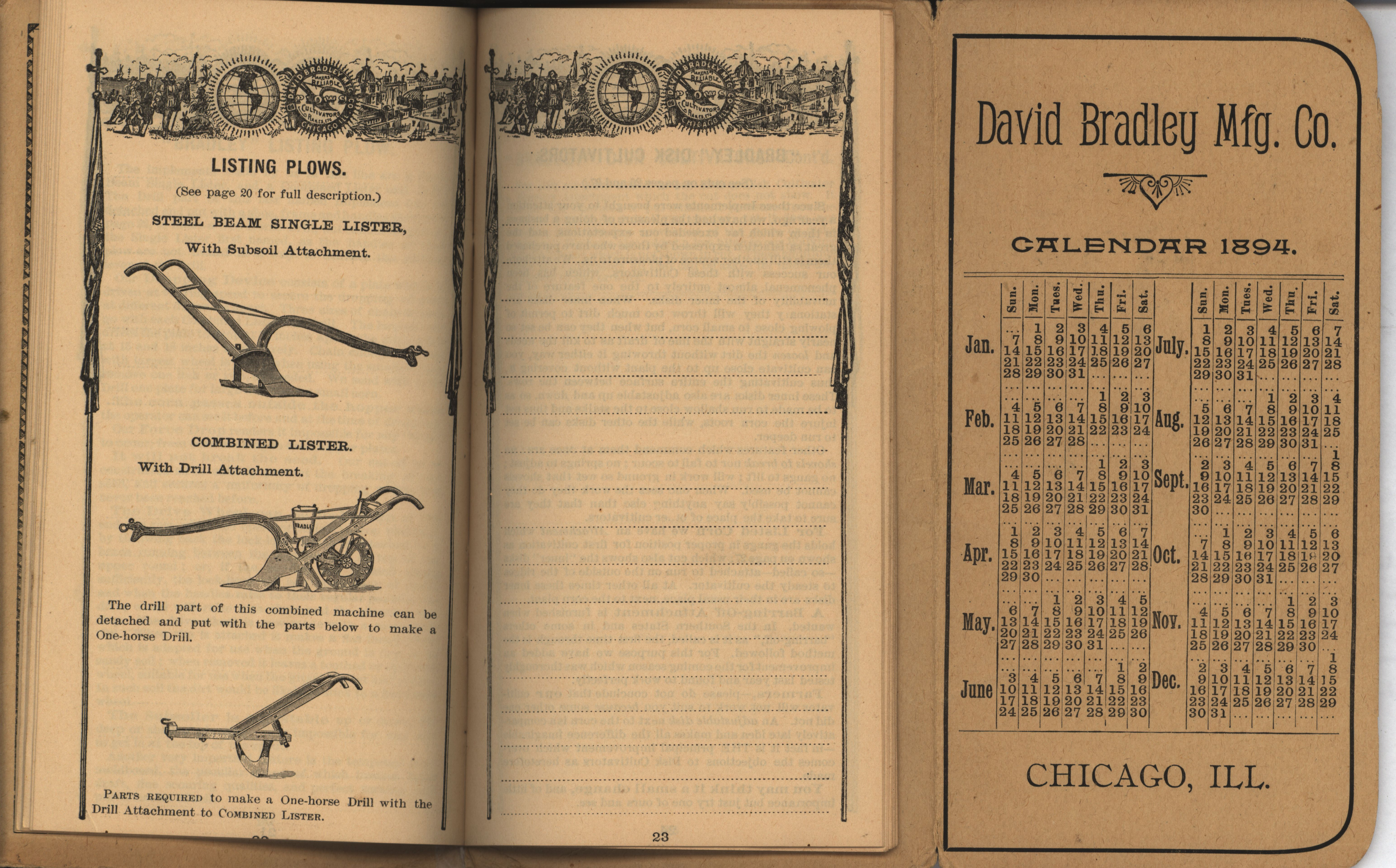 - Illustrated pocket annual catalog describing the plows, cultivators, rakes and other agricultural products offered by David Bradley Manufacturing Company in 1894.