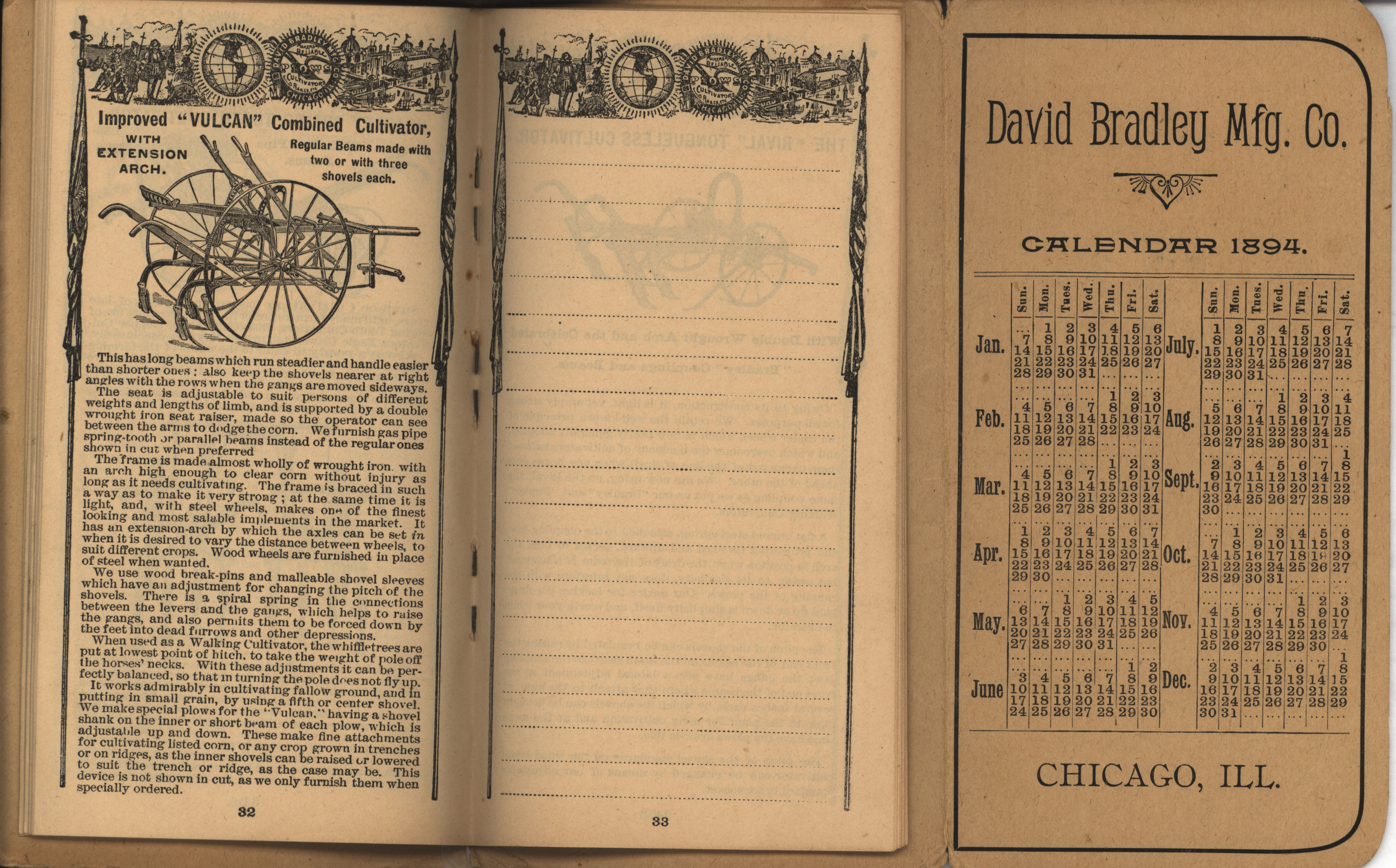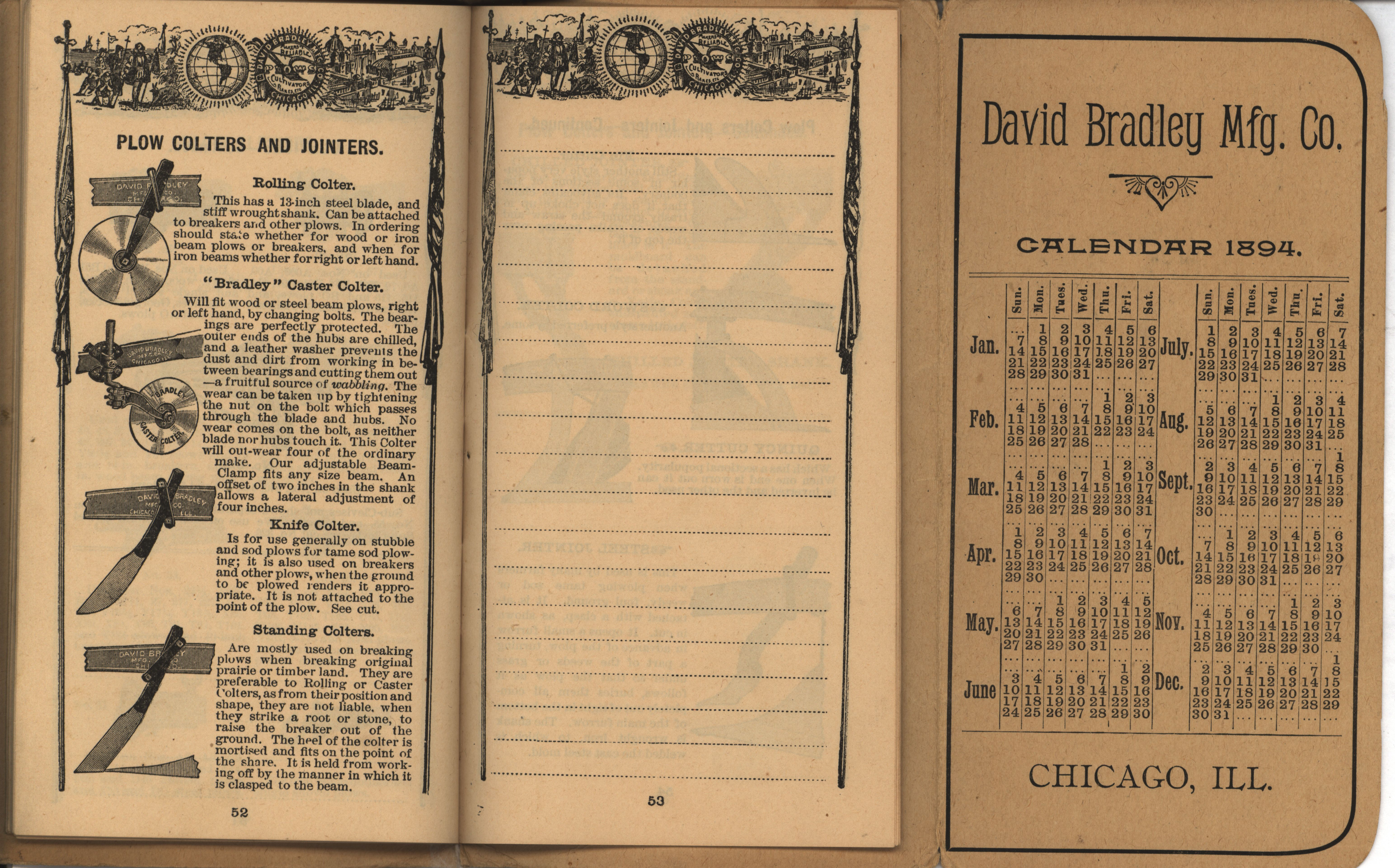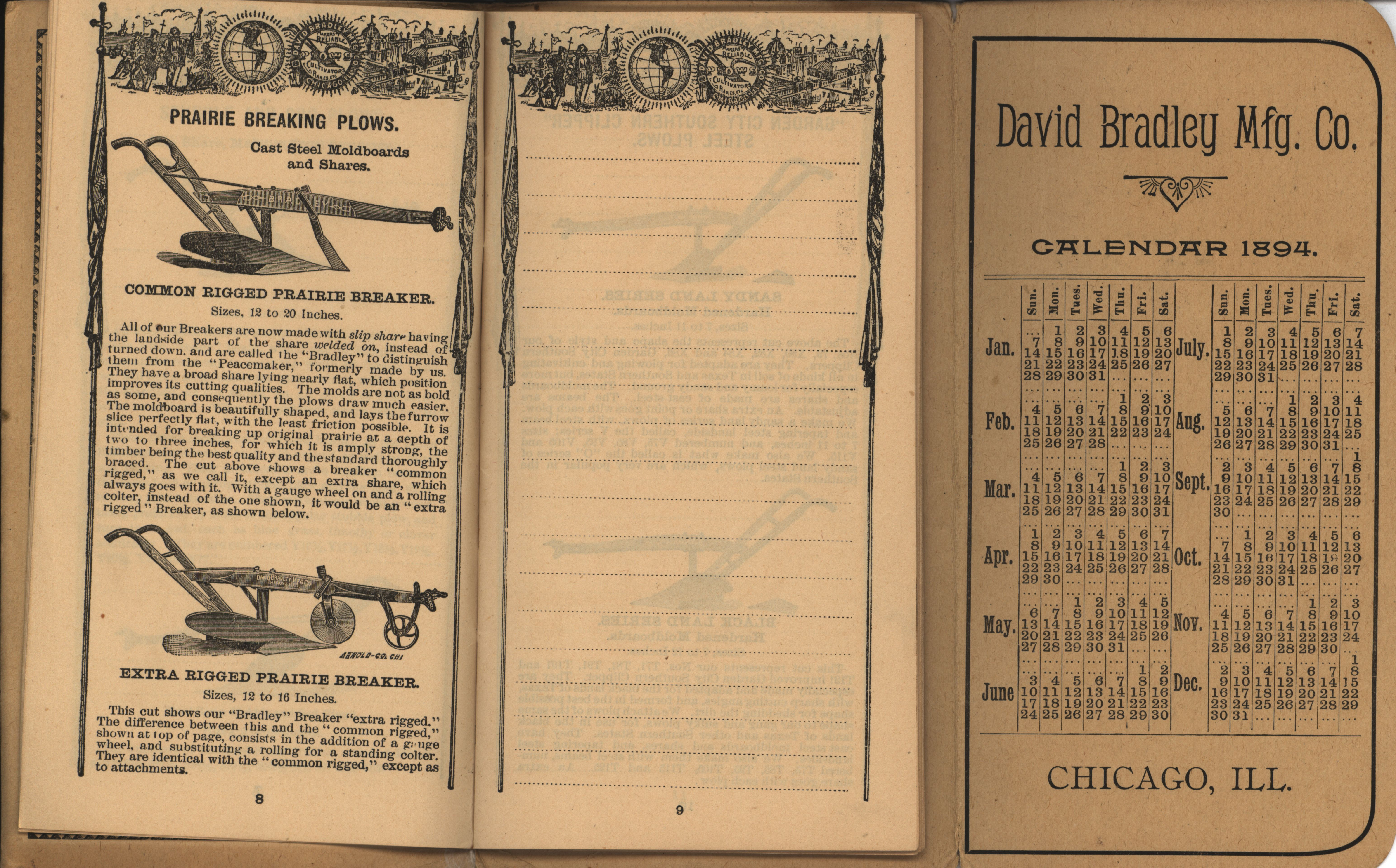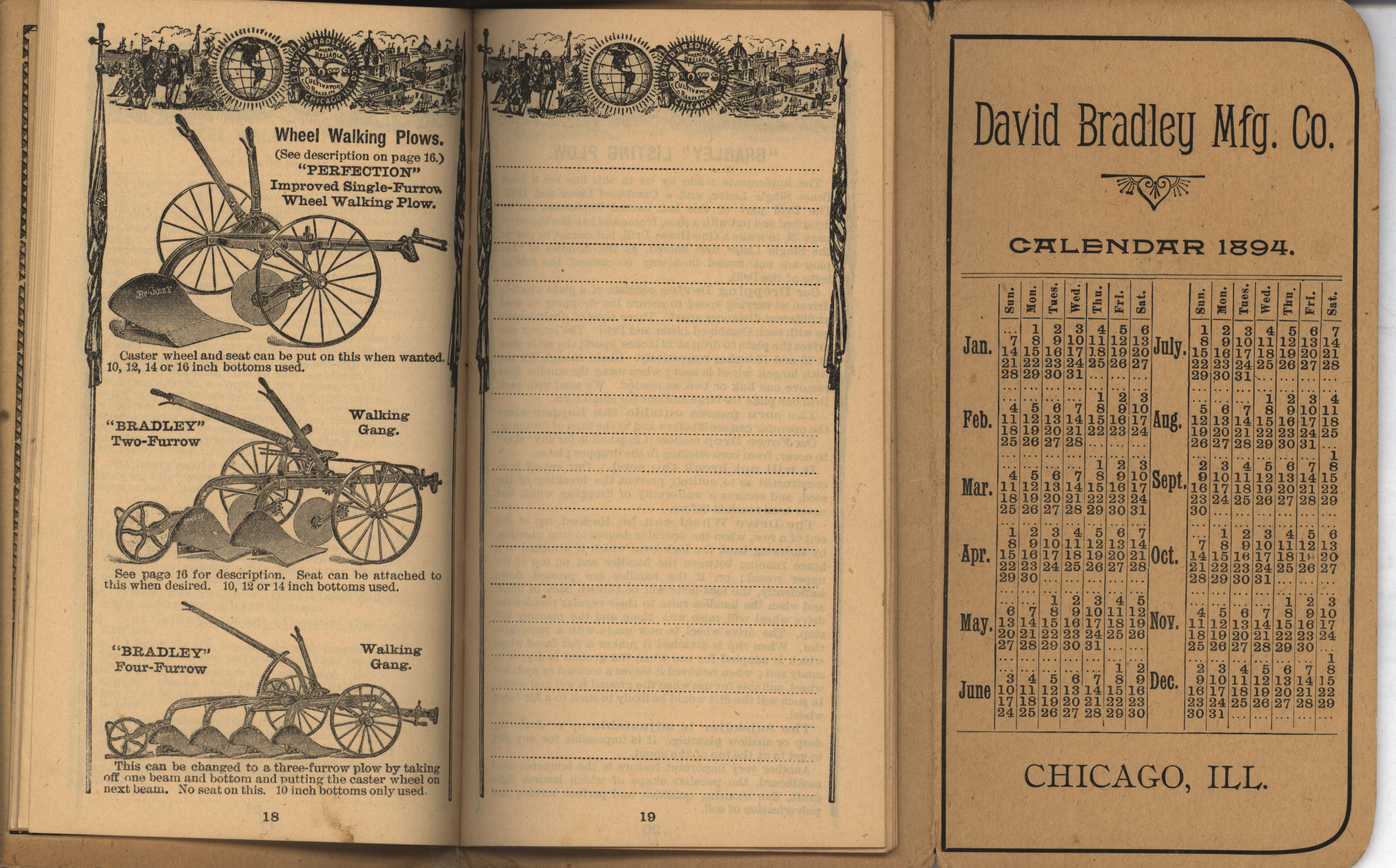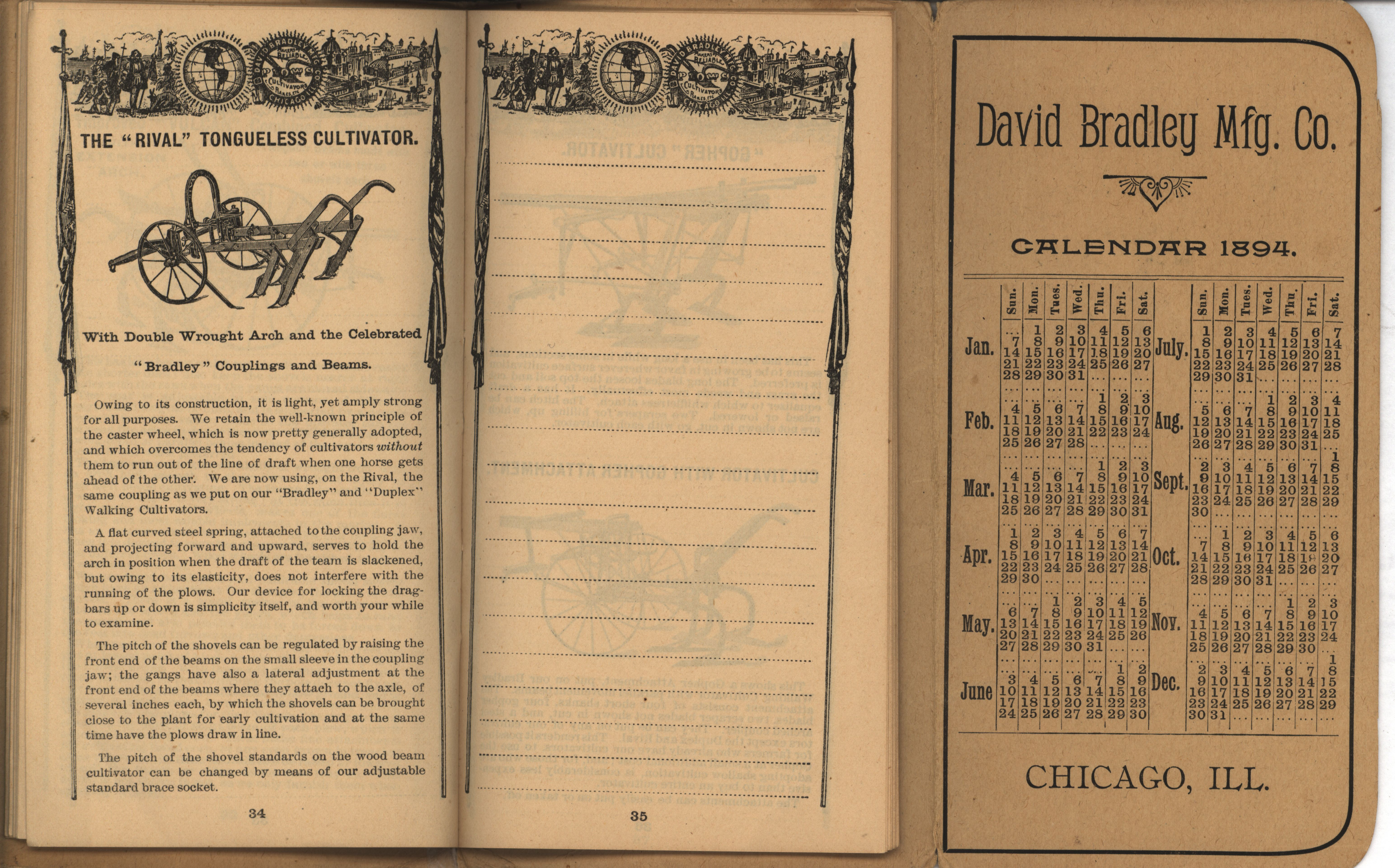 - Illustrated pocket annual catalog describing the plows, cultivators, rakes and other agricultural products offered by David Bradley Manufacturing Company in 1894.