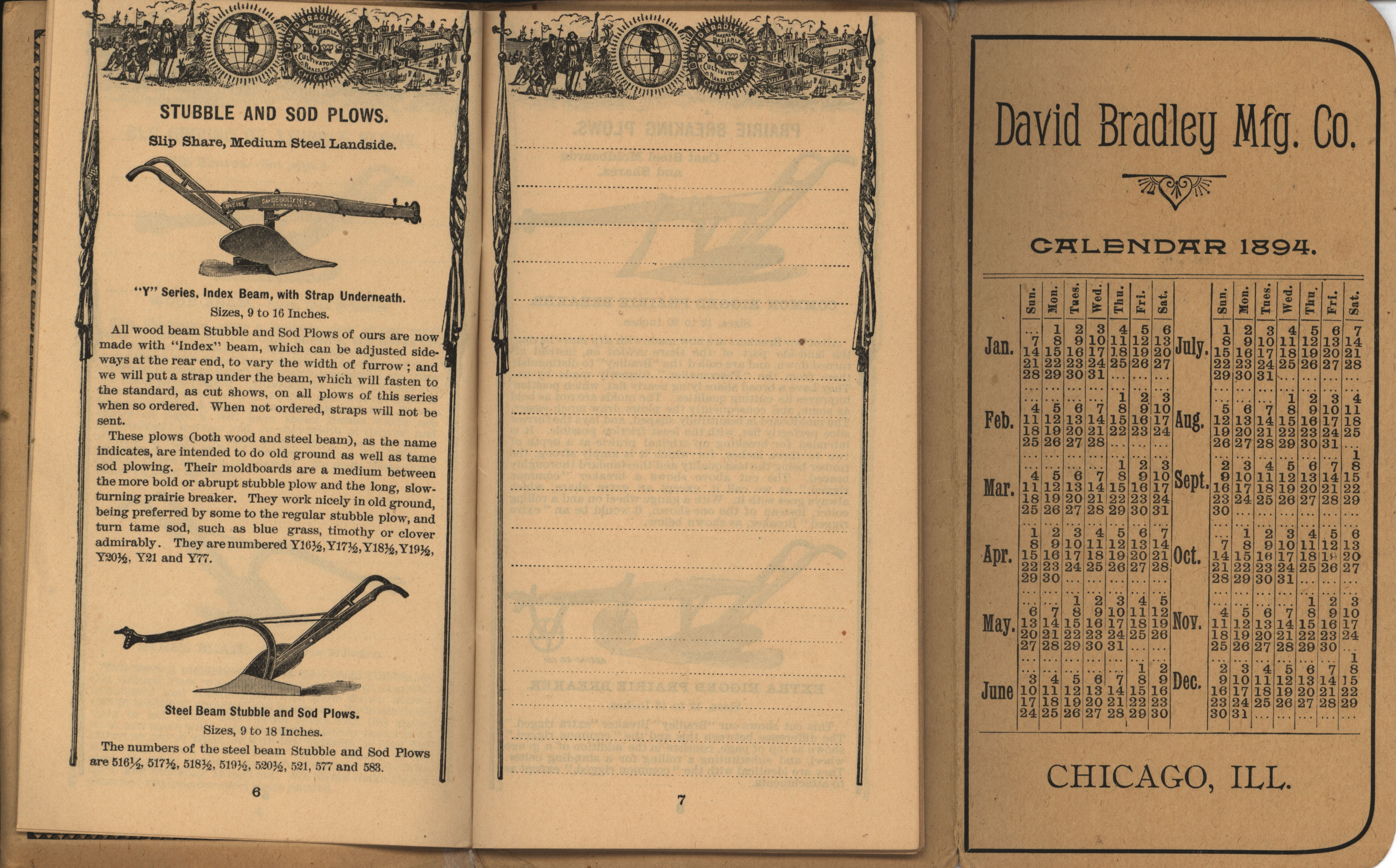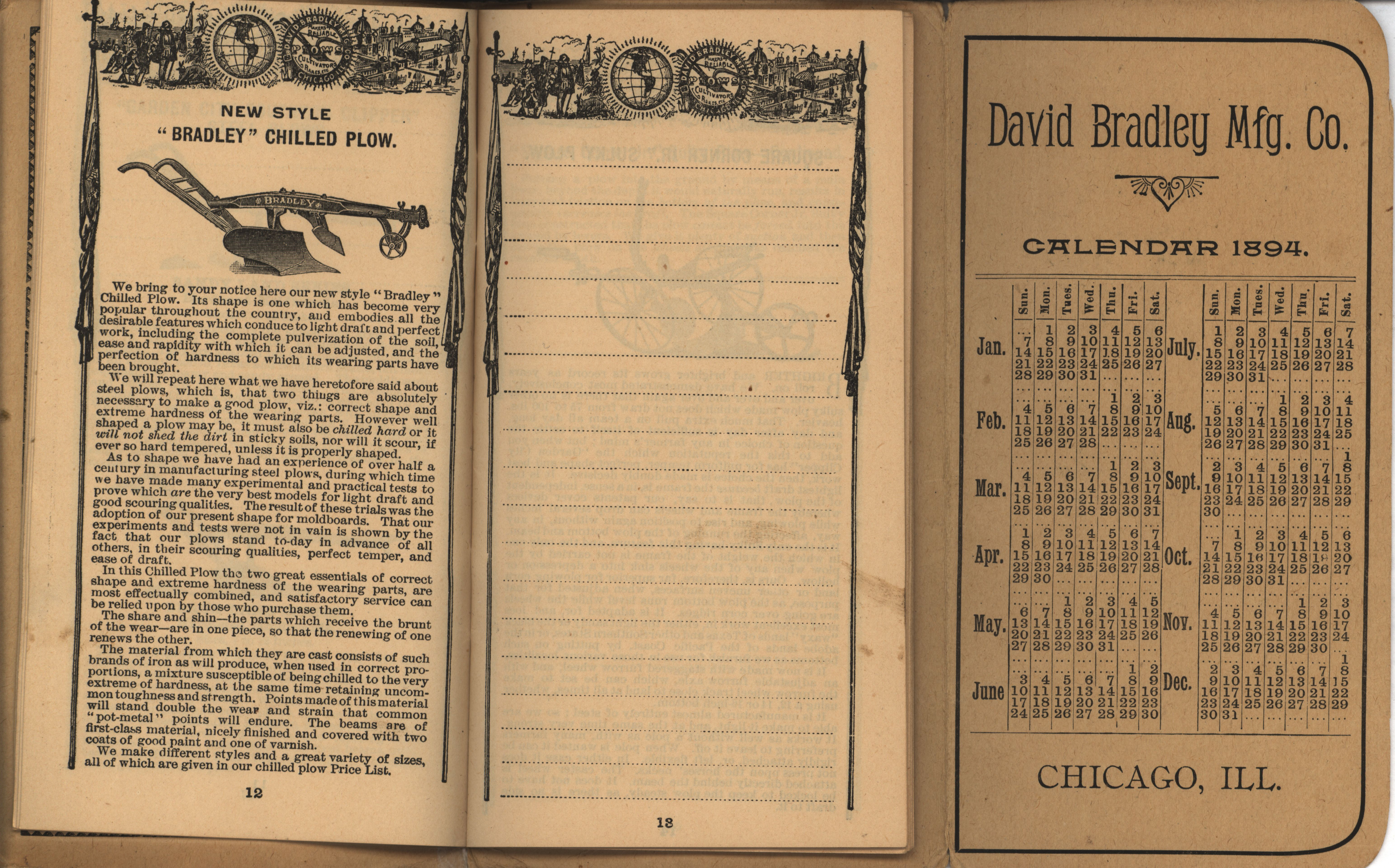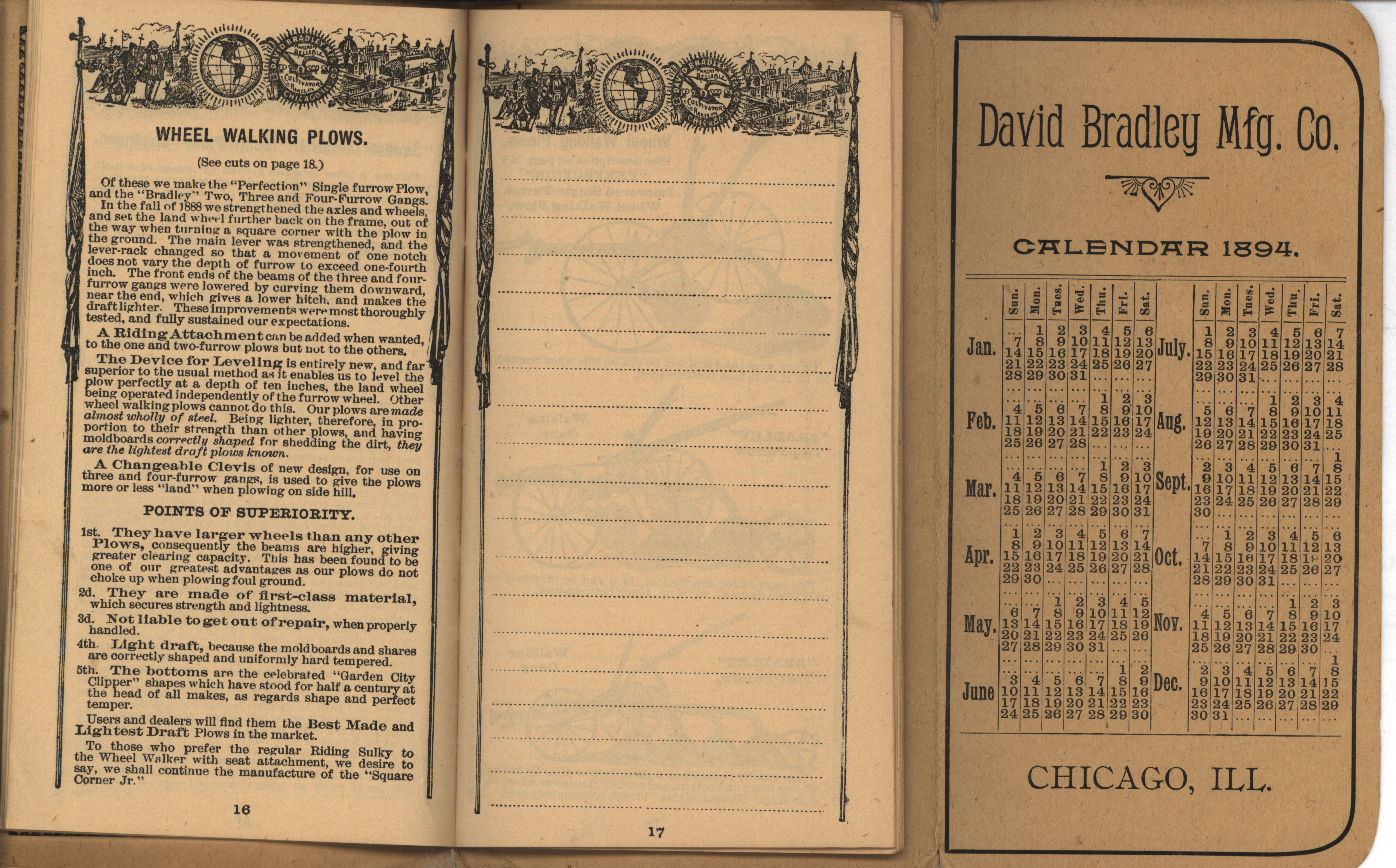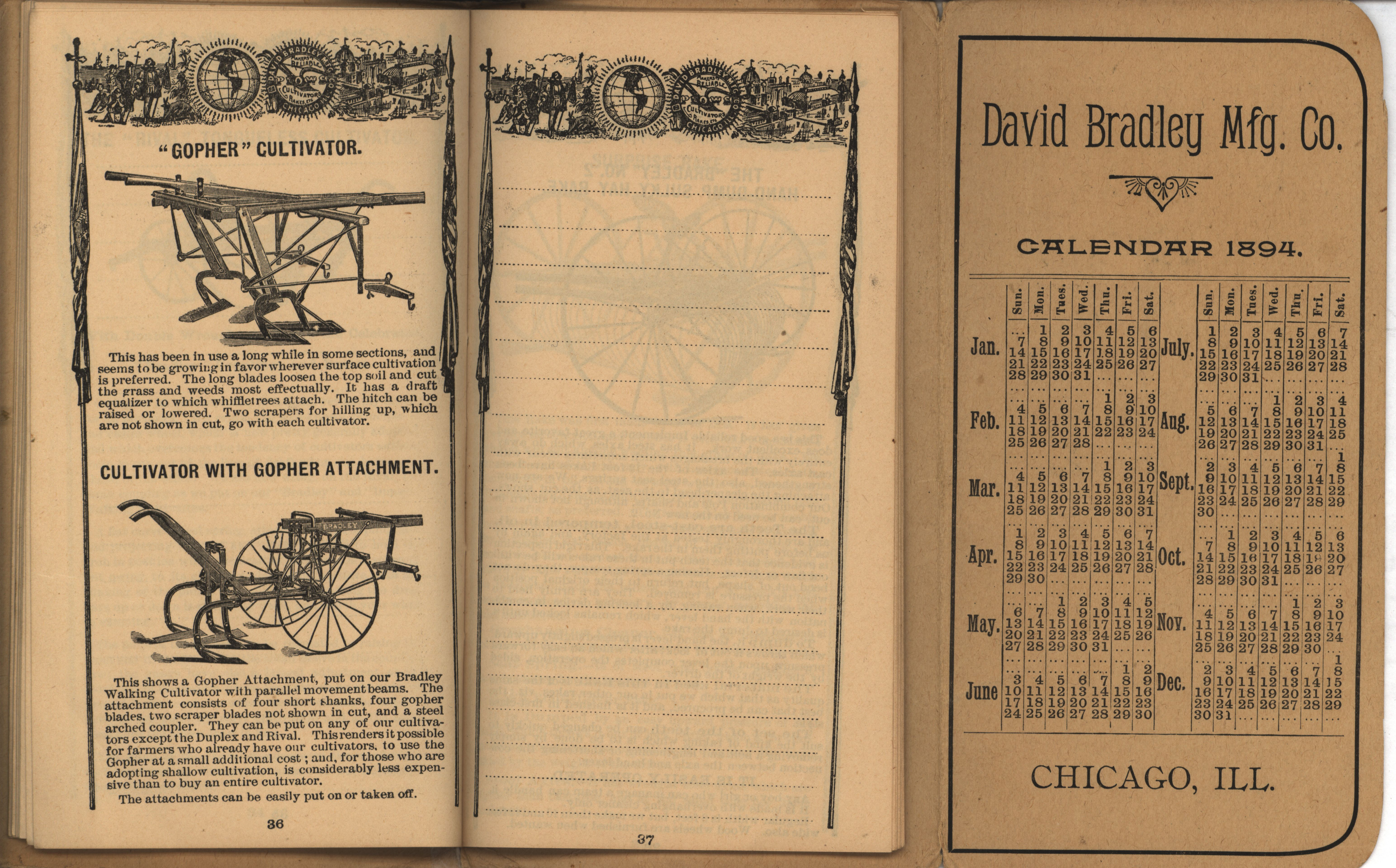 - Illustrated pocket annual catalog describing the plows, cultivators, rakes and other agricultural products offered by David Bradley Manufacturing Company in 1894.