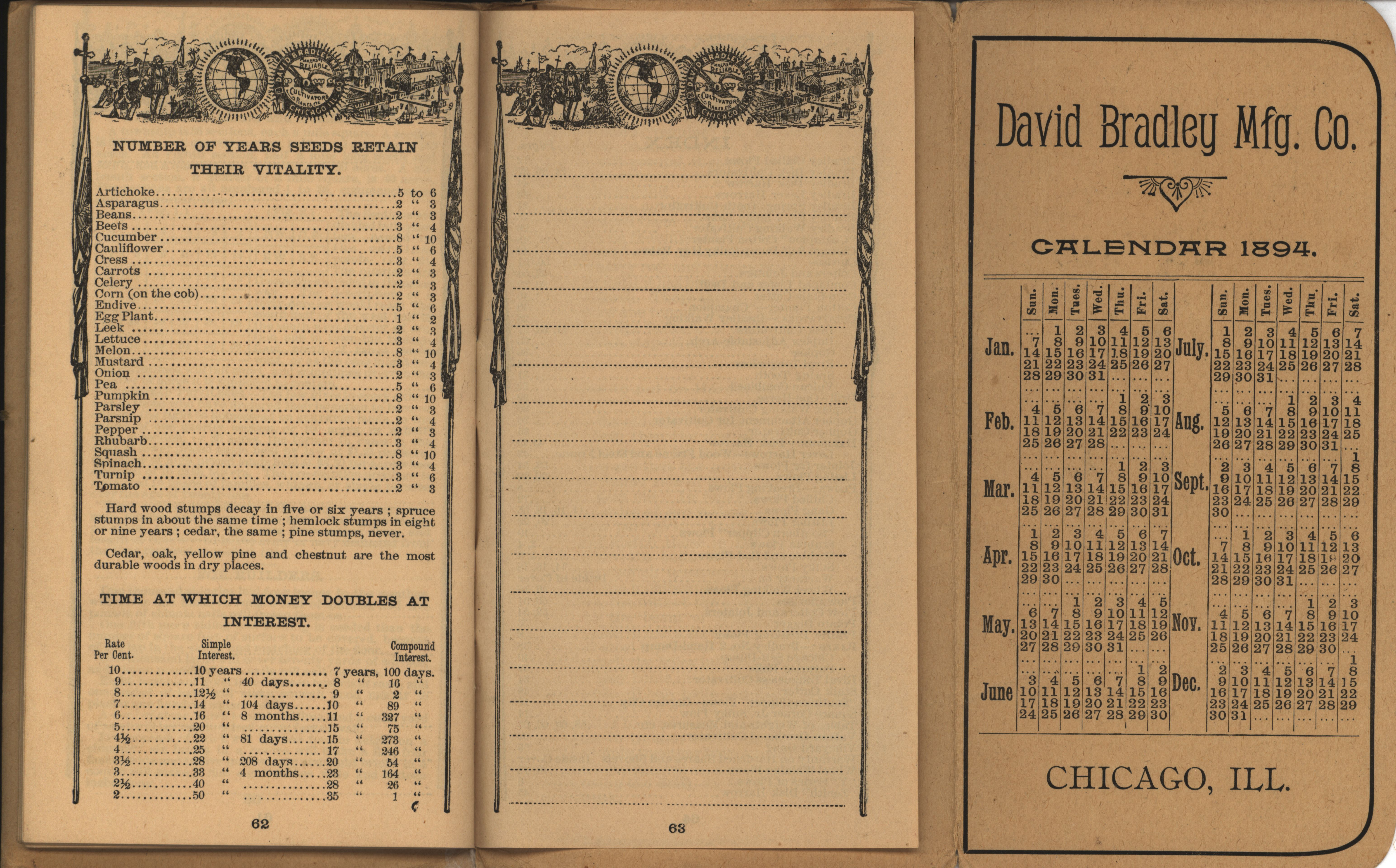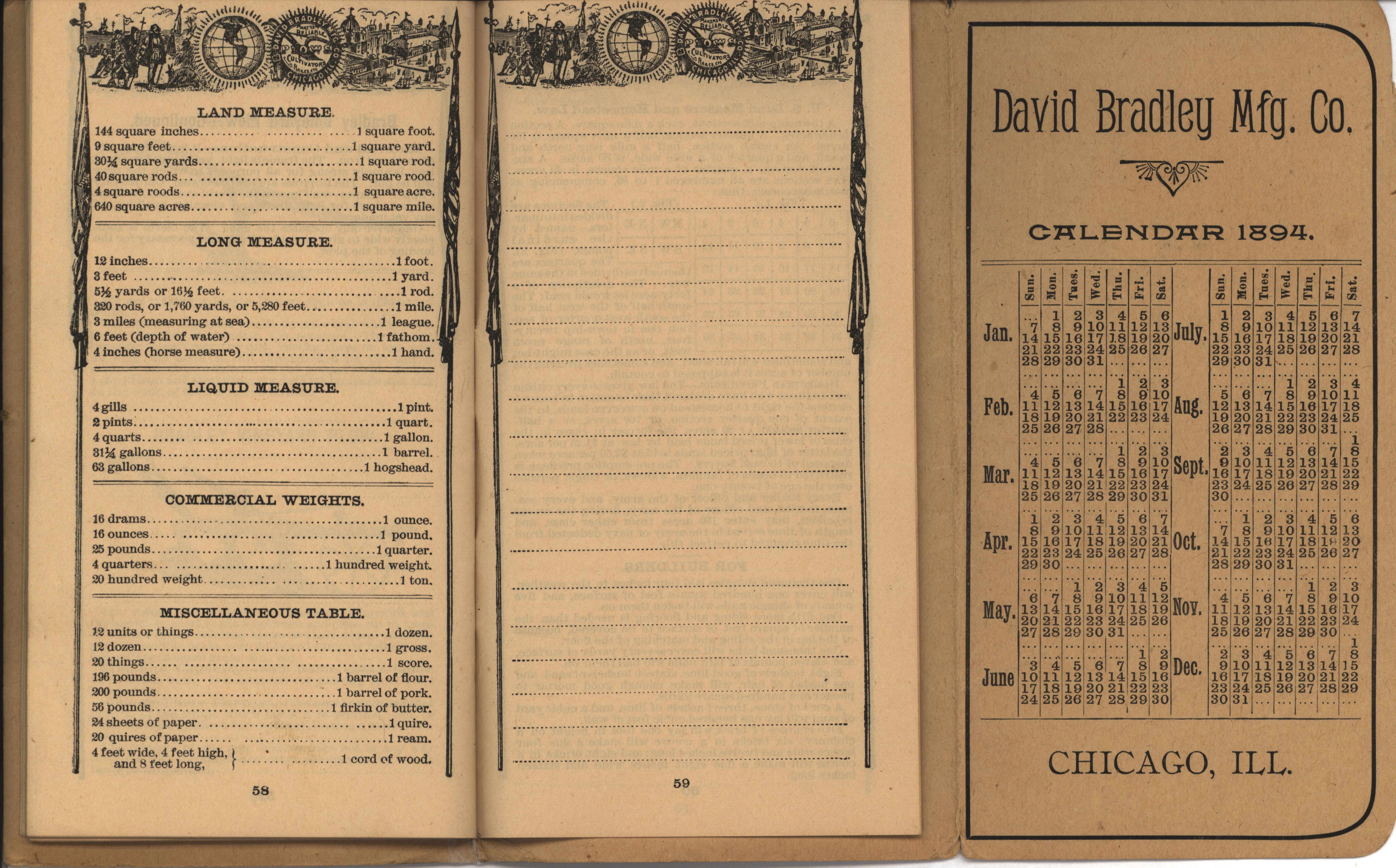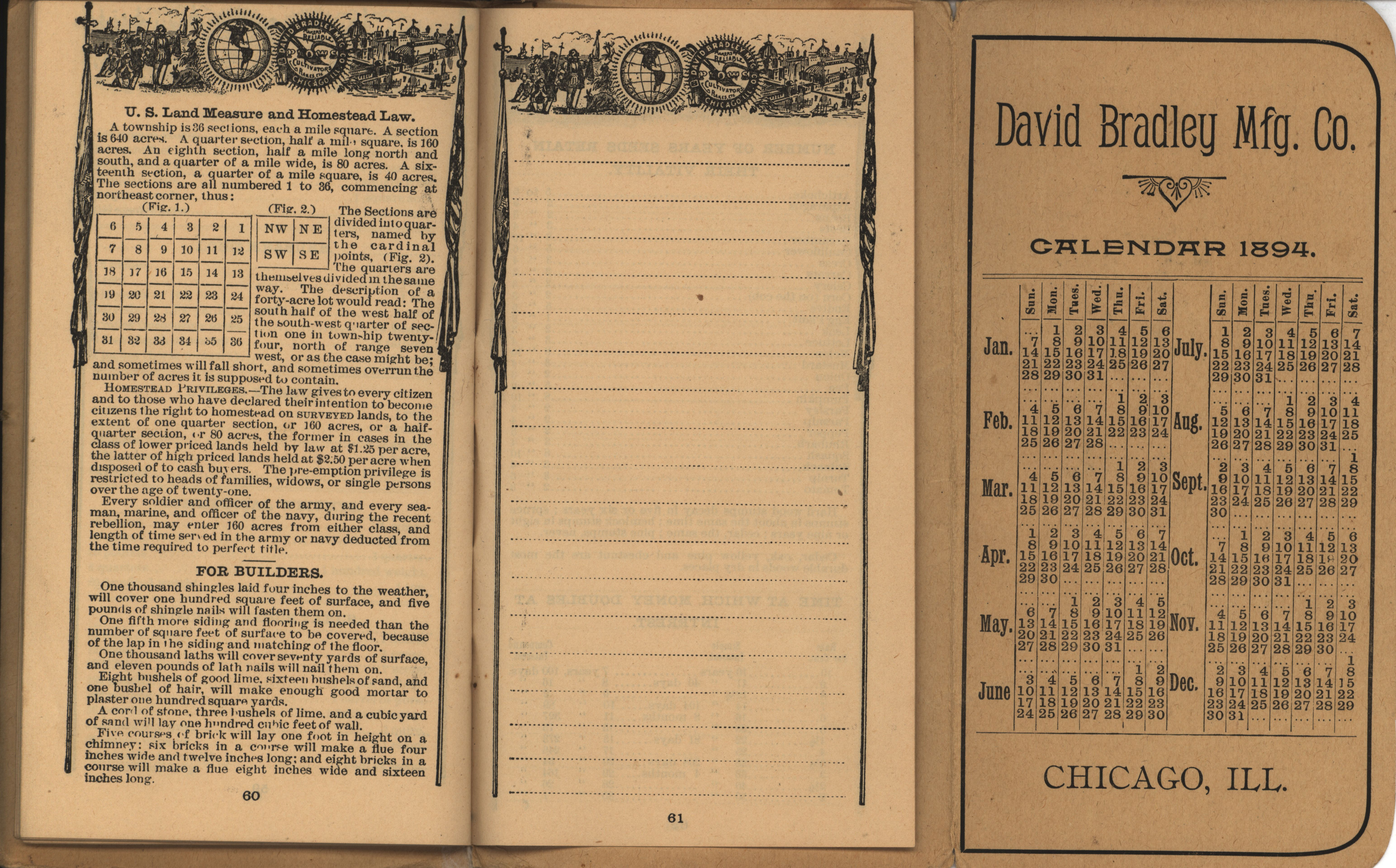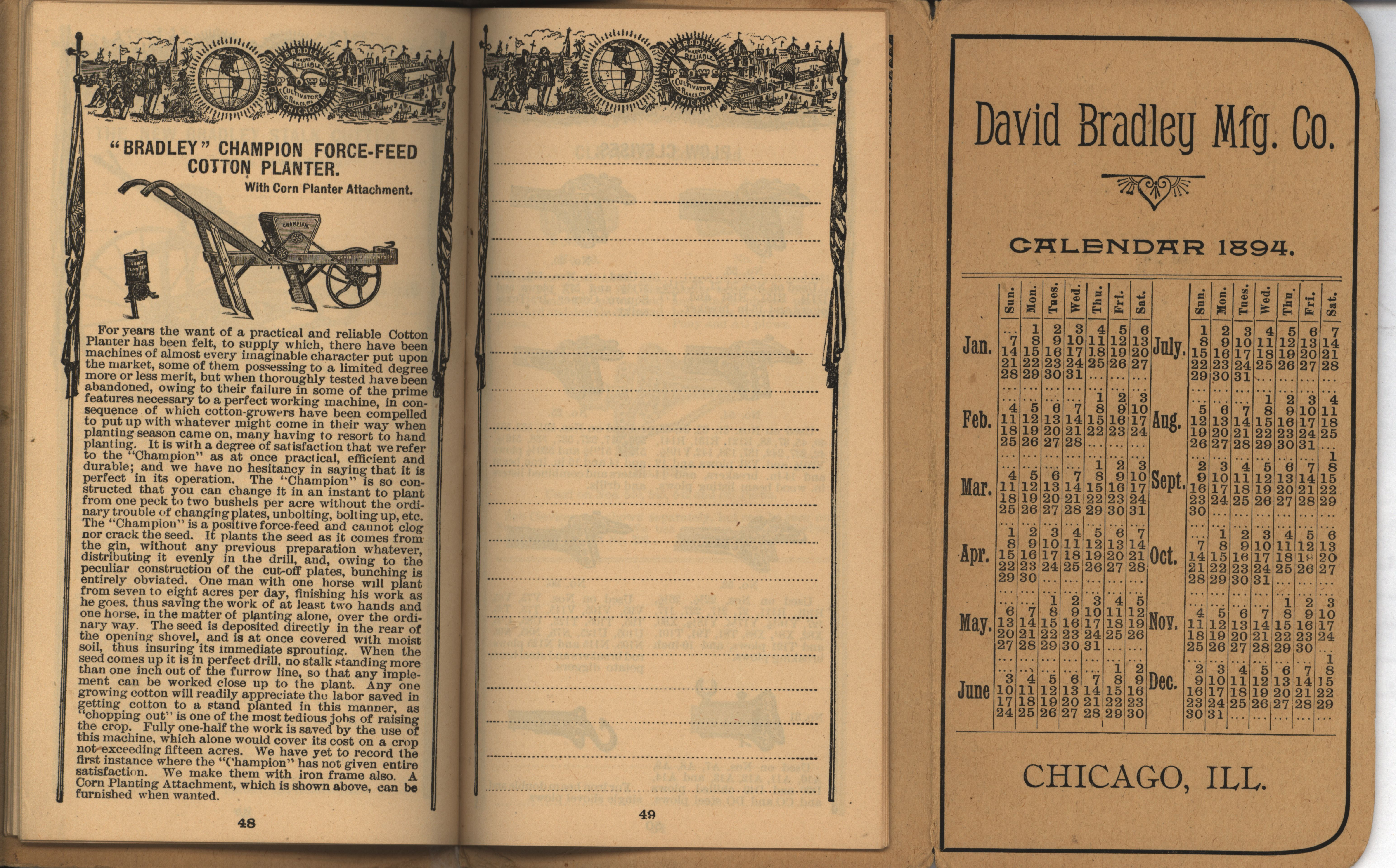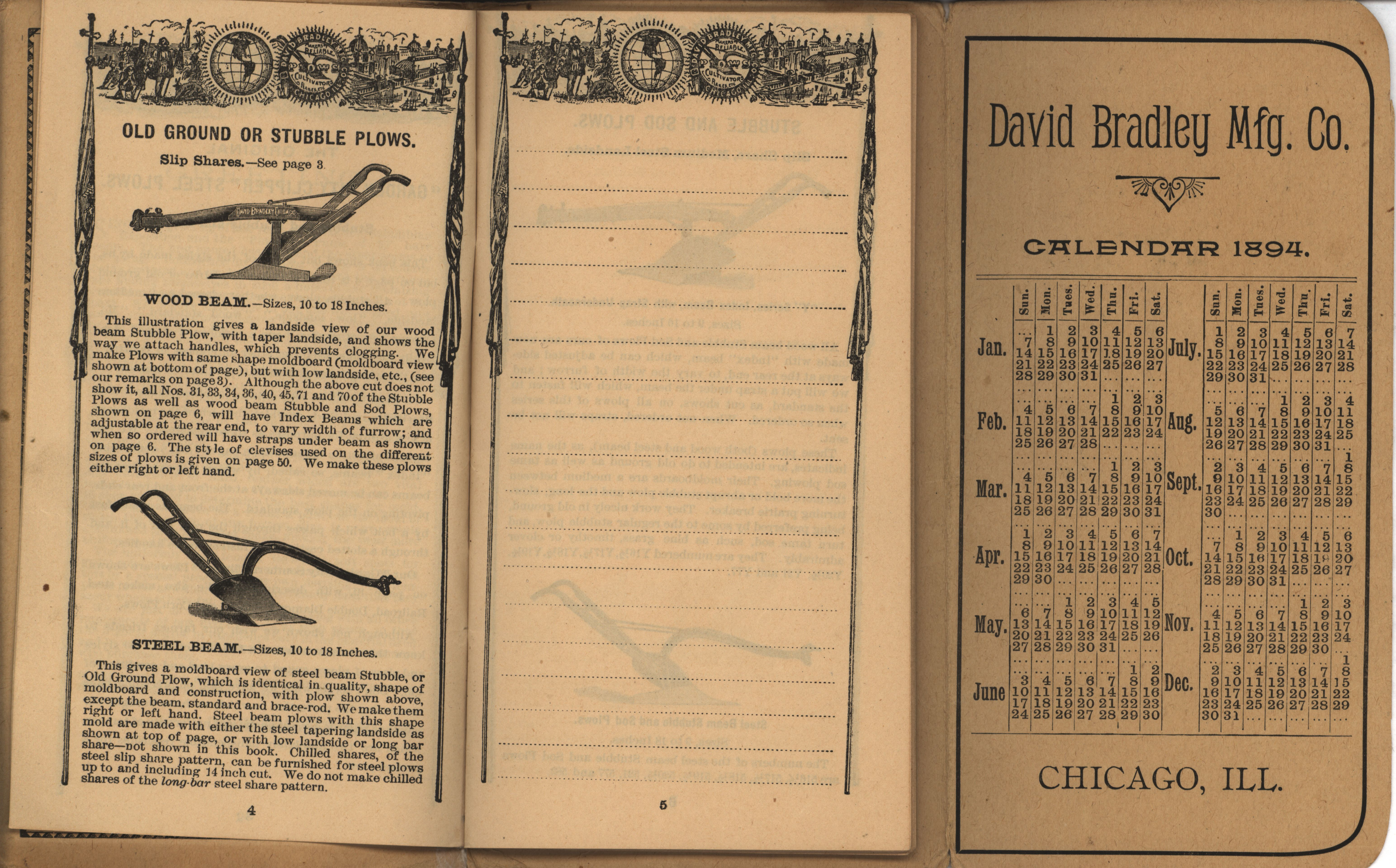 - Illustrated pocket annual catalog describing the plows, cultivators, rakes and other agricultural products offered by David Bradley Manufacturing Company in 1894.
