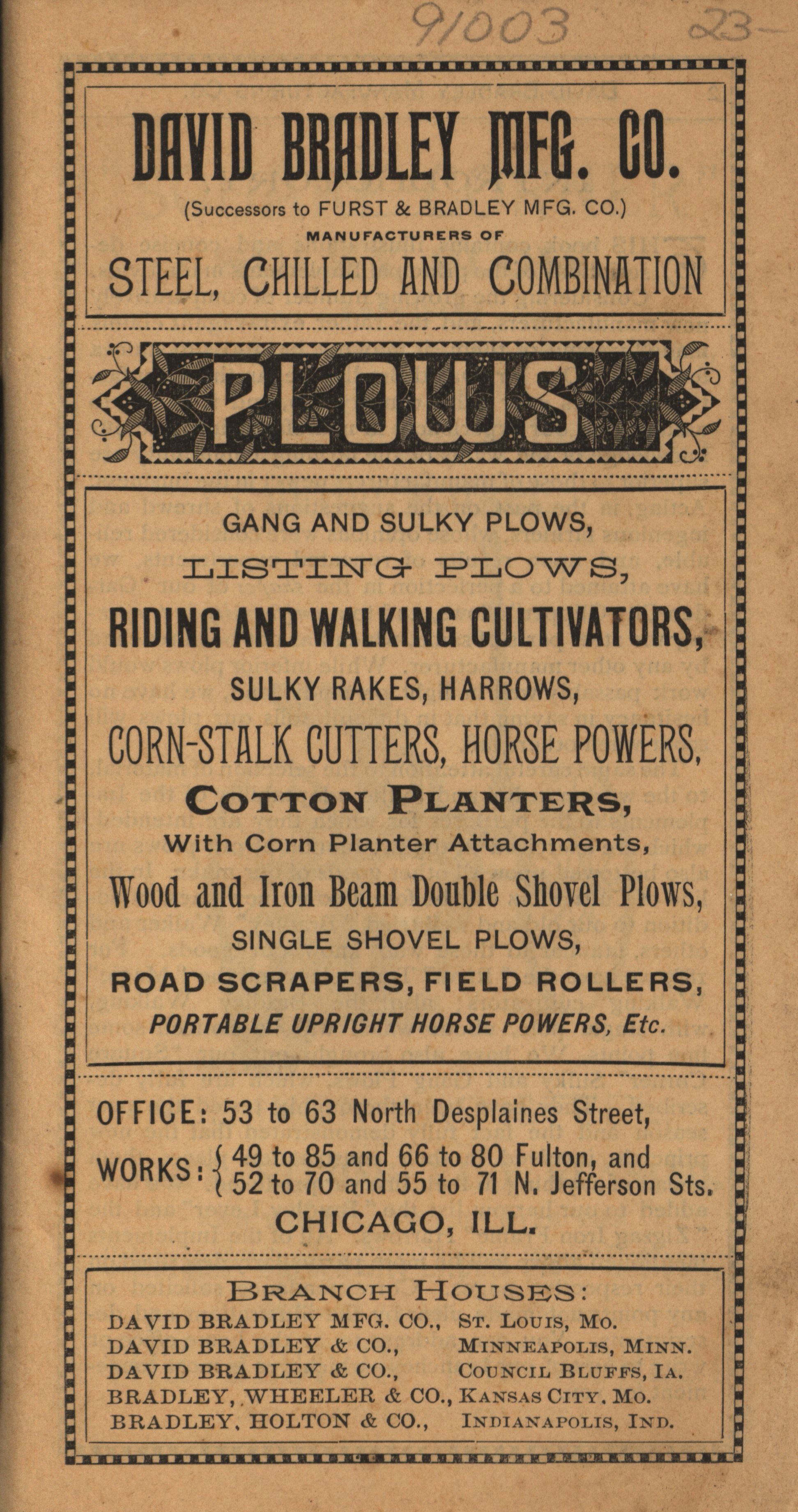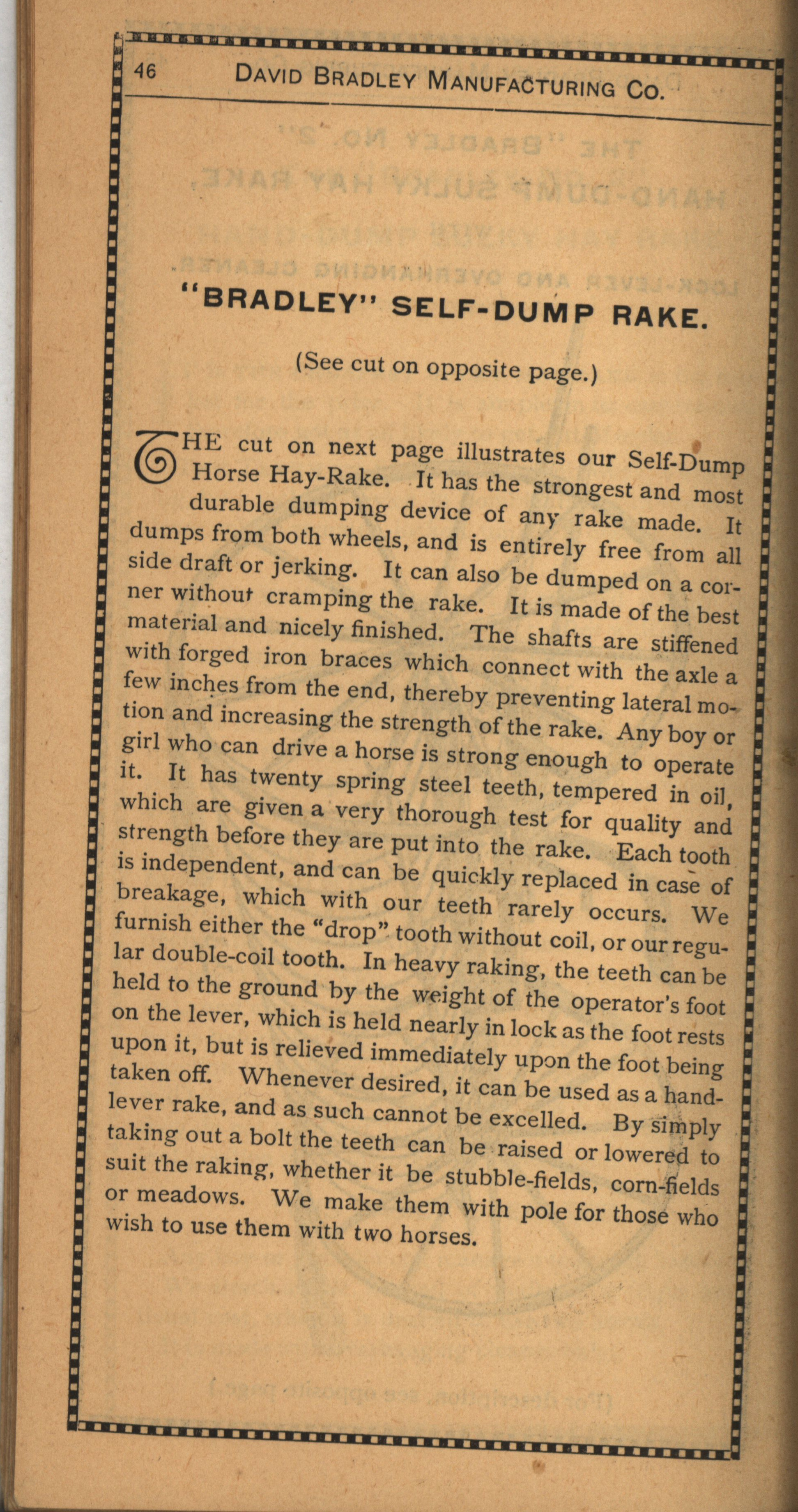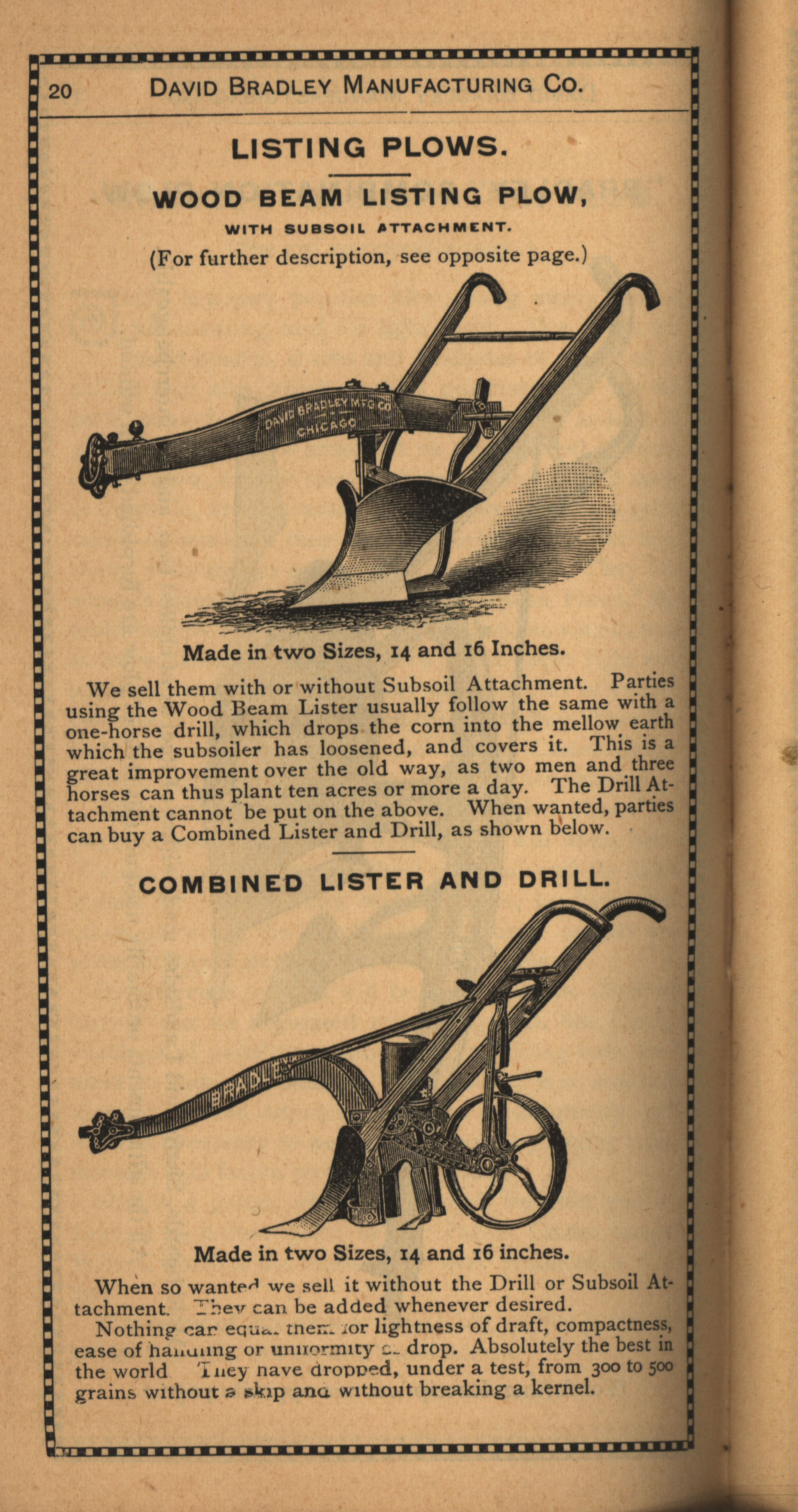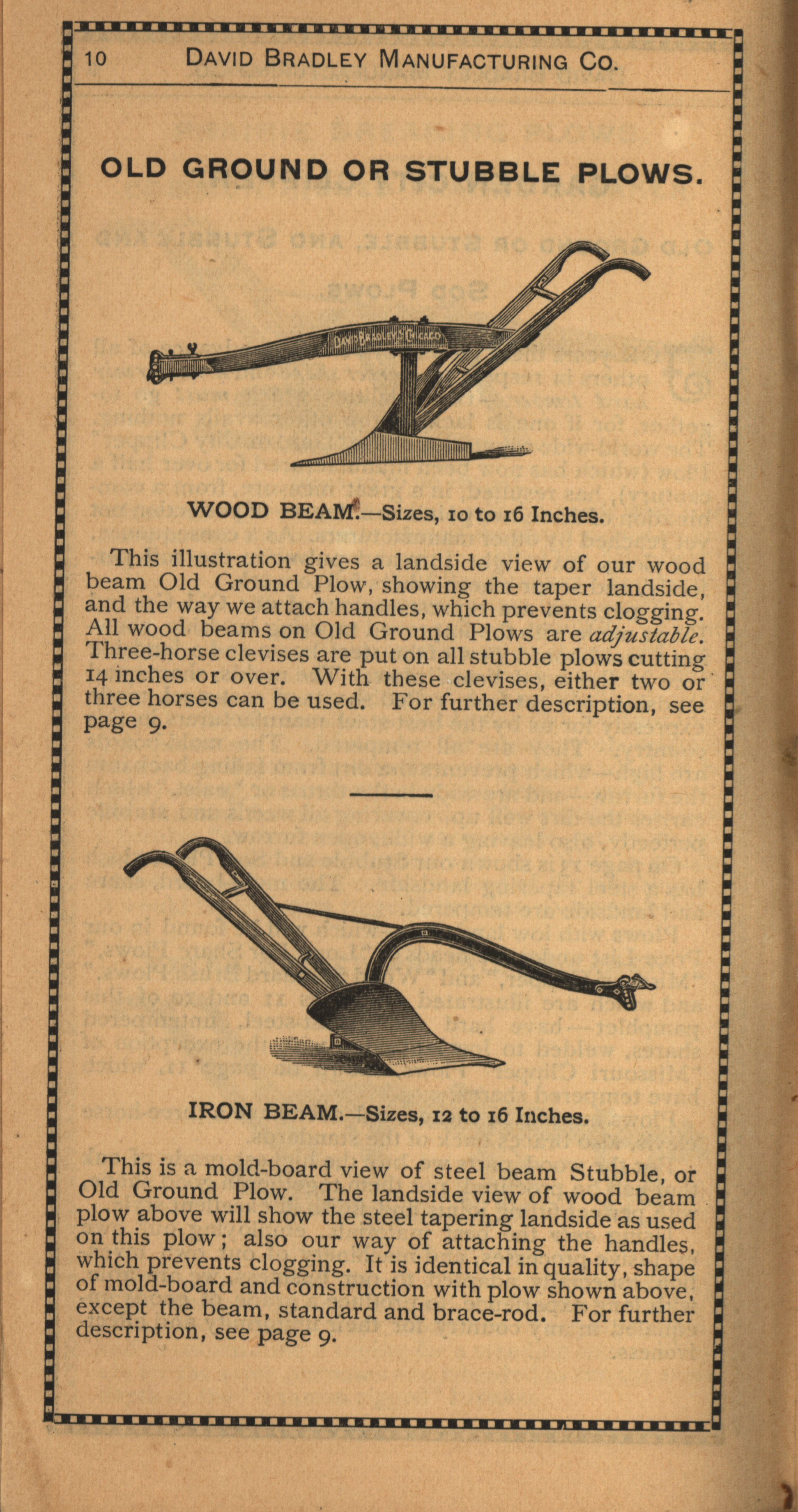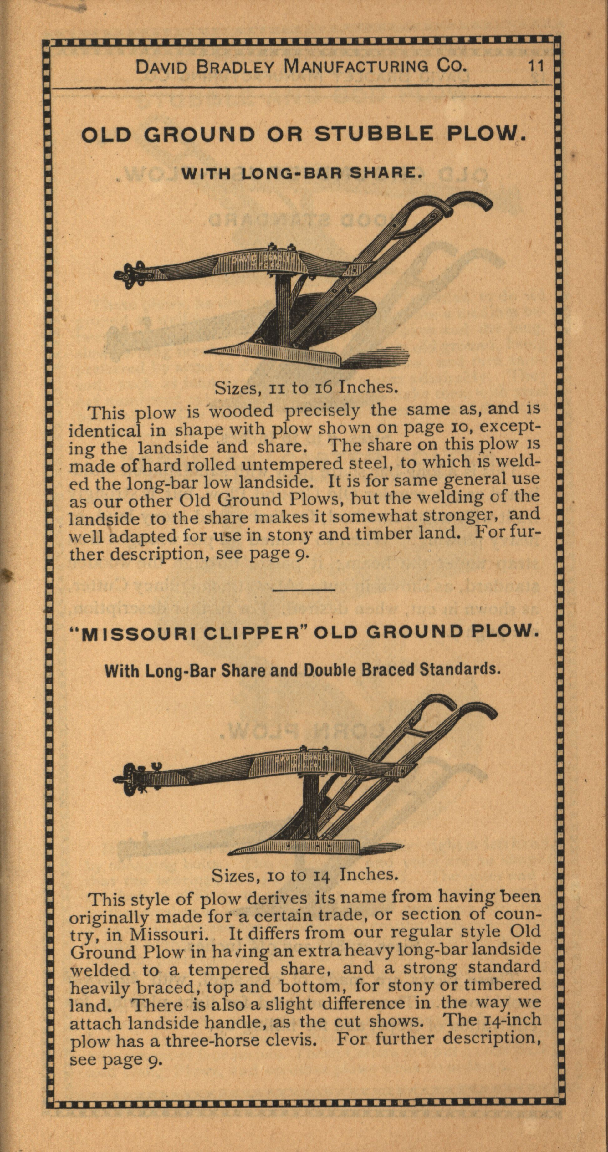 - "David Bradley Manufacturing Company plows, cultivators and rake catalog", Agricultural Machinery Literature Collection, Iowa State University Library Digital Collections