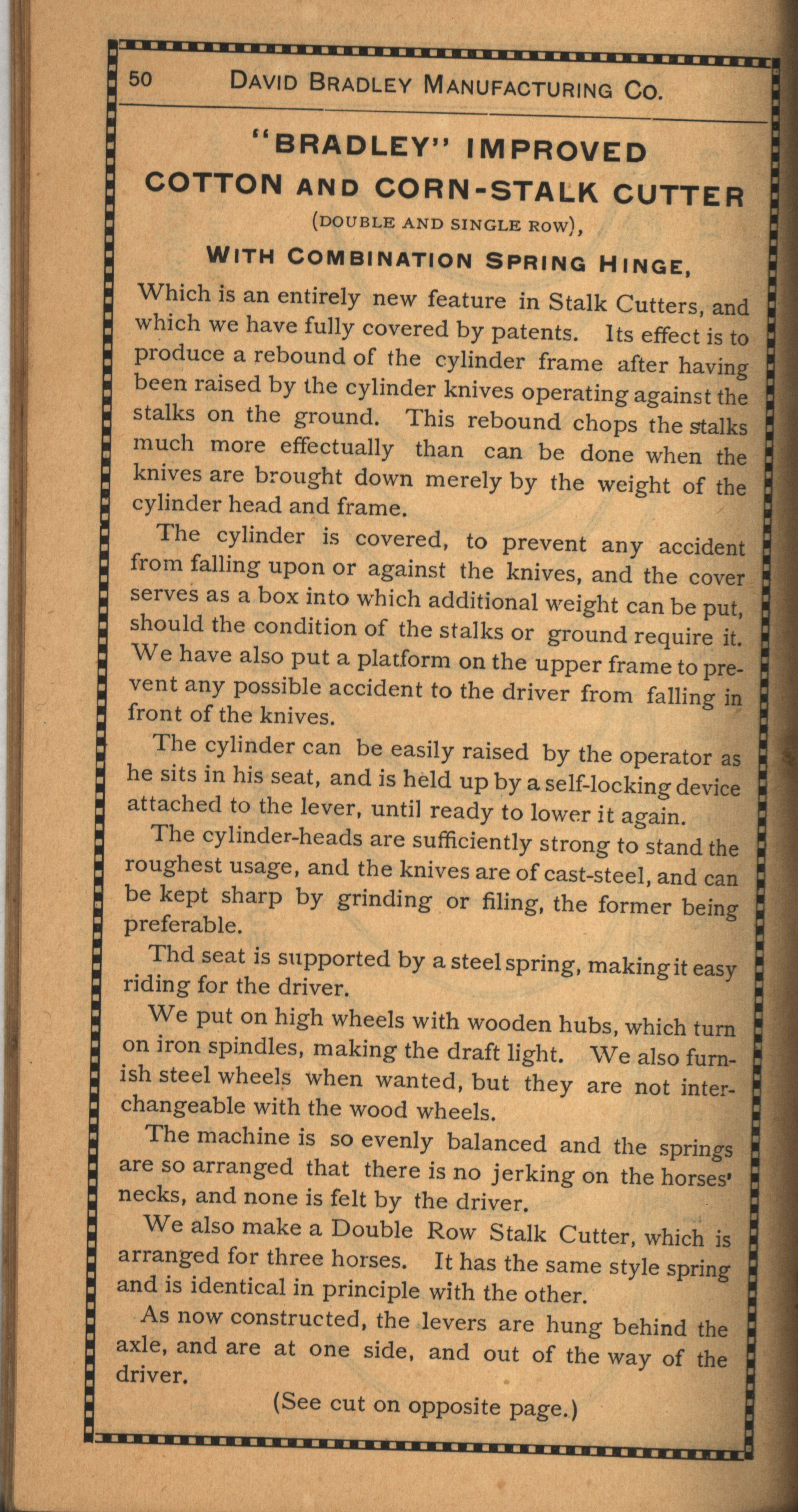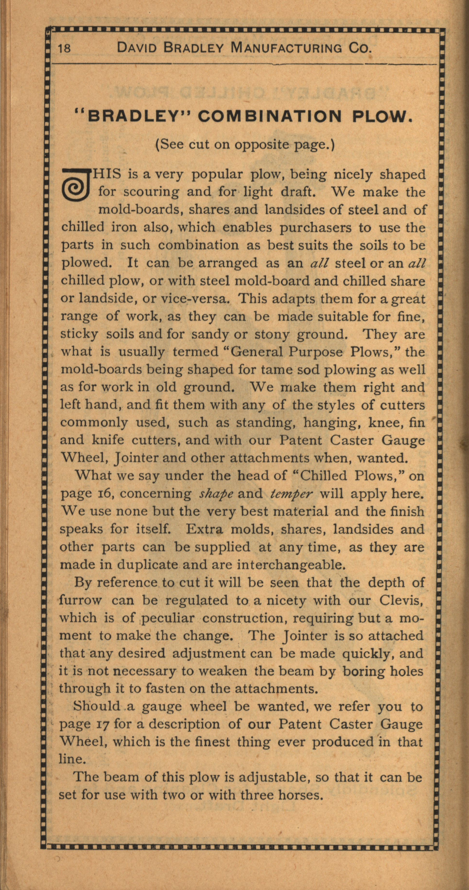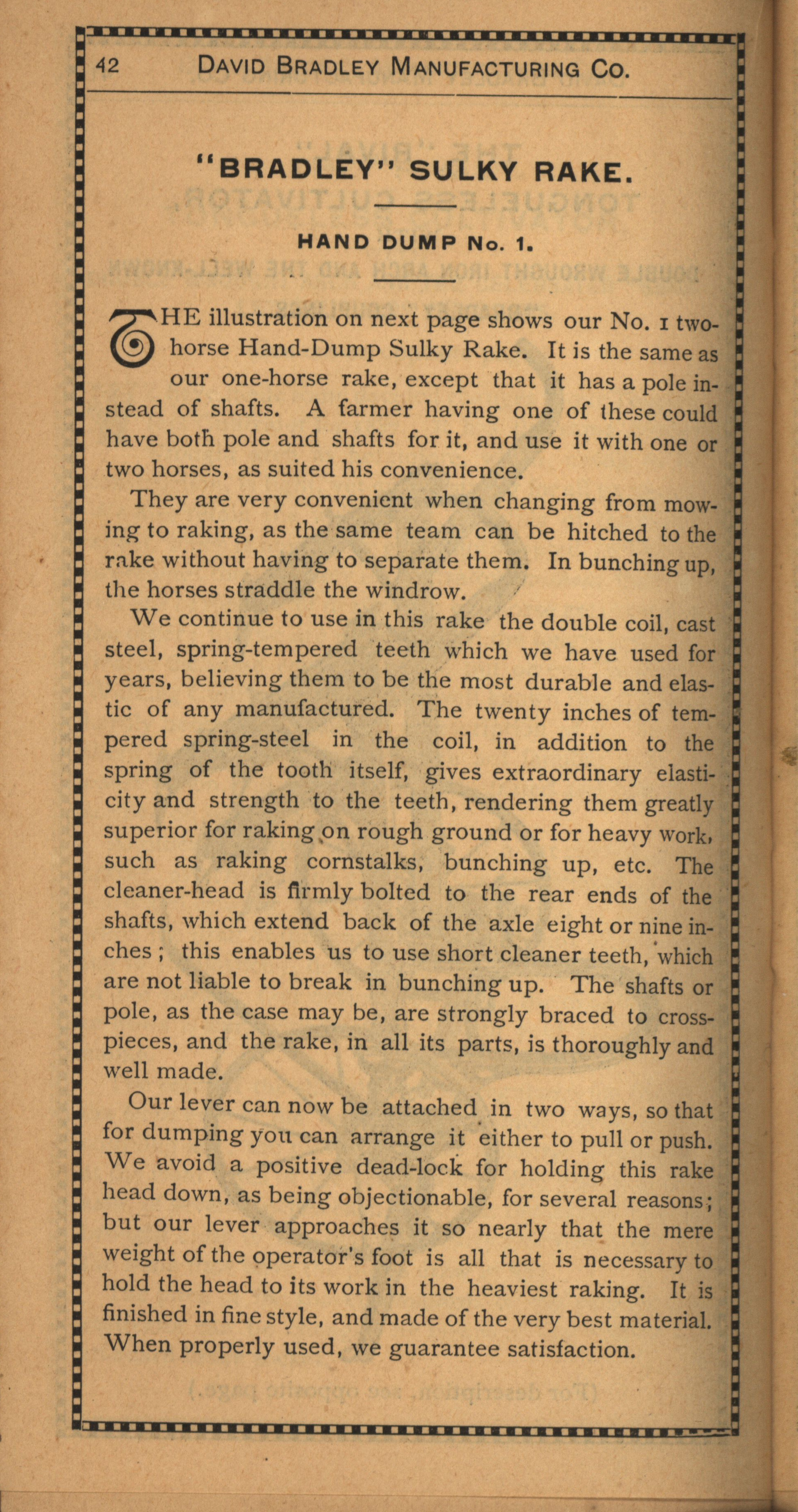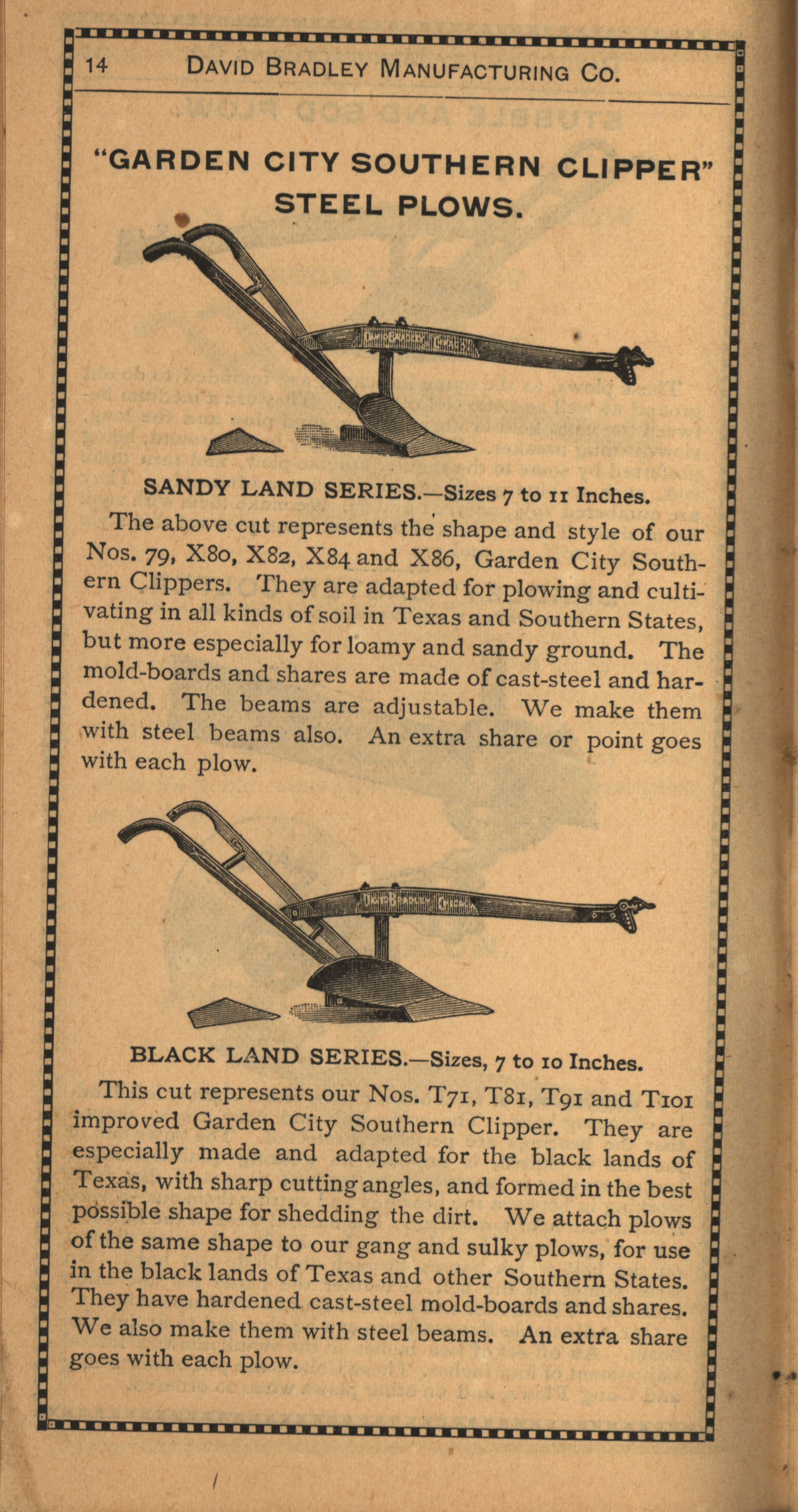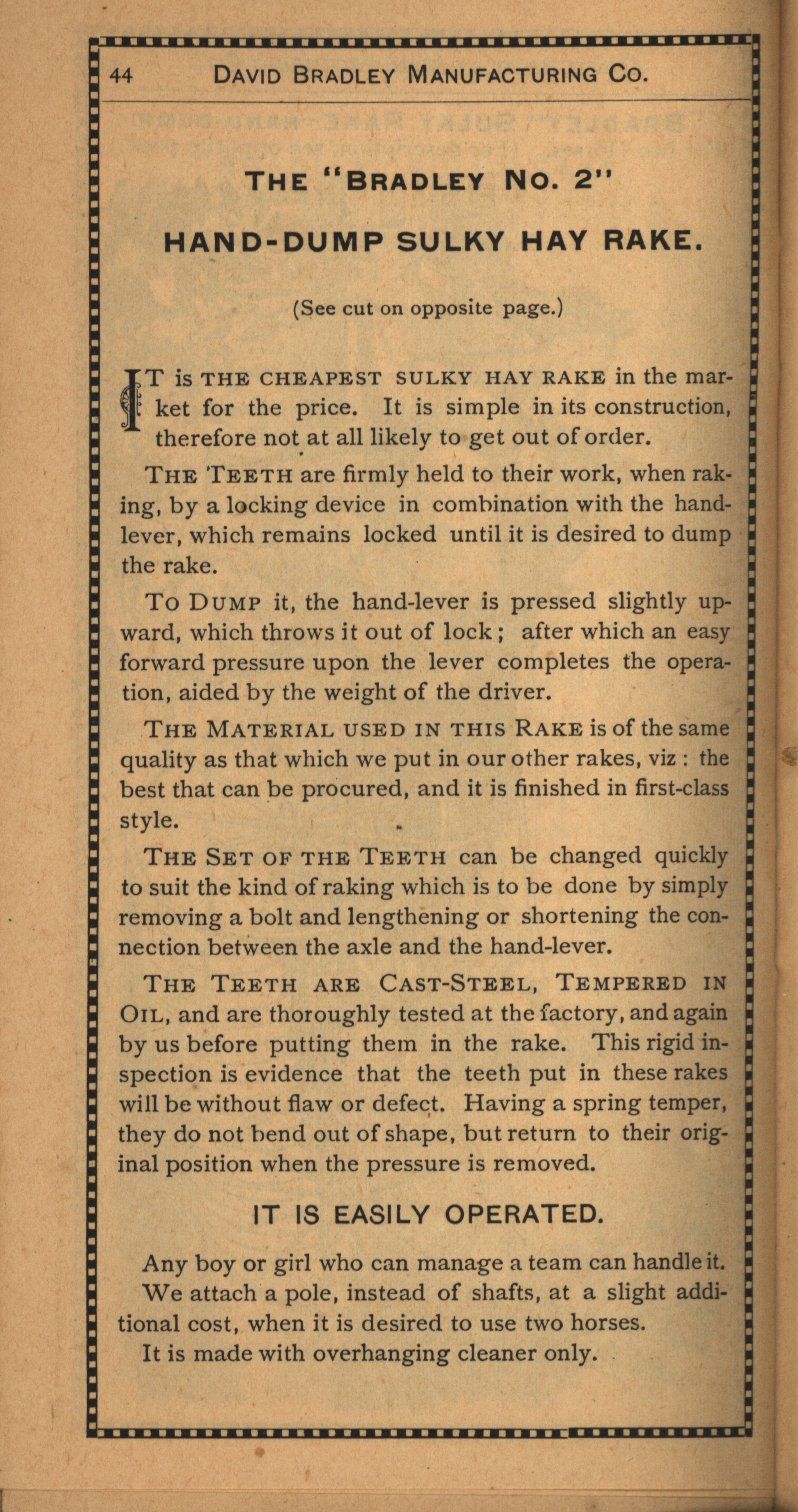 - "David Bradley Manufacturing Company plows, cultivators and rake catalog", Agricultural Machinery Literature Collection, Iowa State University Library Digital Collections