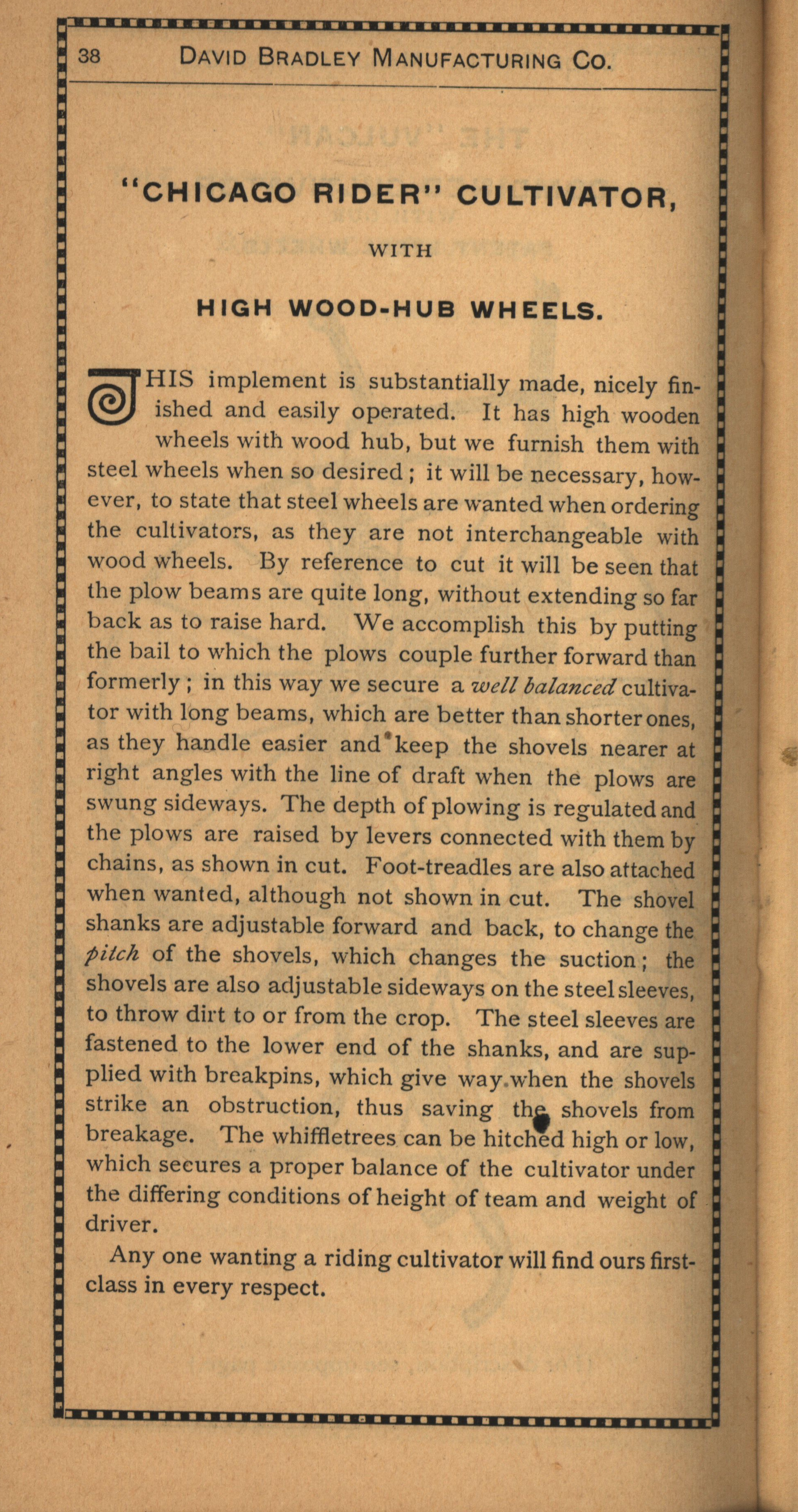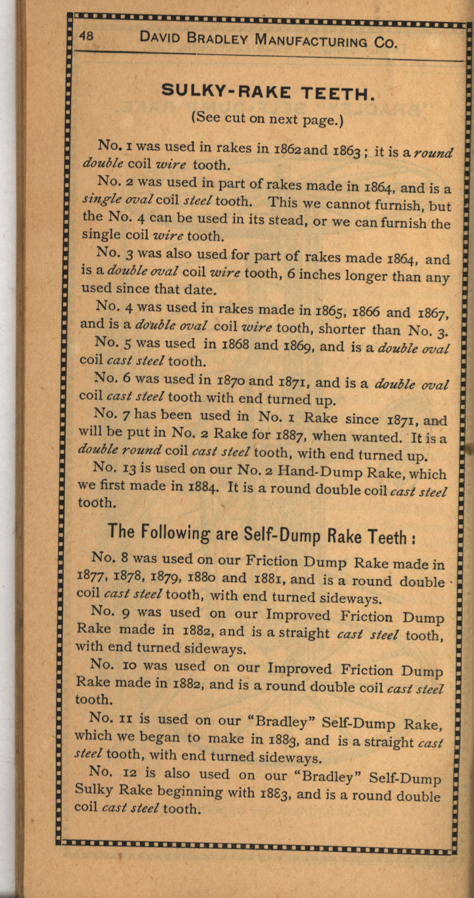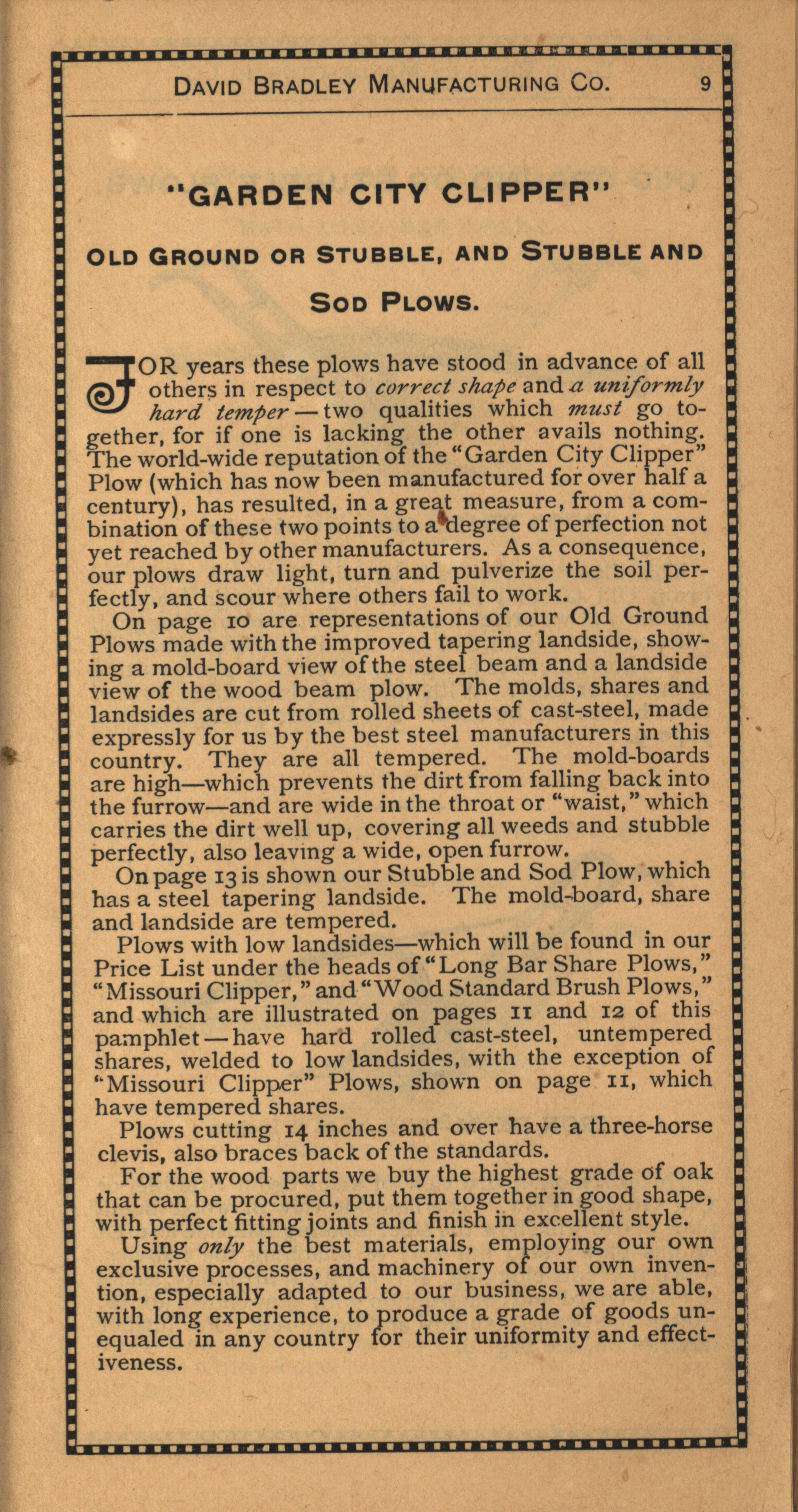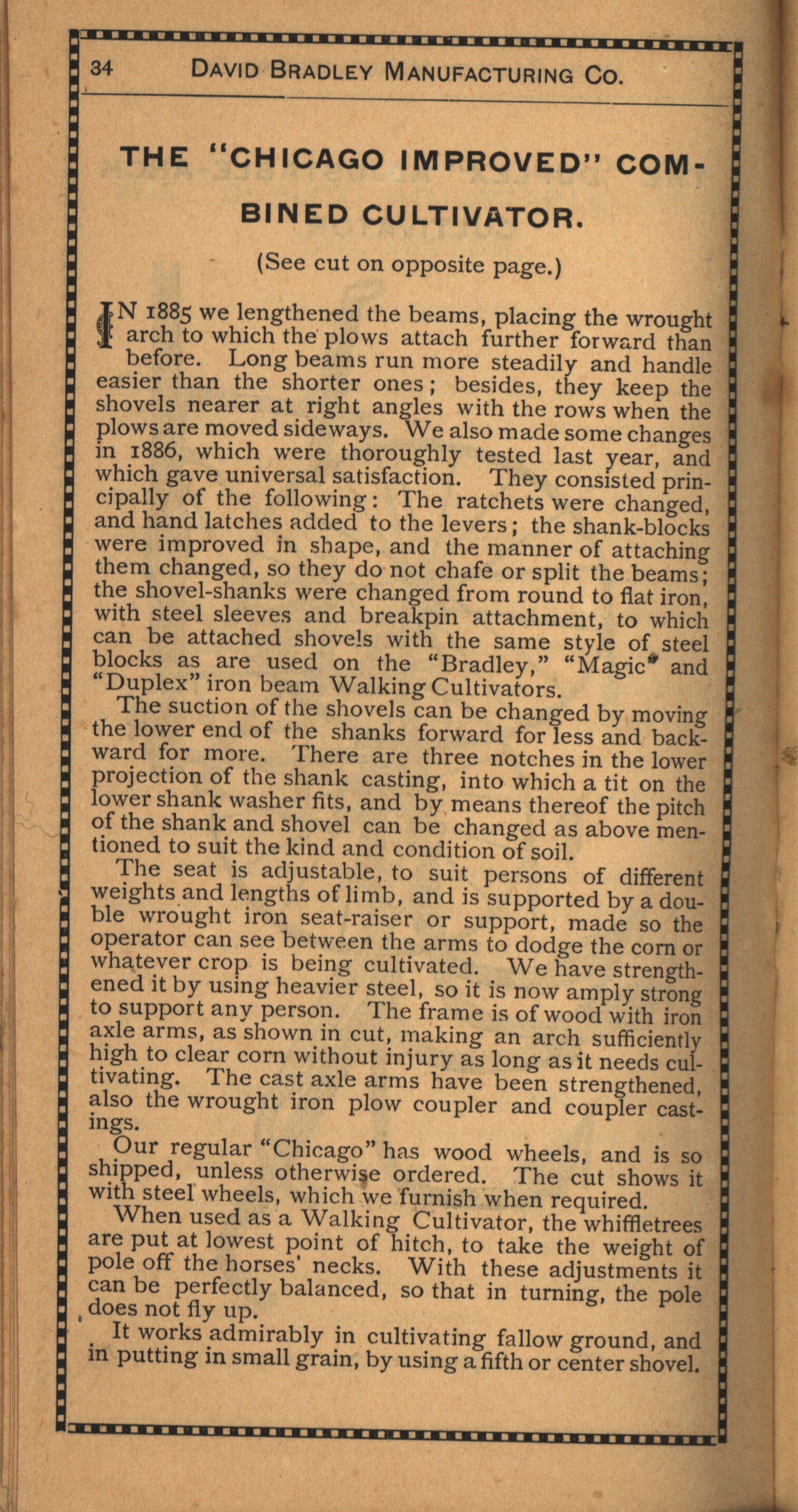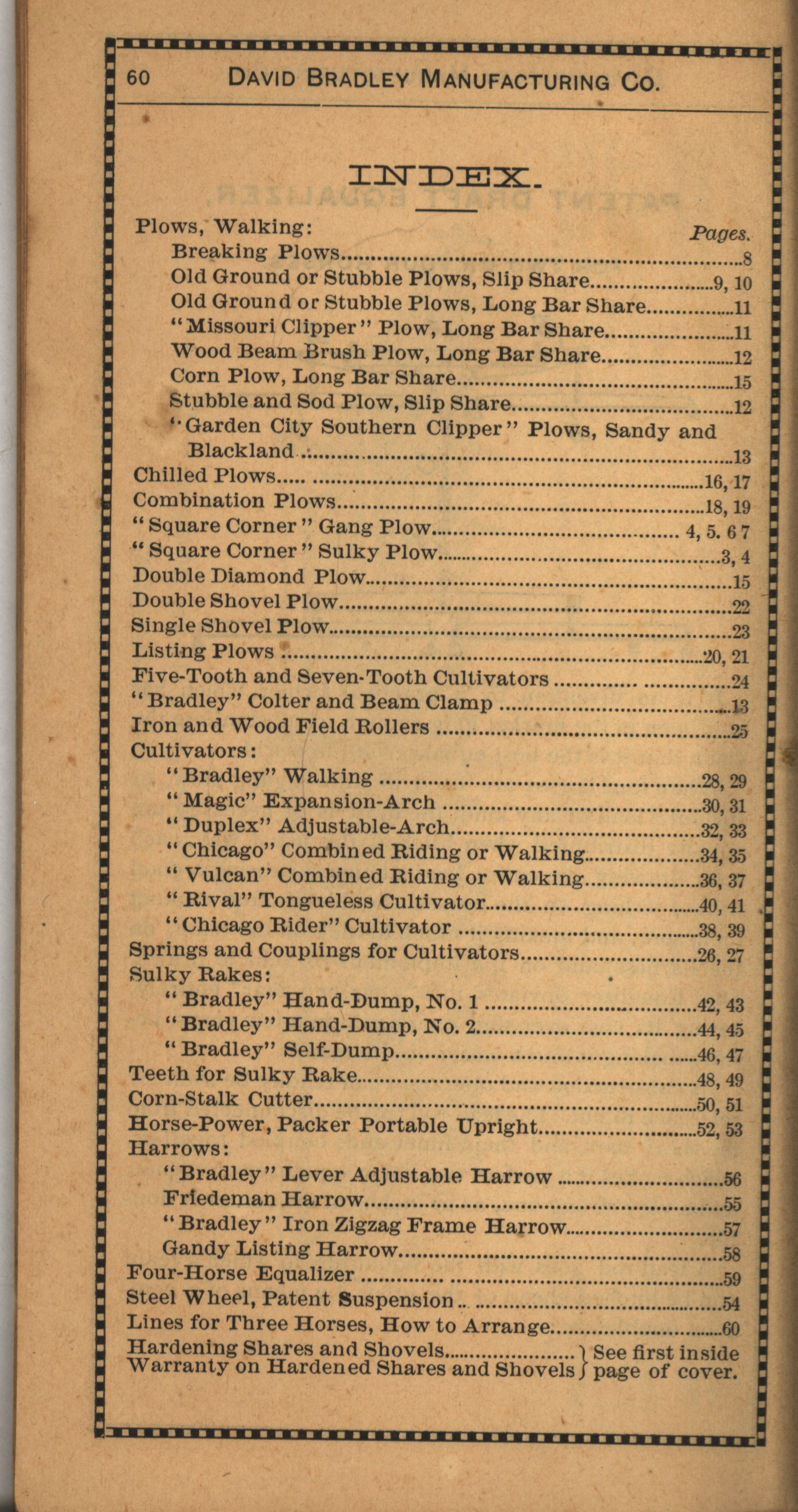 - "David Bradley Manufacturing Company plows, cultivators and rake catalog", Agricultural Machinery Literature Collection, Iowa State University Library Digital Collections