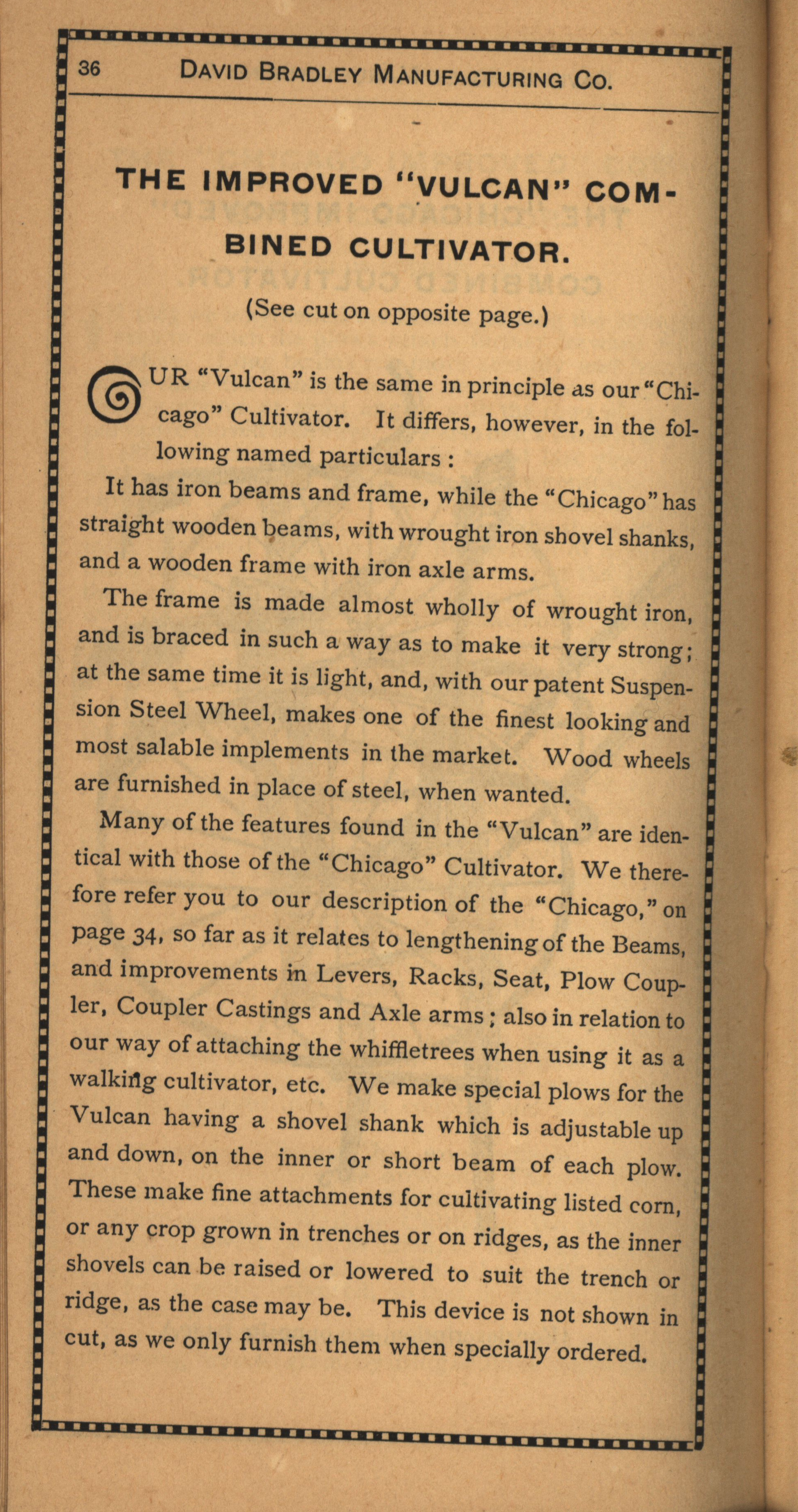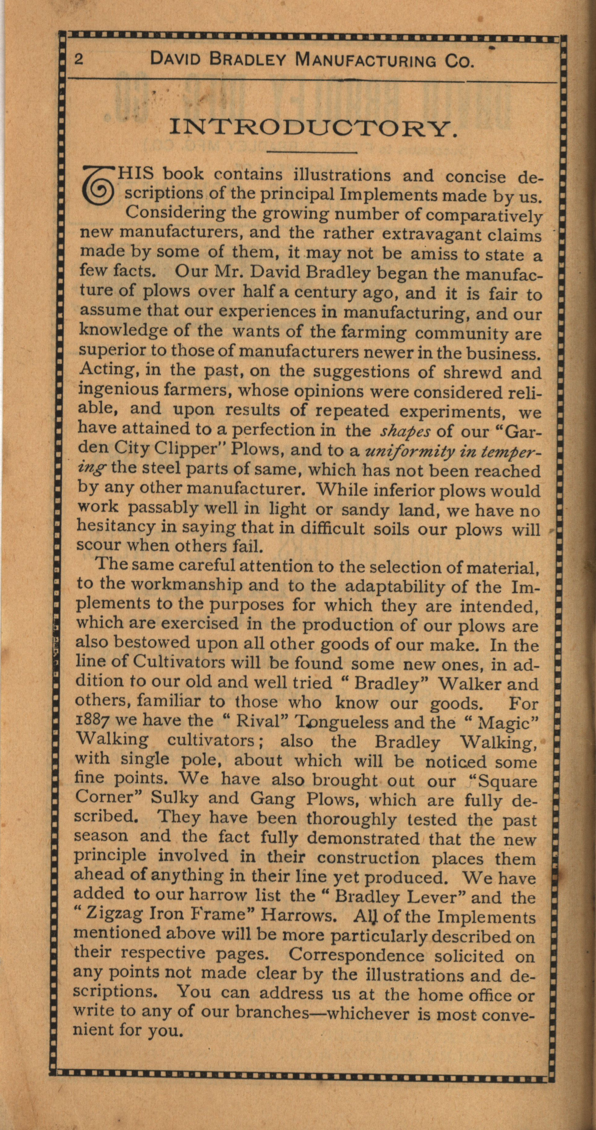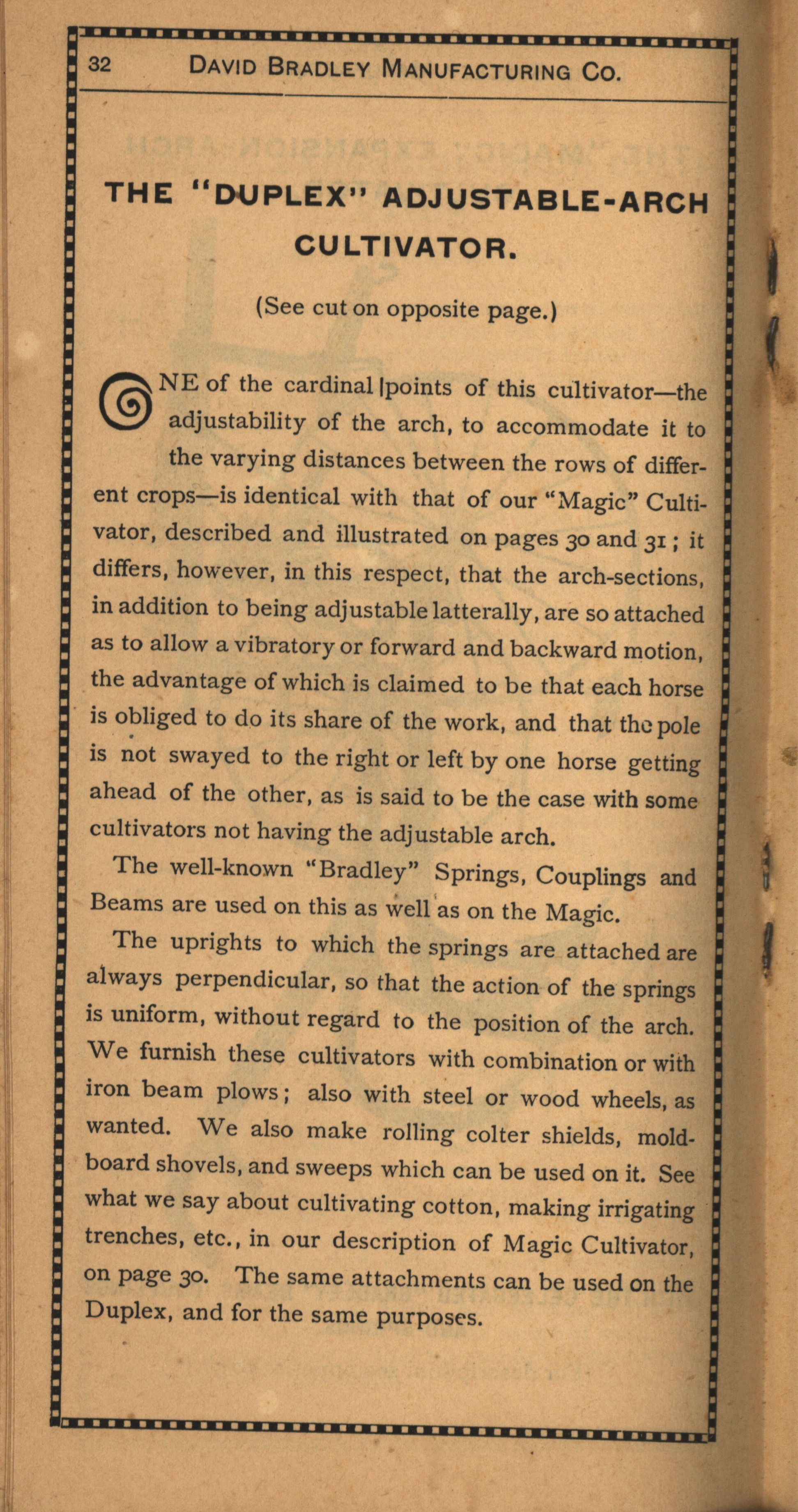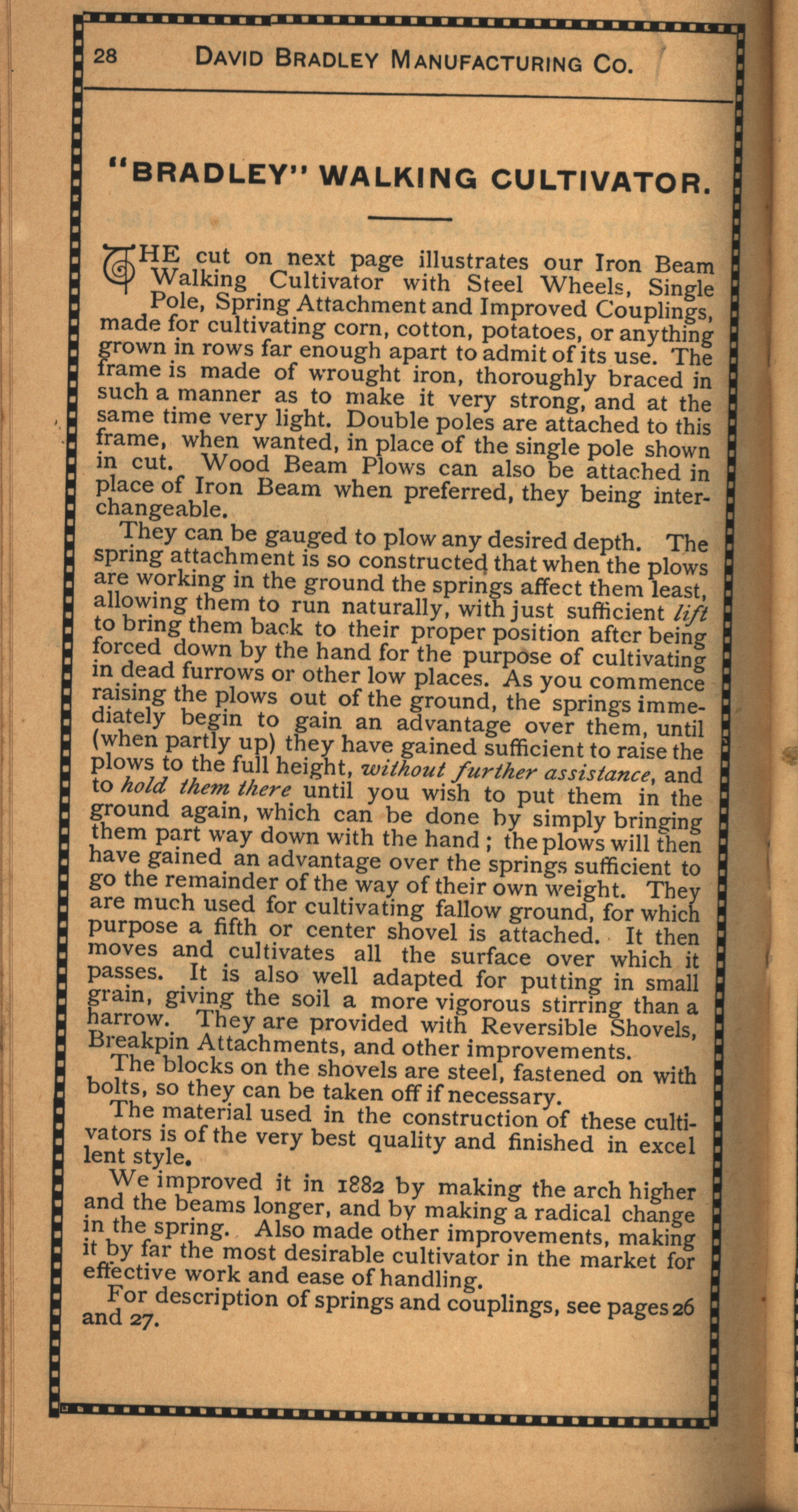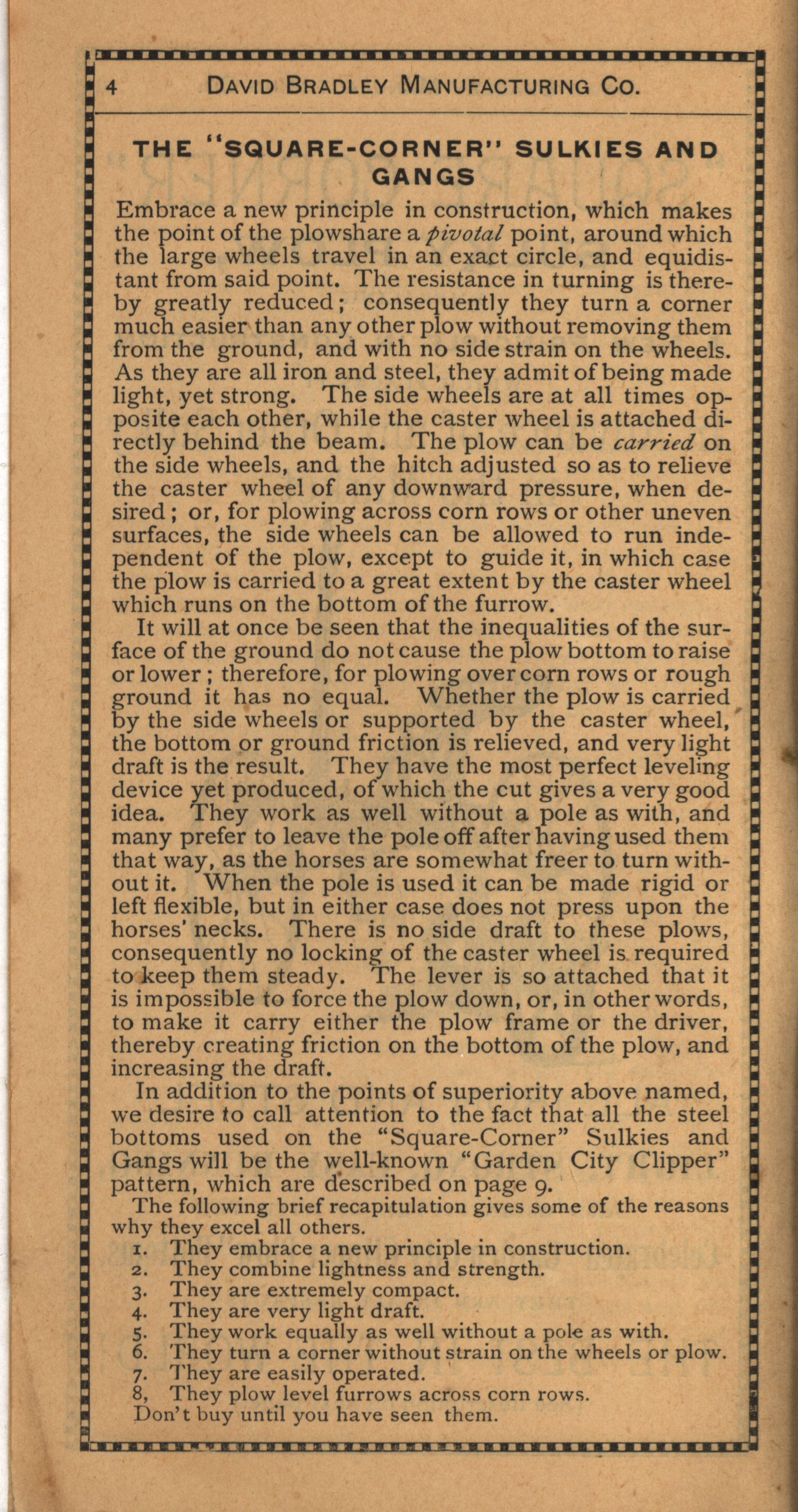 - "David Bradley Manufacturing Company plows, cultivators and rake catalog", Agricultural Machinery Literature Collection, Iowa State University Library Digital Collections