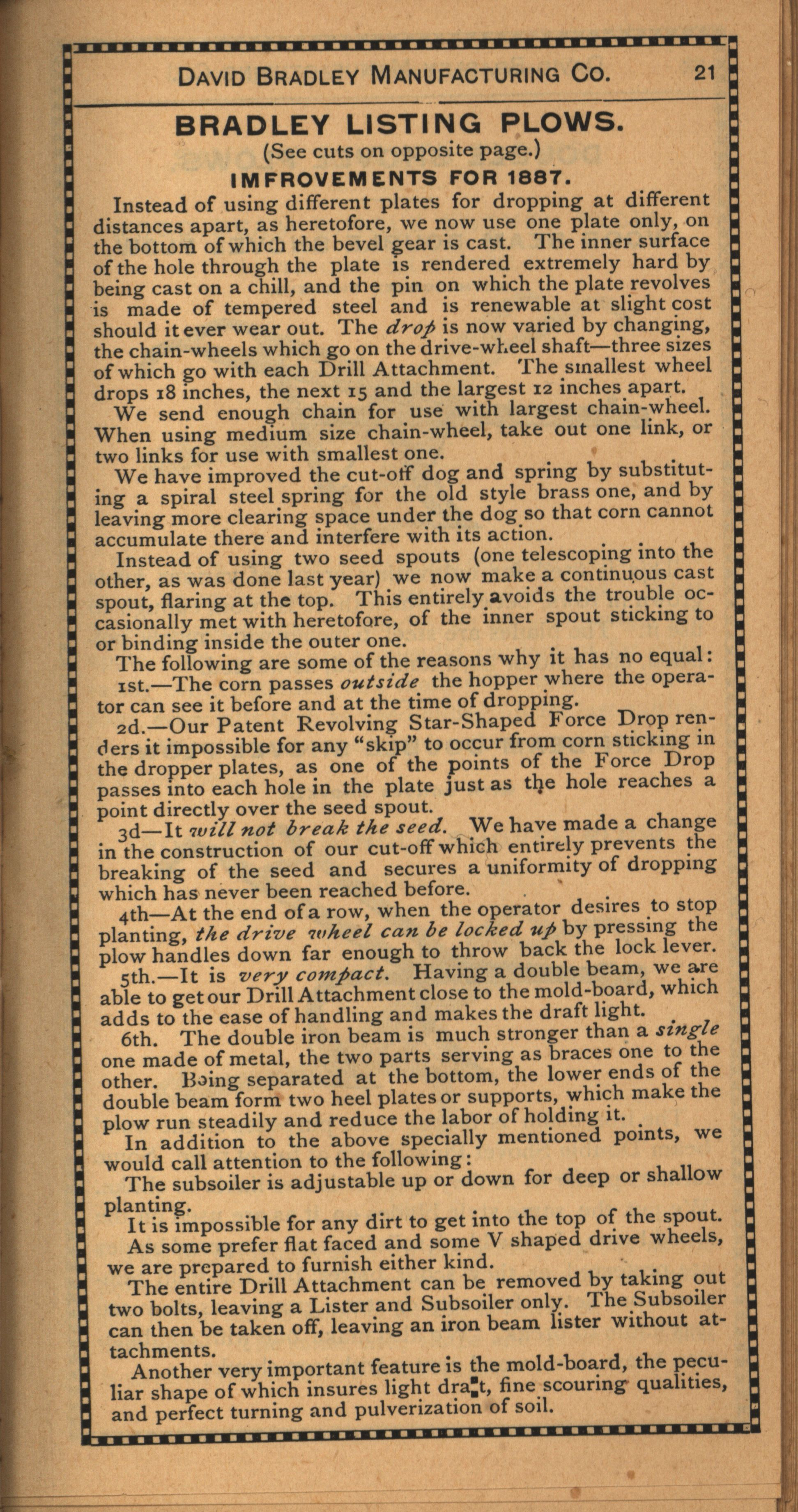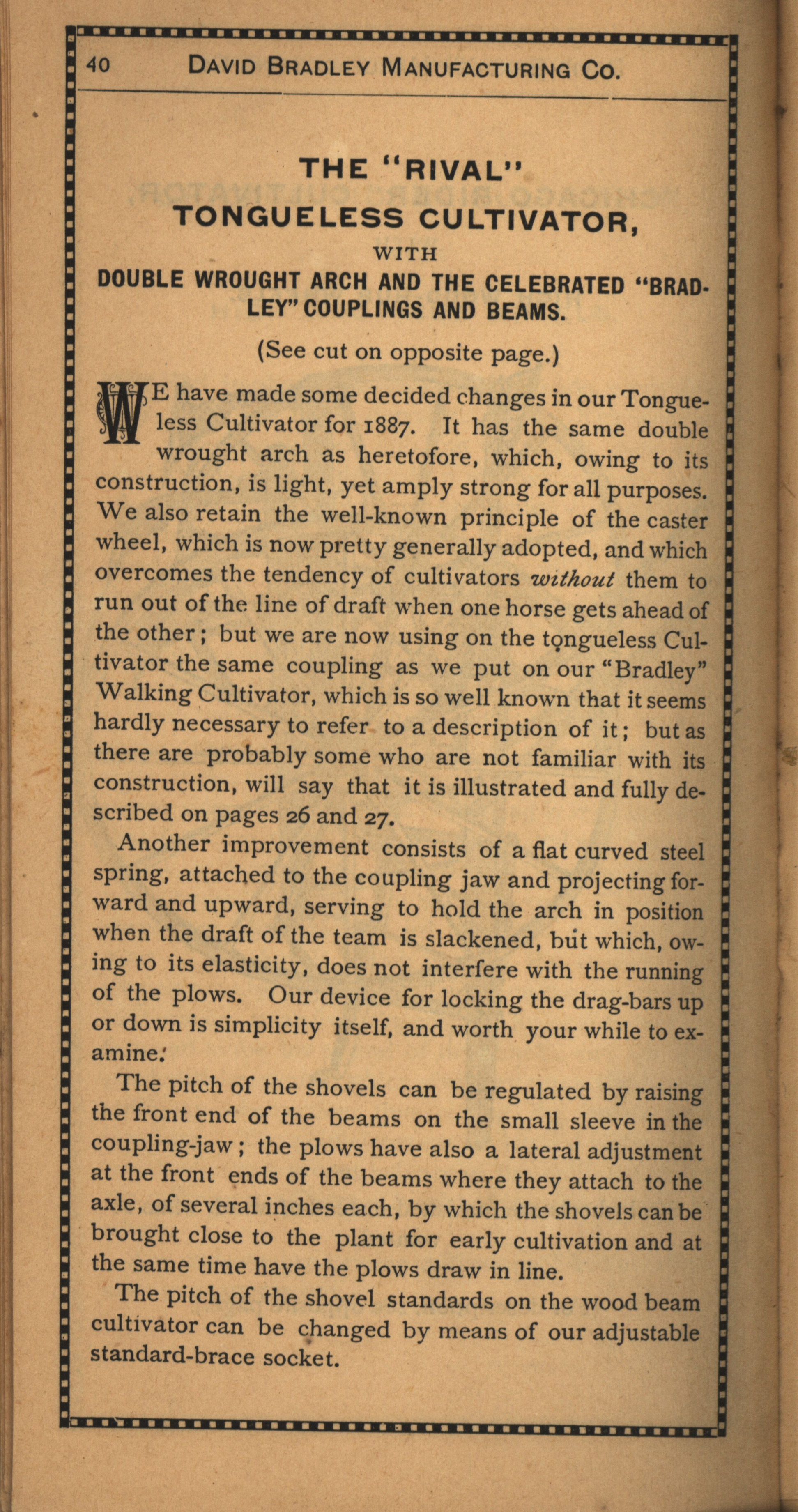 - Illustrated catalog describing plows, cultivators, rakes and related products offered by David Bradley Manufacturing Company in 1887.