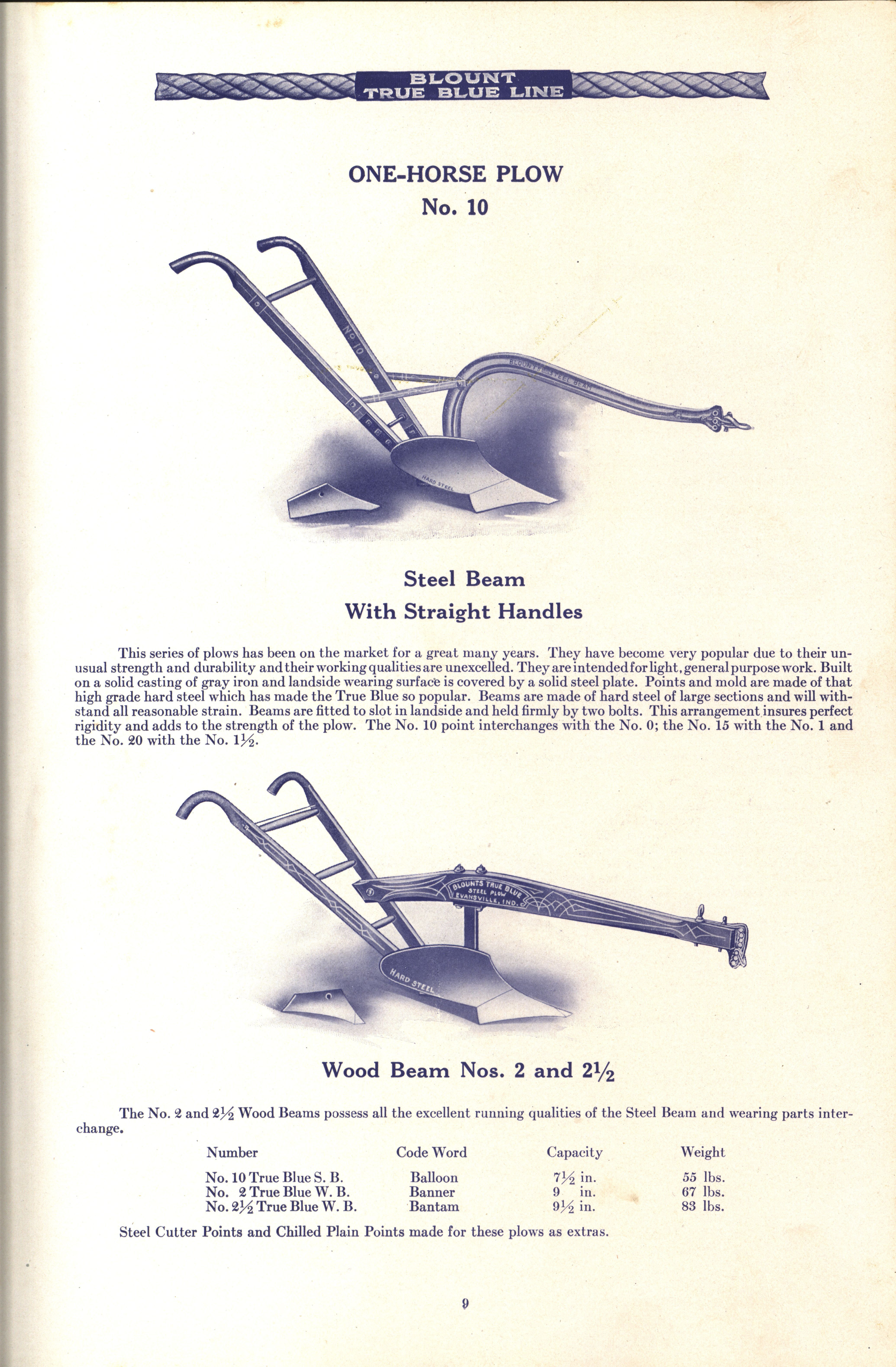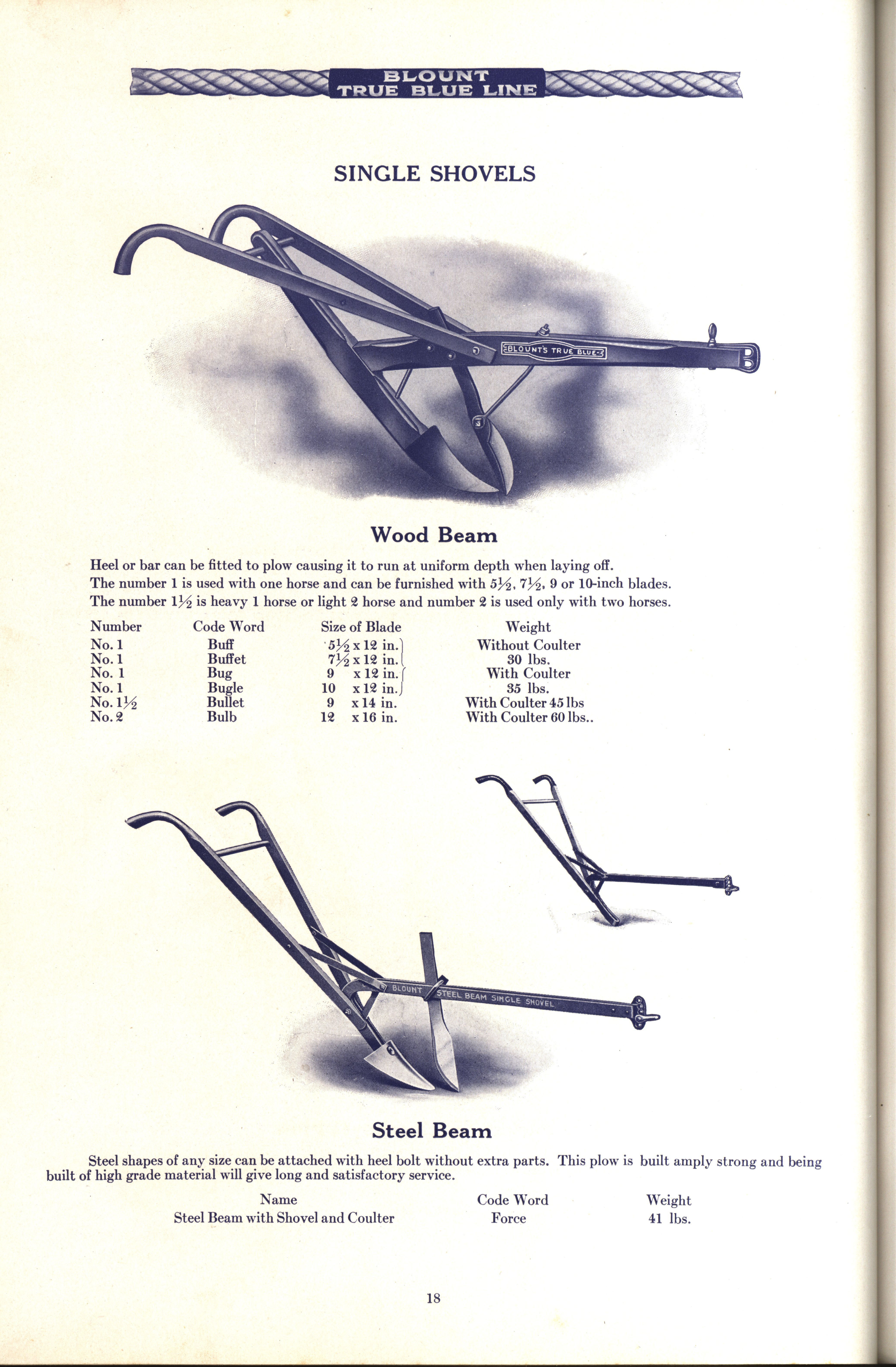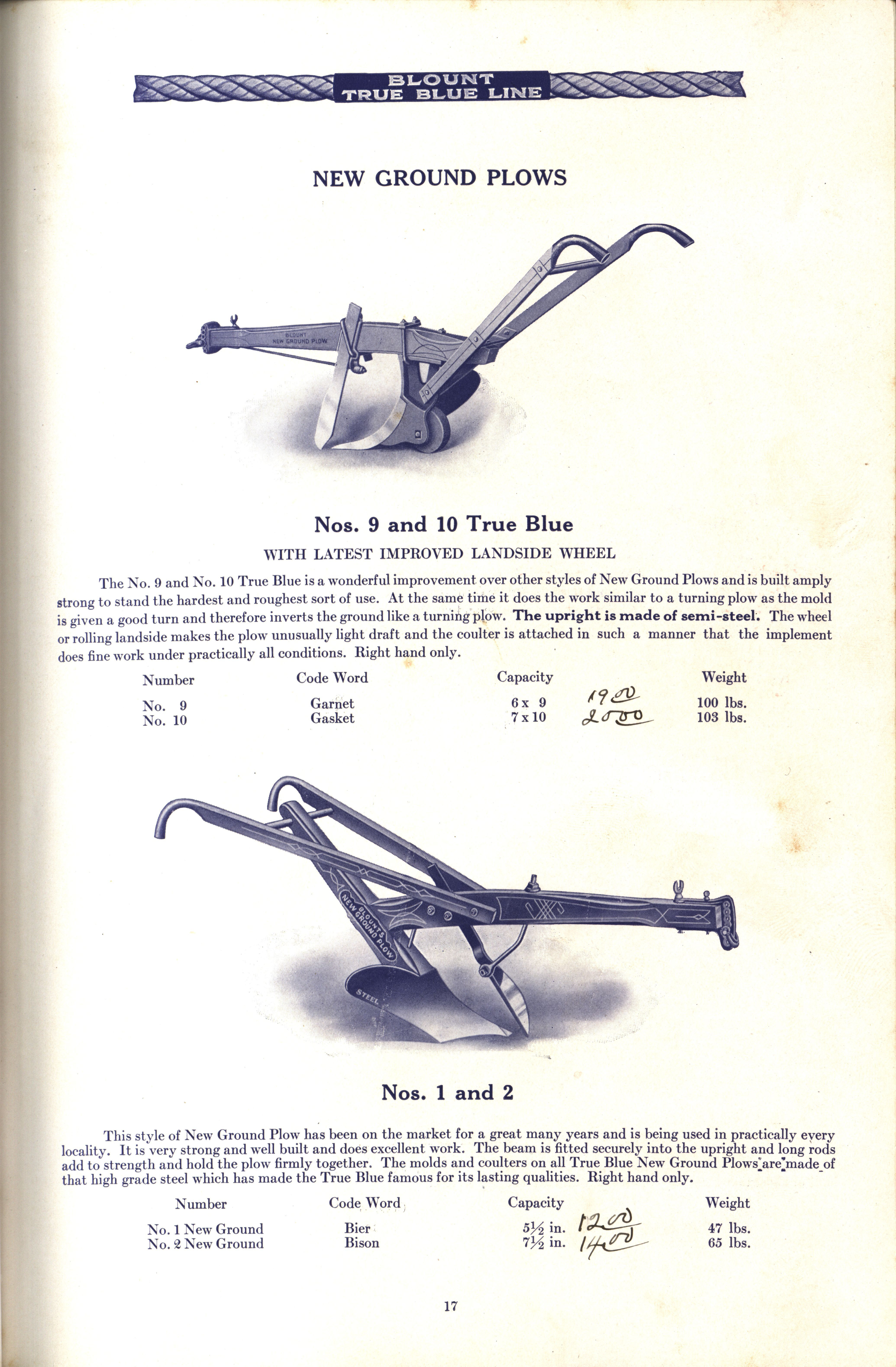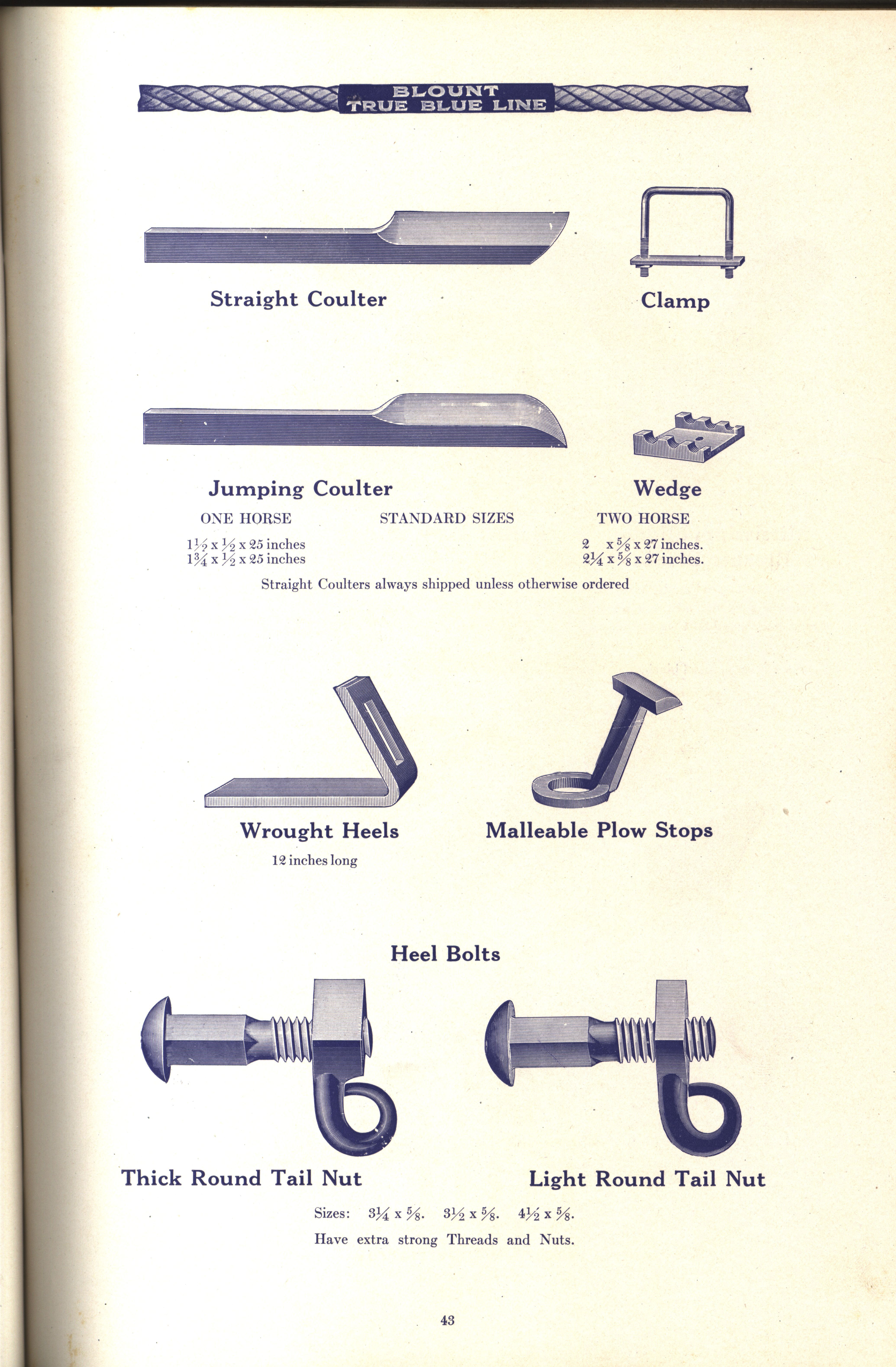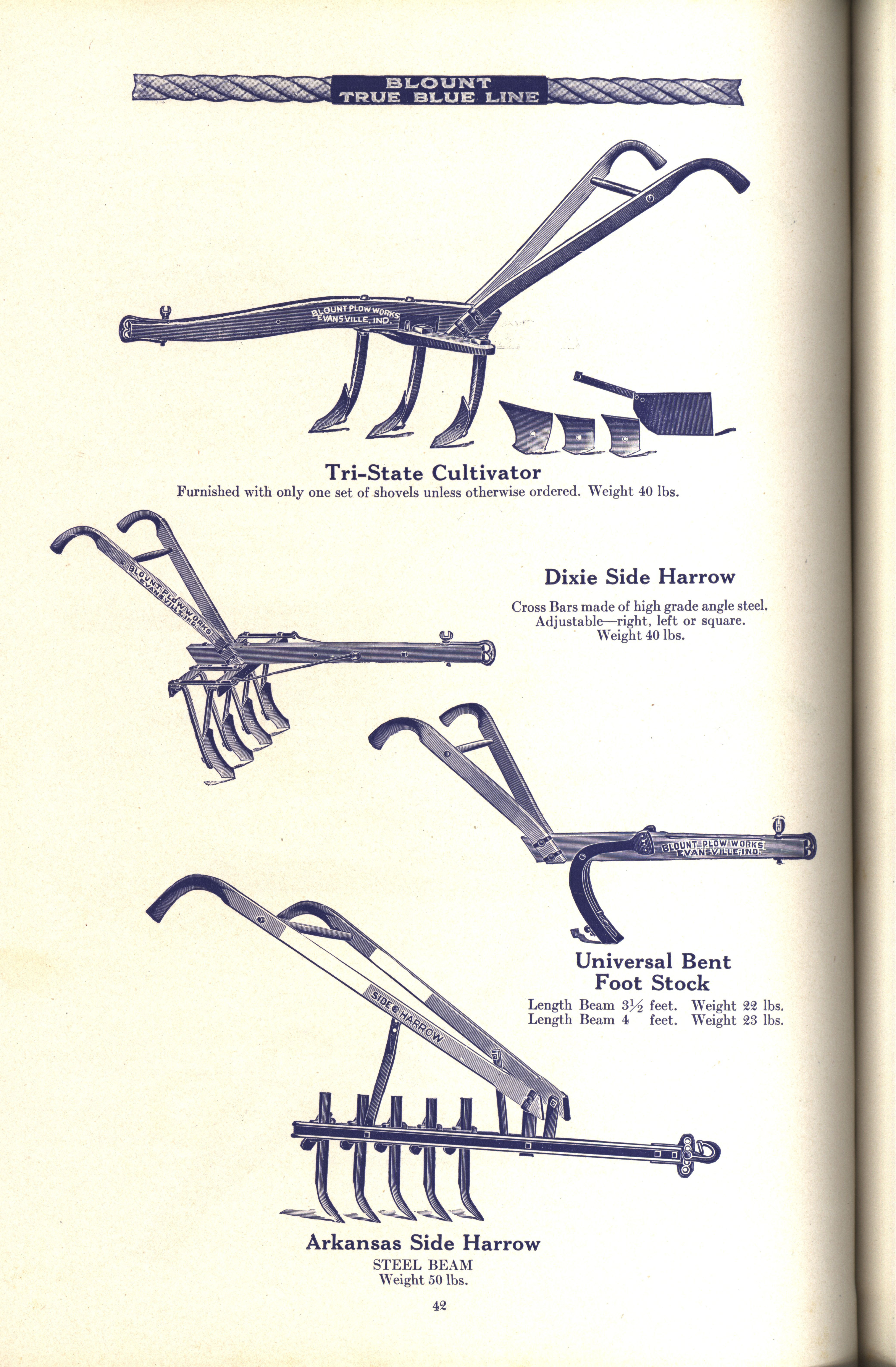 - "Blount True Blue plows, implements and wagons catalog", Agricultural Machinery Literature Collection, Iowa State University Library Digital Collections