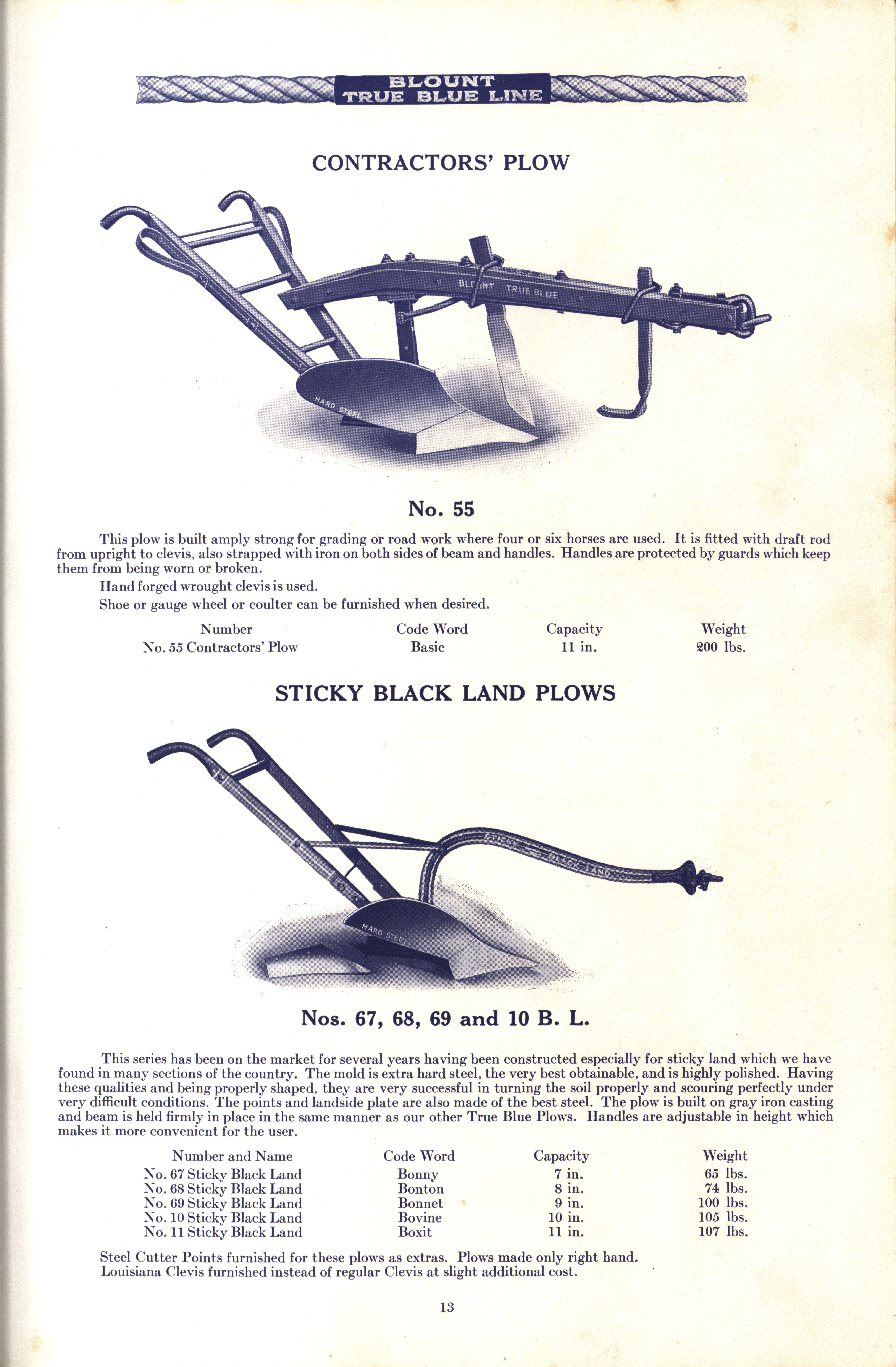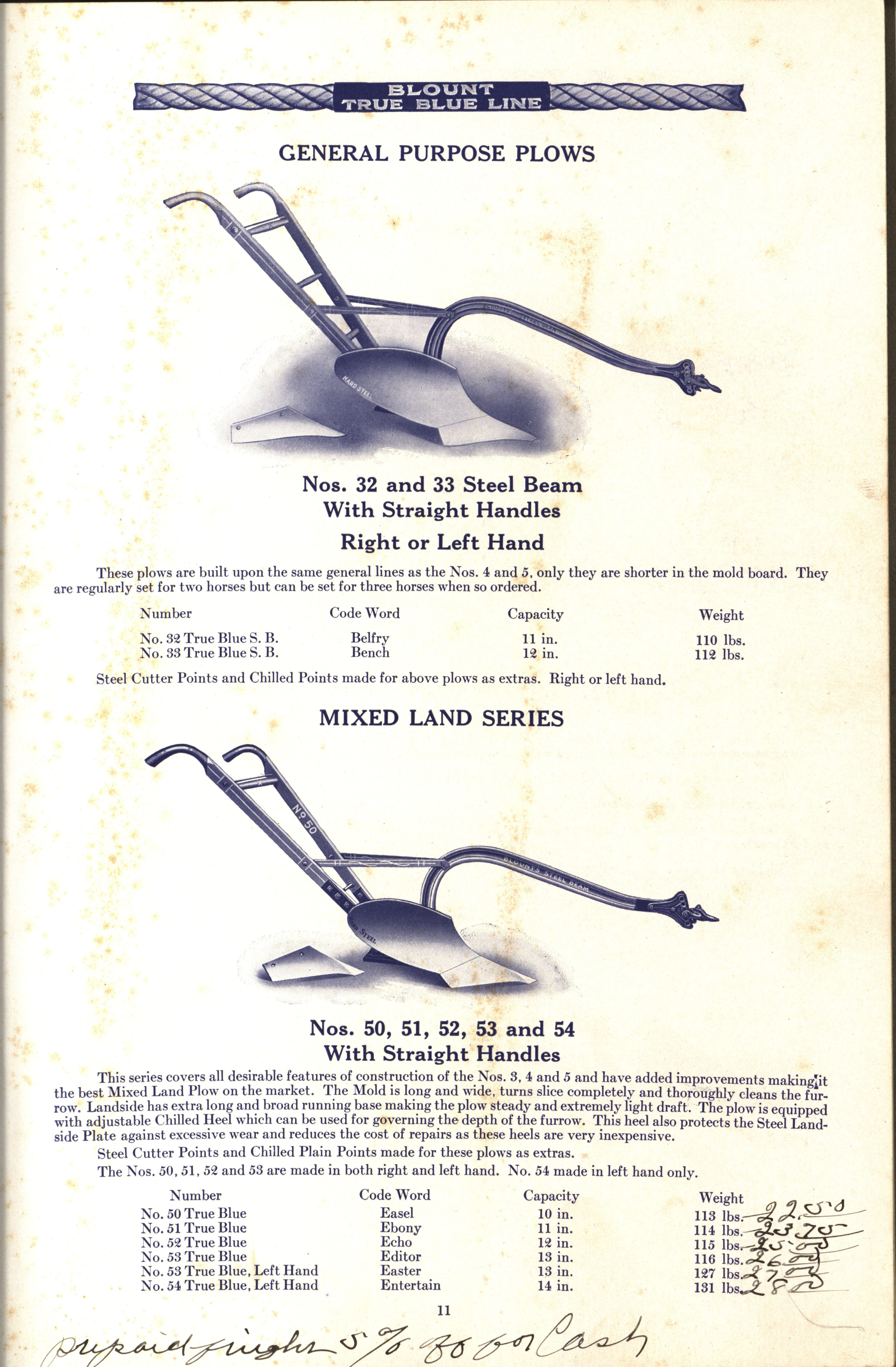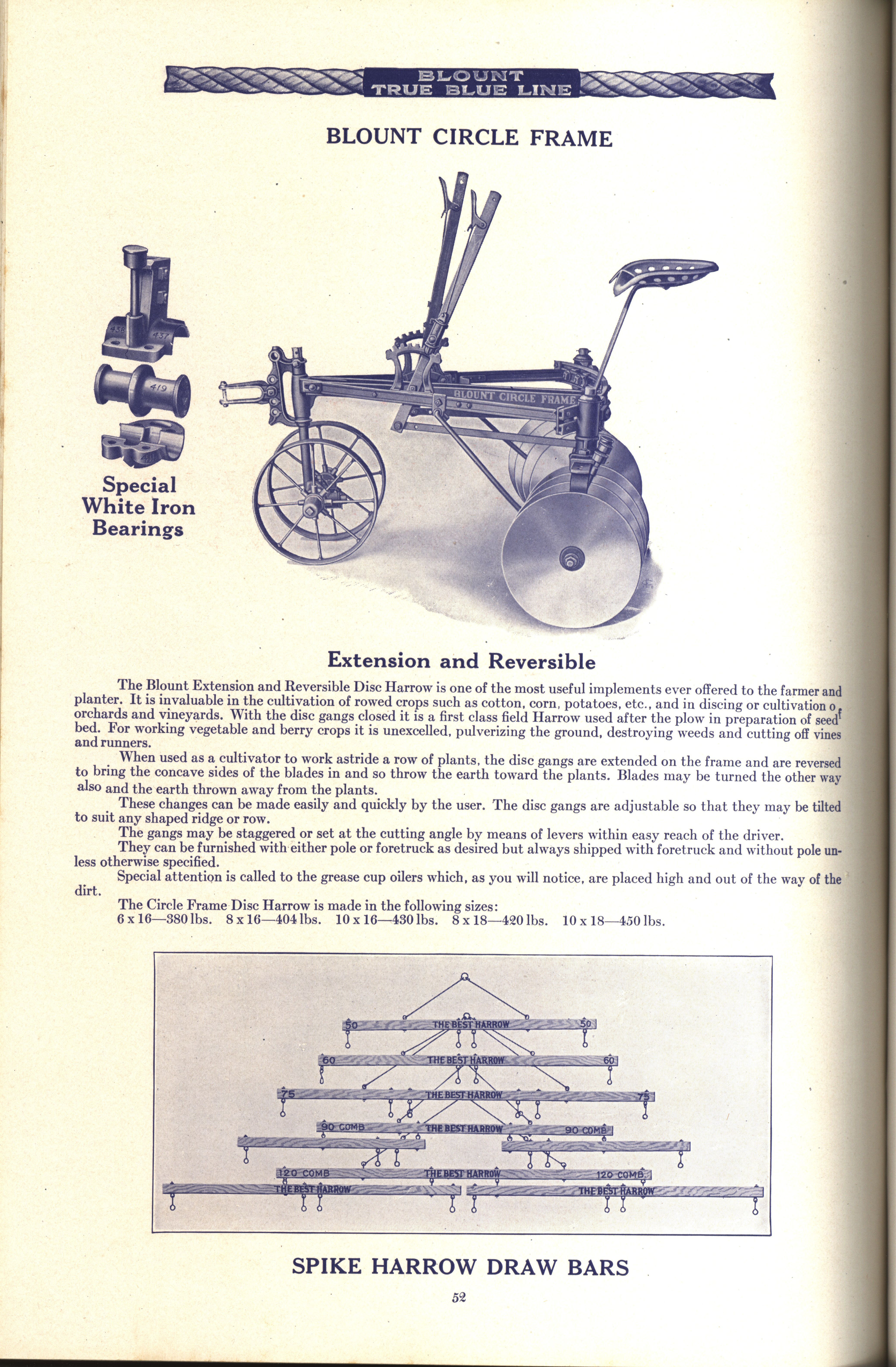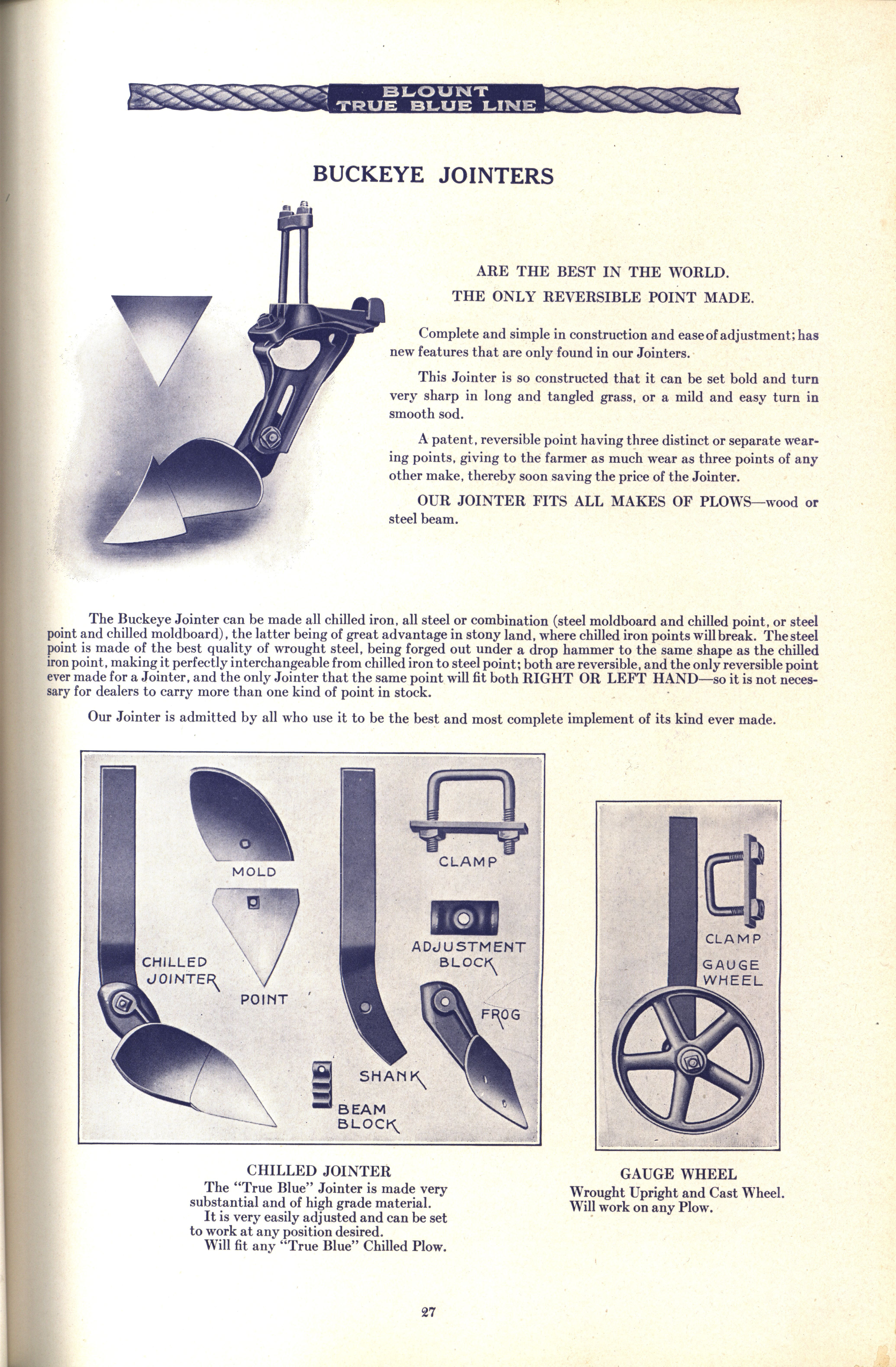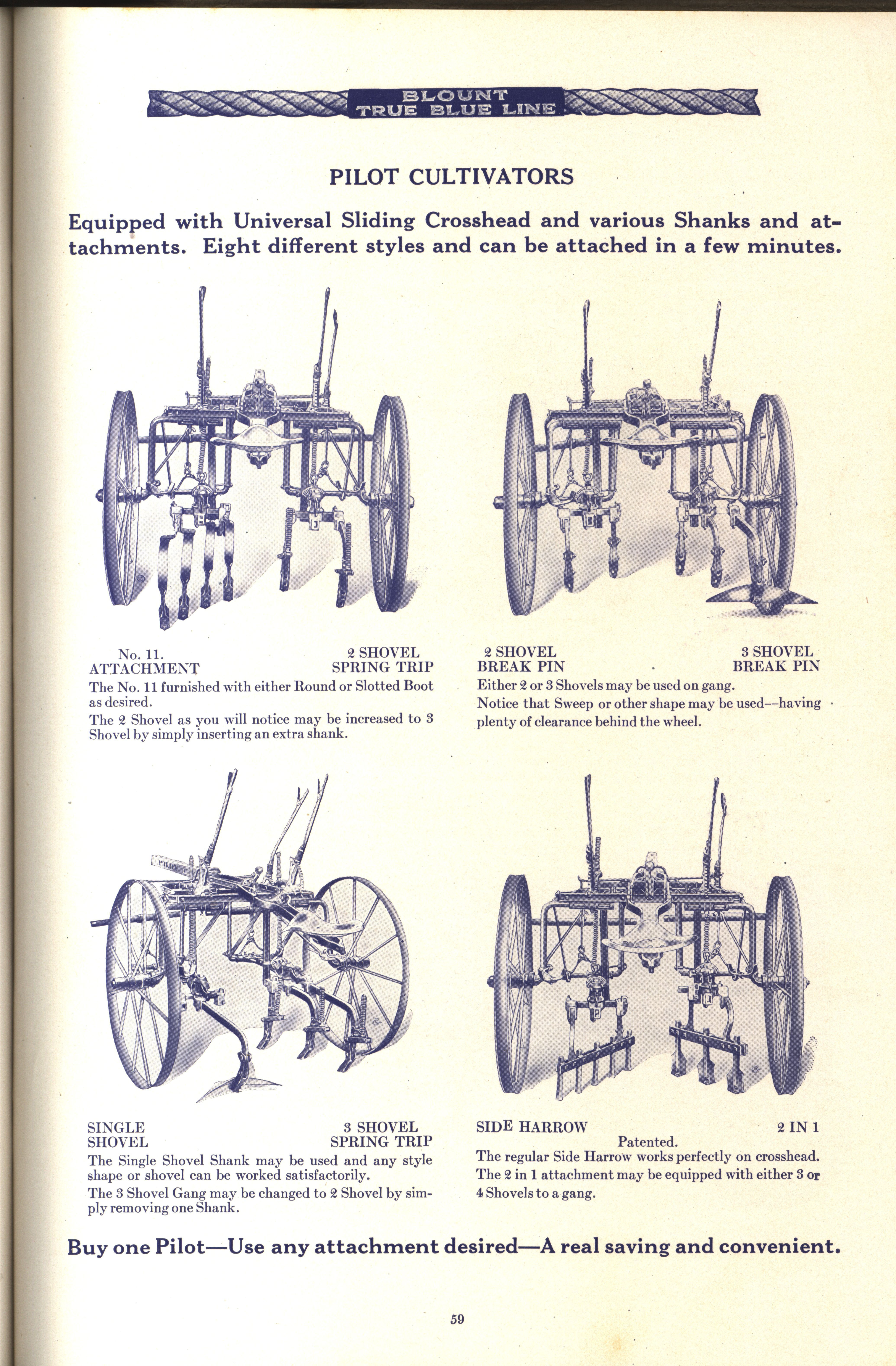 - "Blount True Blue plows, implements and wagons catalog", Agricultural Machinery Literature Collection, Iowa State University Library Digital Collections