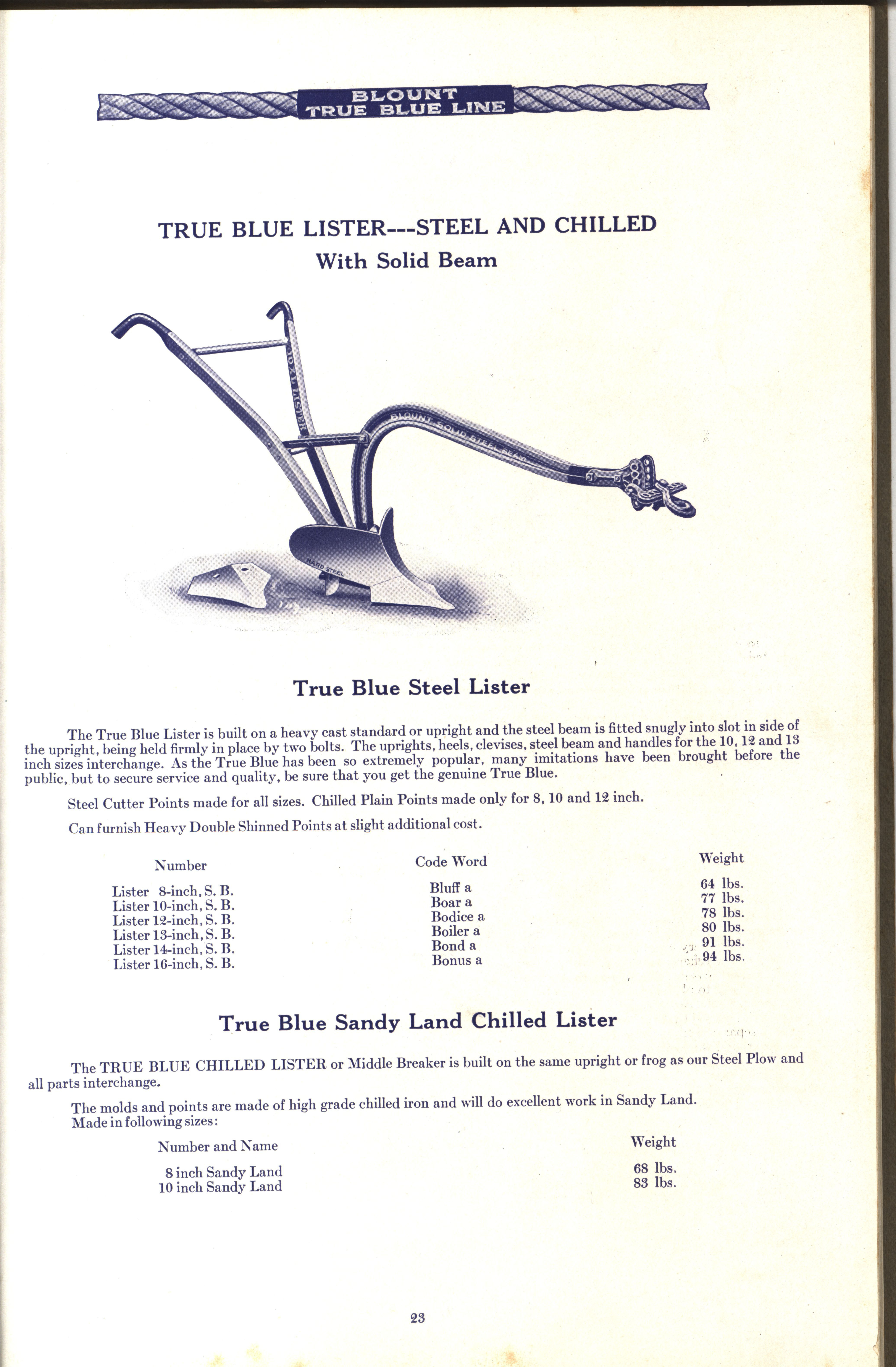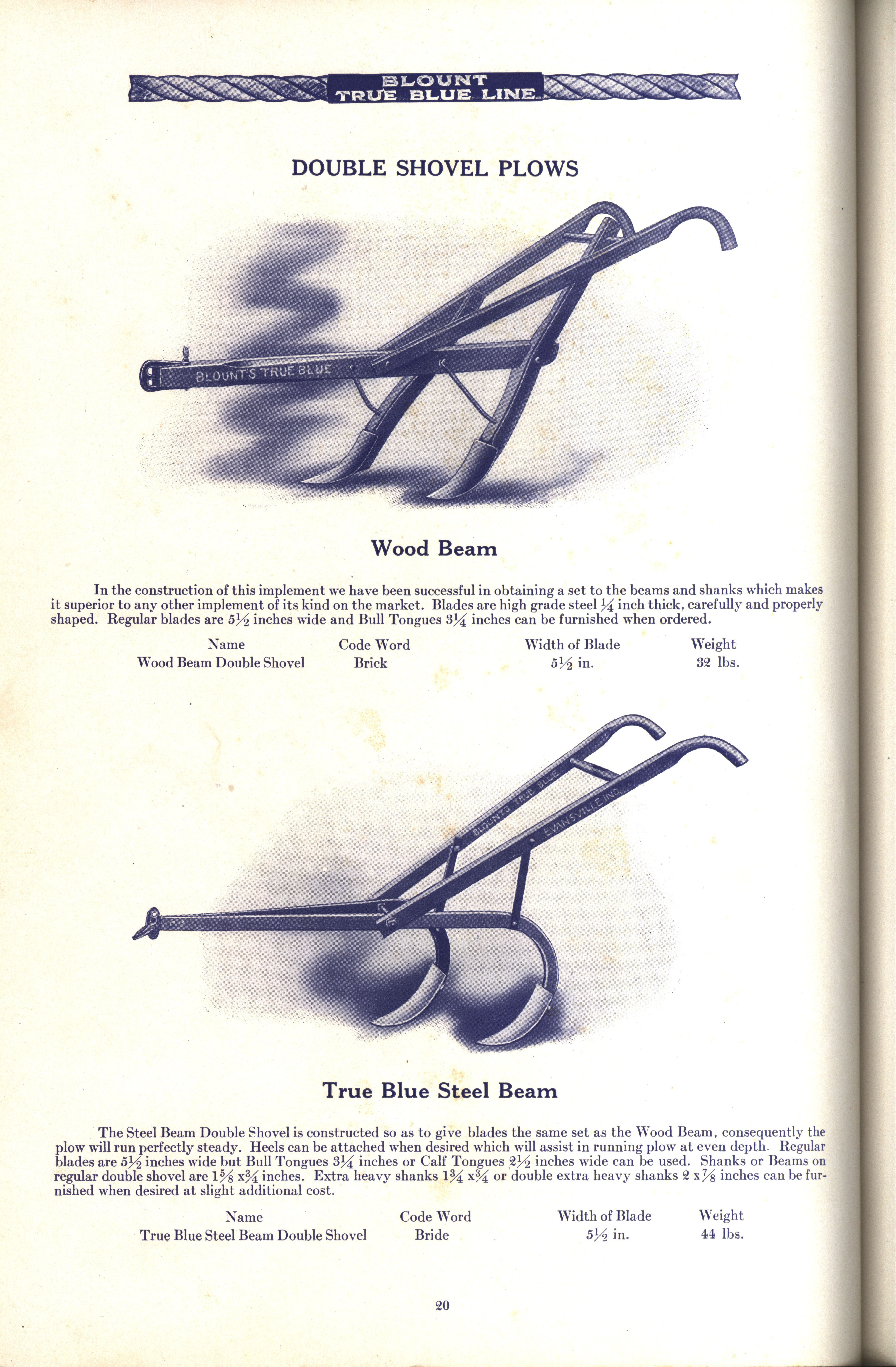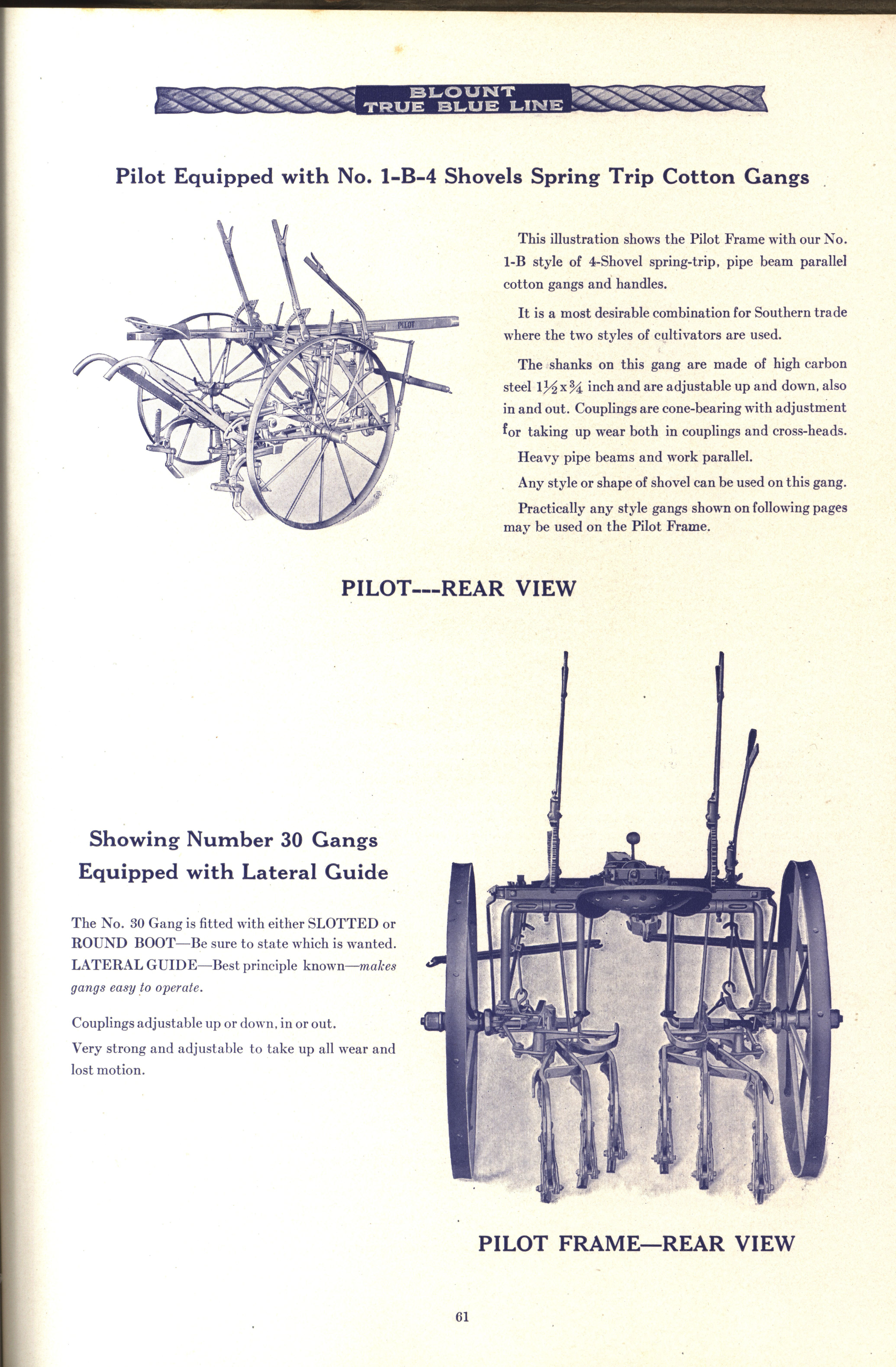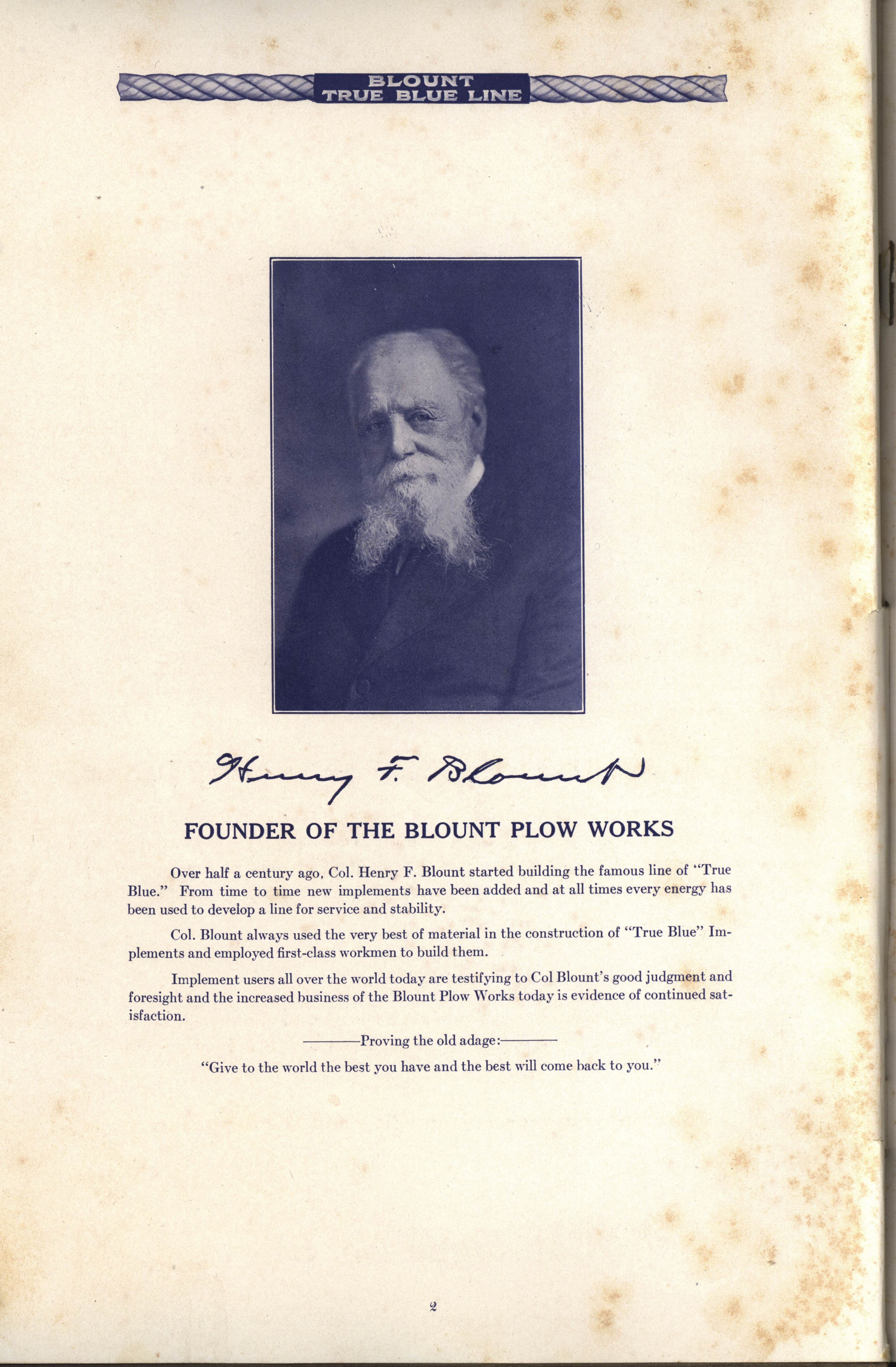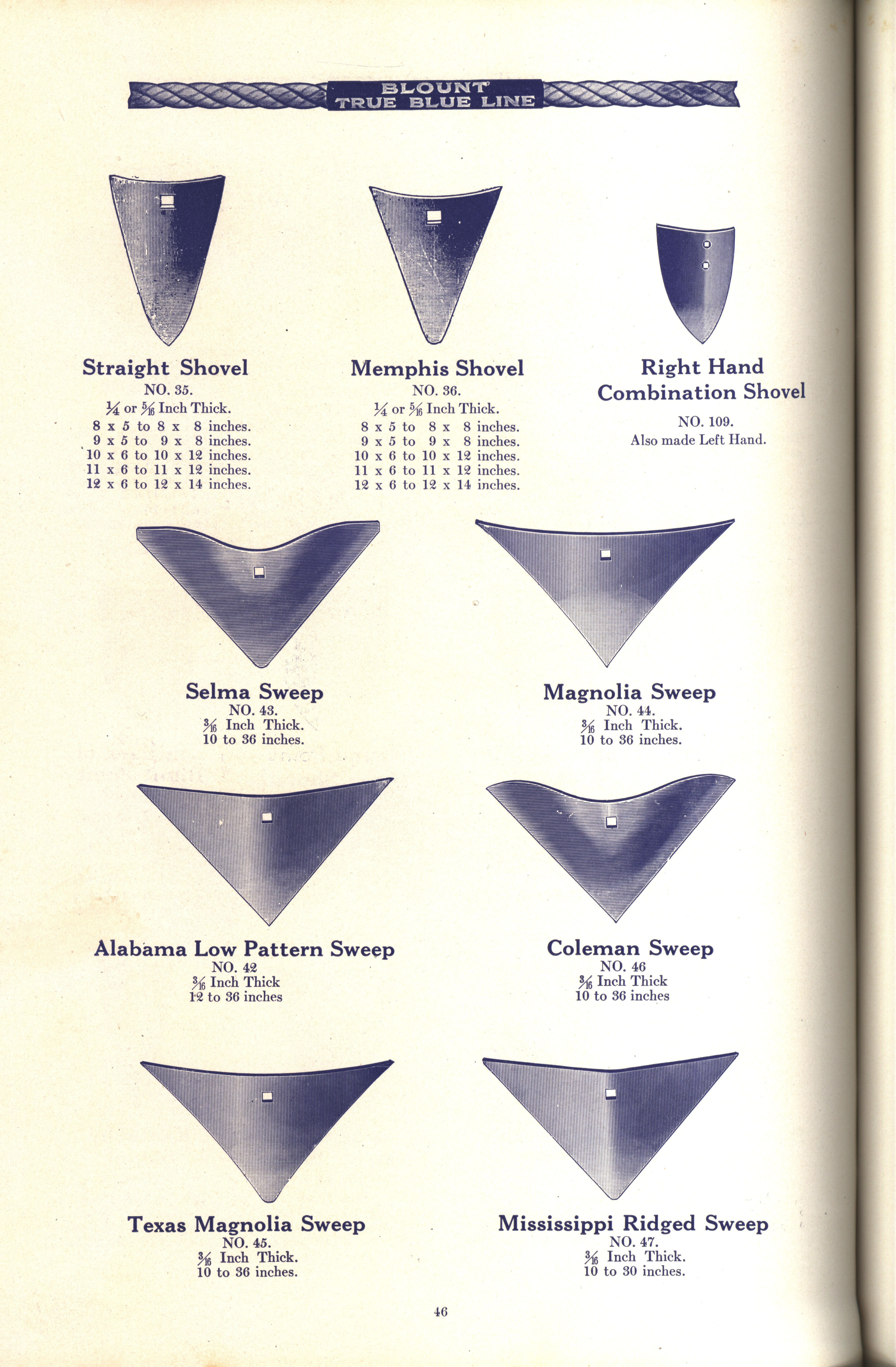 - "Blount True Blue plows, implements and wagons catalog", Agricultural Machinery Literature Collection, Iowa State University Library Digital Collections