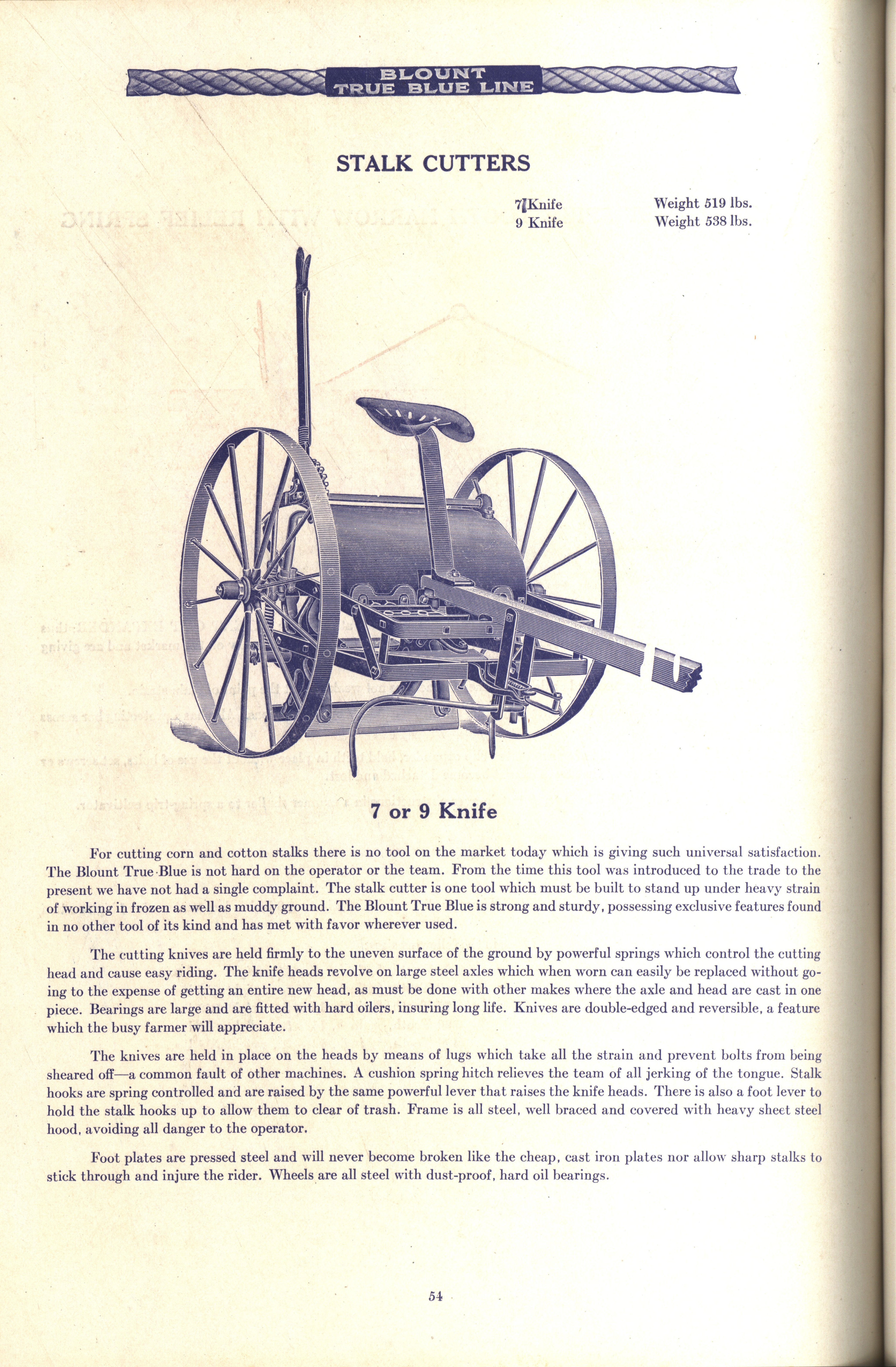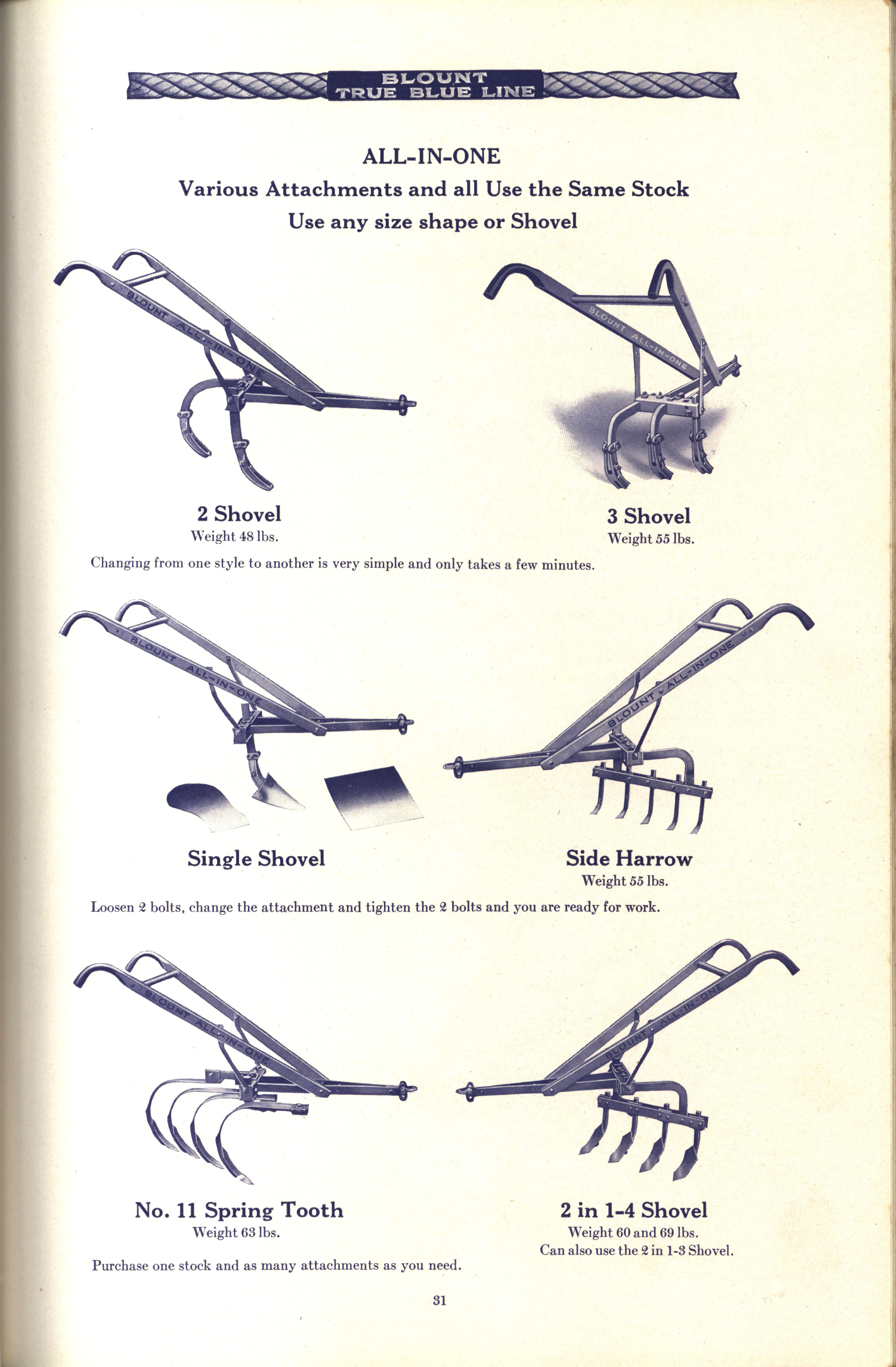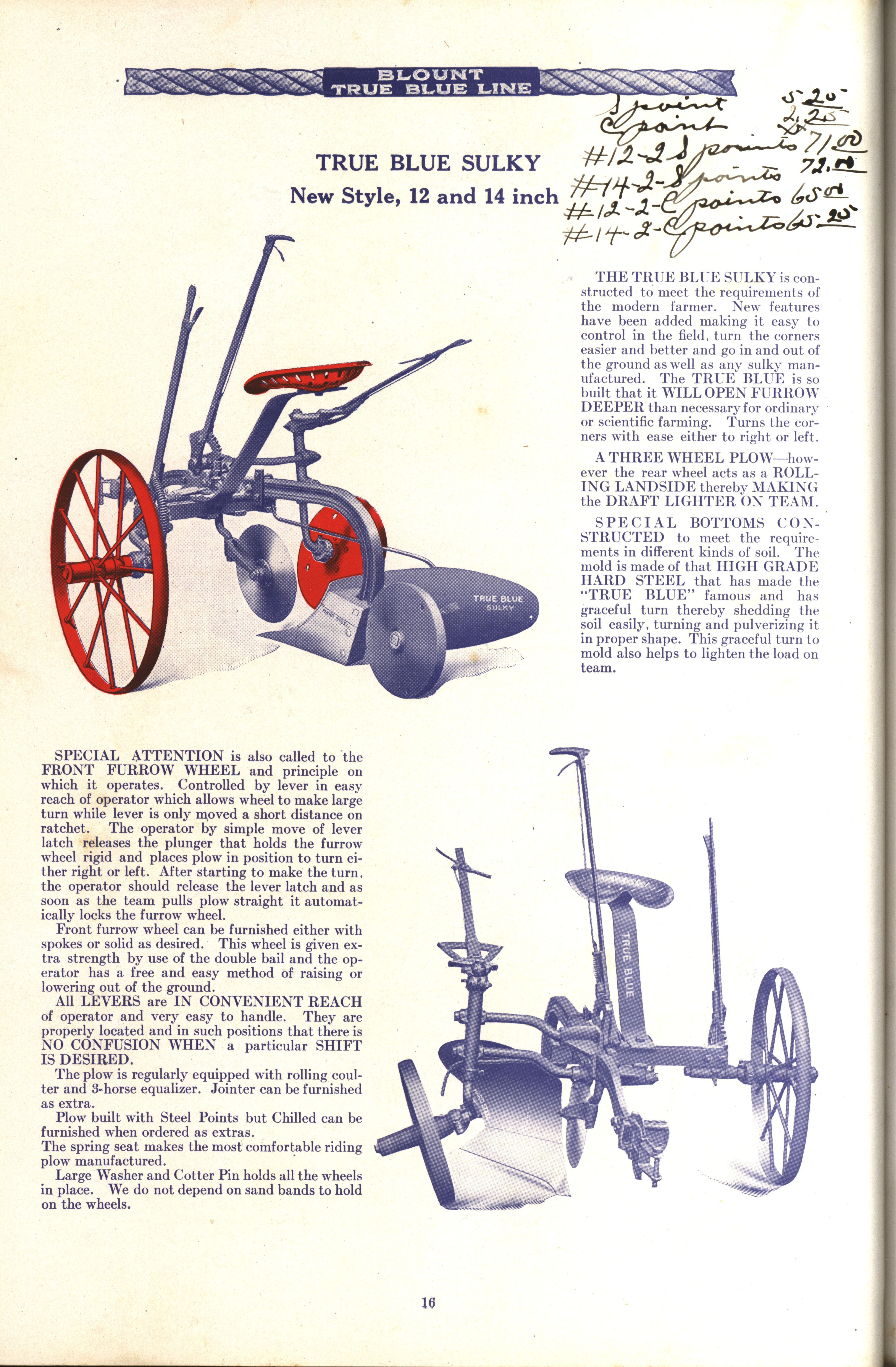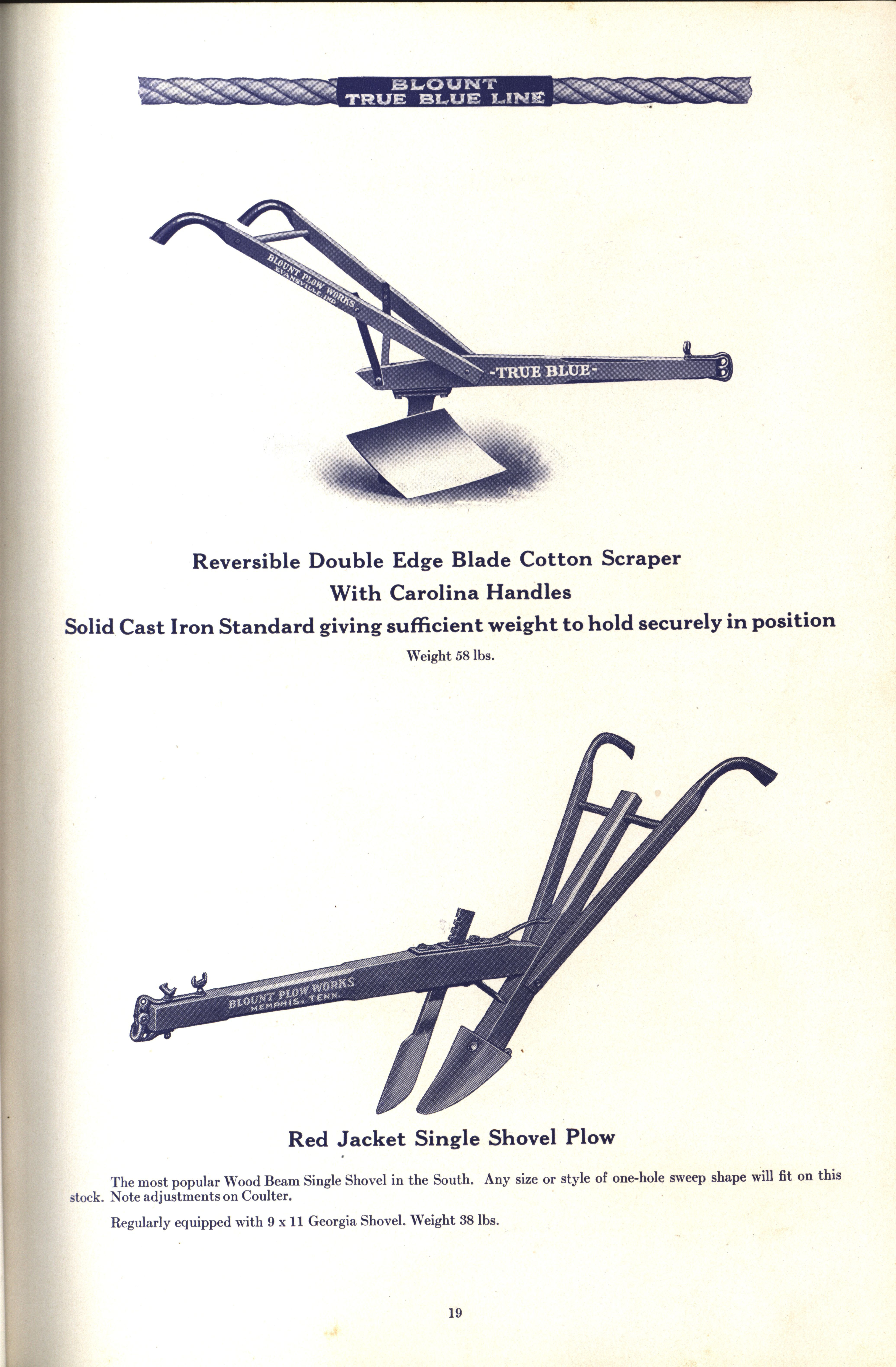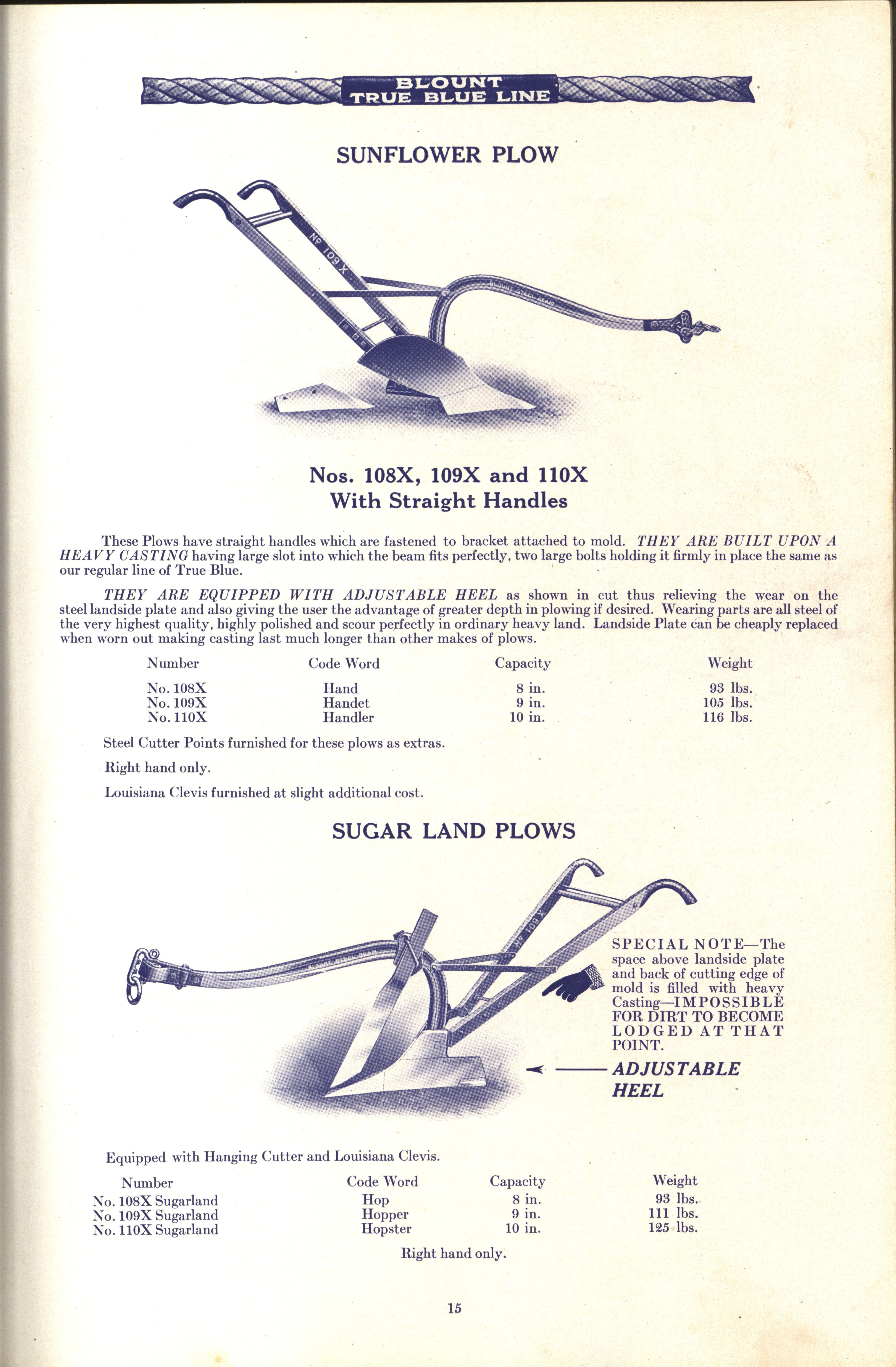 - "Blount True Blue plows, implements and wagons catalog", Agricultural Machinery Literature Collection, Iowa State University Library Digital Collections