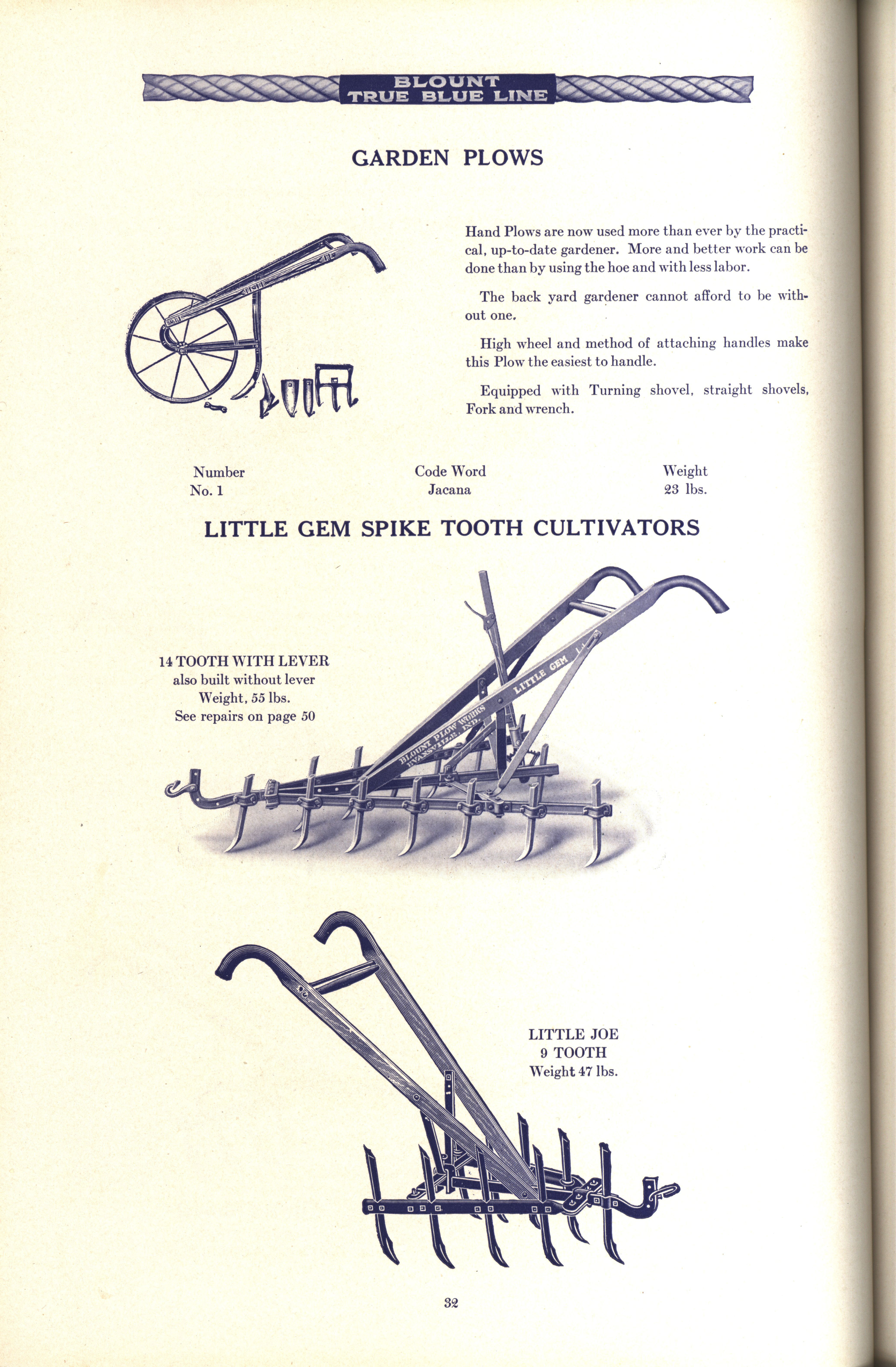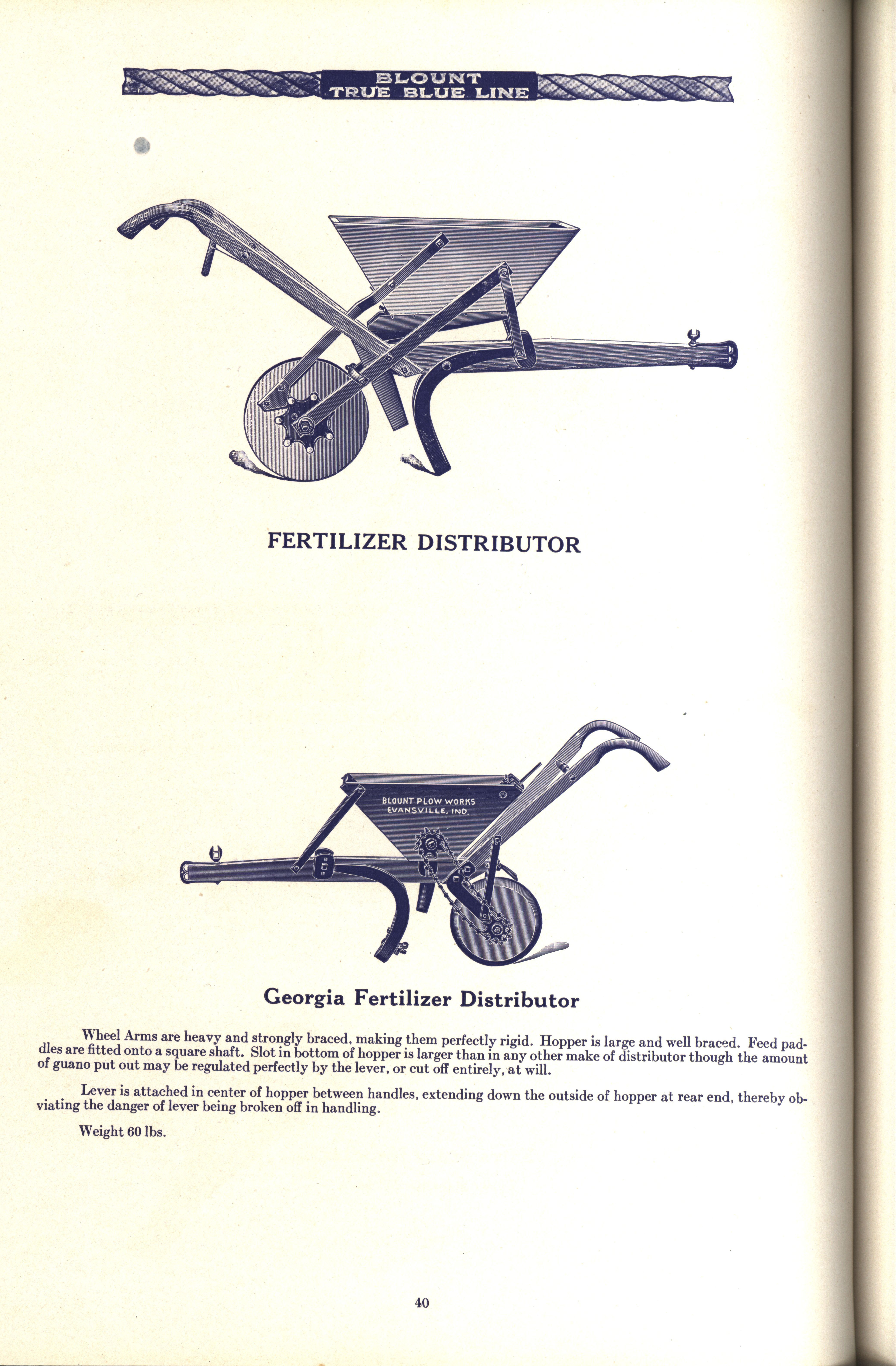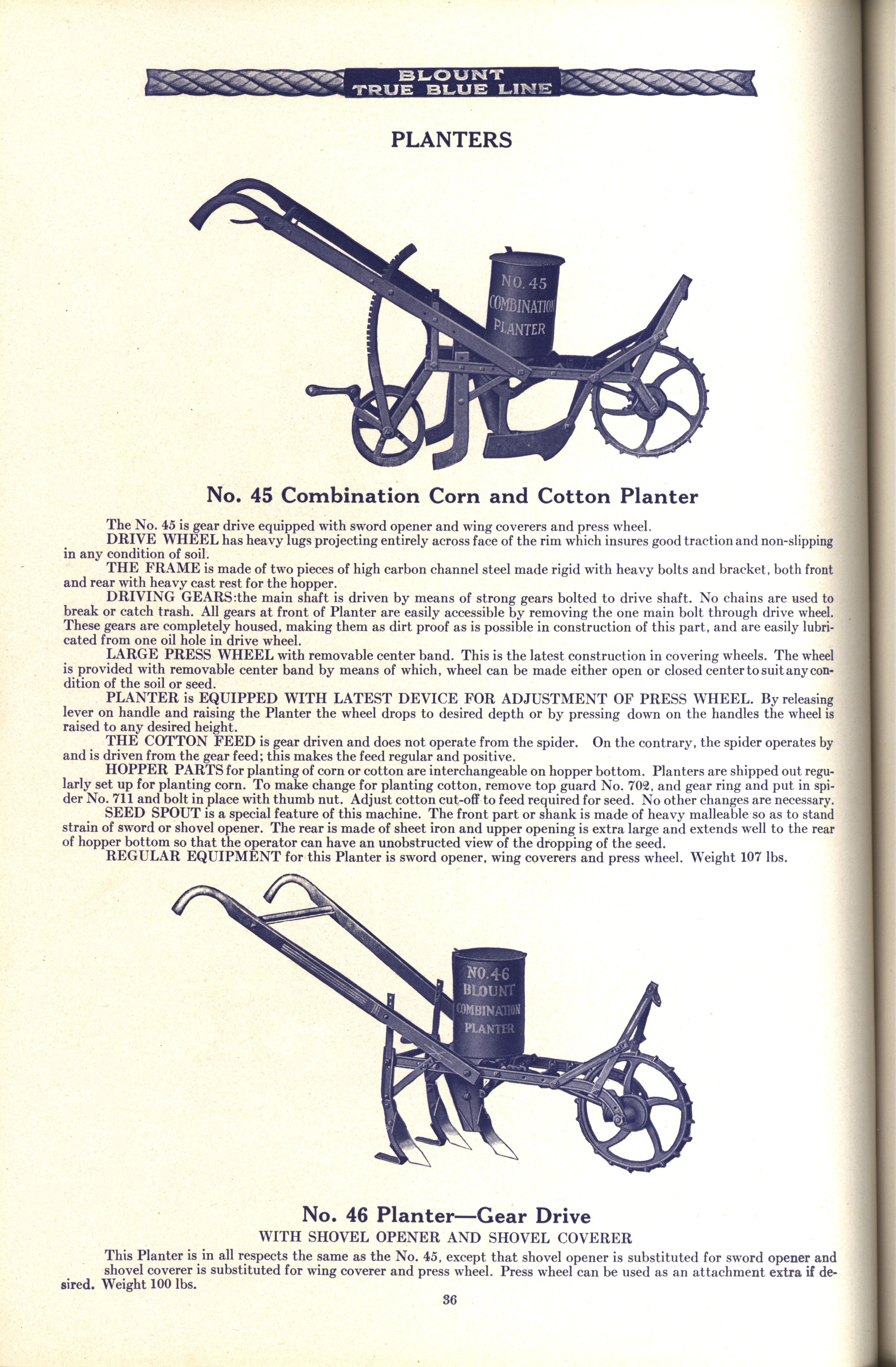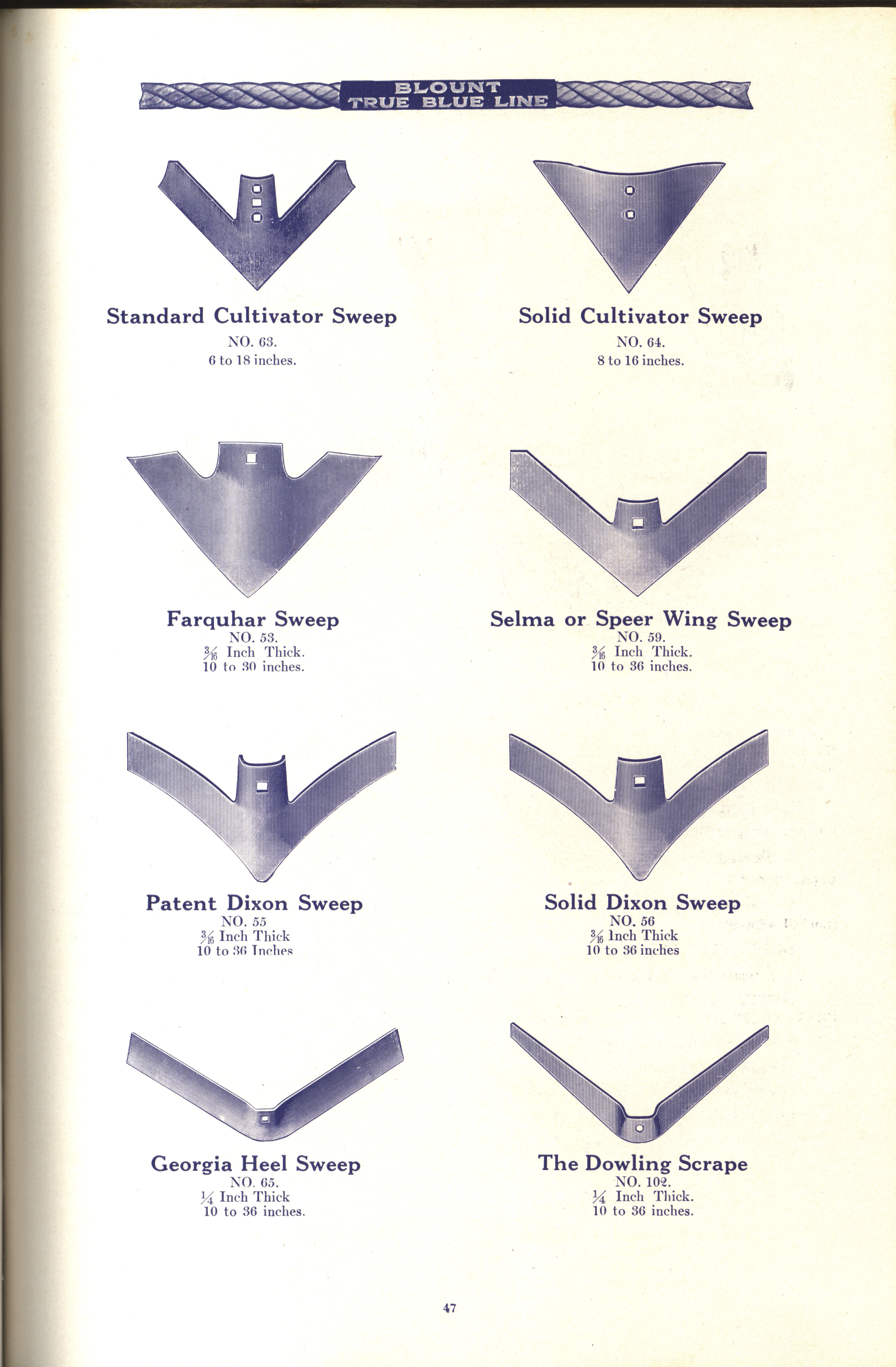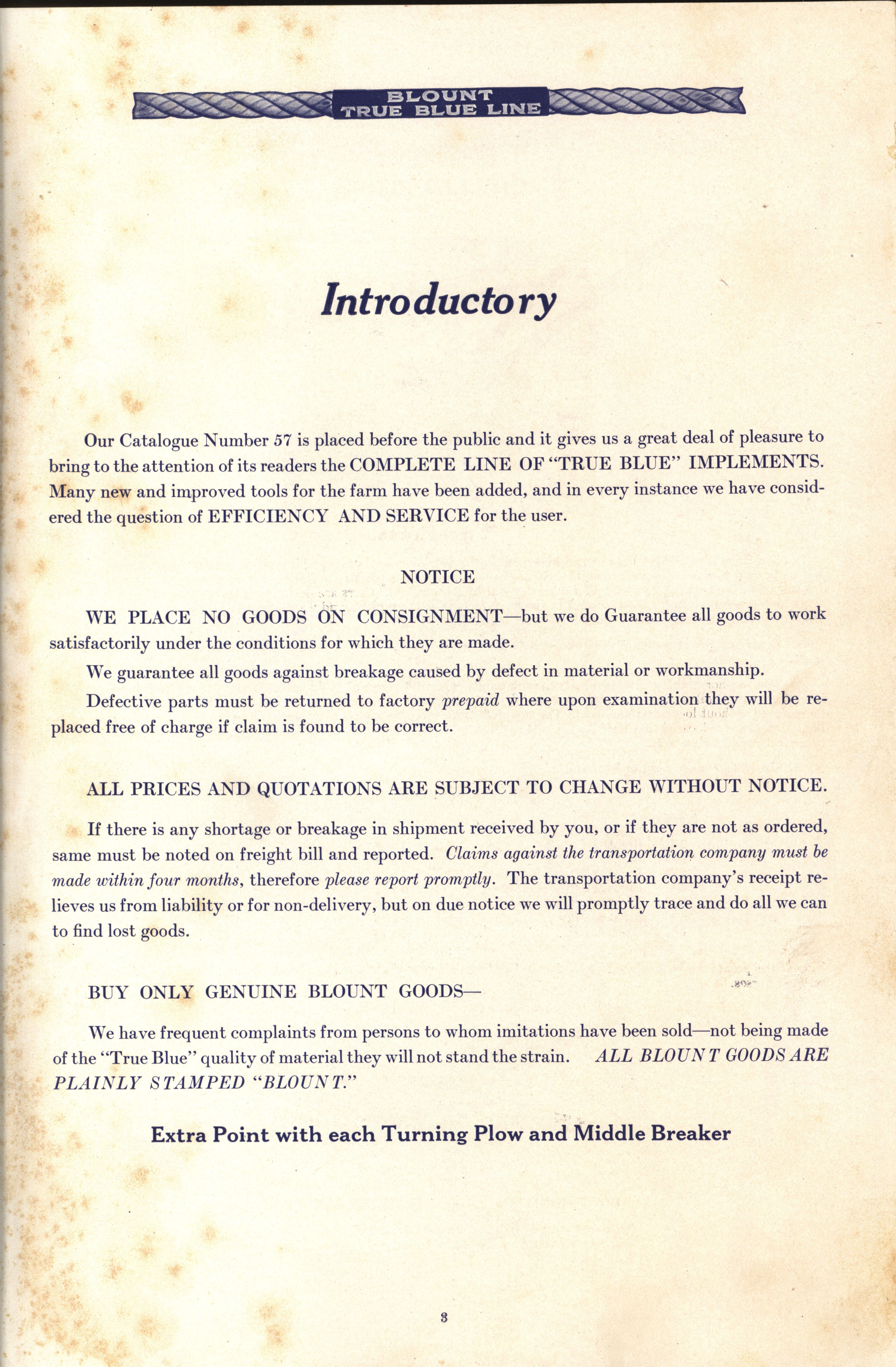- "Blount True Blue plows, implements and wagons catalog", Agricultural Machinery Literature Collection, Iowa State University Library Digital Collections