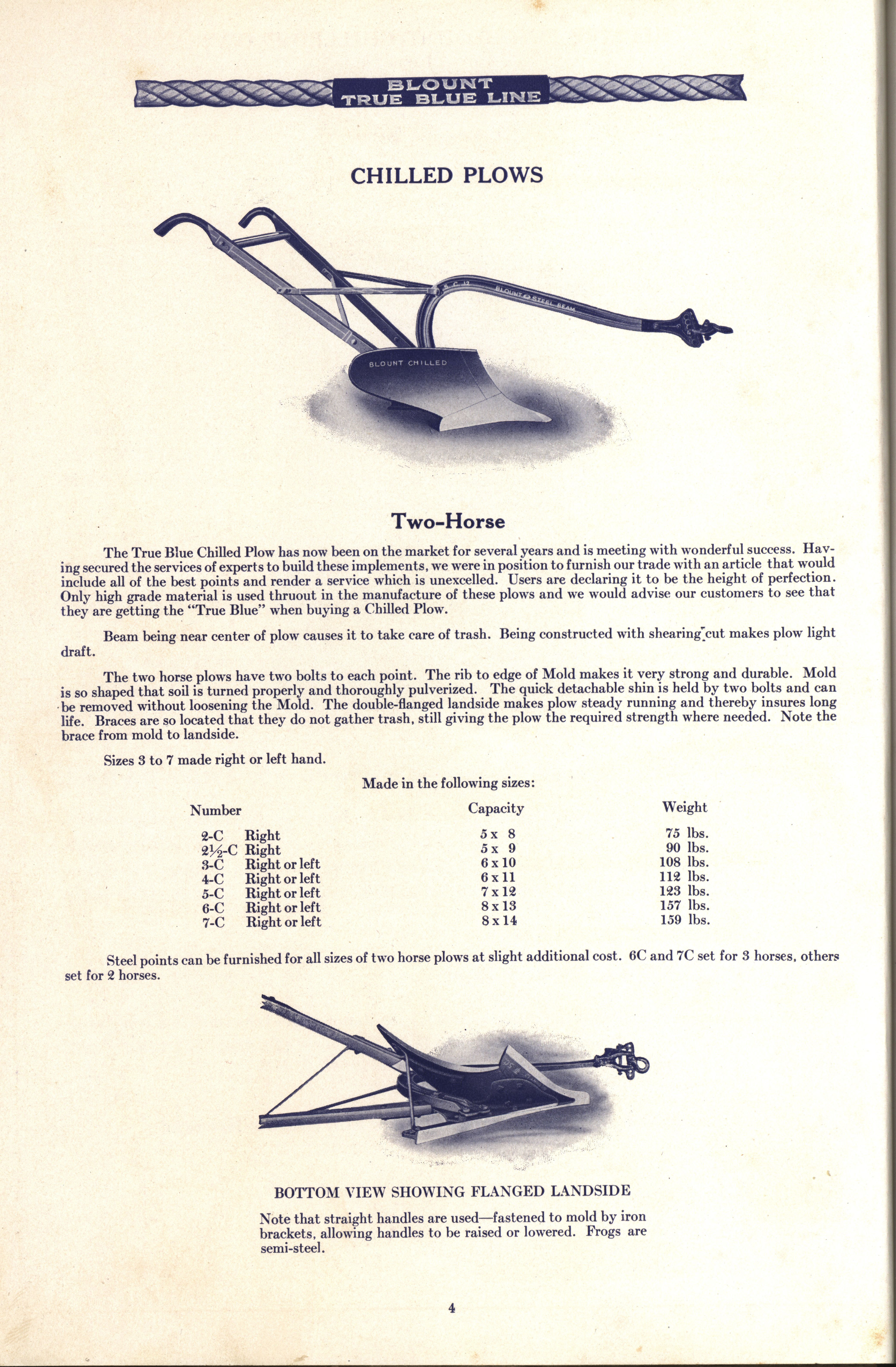 - Illustrated catalog of Blount True Blue Plows, Implements and Wagons offered by Blount Plow Works.