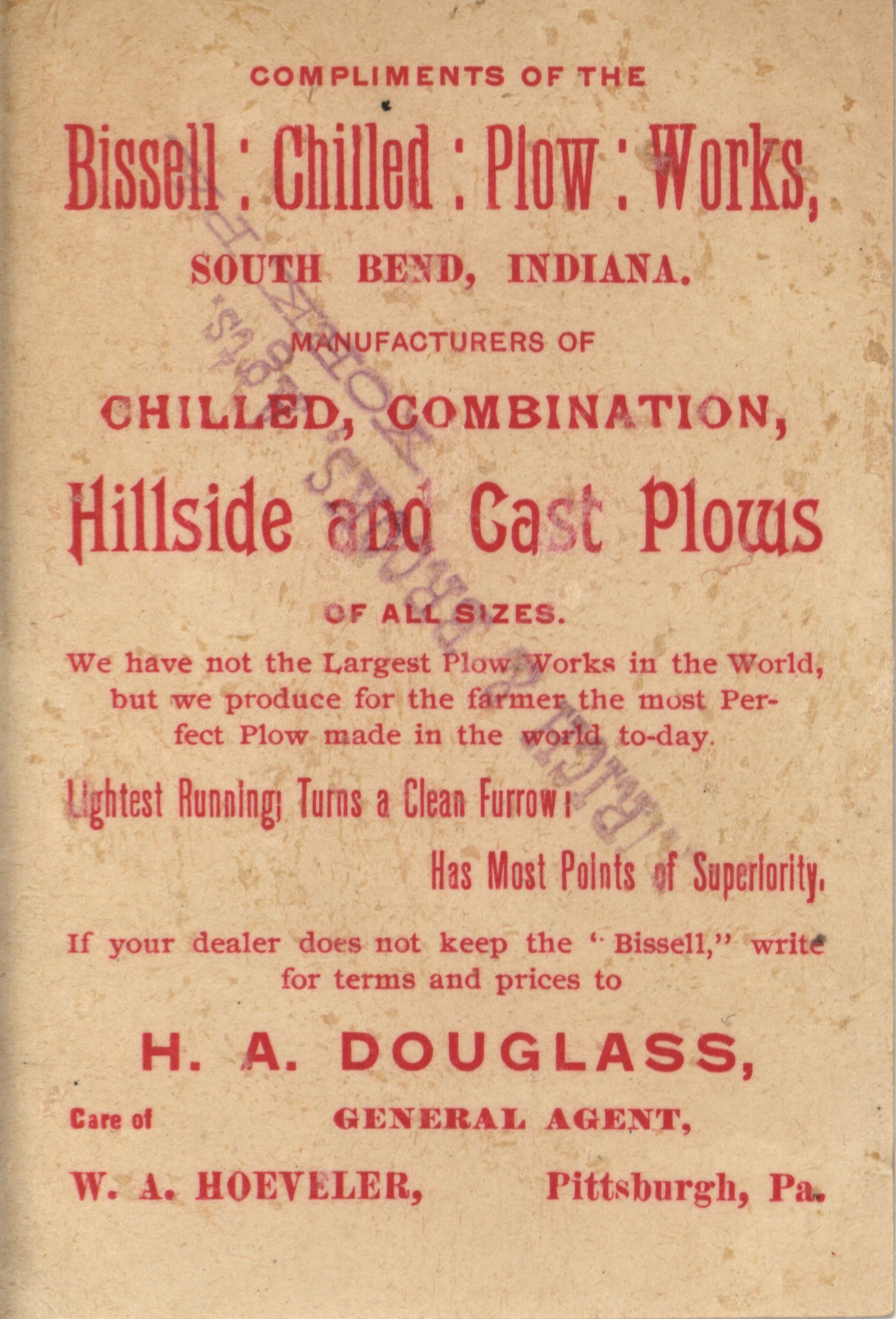 - "Bissell Chilled Plow Works hillside and cast plows advertisement card", Agricultural Machinery Literature Collection, Iowa State University Library Digital Collections