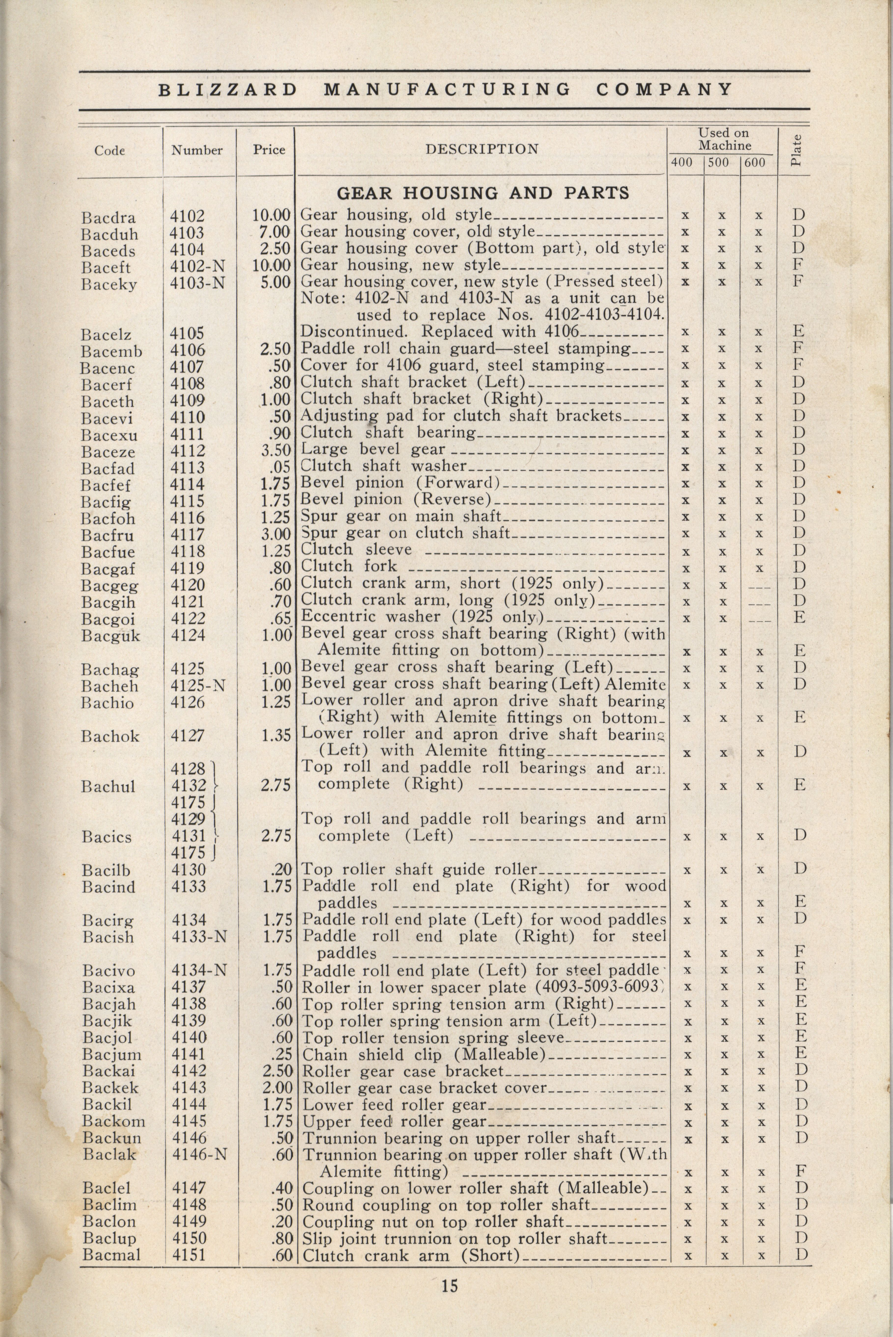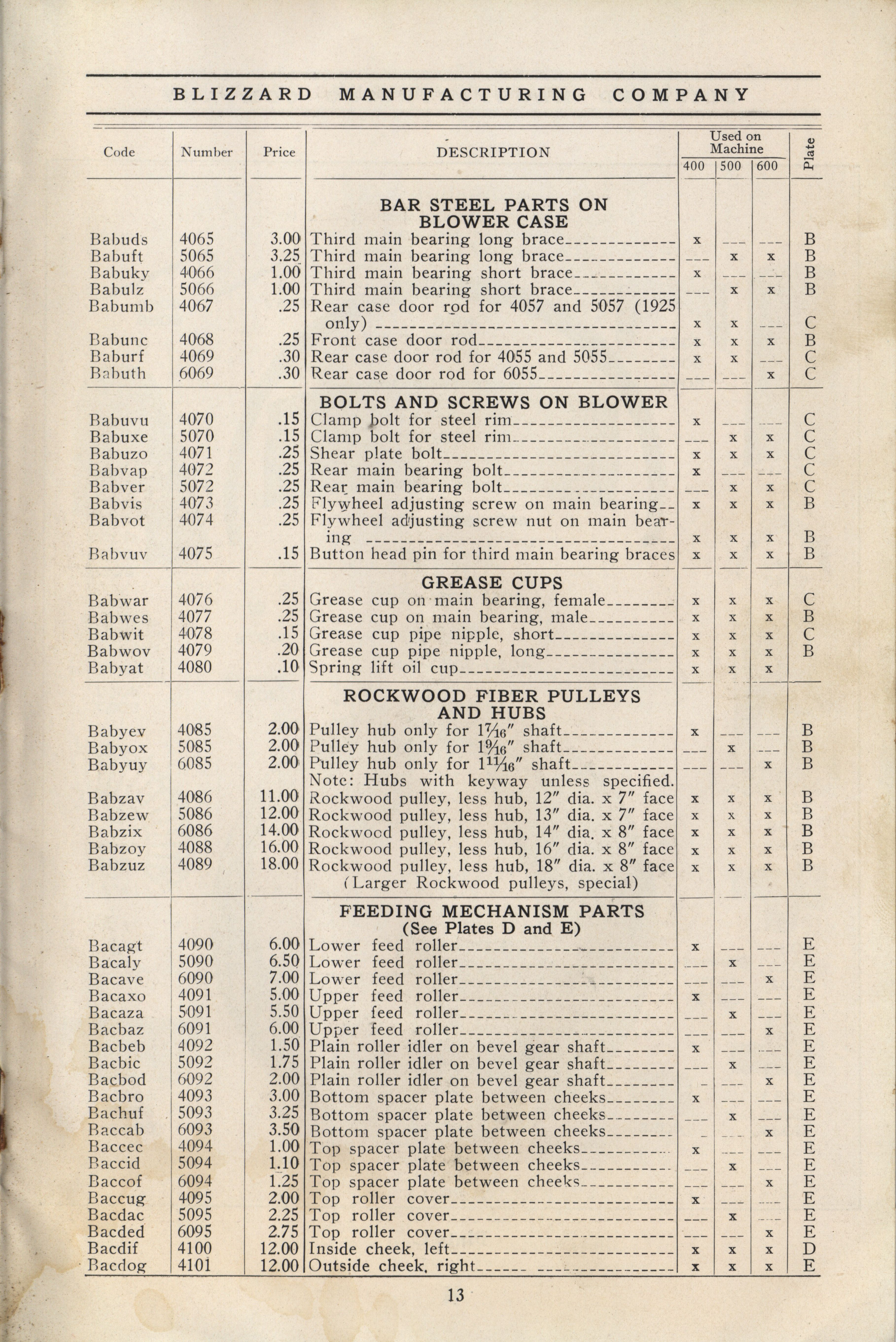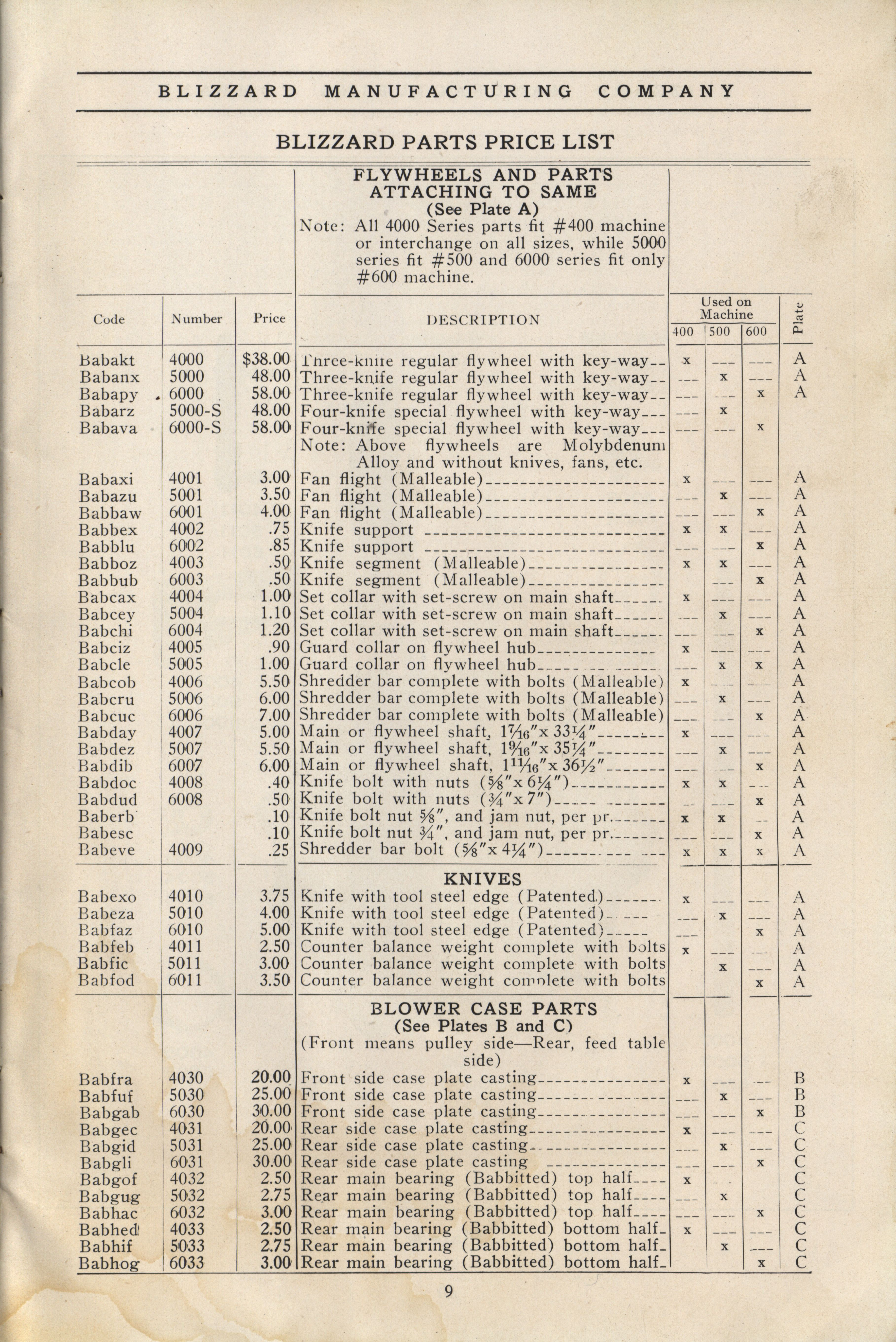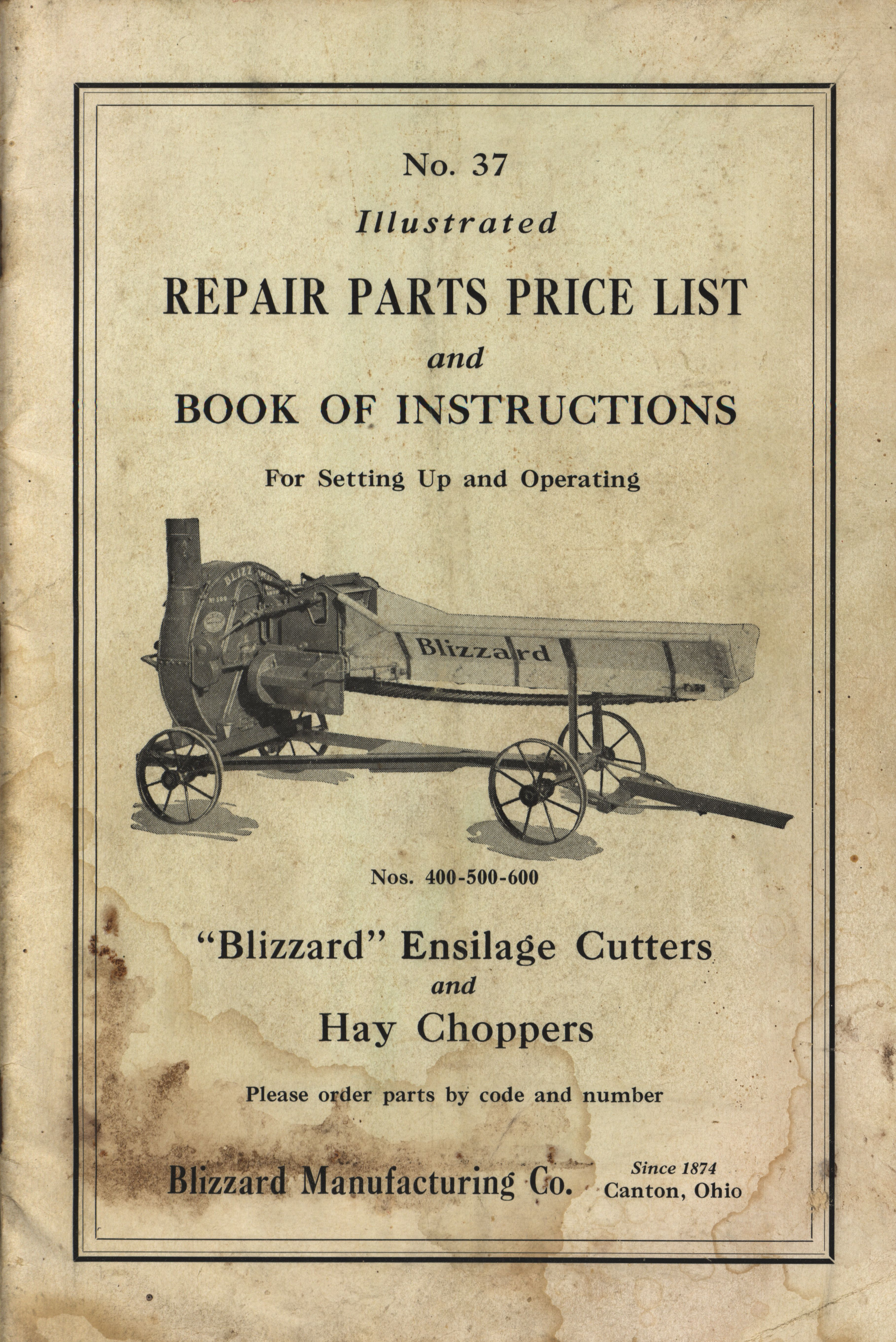 - Illustrated repair parts price list and book of instructions for ensilage cutters and hay choppers from the Blizzard Manufacturing Company.