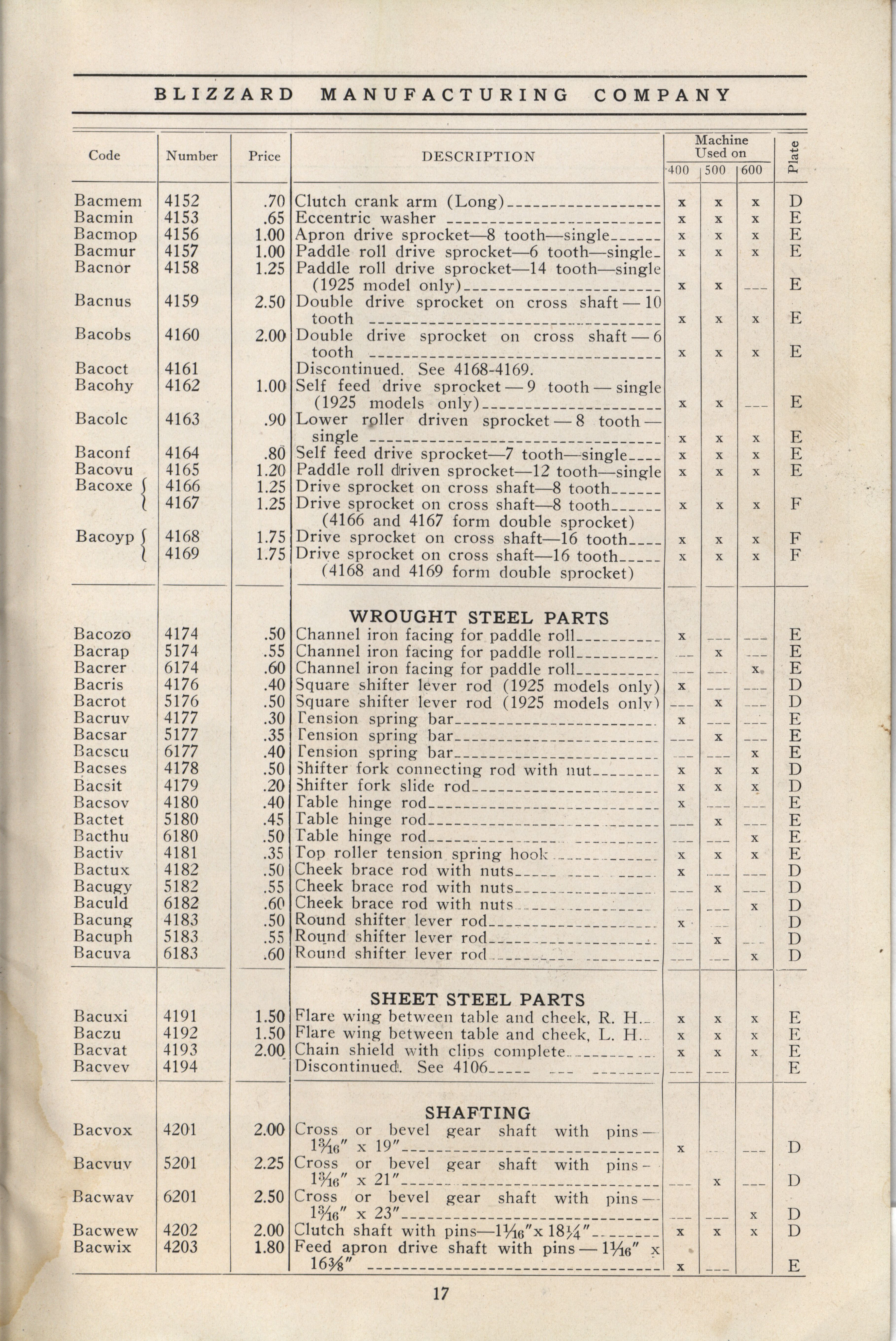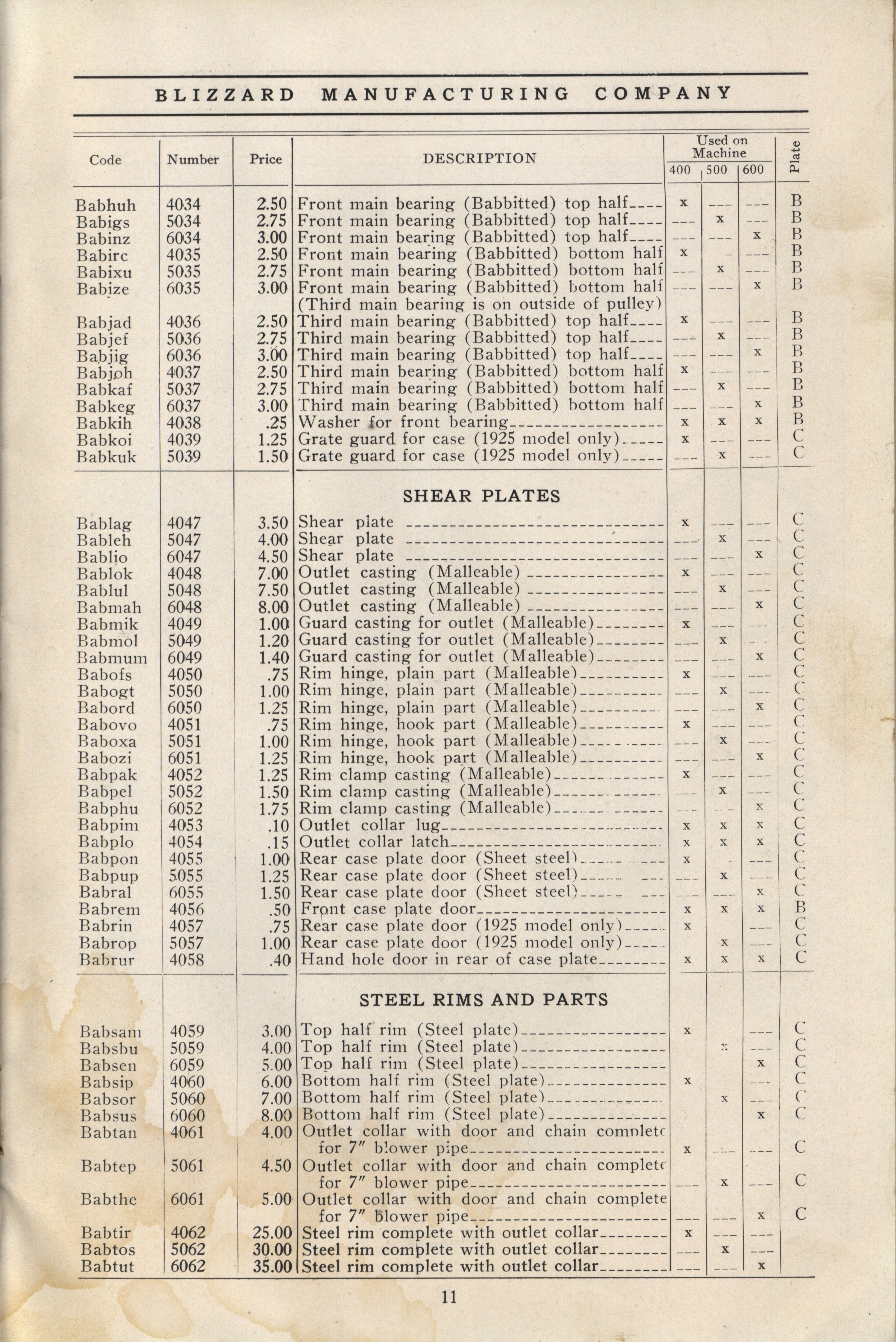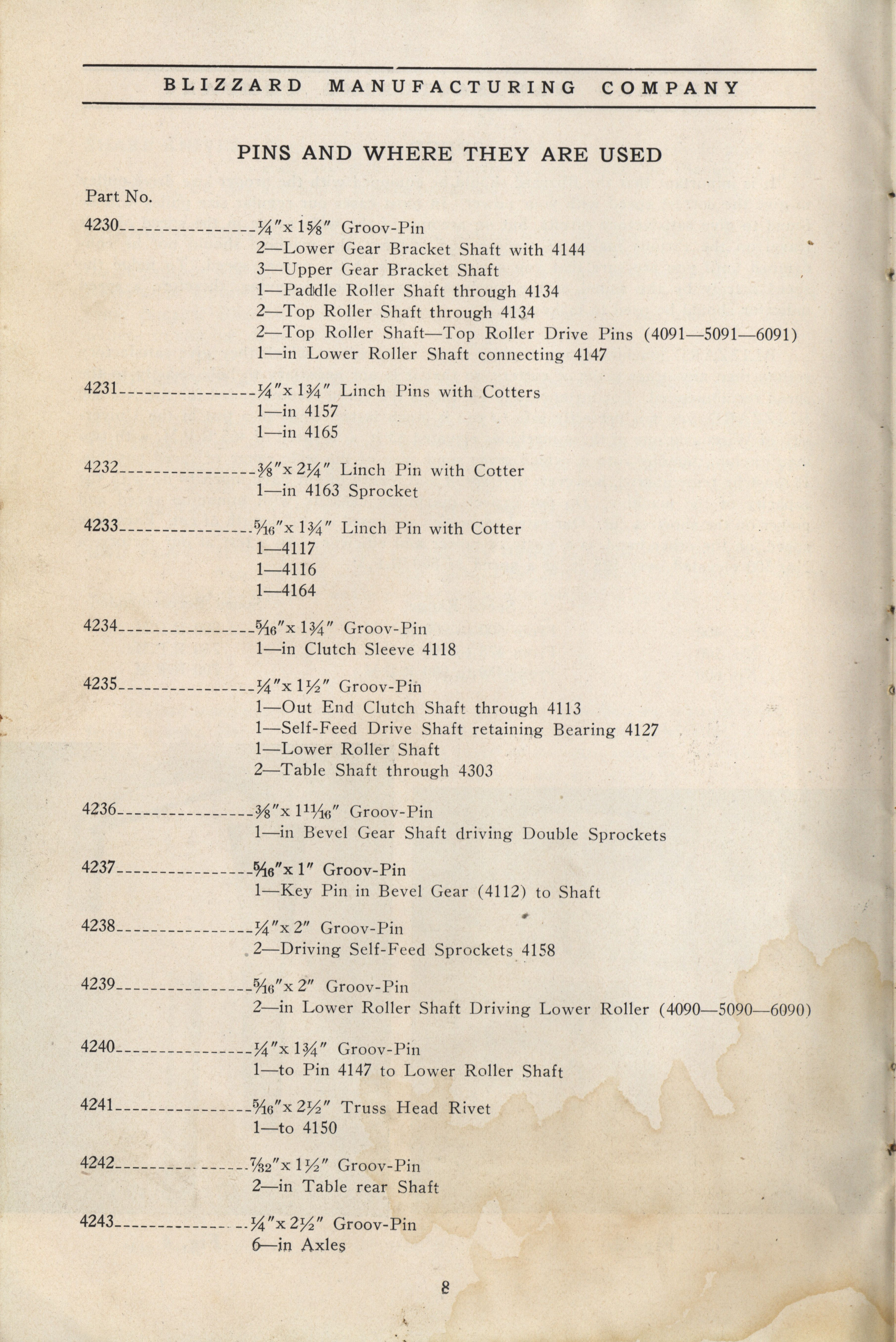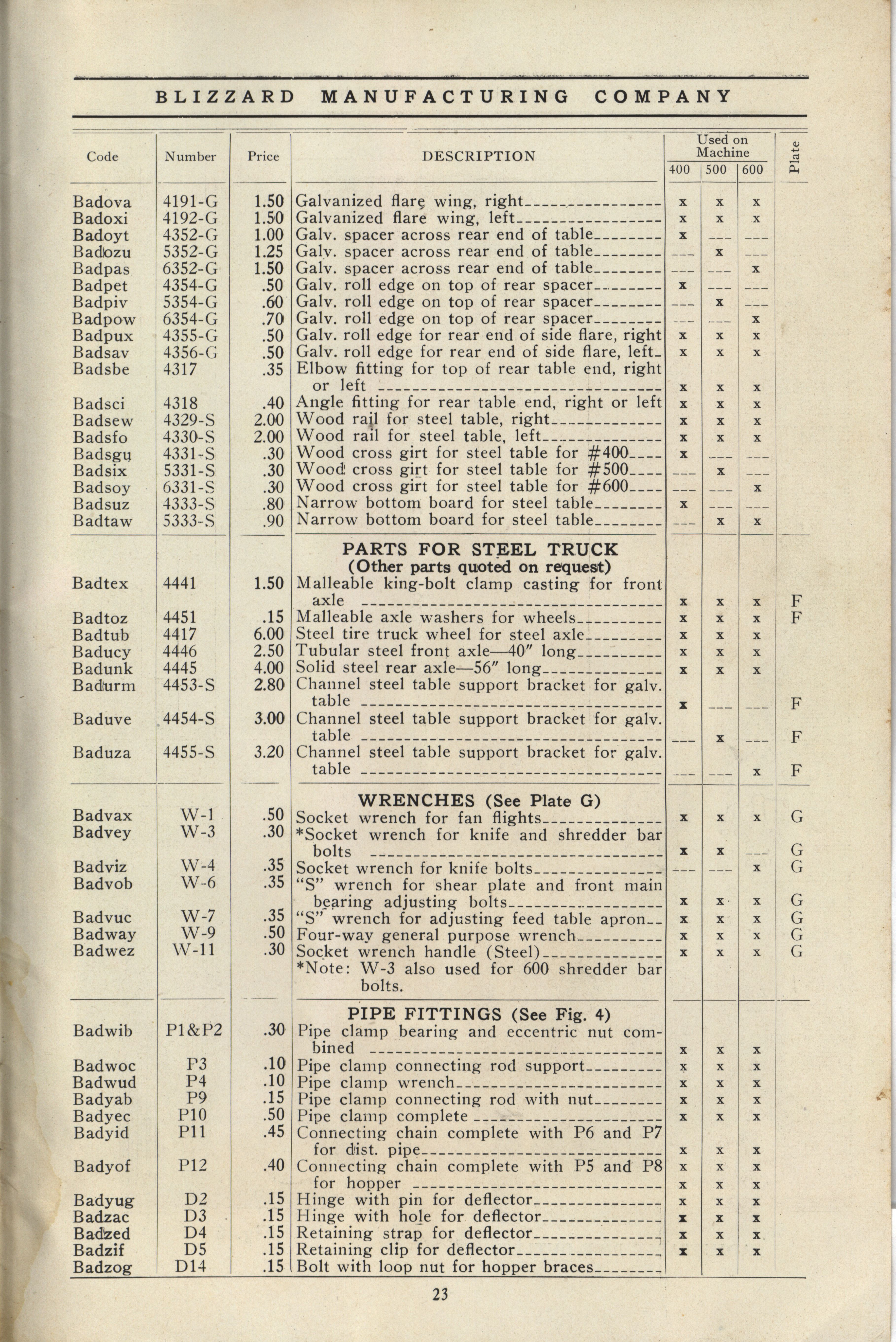 - Illustrated repair parts price list and book of instructions for ensilage cutters and hay choppers from the Blizzard Manufacturing Company.