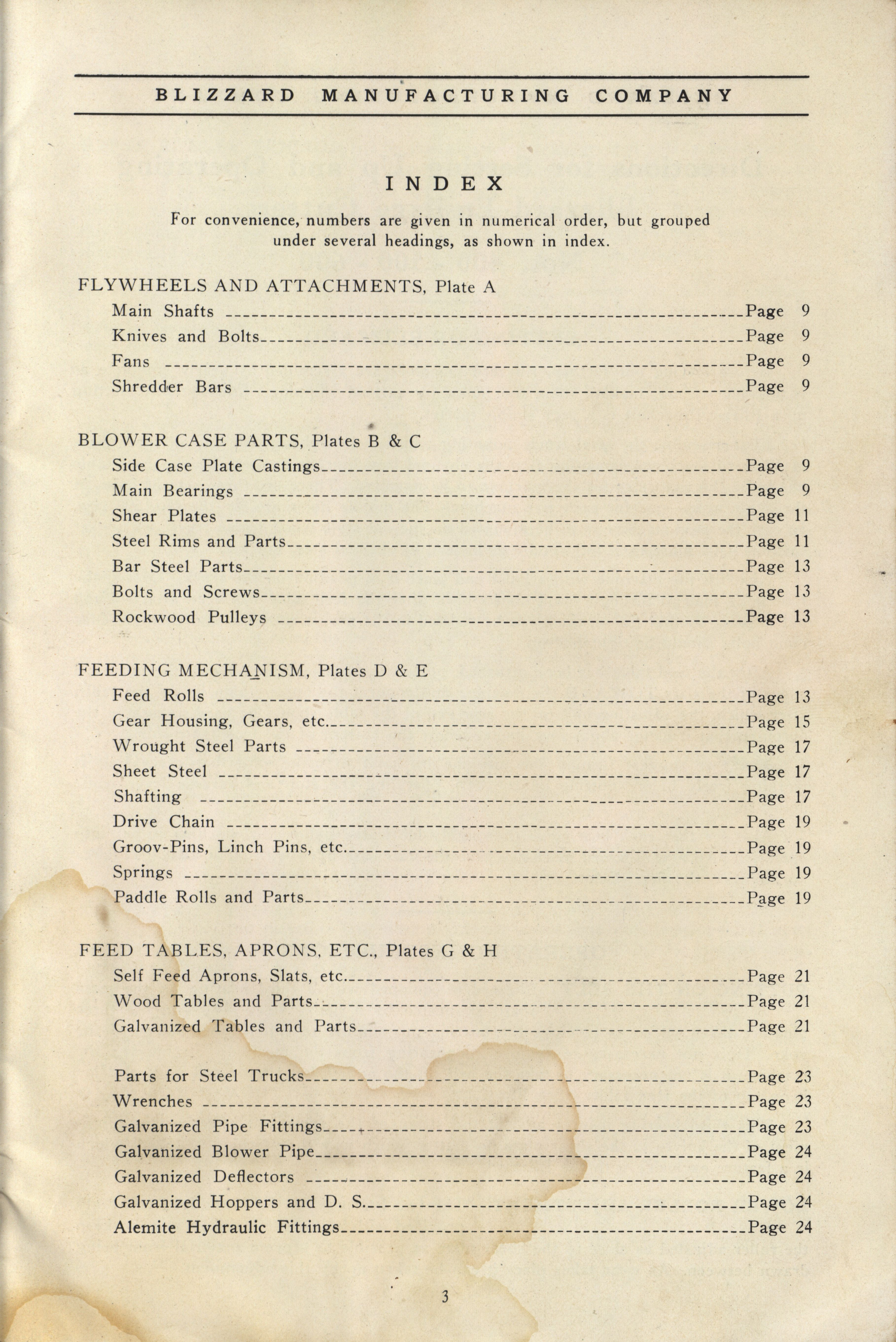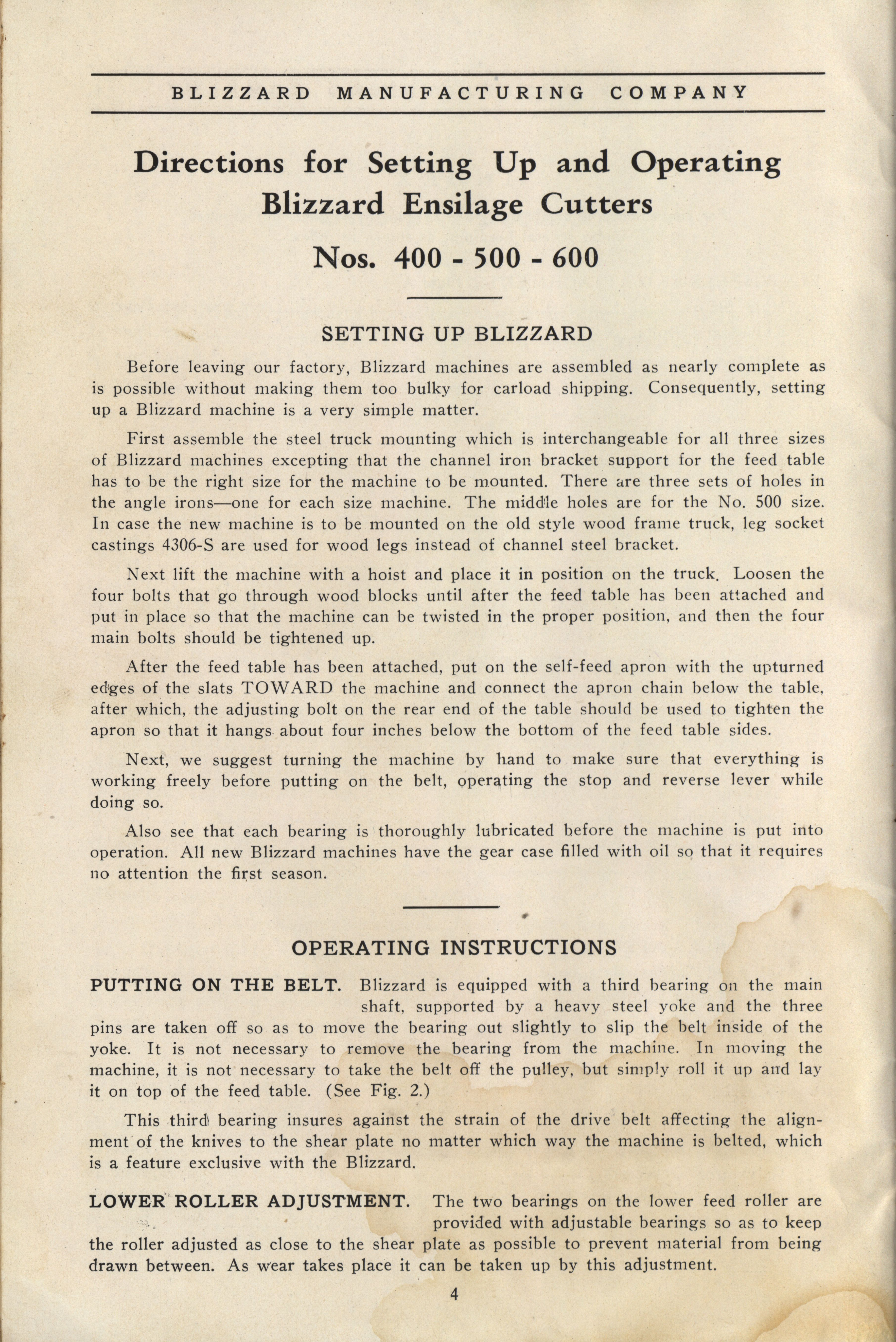 - Illustrated repair parts price list and book of instructions for setting up and operating "Blizzard" ensilage cutters and hay choppers