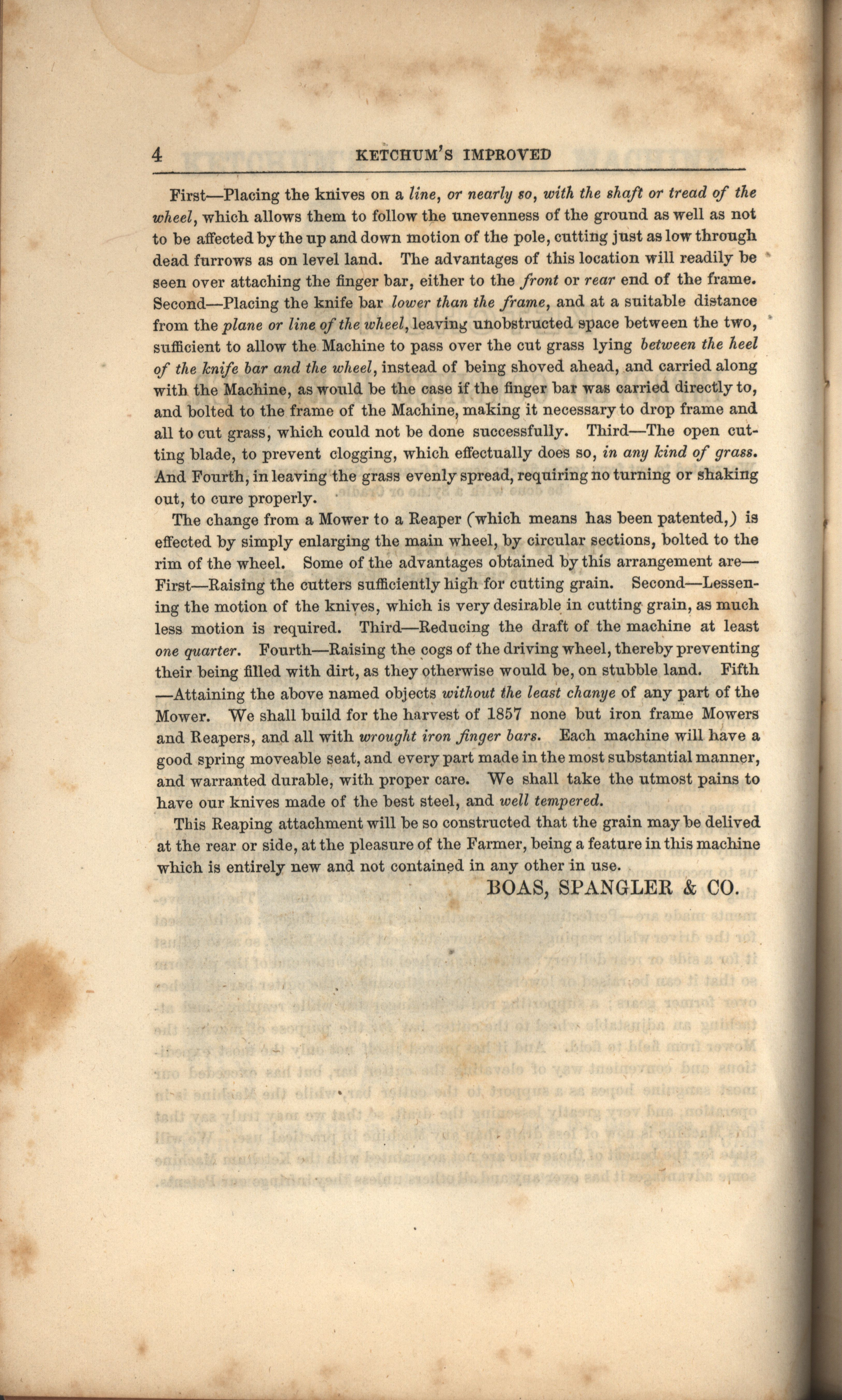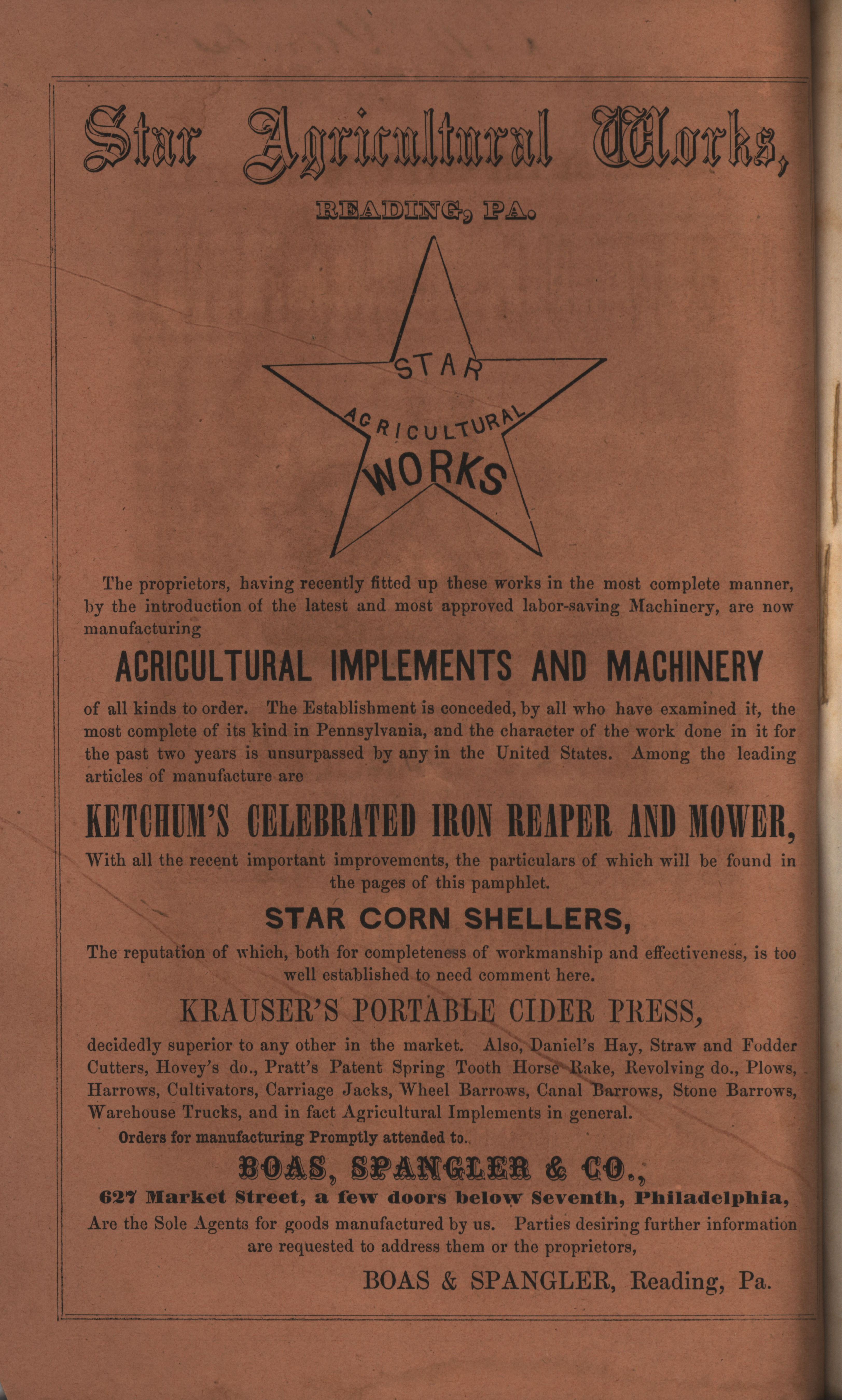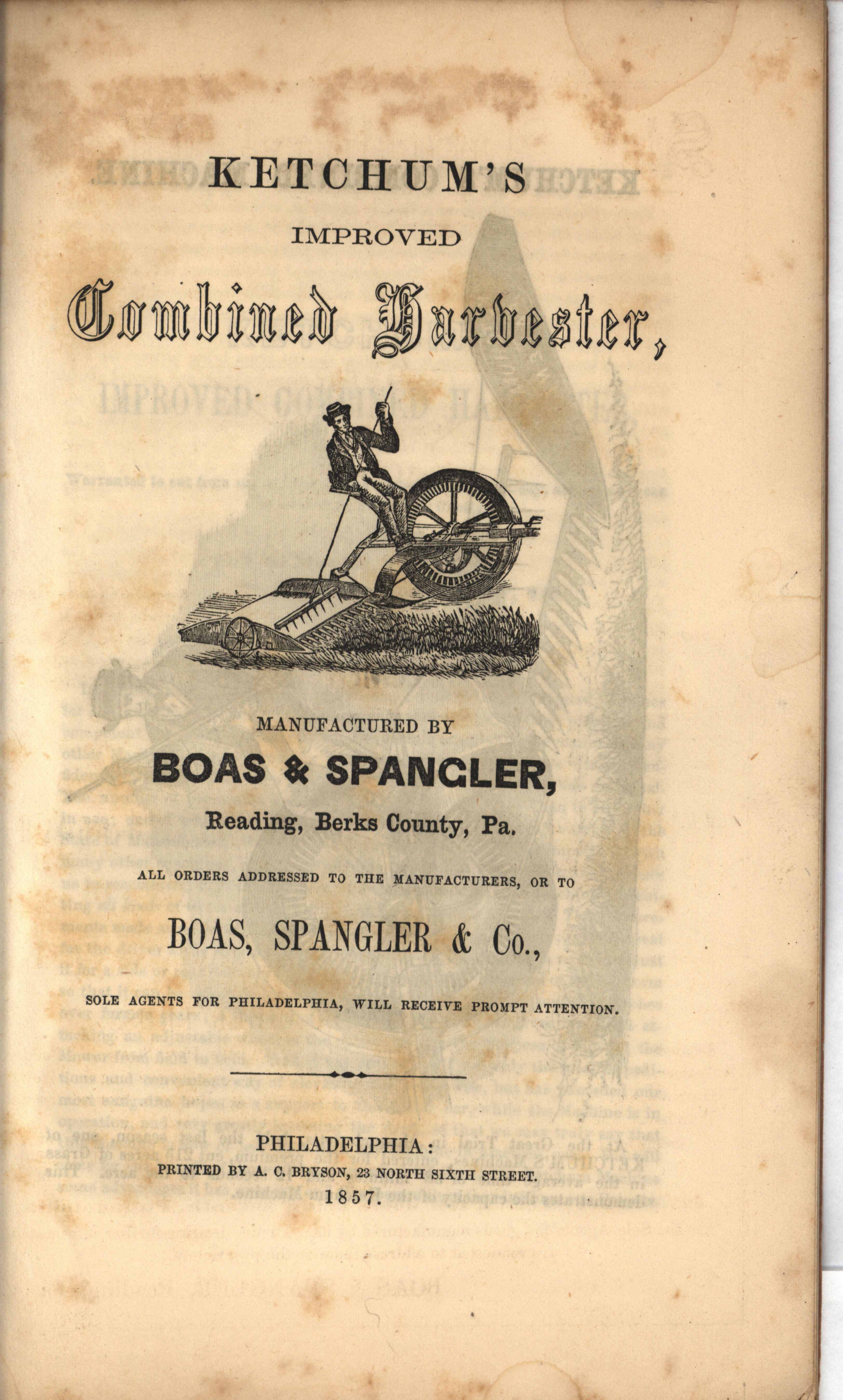 - "Ketchum's Celebrated Mowing Machine, and Combined Mower and Reaper Manufactured by Boas & Spangler catalog", Agricultural Machinery Literature Collection, Iowa State University Library Digital Collections