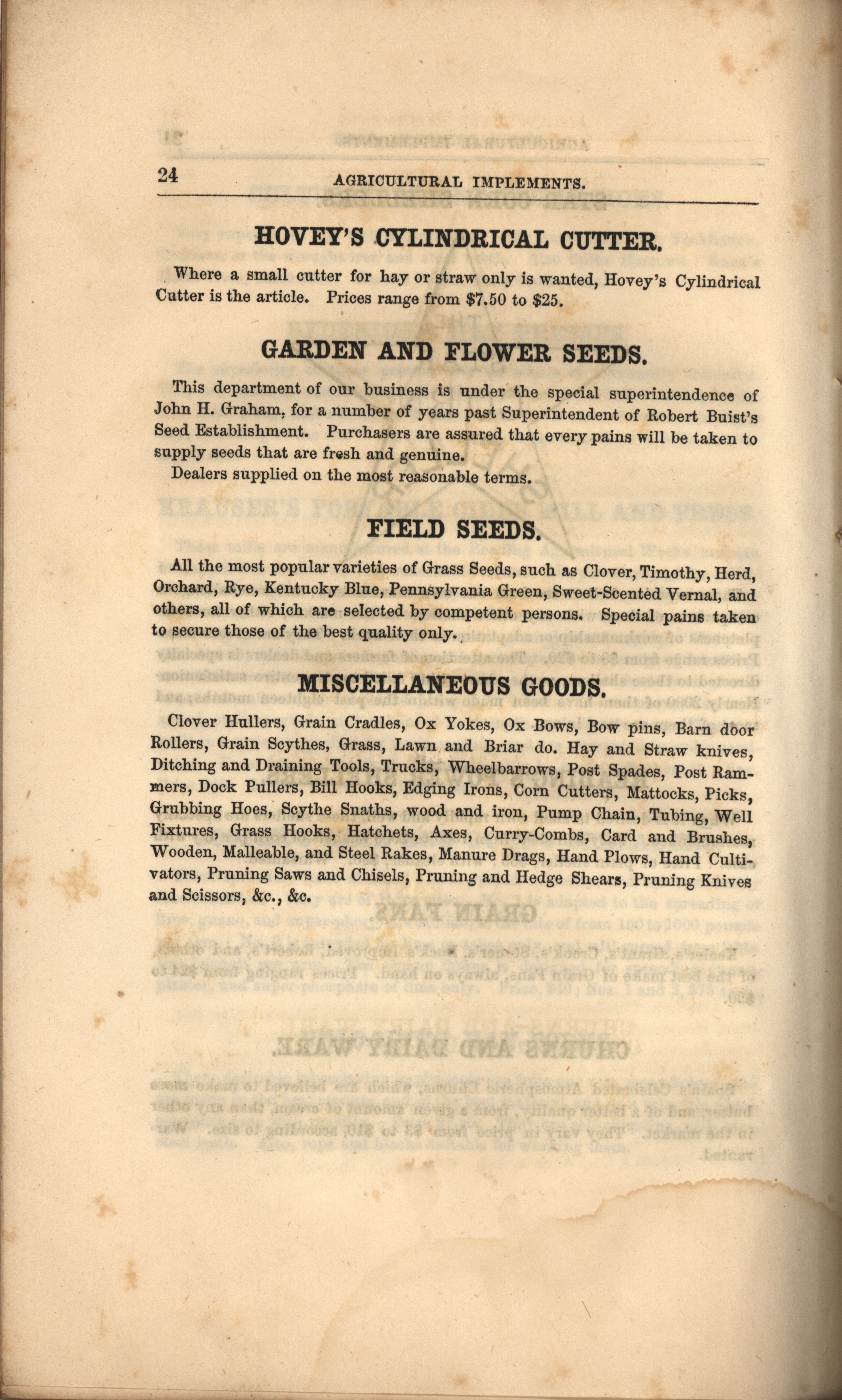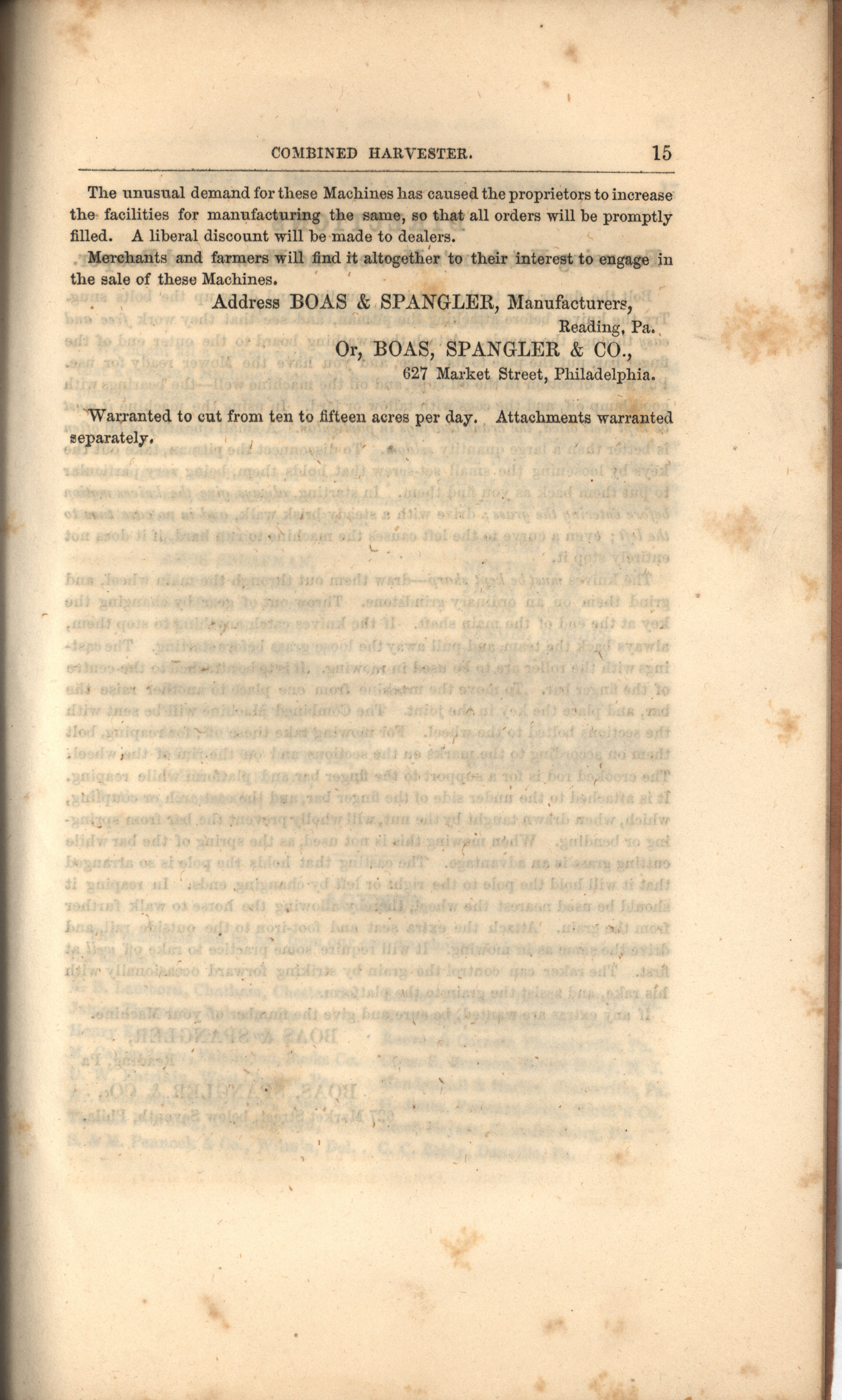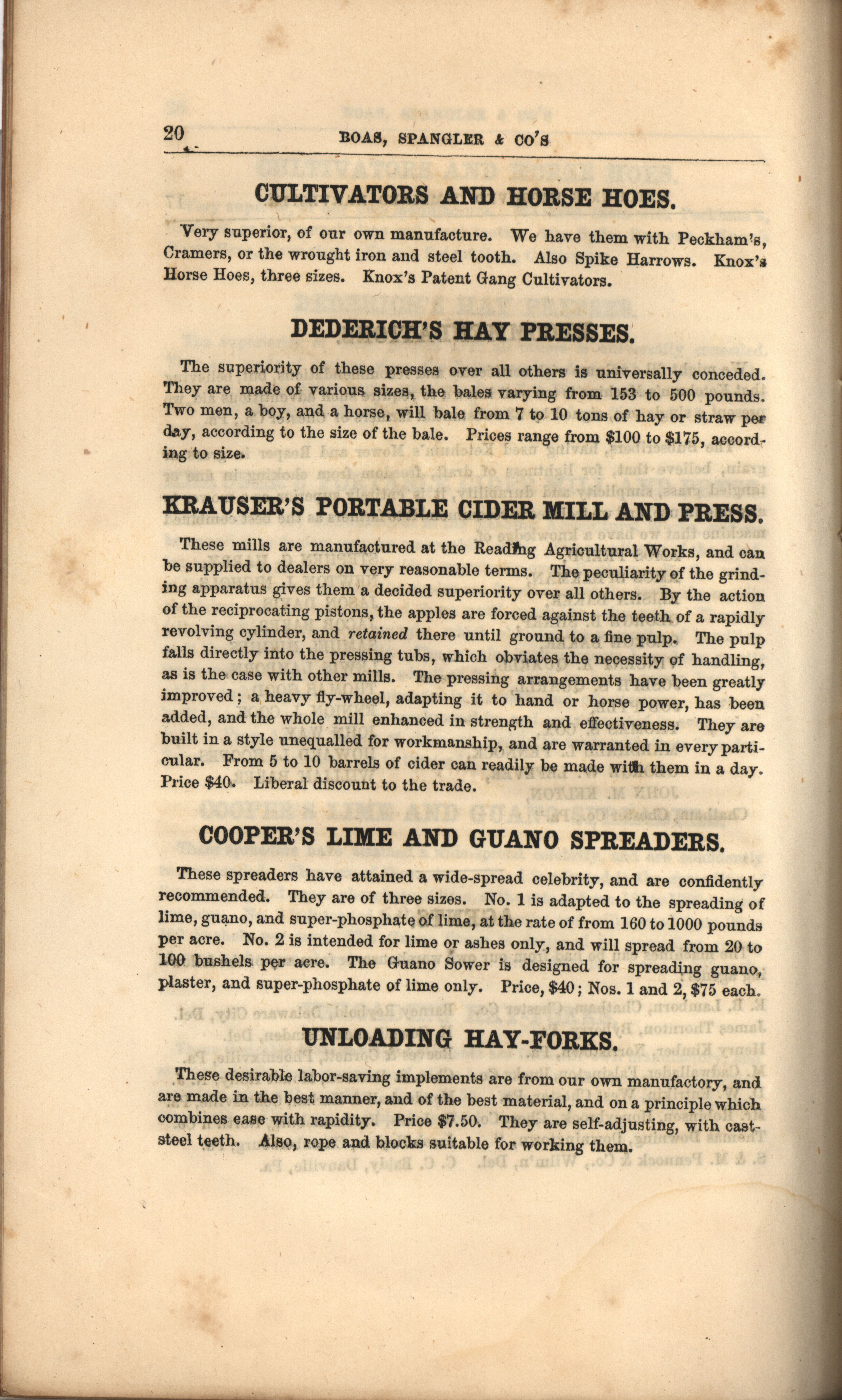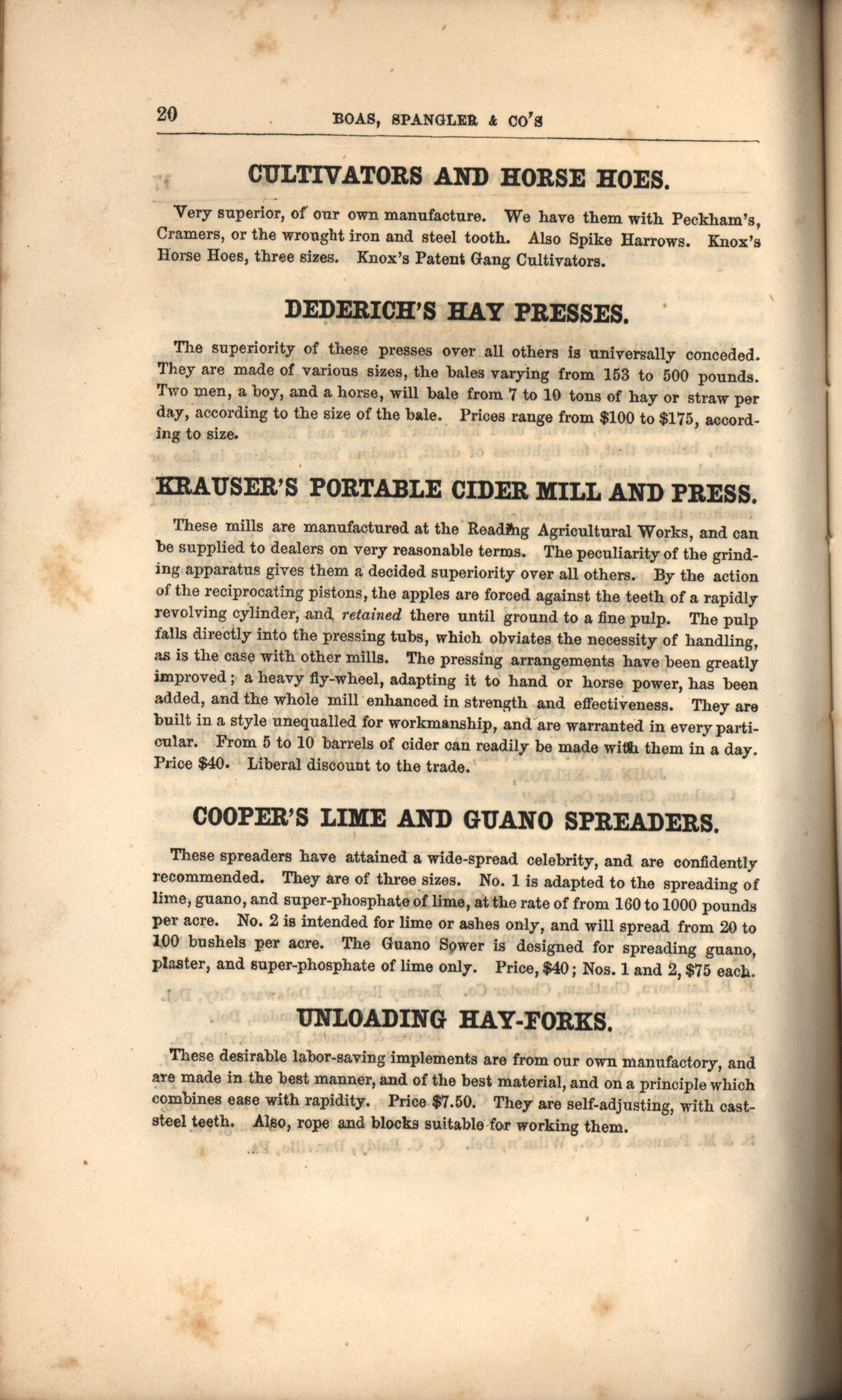 - Illustrated catalog describing mowing machines and related products offered by the Boss, Spangler and Company in 1857.