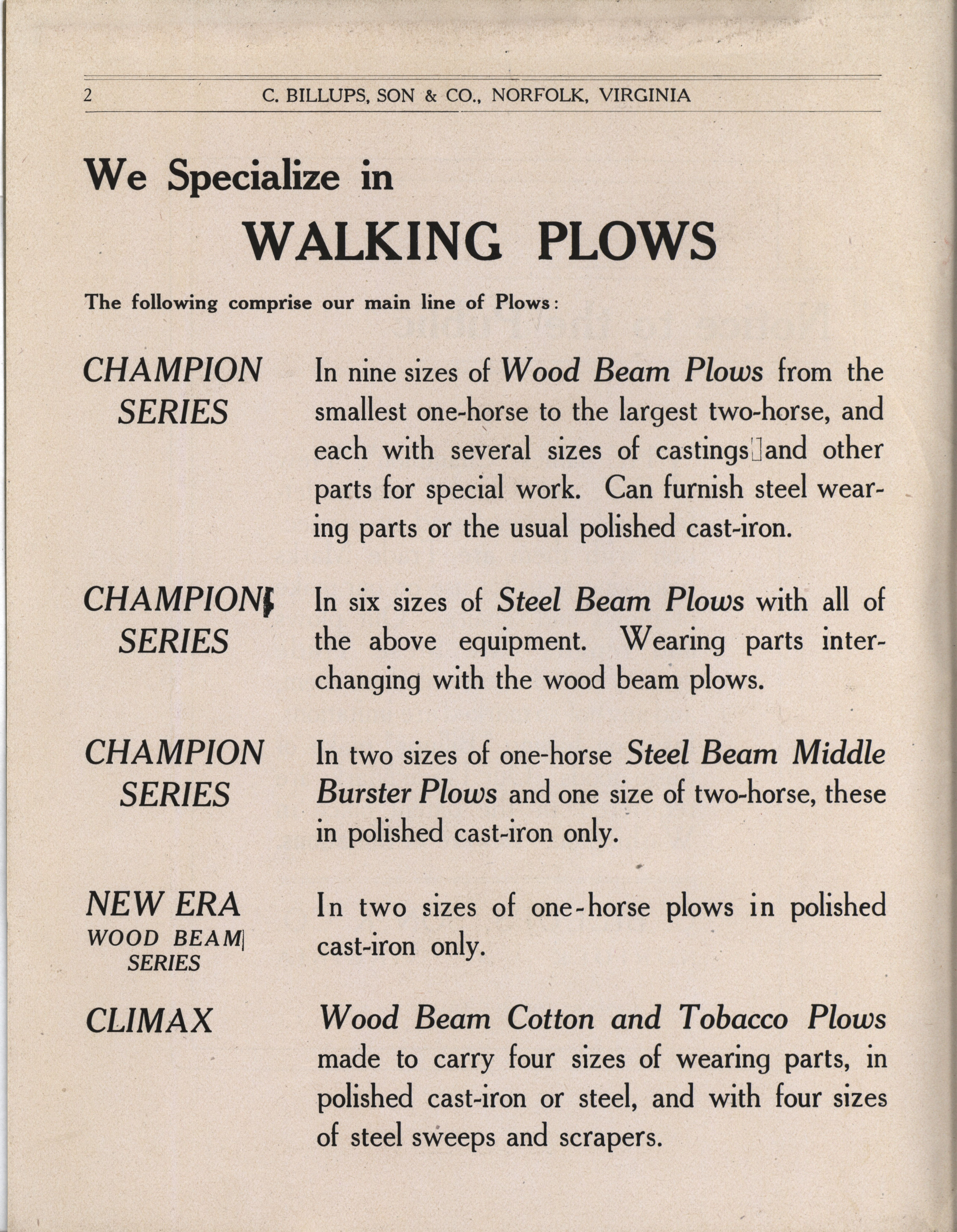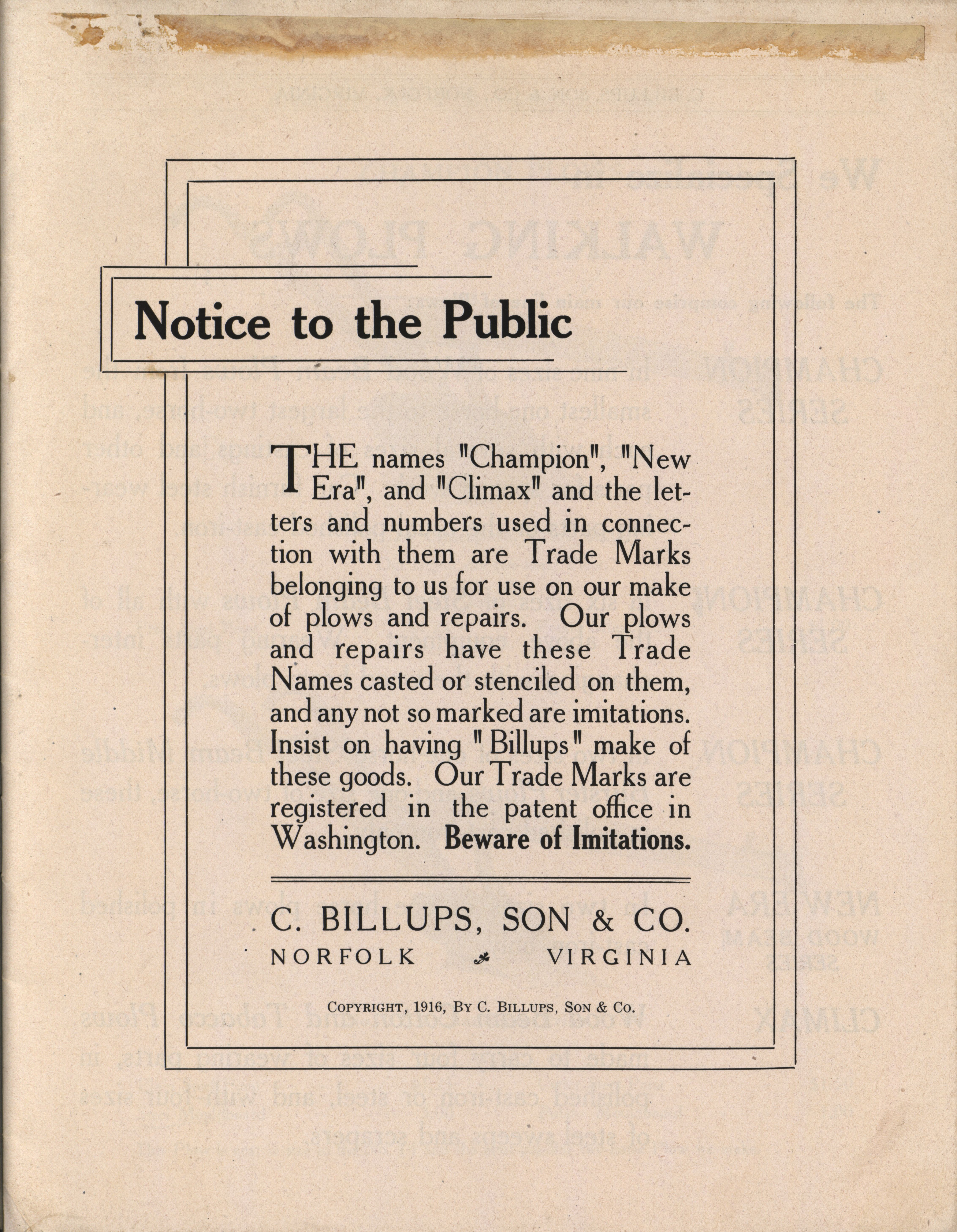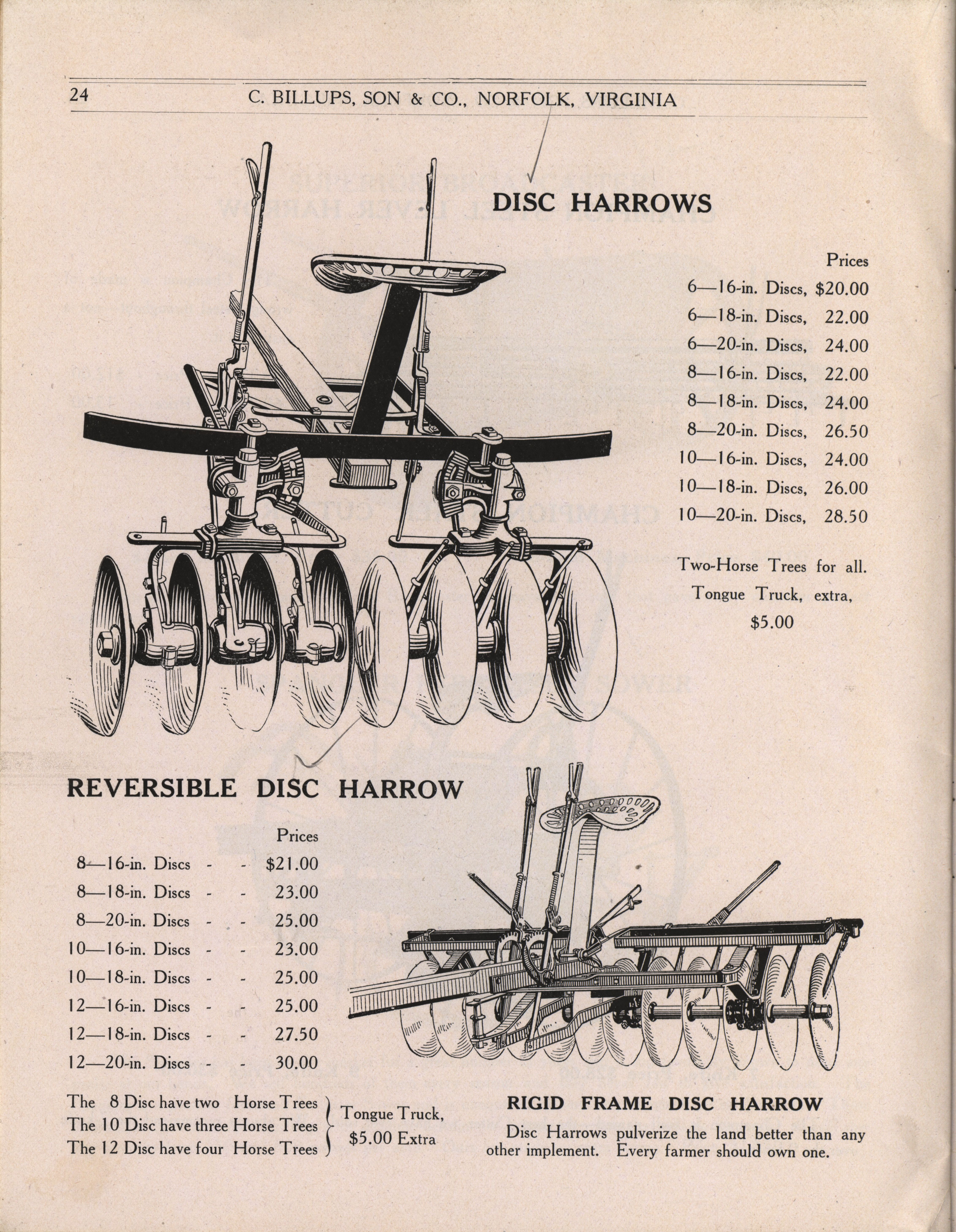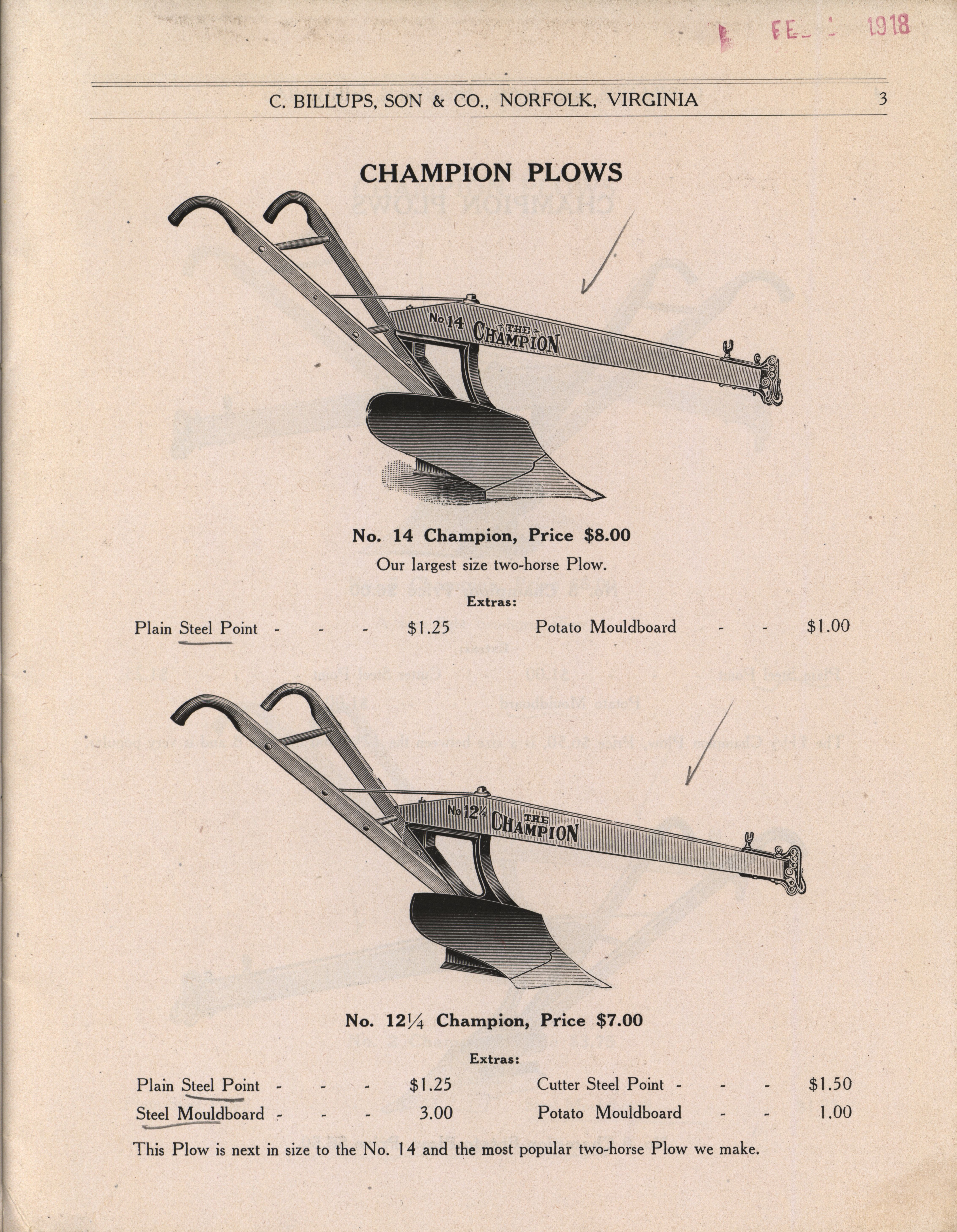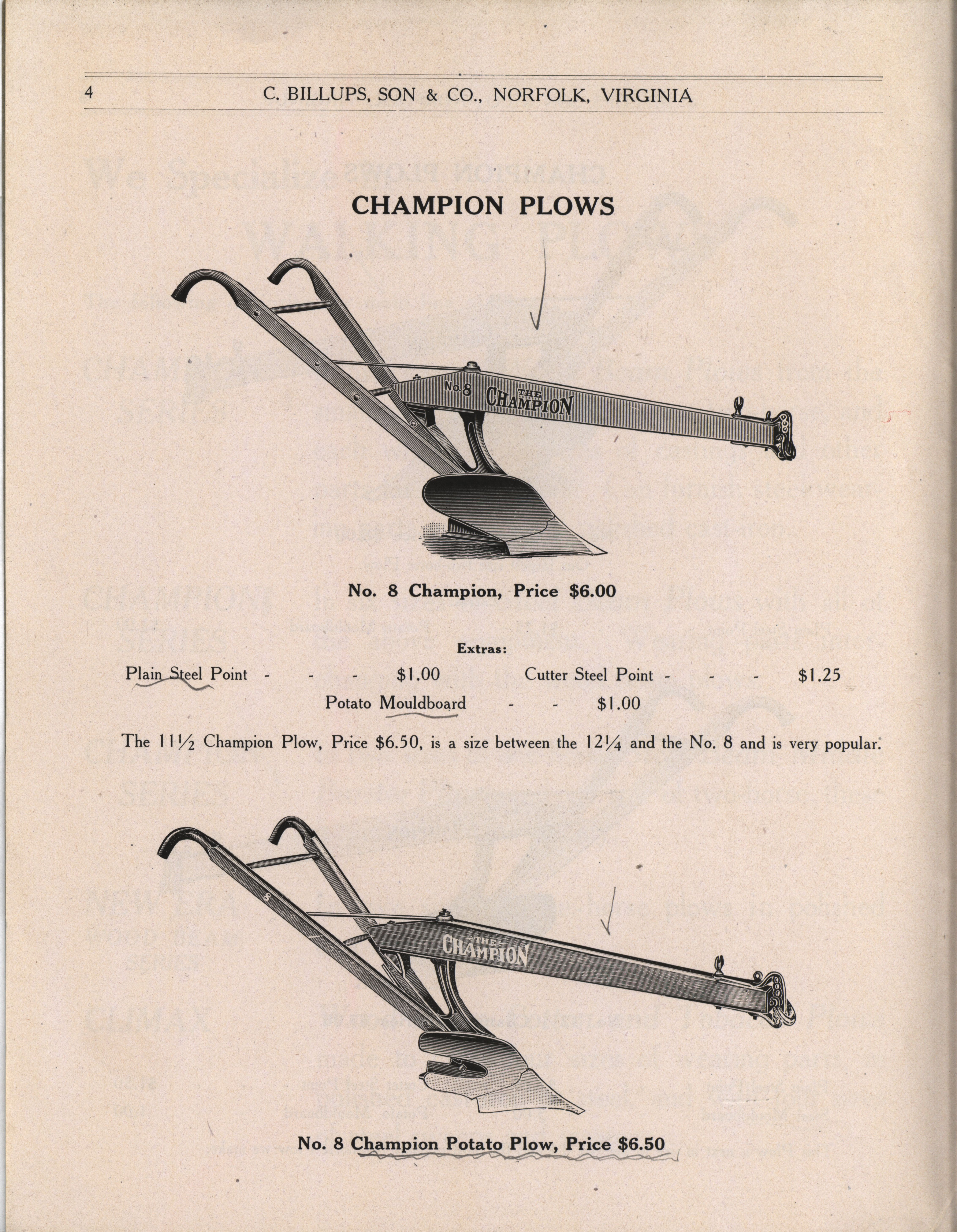 - "Manufactures of plows jobbers of farming implements & machinery C. Billups, Son & Co. catalog", Agricultural Machinery Literature Collection, Iowa State University Library Digital Collections