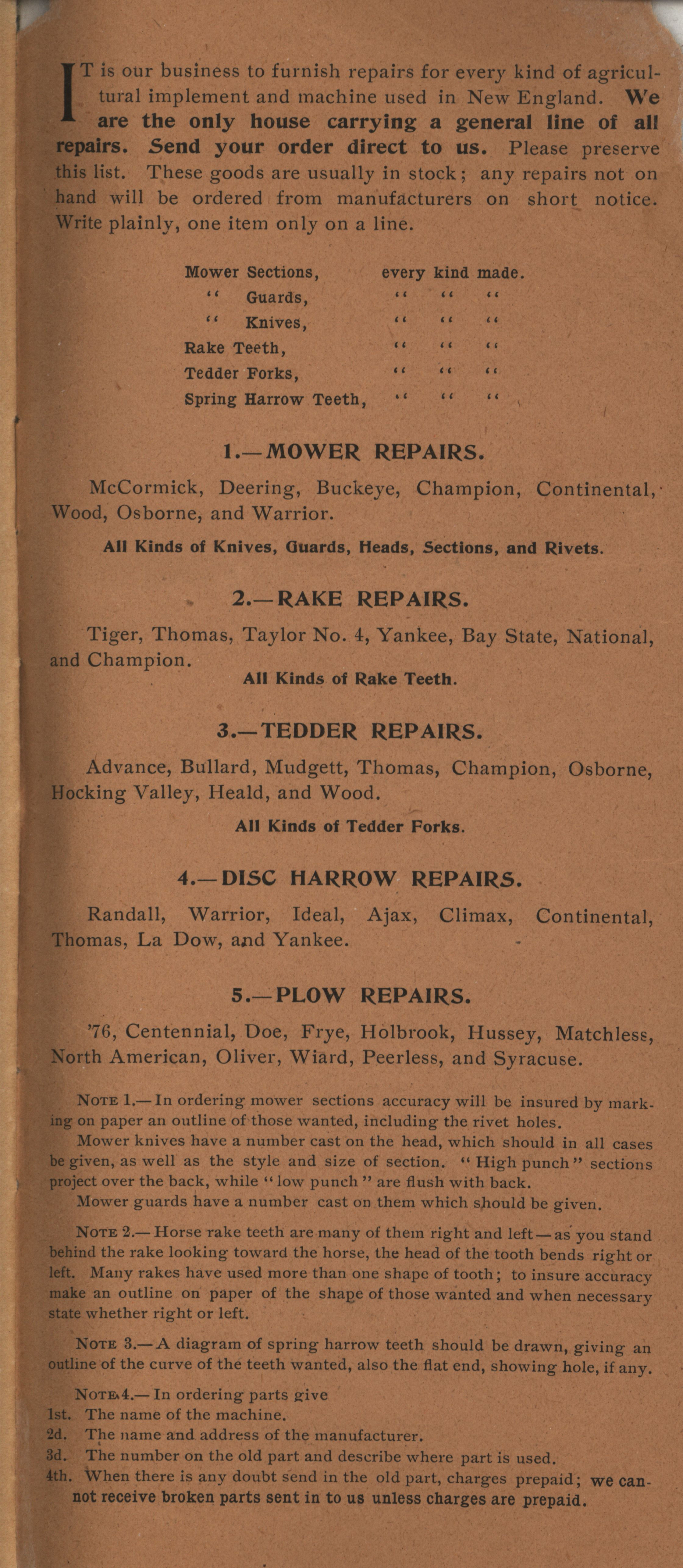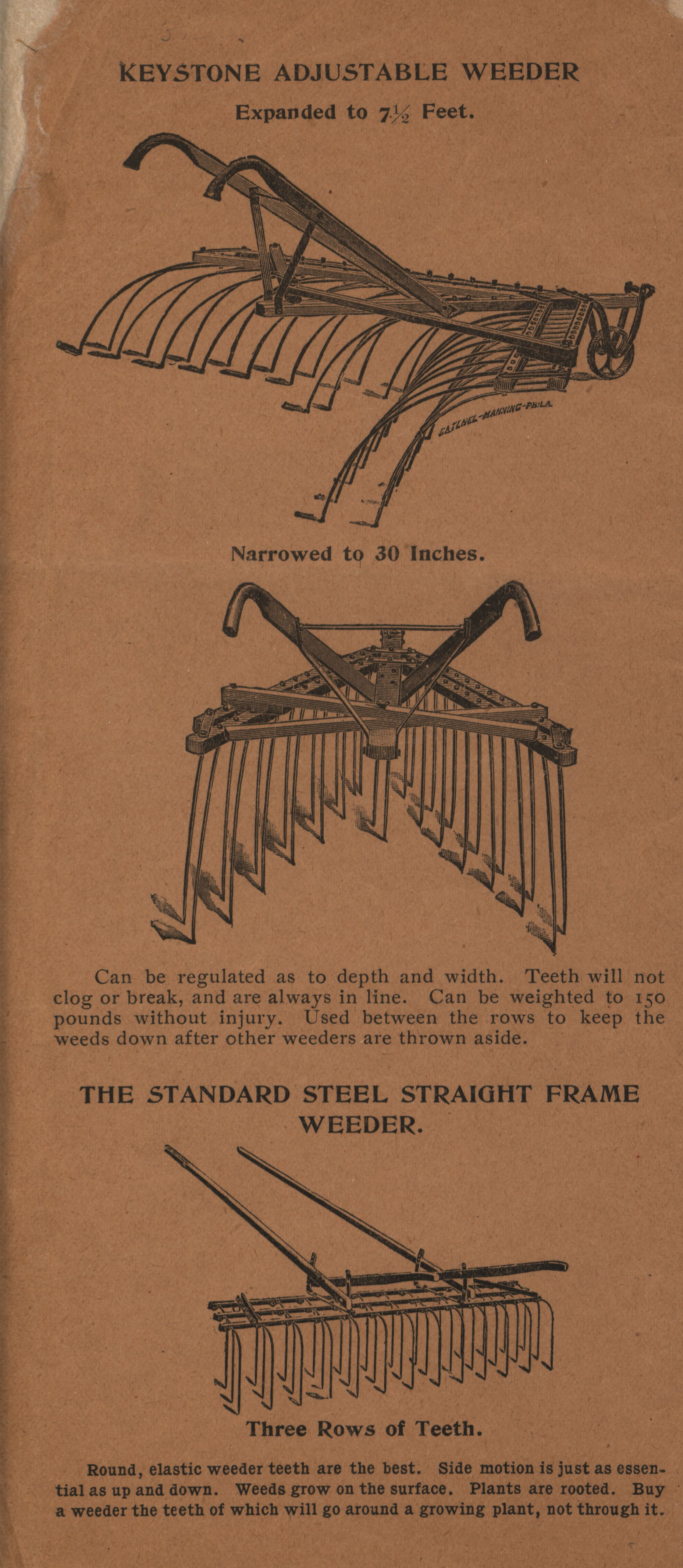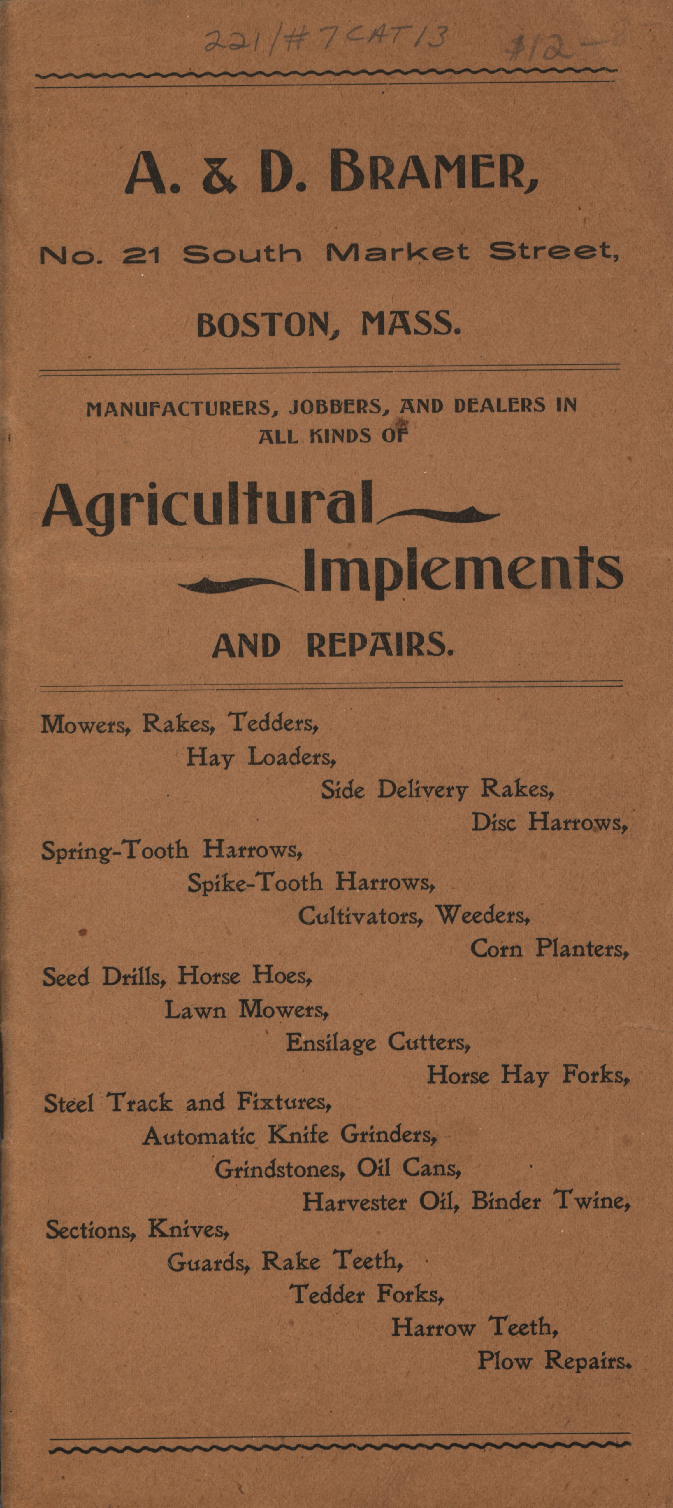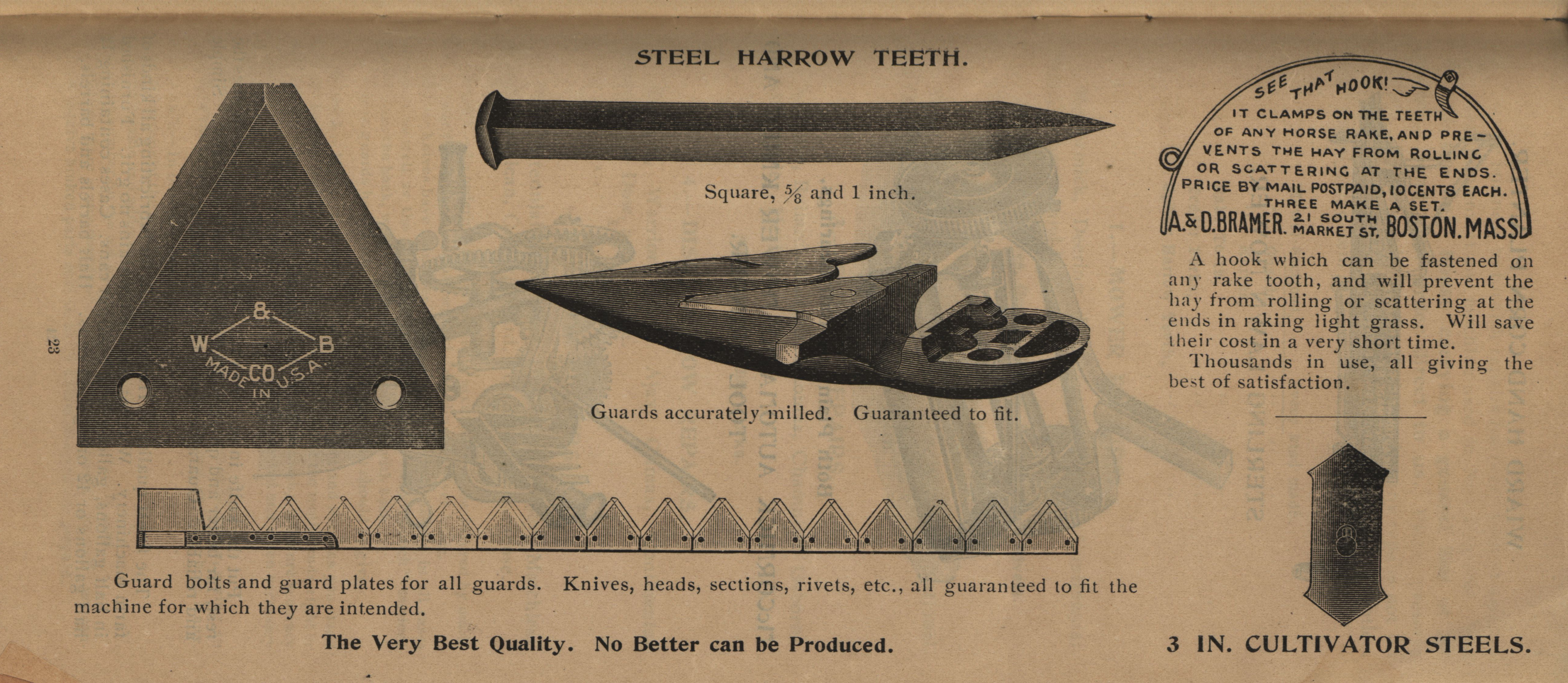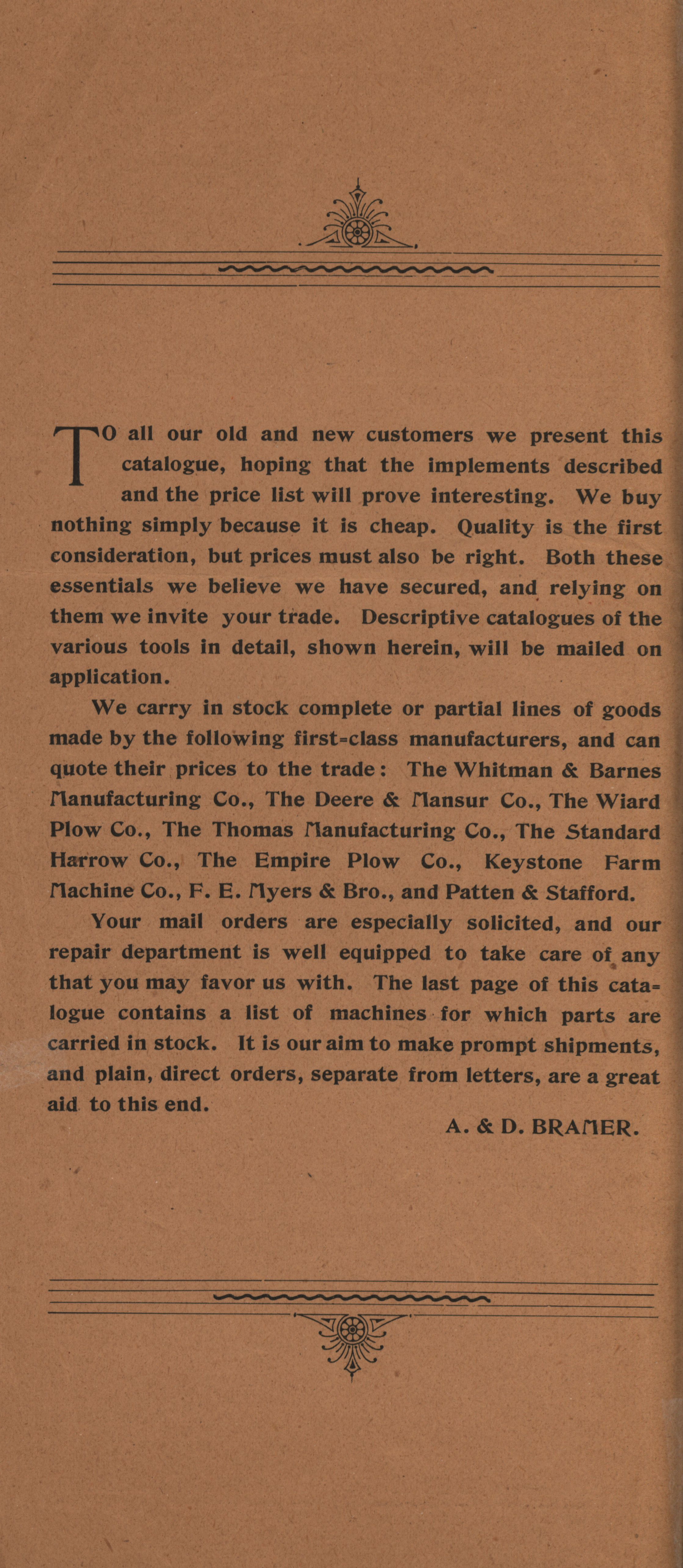 - Catalog describing the agricultural implements and repair products offered by A. and D. Bramer, includes illustrations.