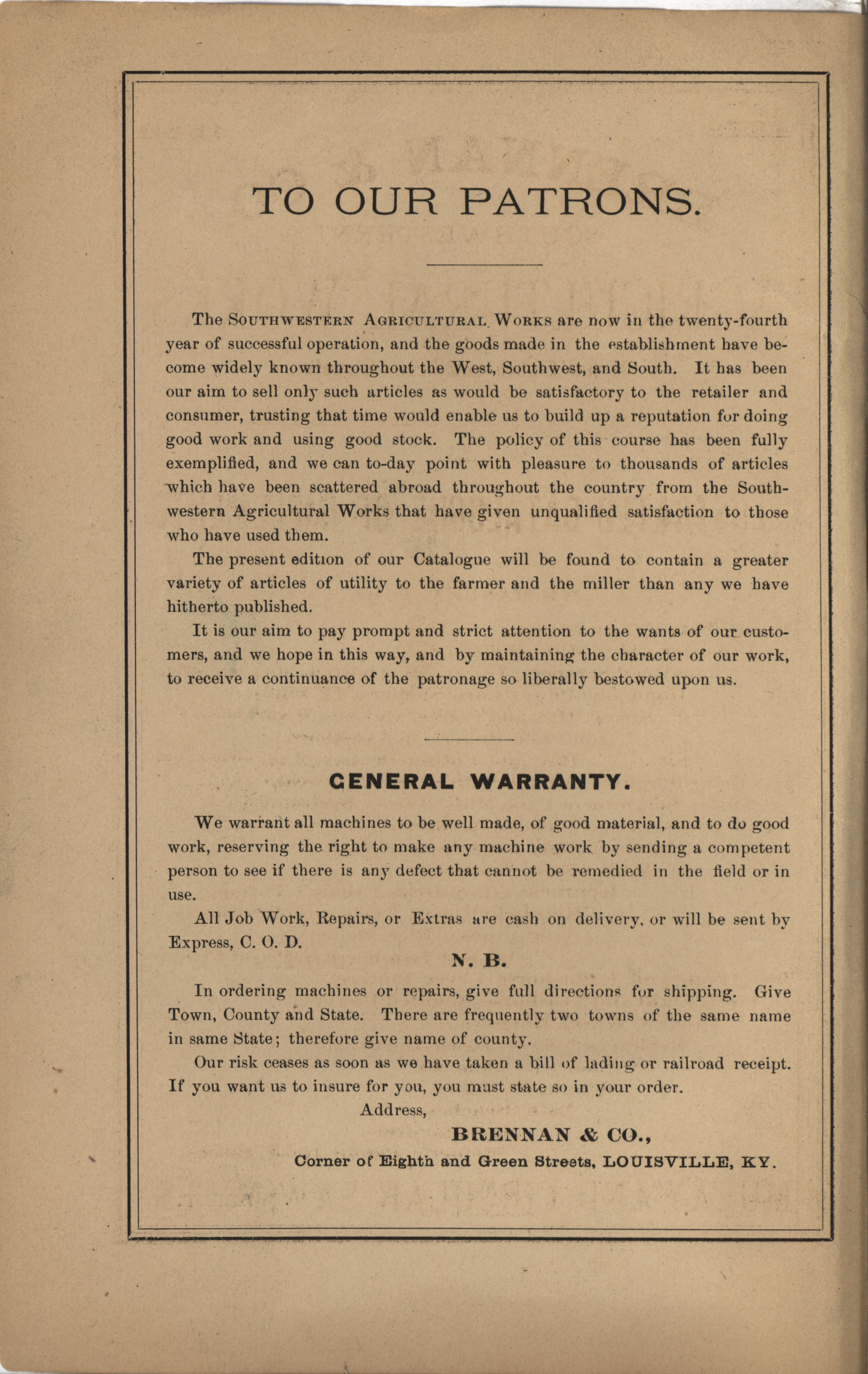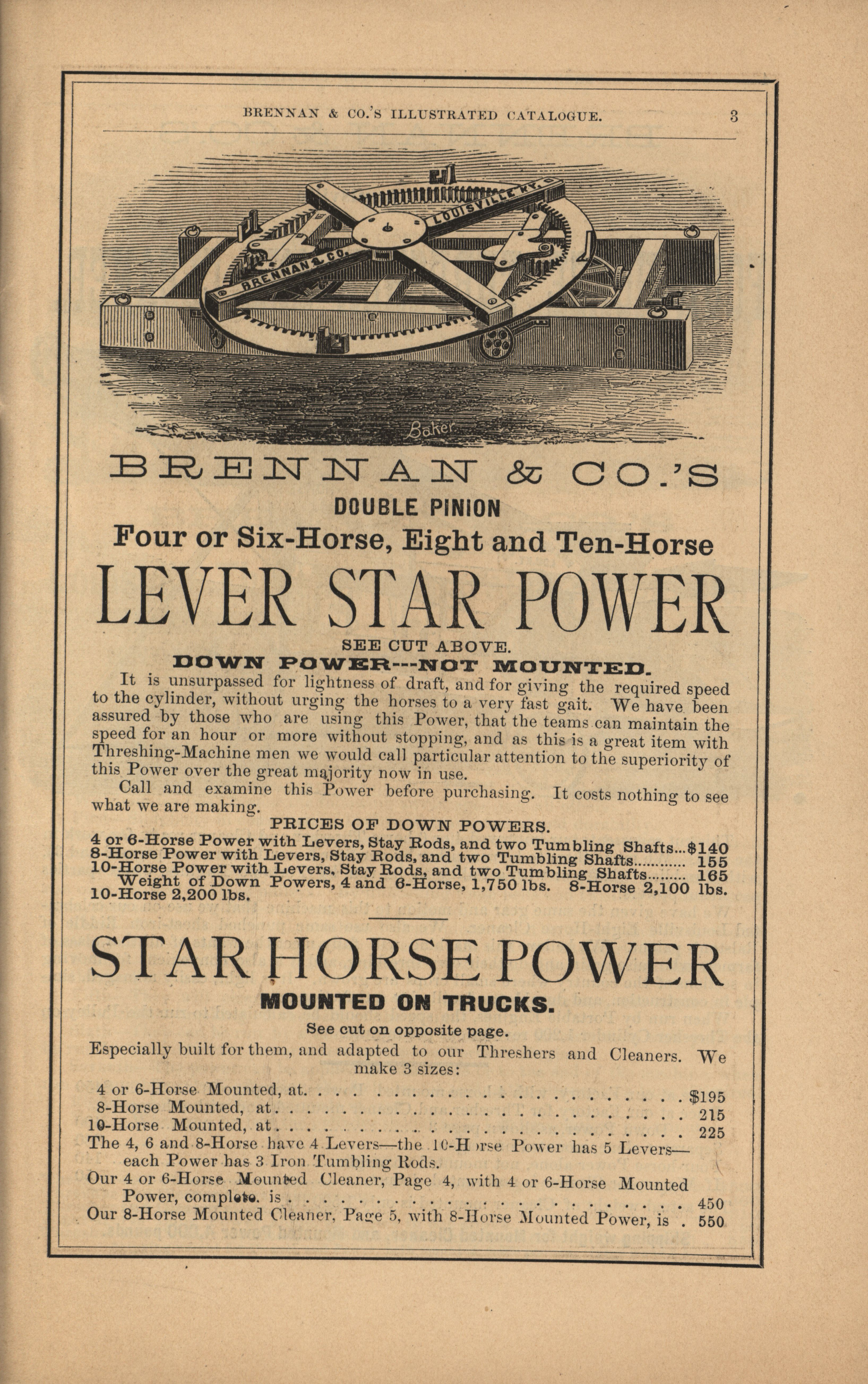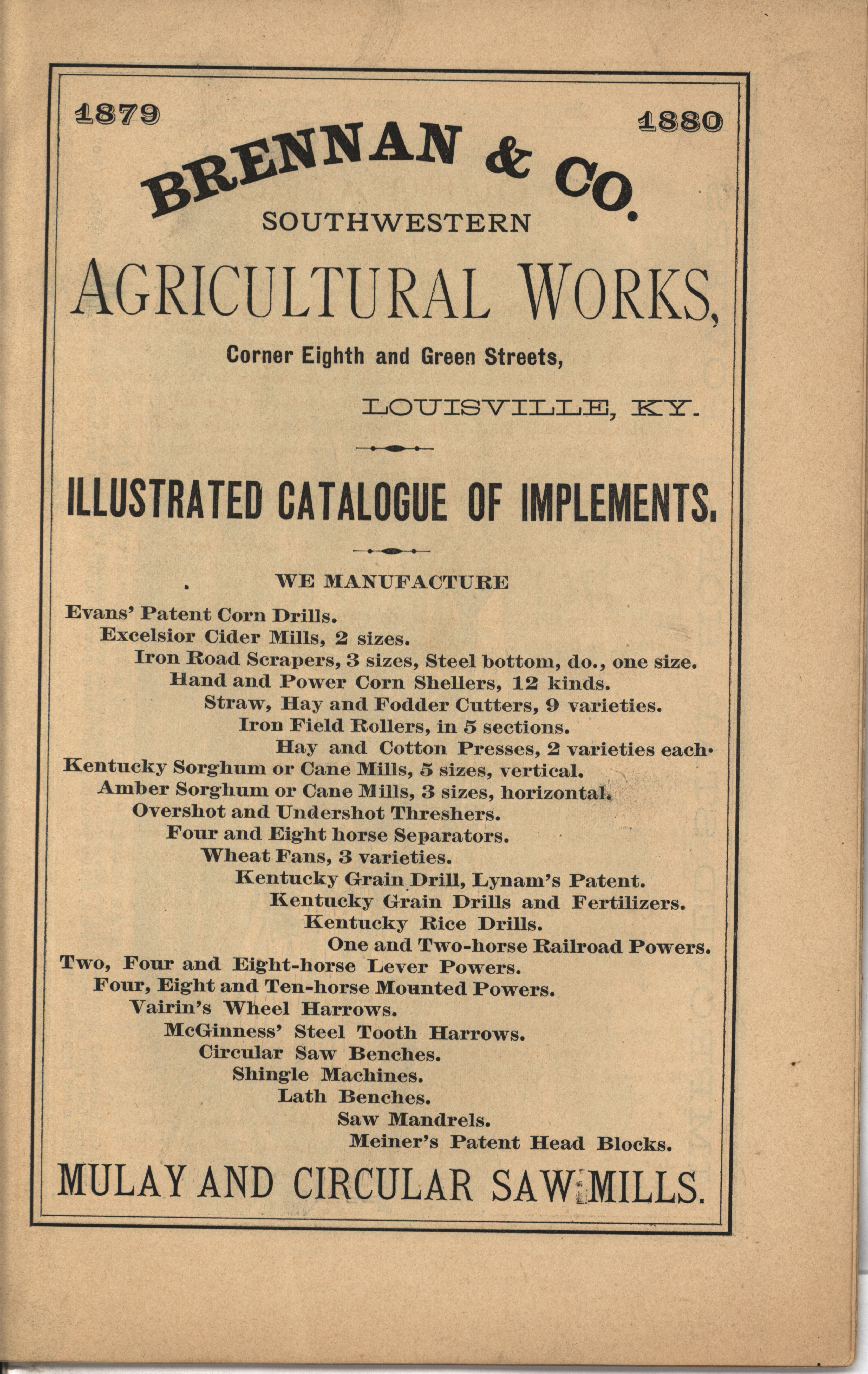 - Illustrated catalog describing the agricultural products offered by Brennan and Company Southwestern Agricultural Works from 1879-1880.