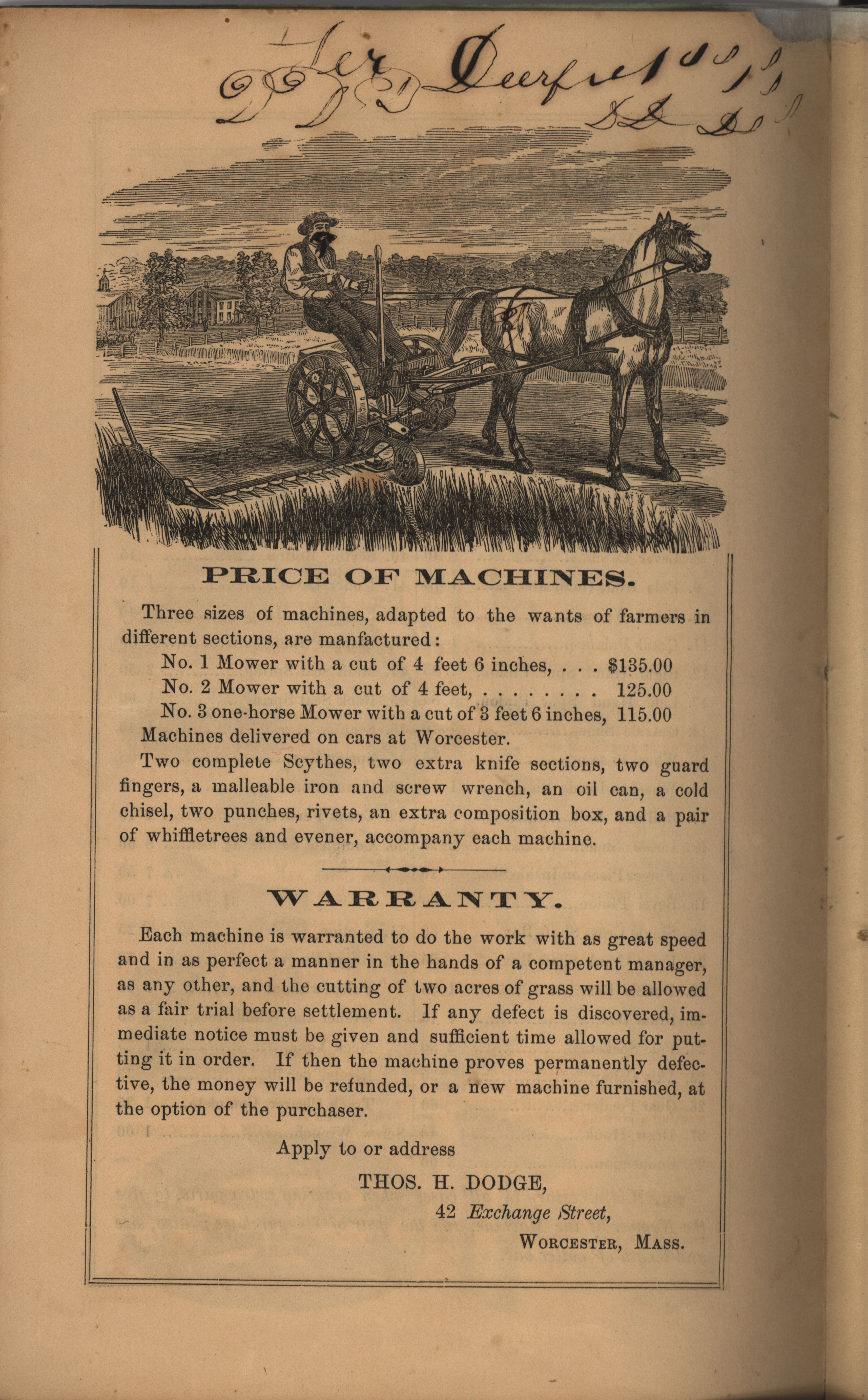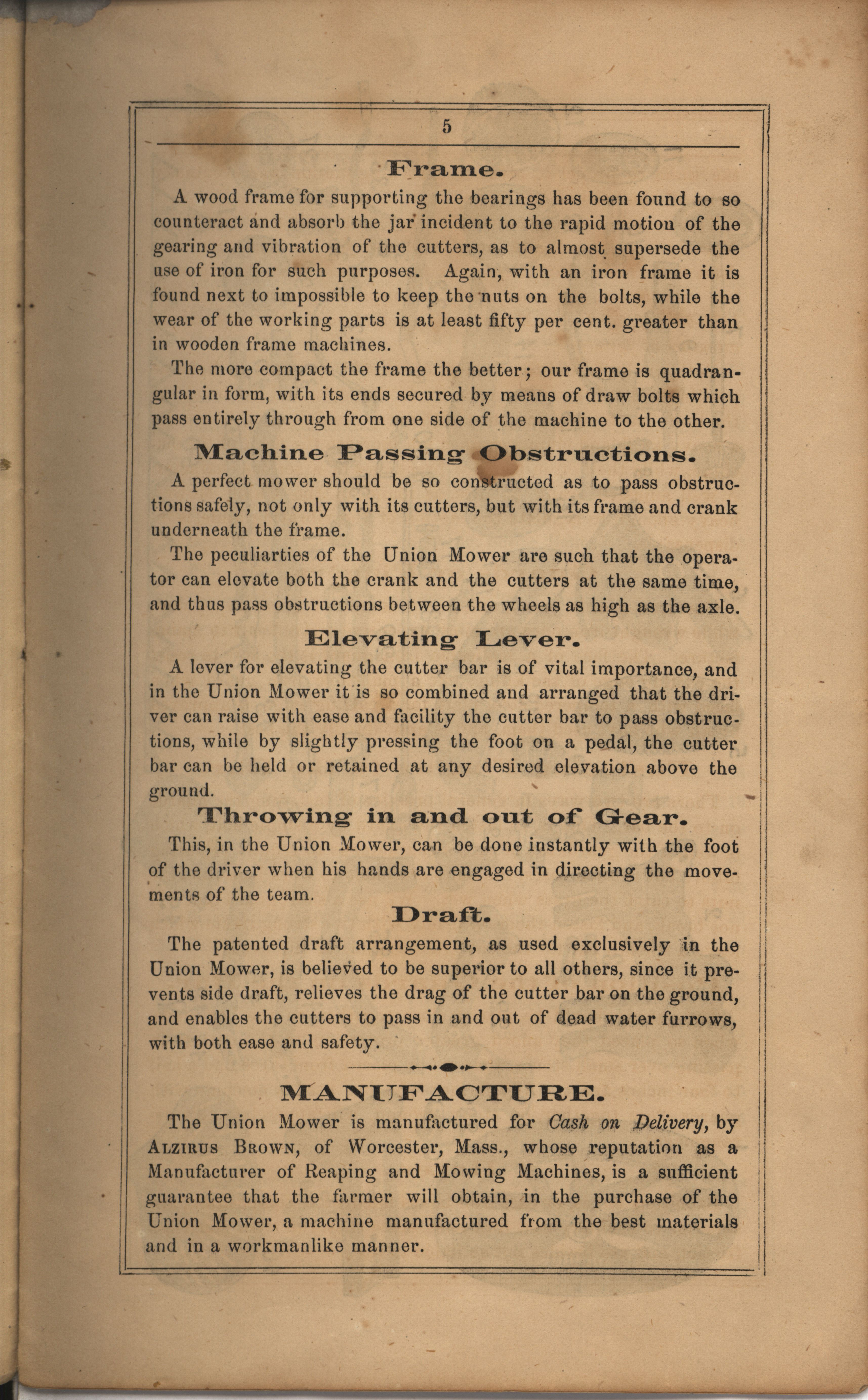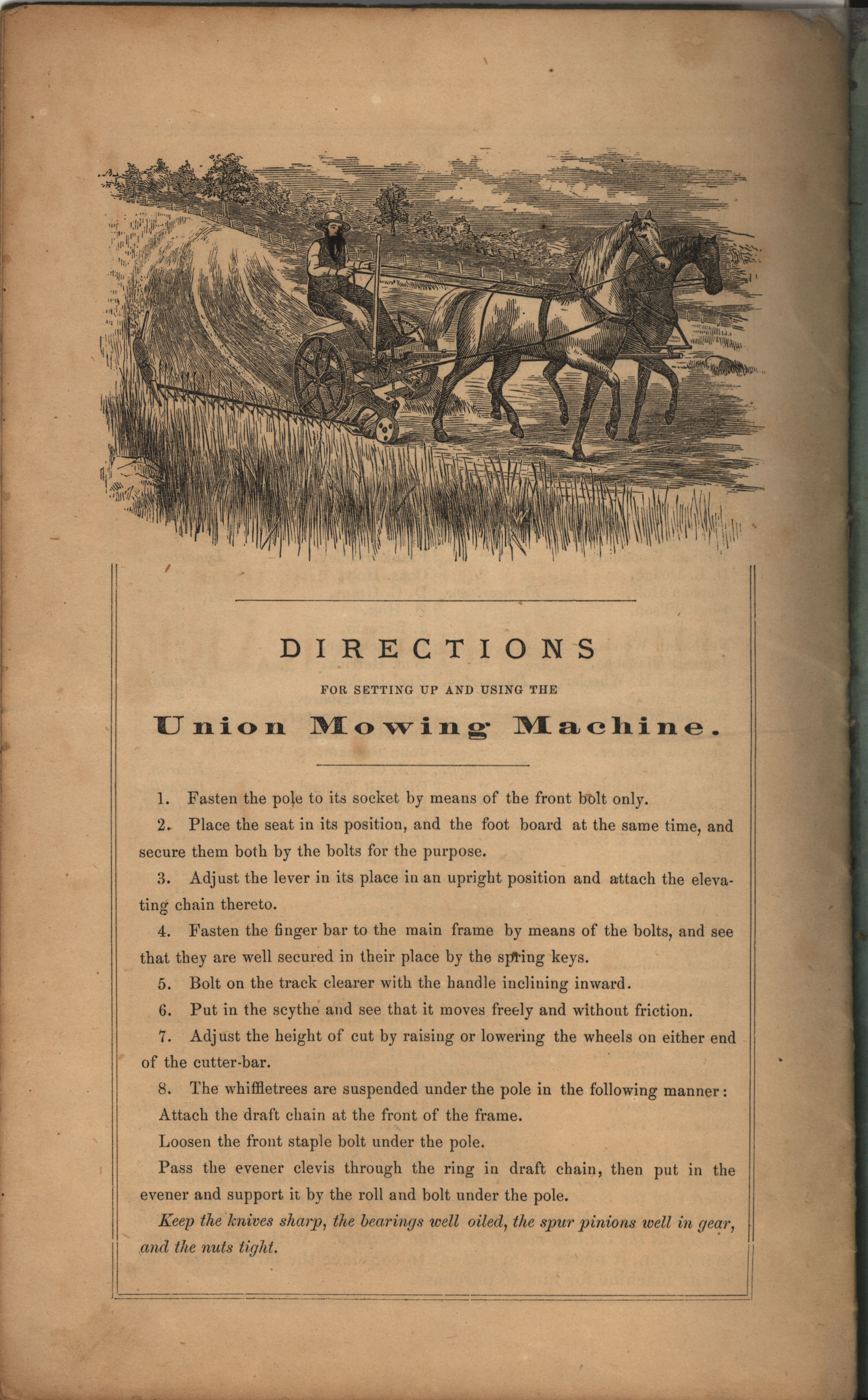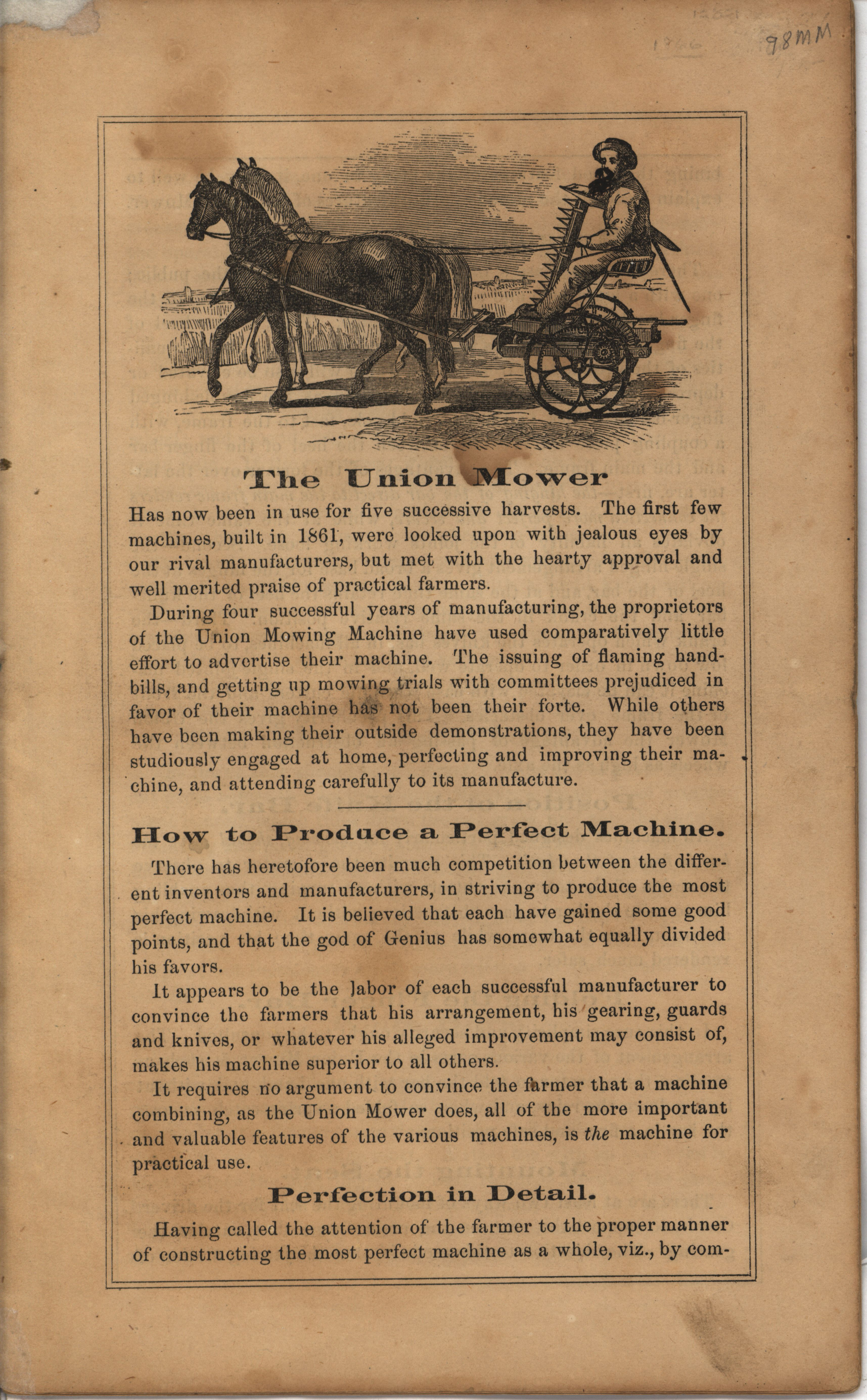 - Illustrated catalog describing the union mowing machine and other related products manufactured and offered by Alzirus Brown in 1866.