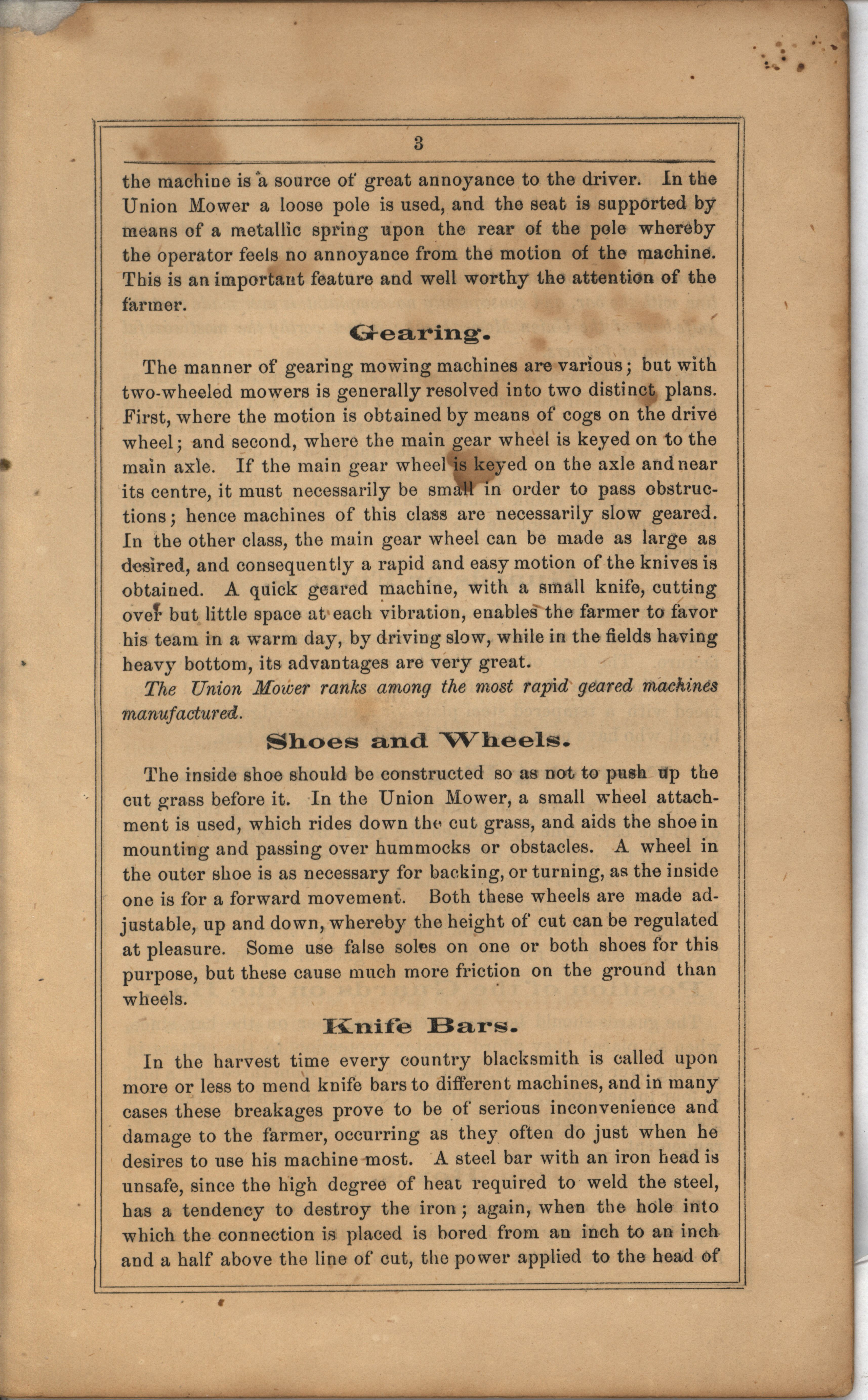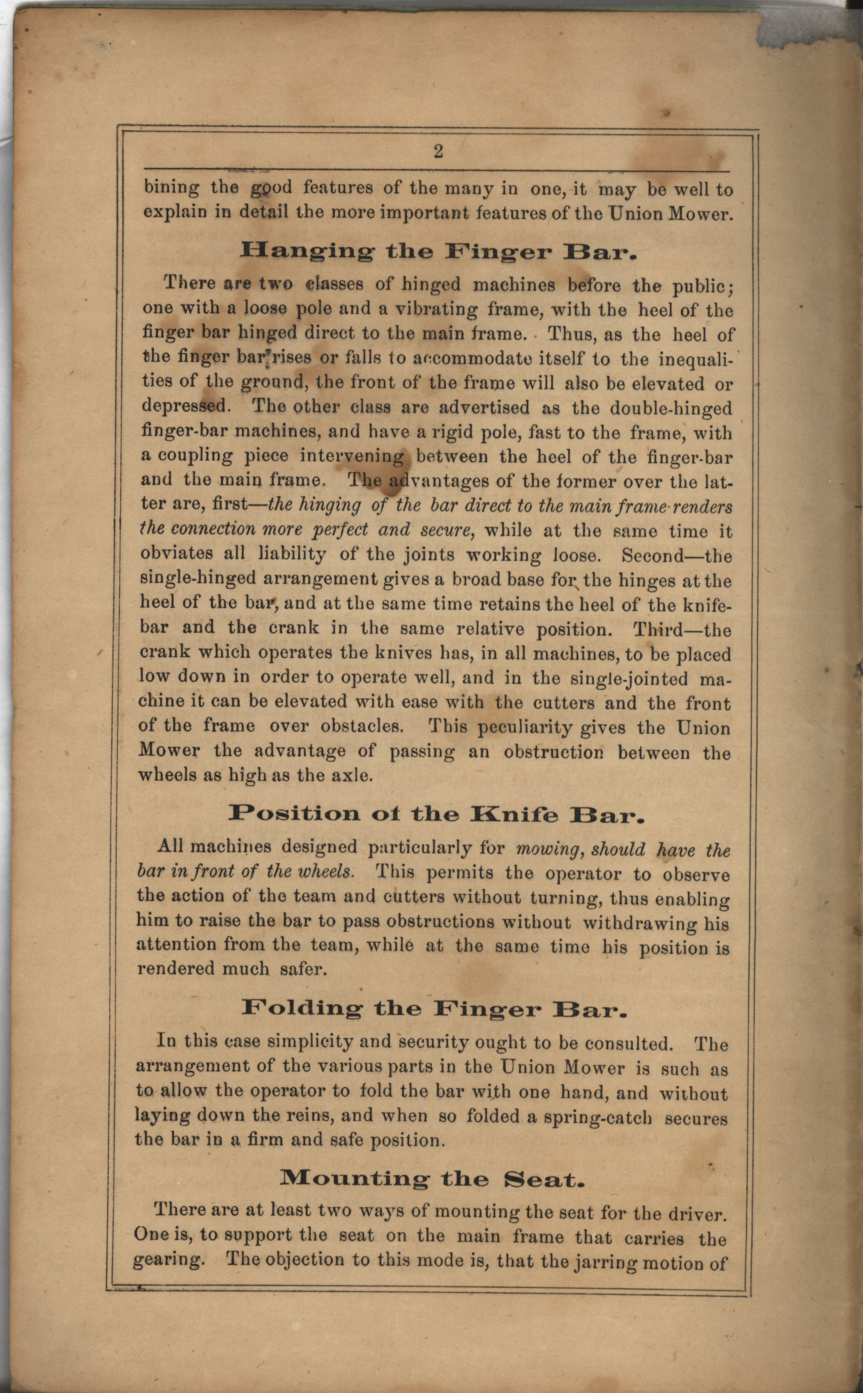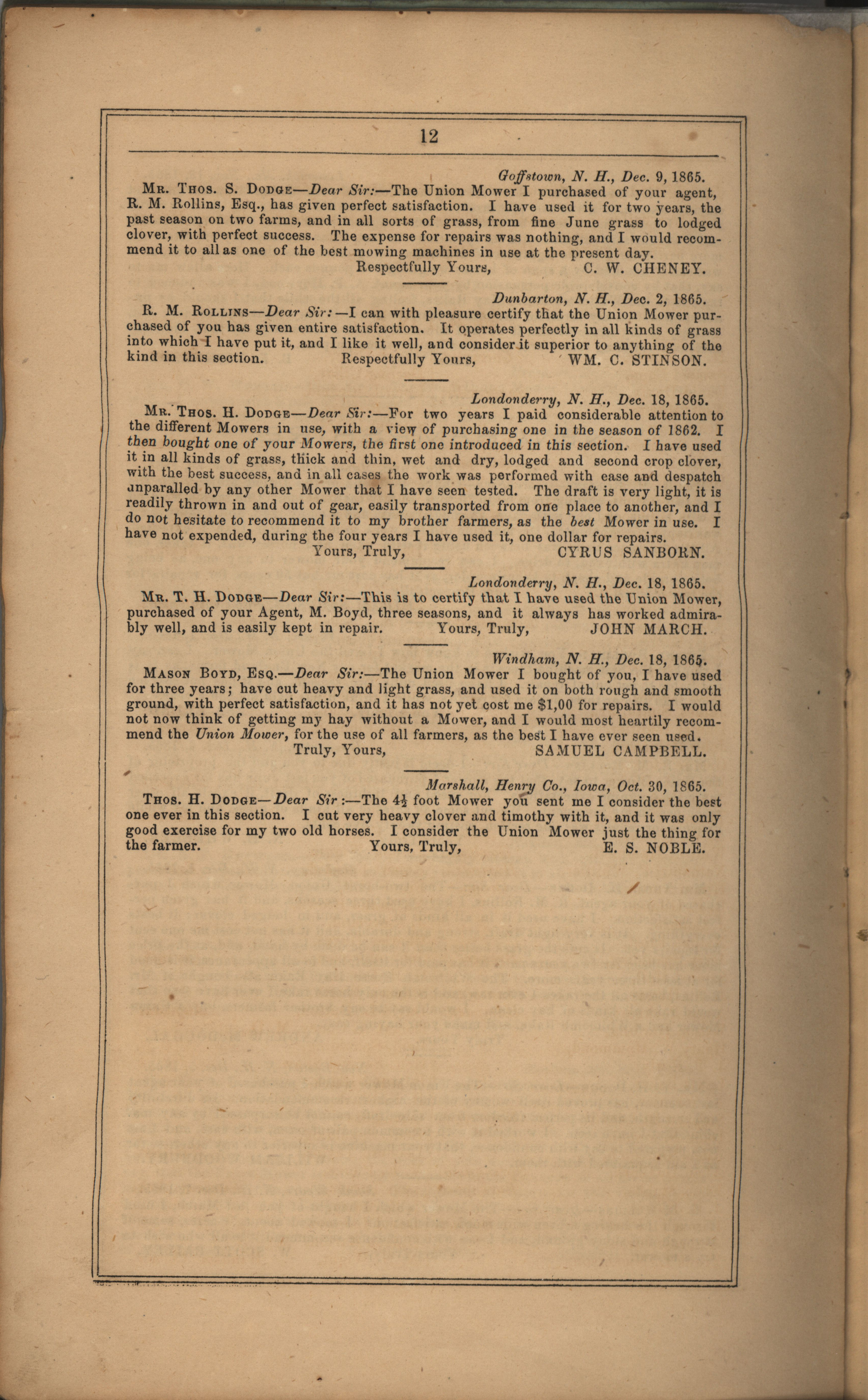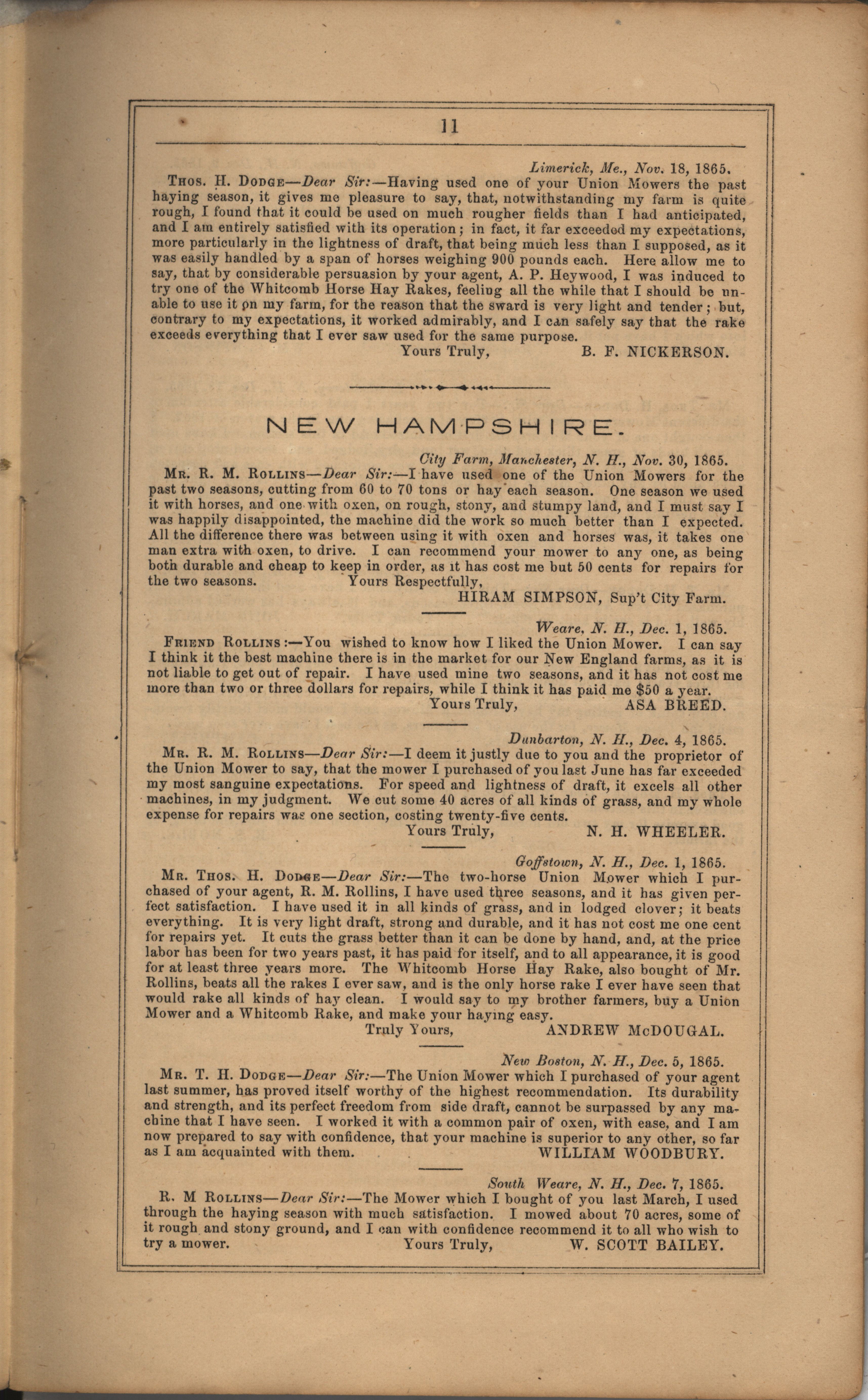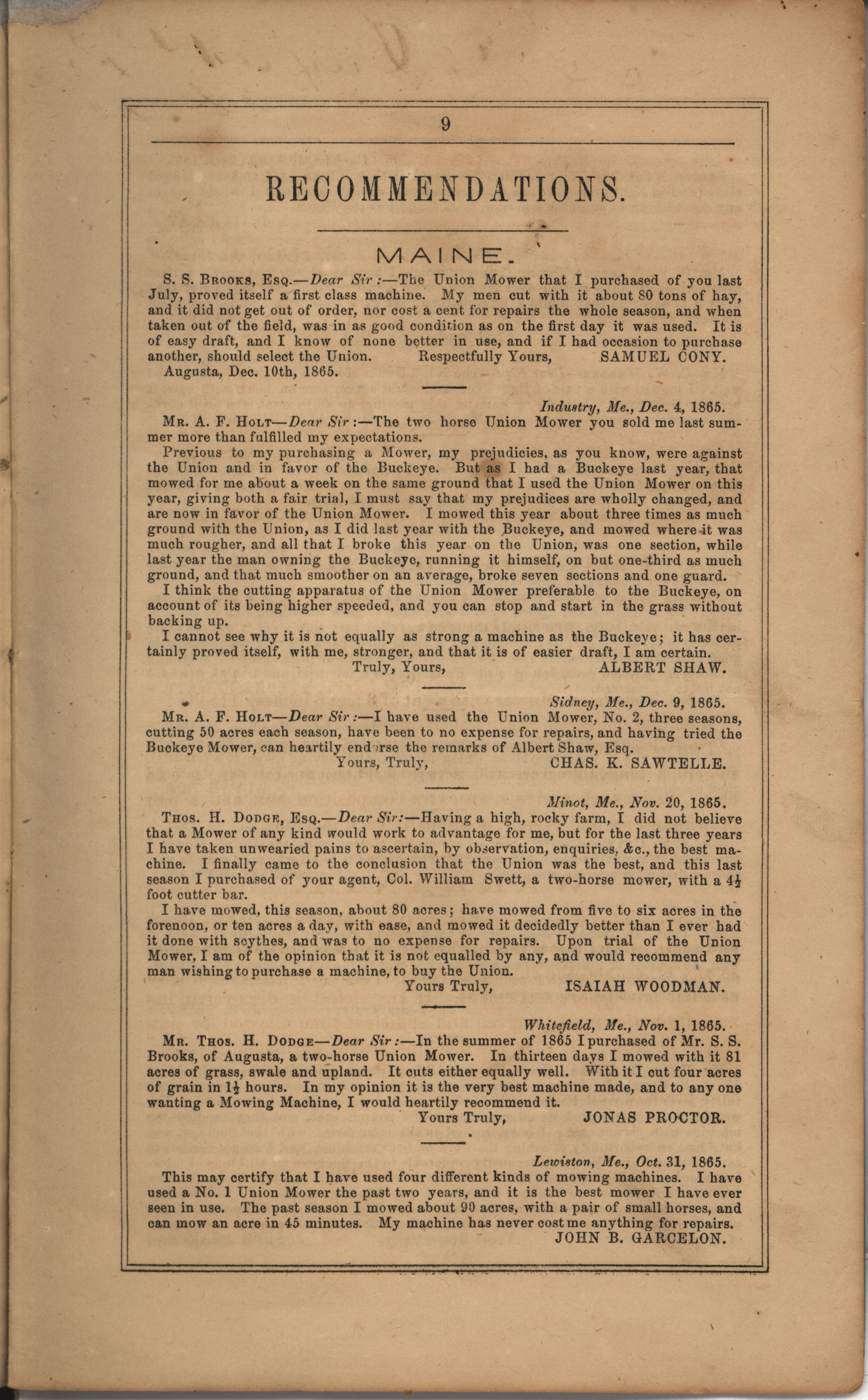 - Illustrated catalog describing the union mowing machine and other related products manufactured and offered by Alzirus Brown in 1866.