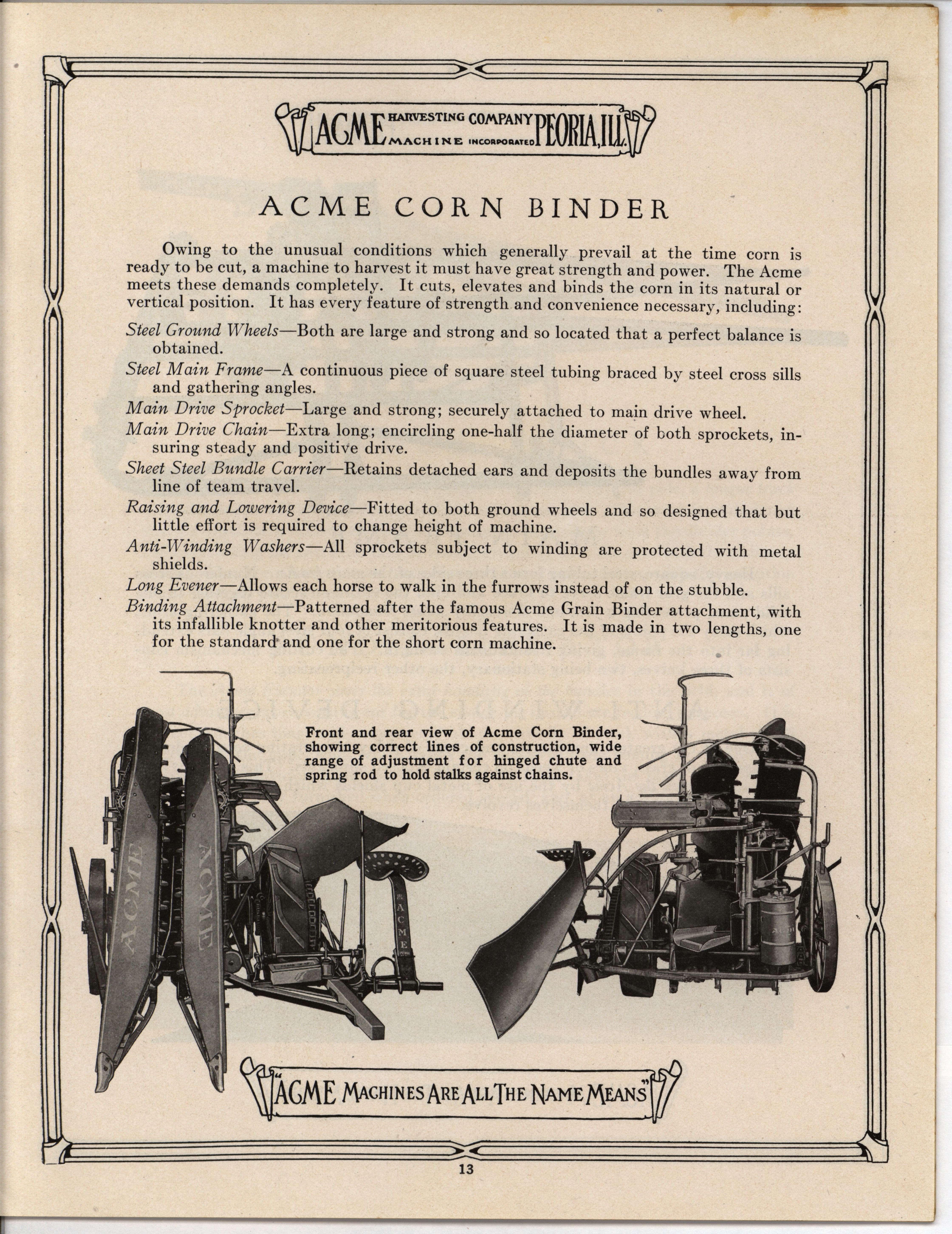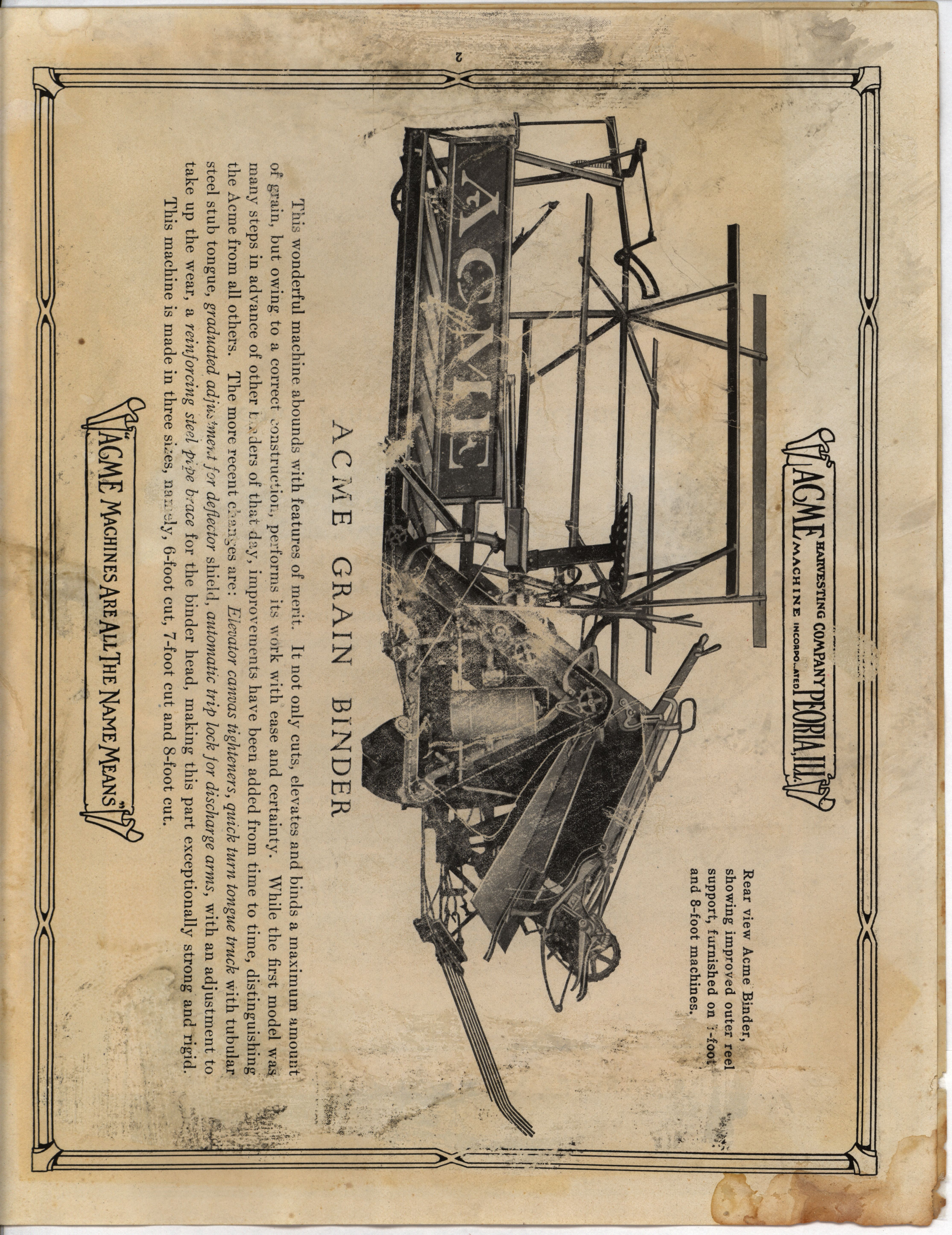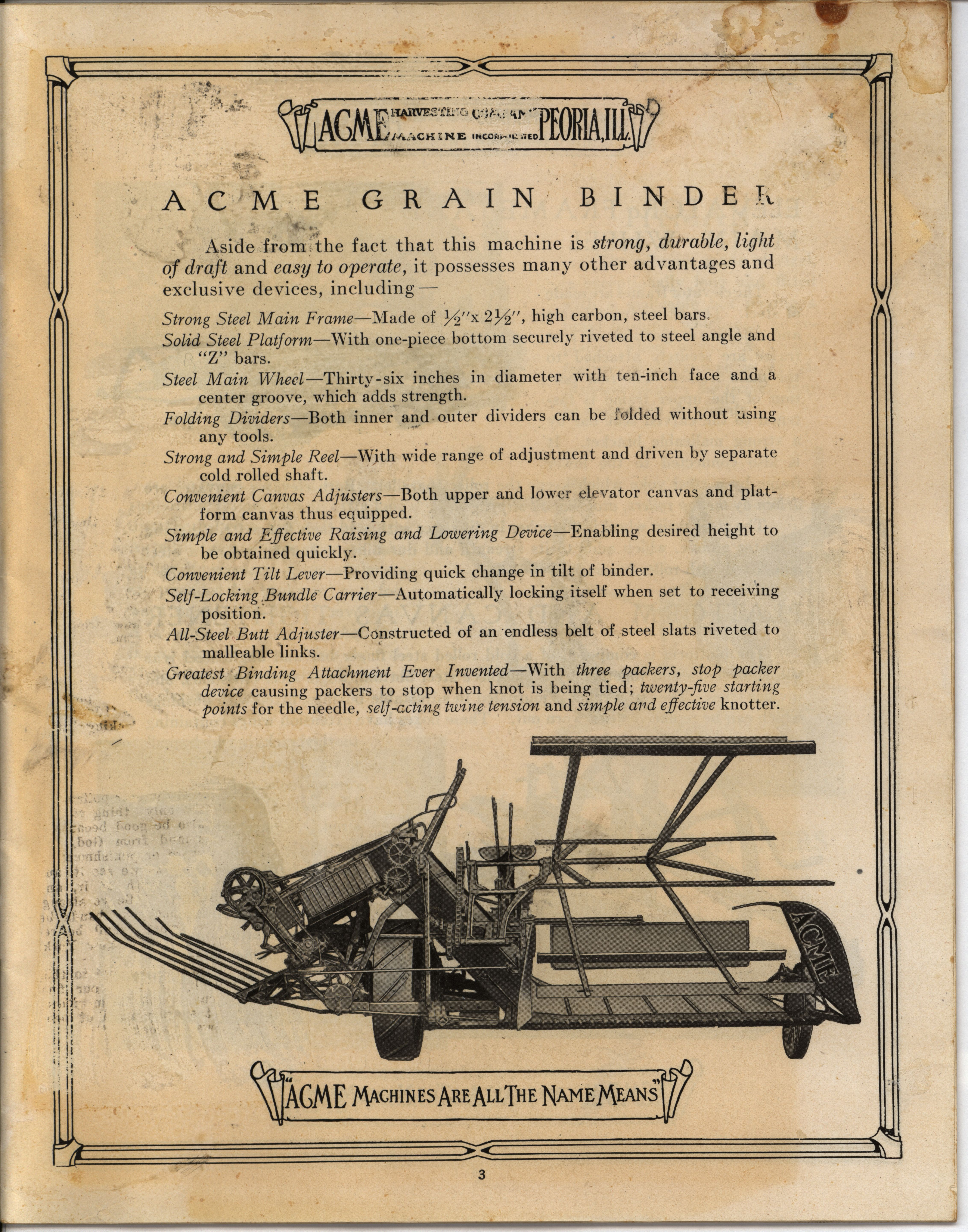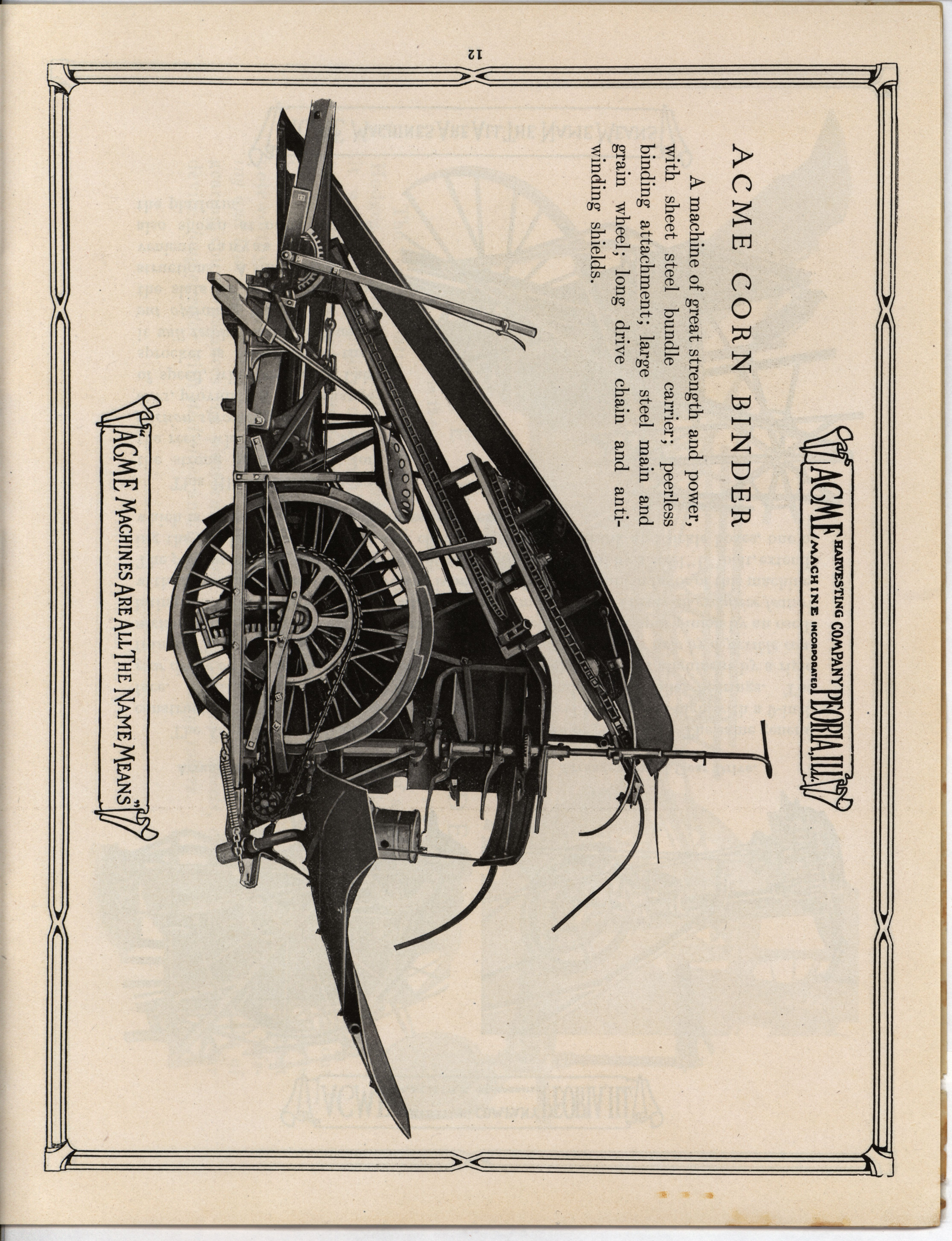 - A catalog detailing the products available from Acme Harvesting Machine Company with illustrations. The products include a grain binder and attachments.