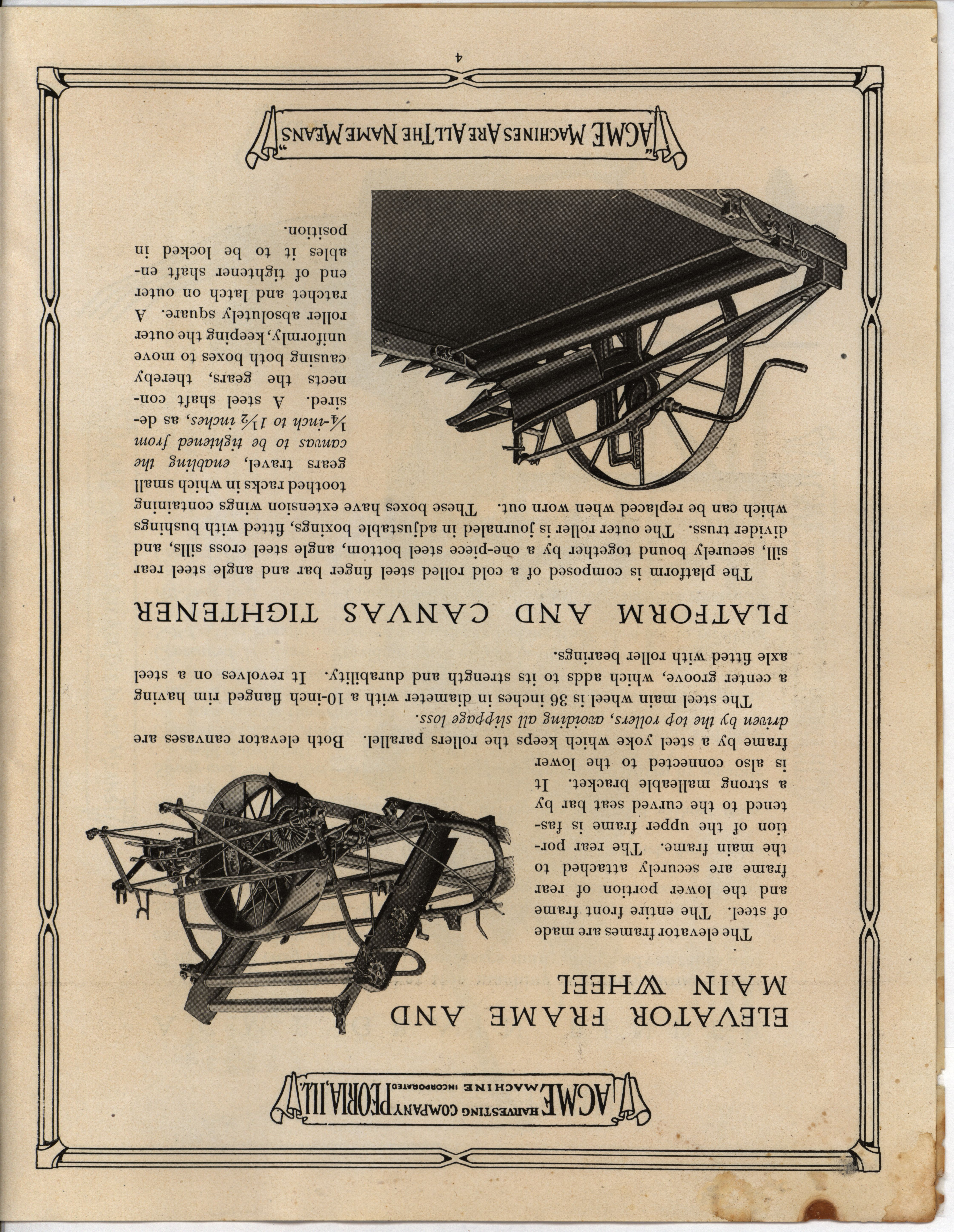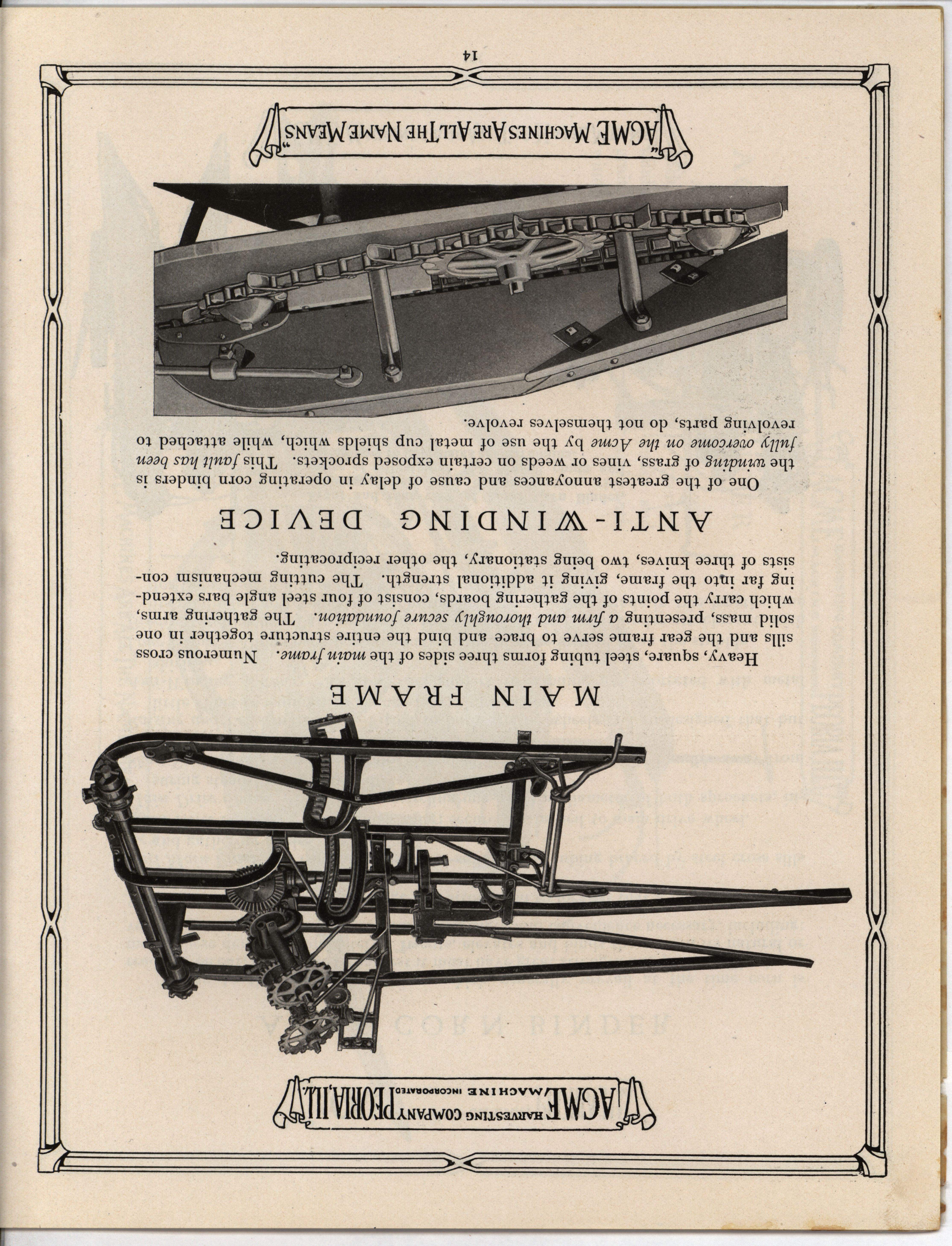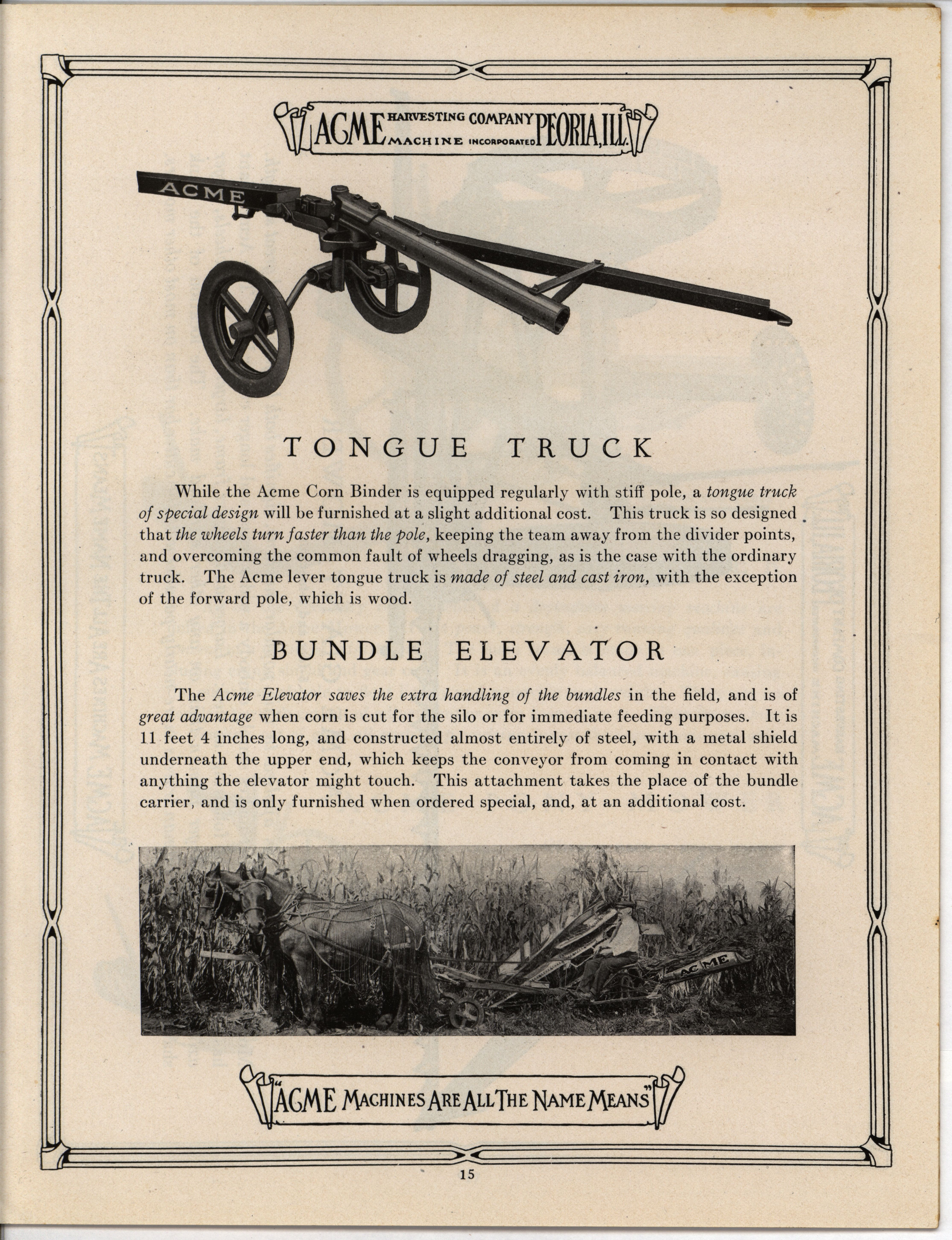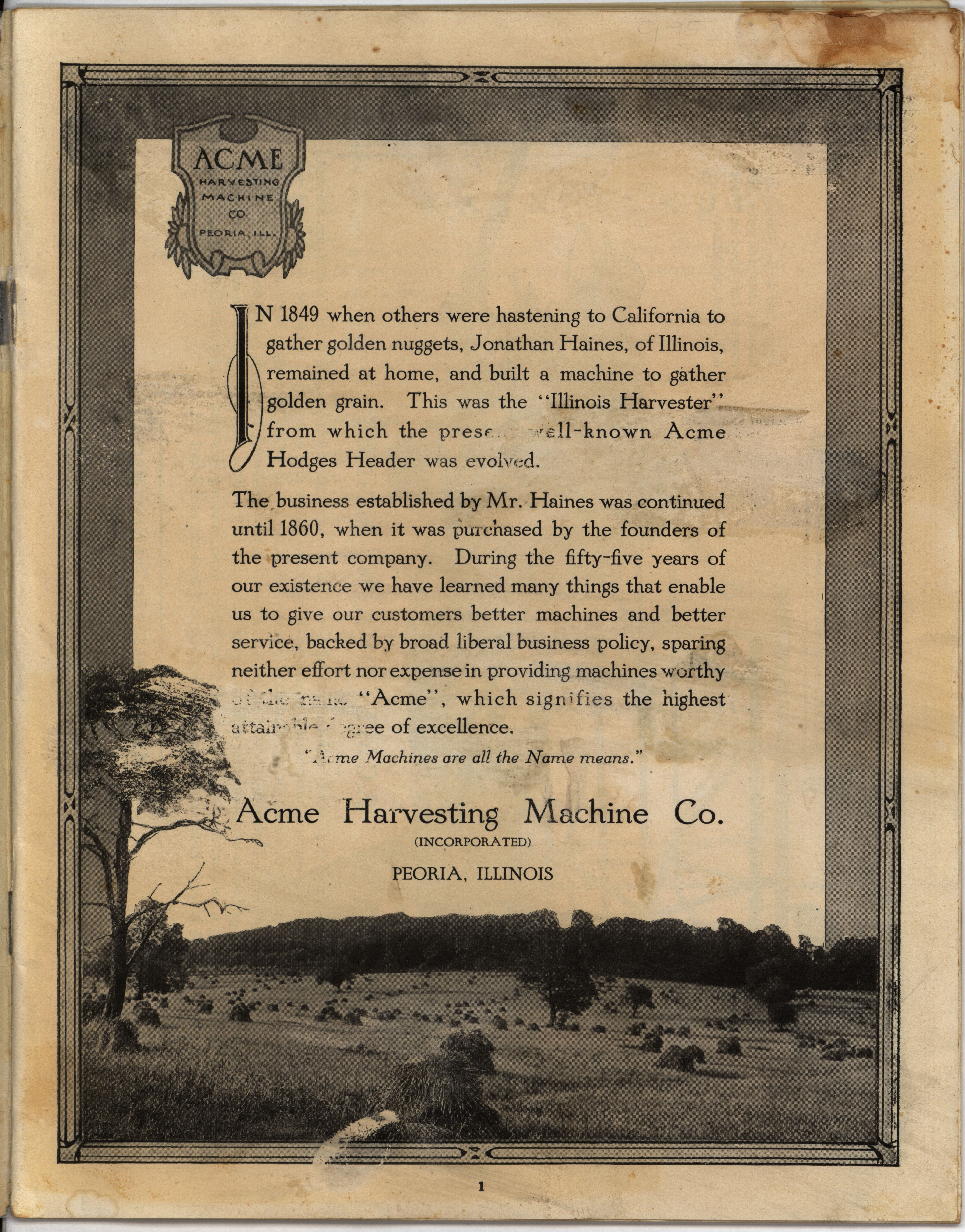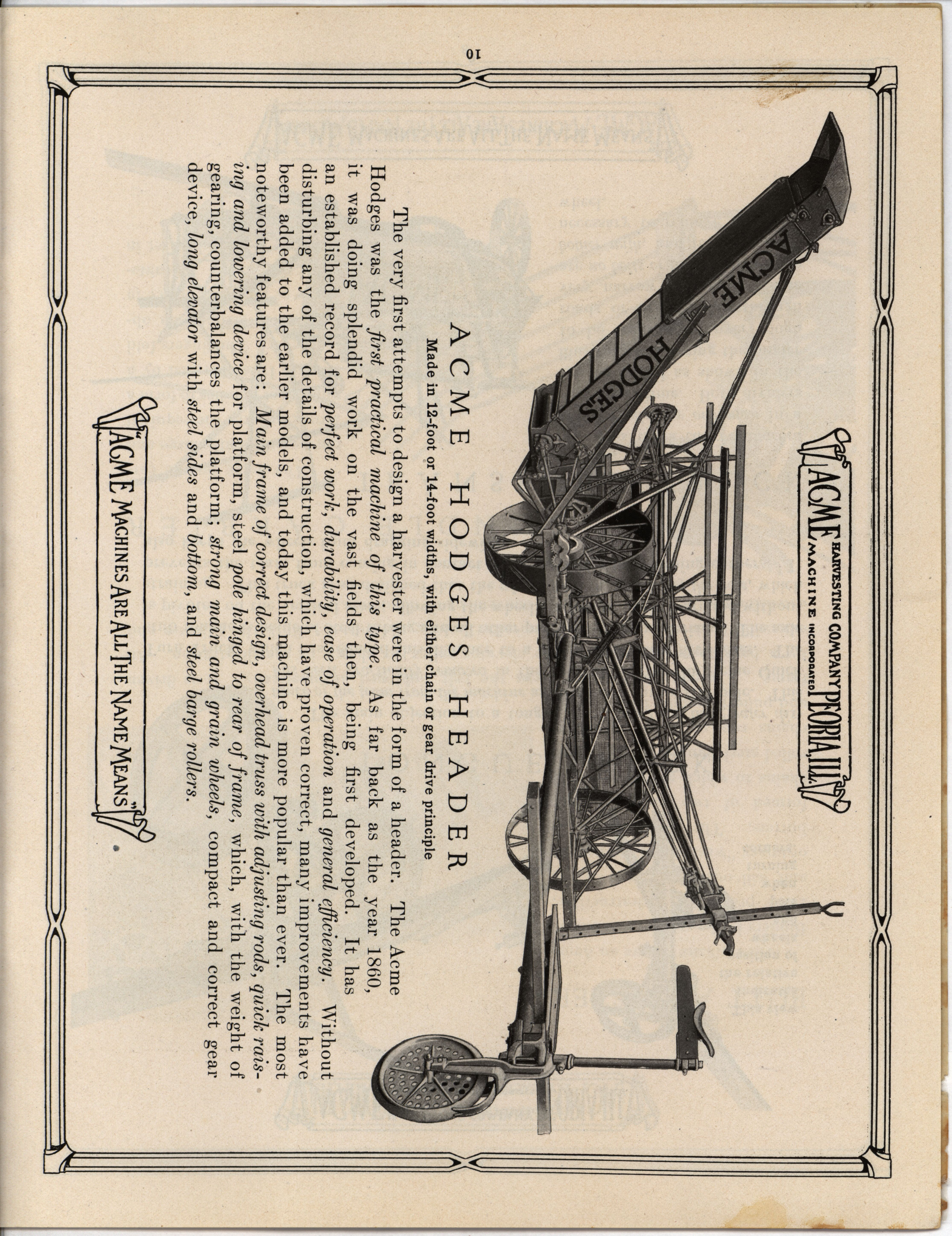 - A catalog detailing the products available from Acme Harvesting Machine Company with illustrations. The products include a grain binder and attachments.