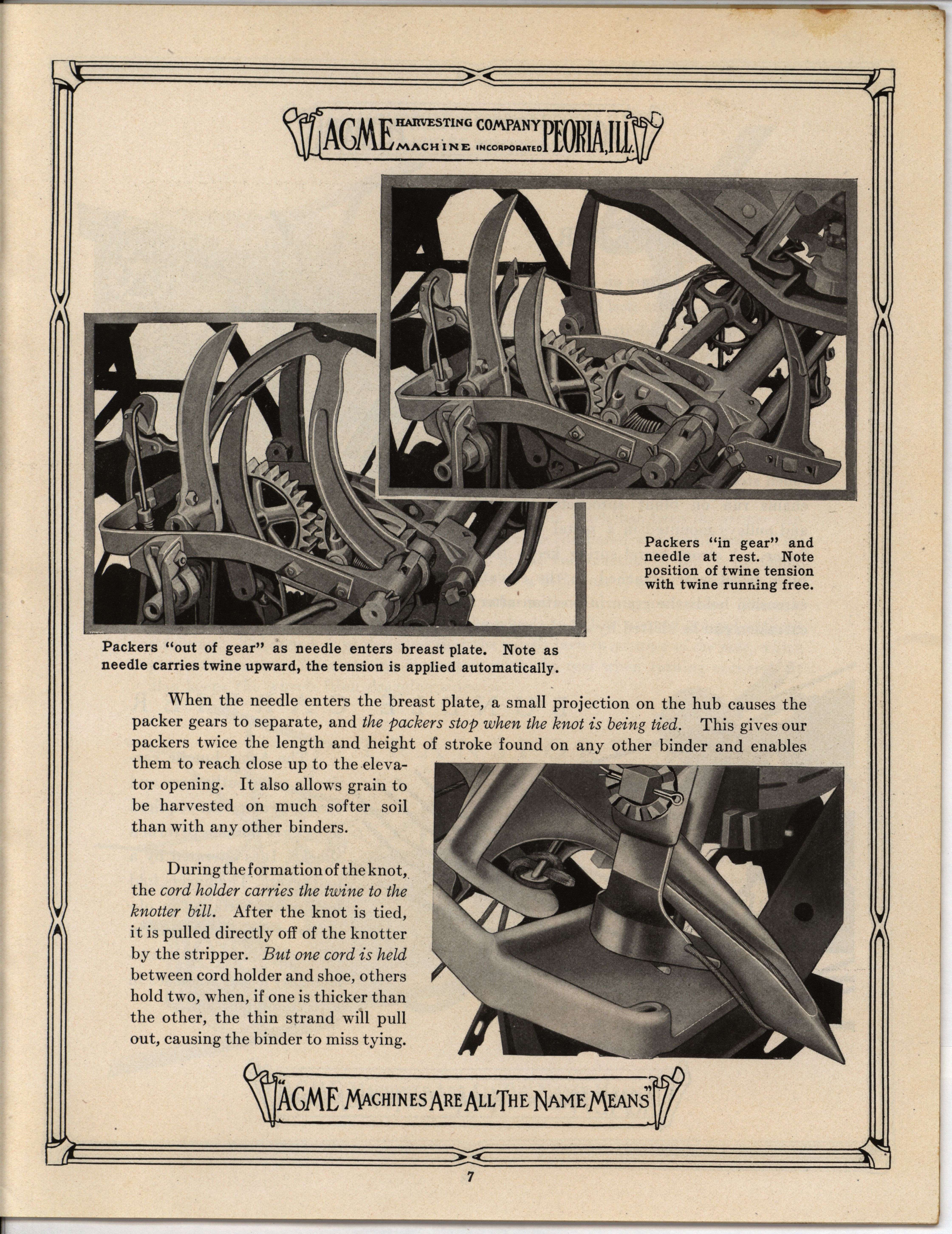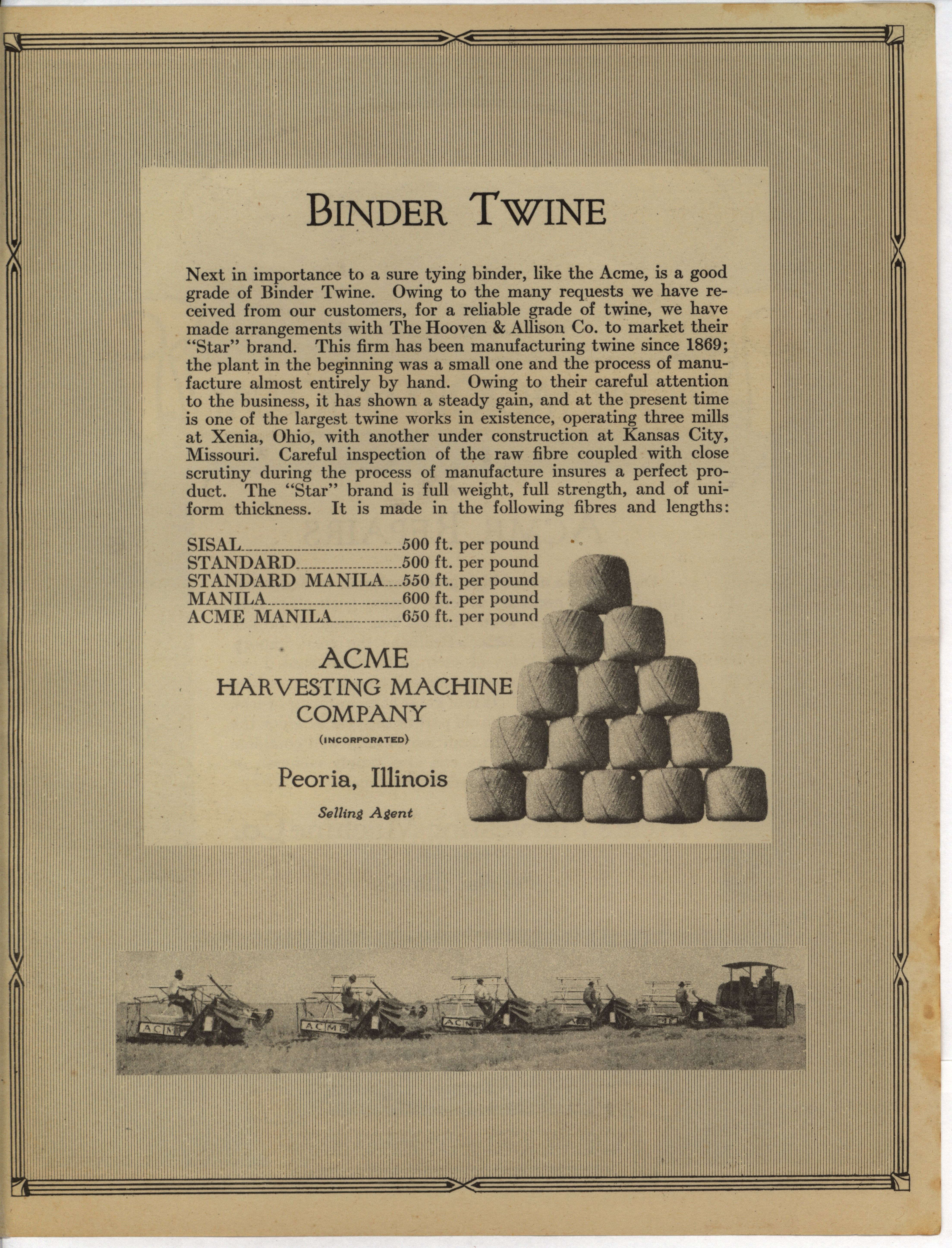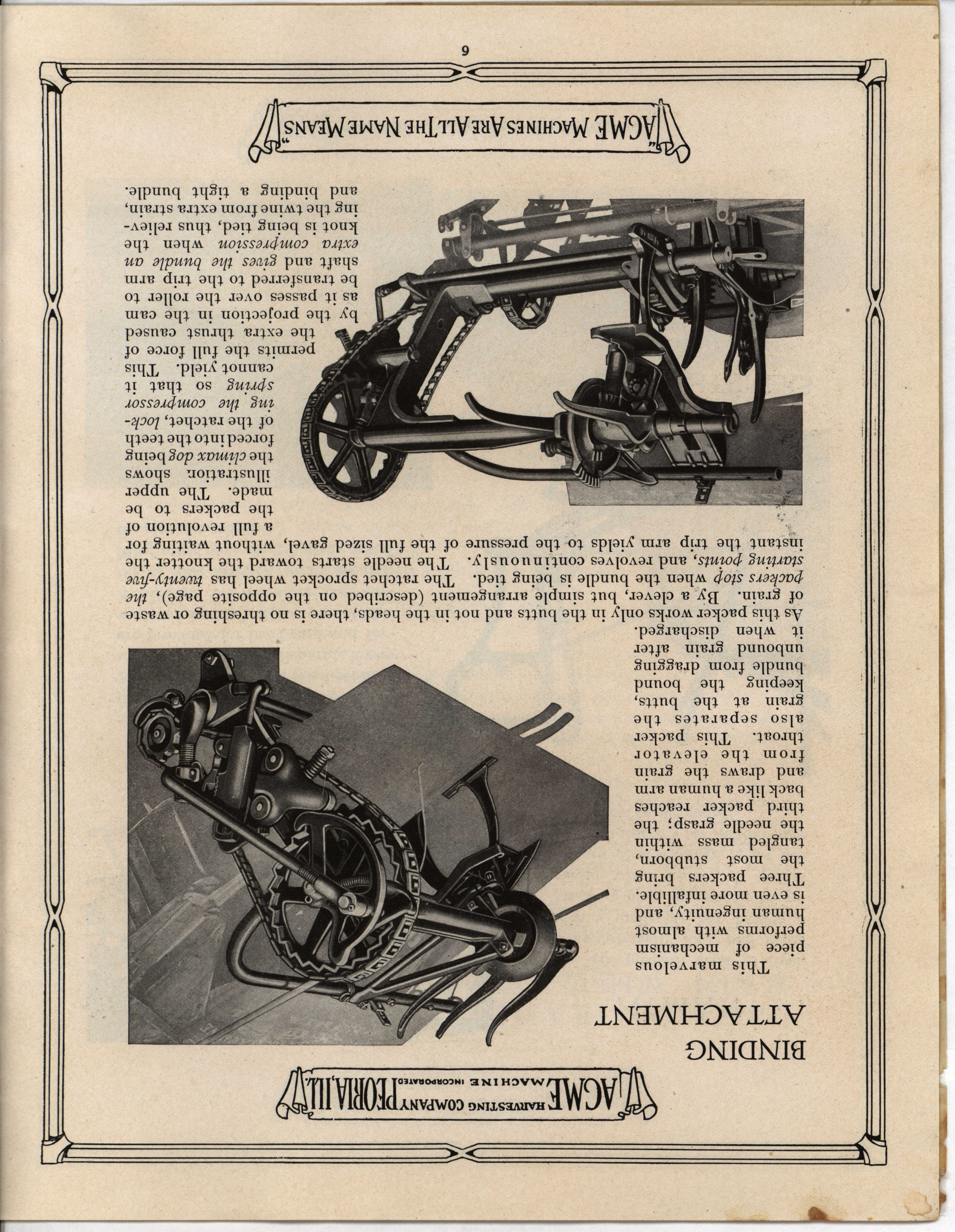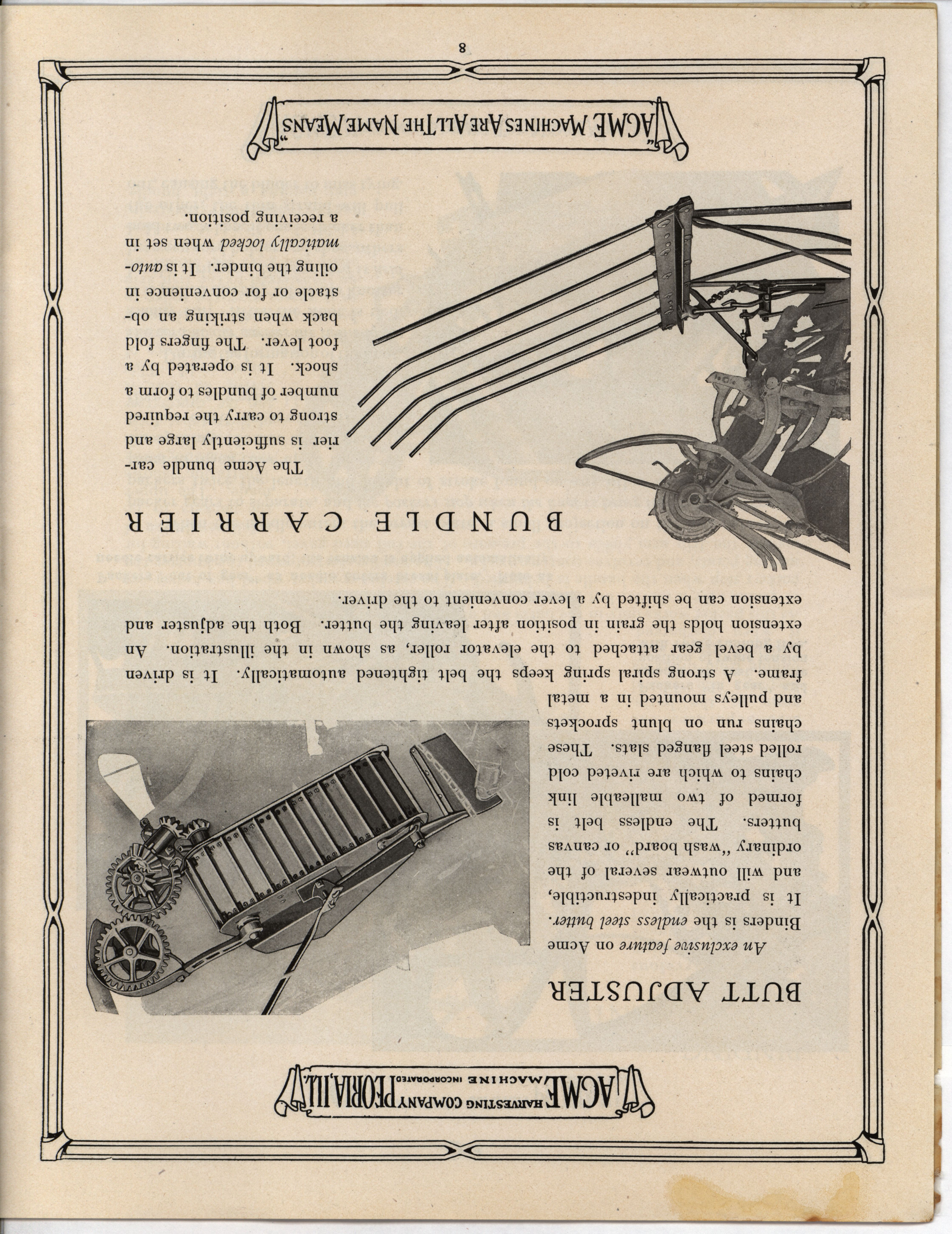 - A catalog detailing the products available from Acme Harvesting Machine Company with illustrations. The products include a grain binder and attachments.