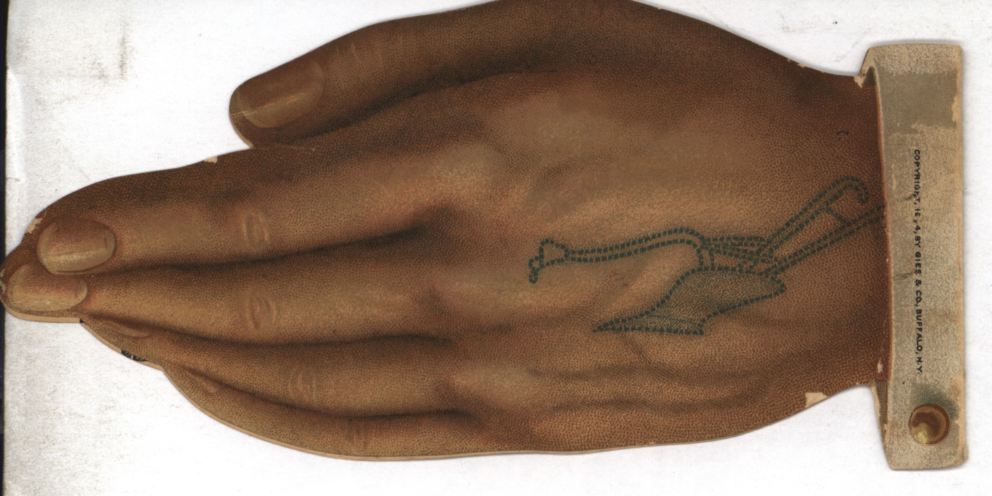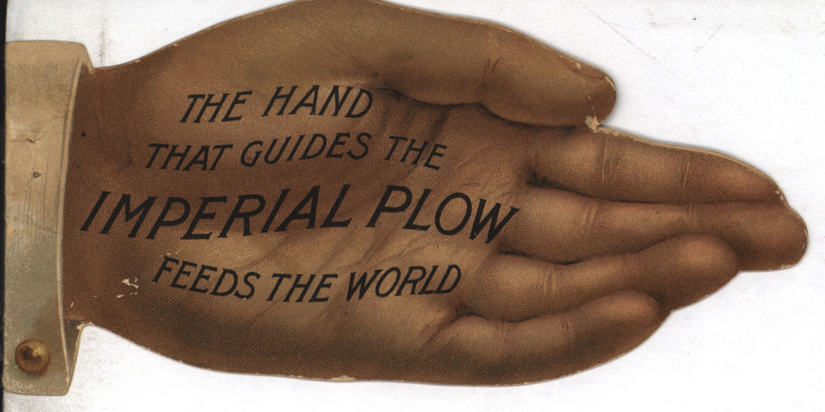 - Illustrated advertisement in the shape of a hand for the Imperial Plow product line offered by the Bucher and Gibbs Company.