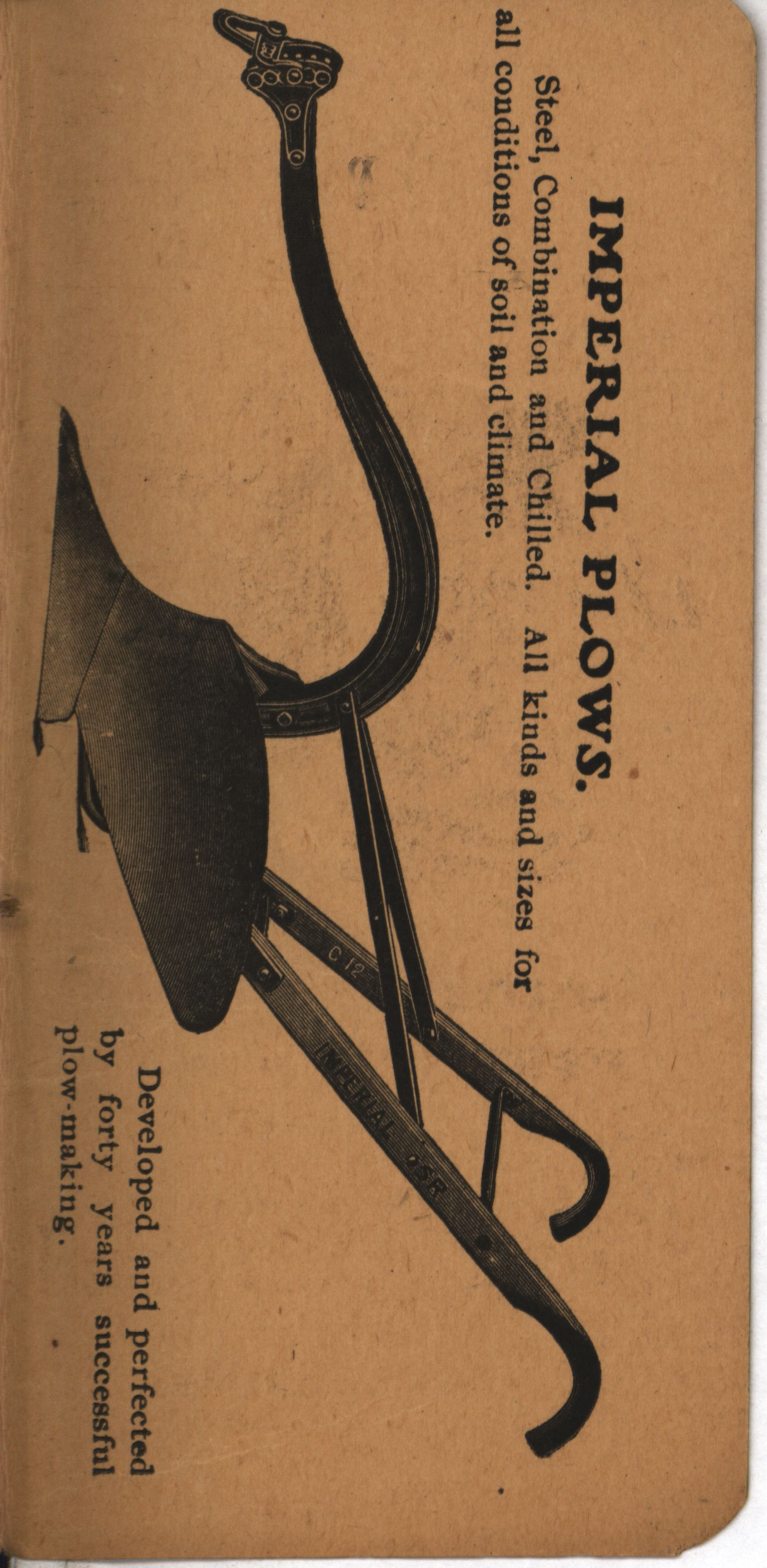 - Pocket notebook including illustrated advertisements for the Imperial product line offered by the Bucher and Gibbs Plow Company.