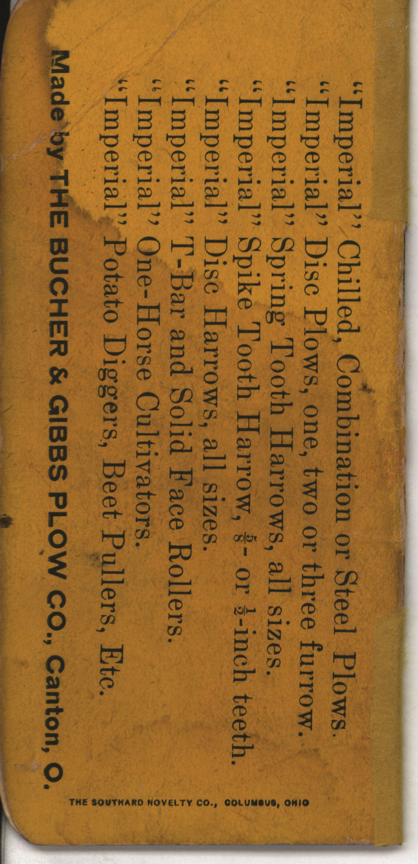 - Pocket notebook advertising the Imperial Plows product line offered by Bucher and Gibbs Plow Company.