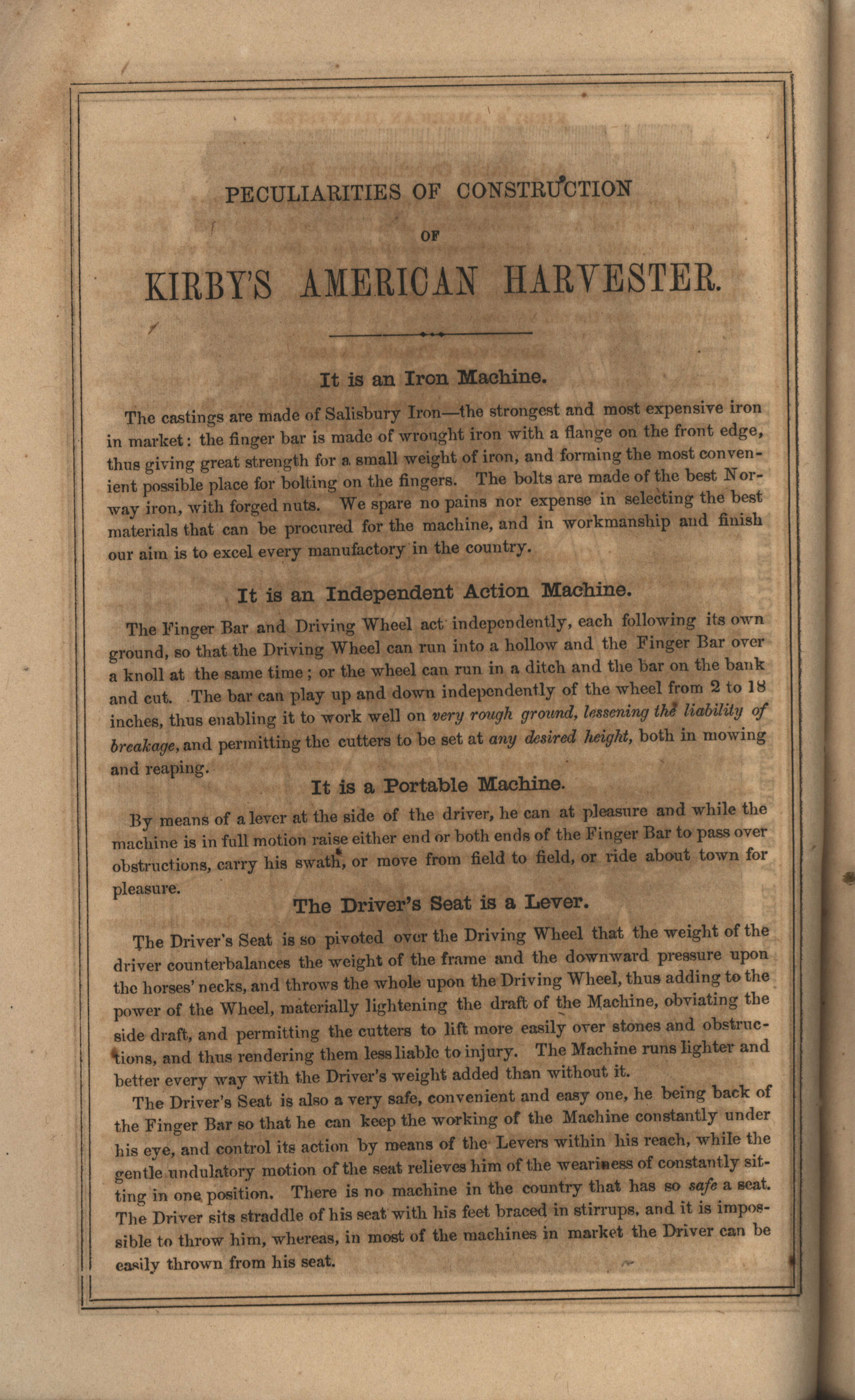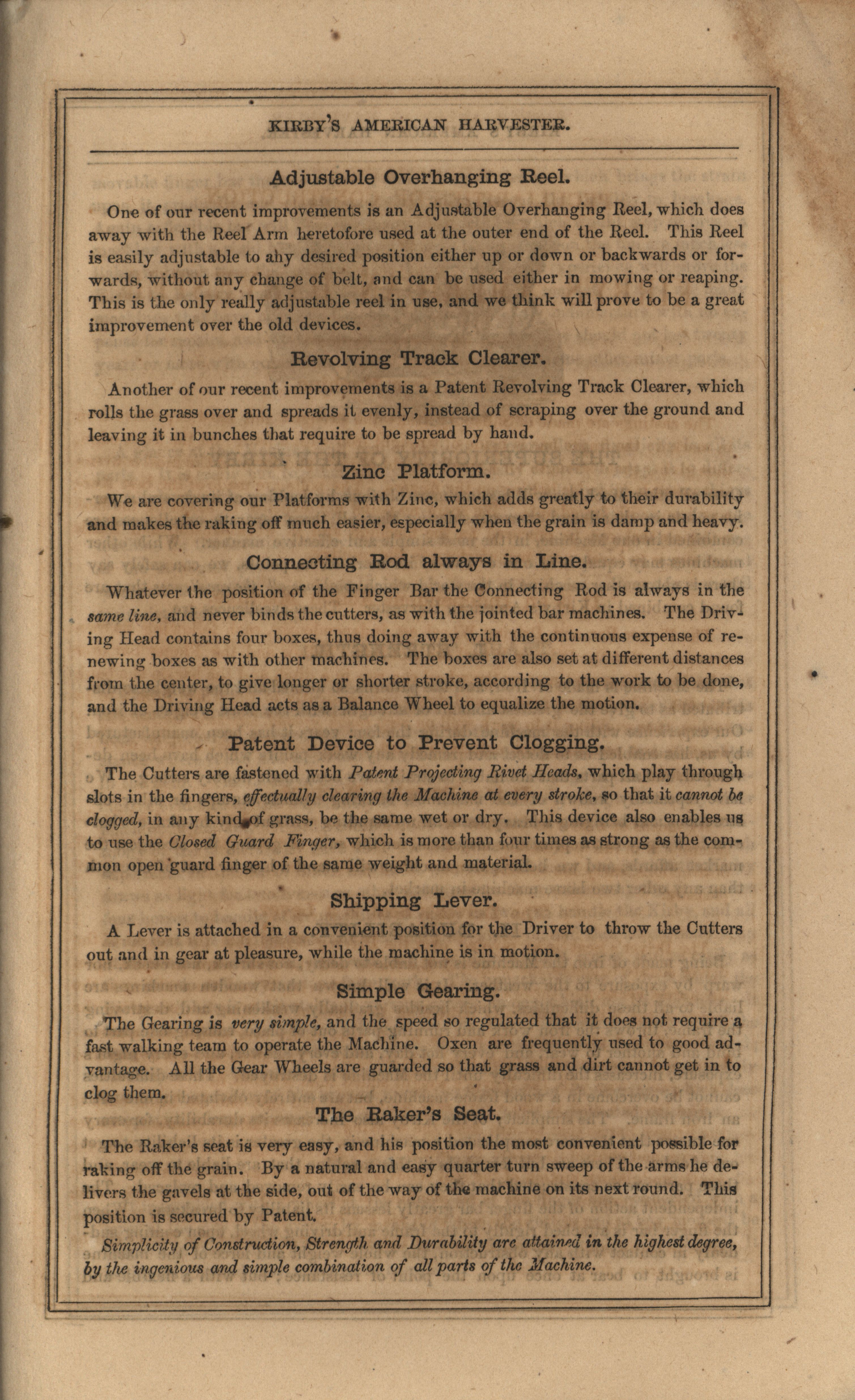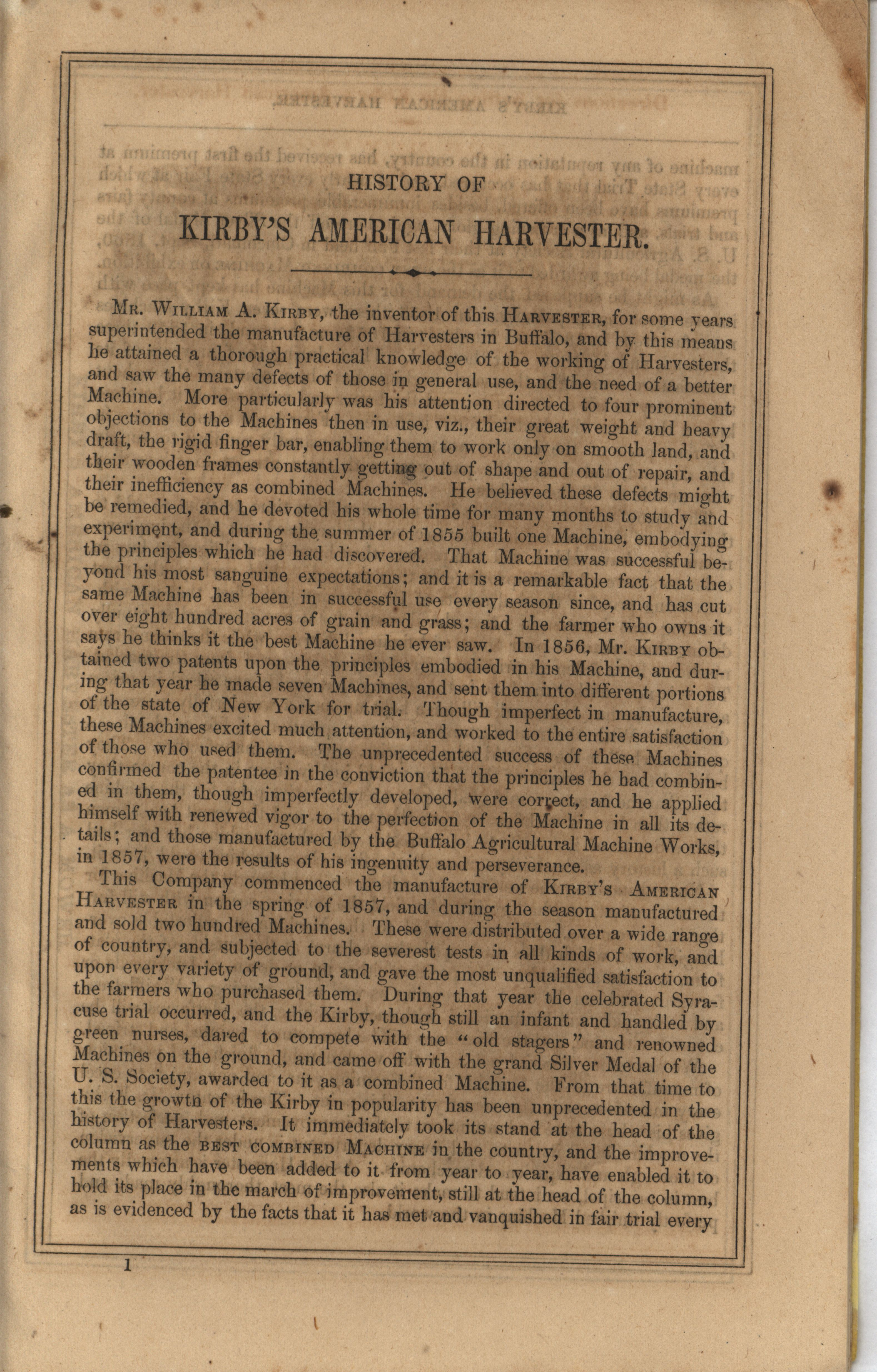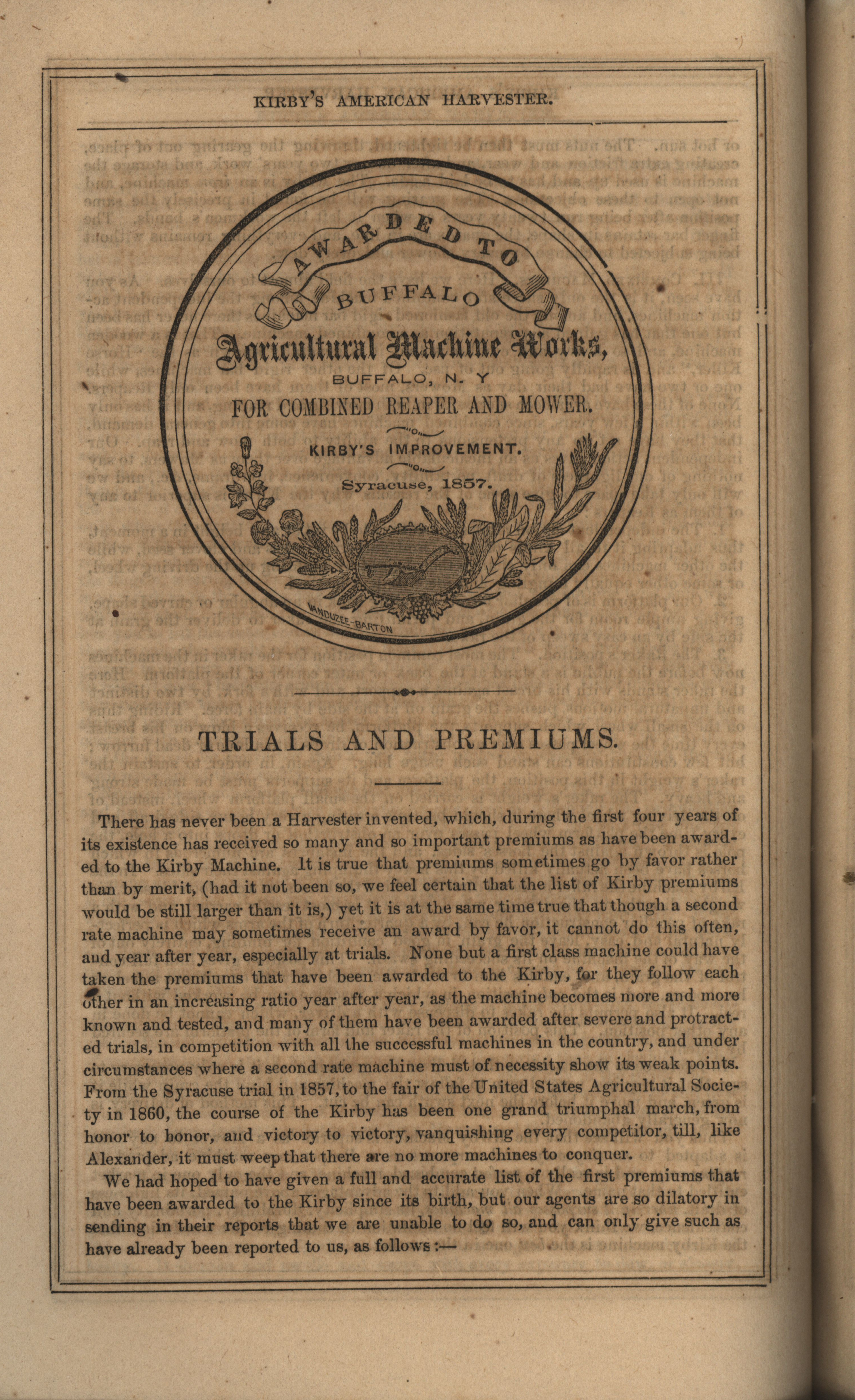 - Catalog describing Kirby's American Harvester product line offered by Buffalo Agricultural Machine, Works includes illustrations.