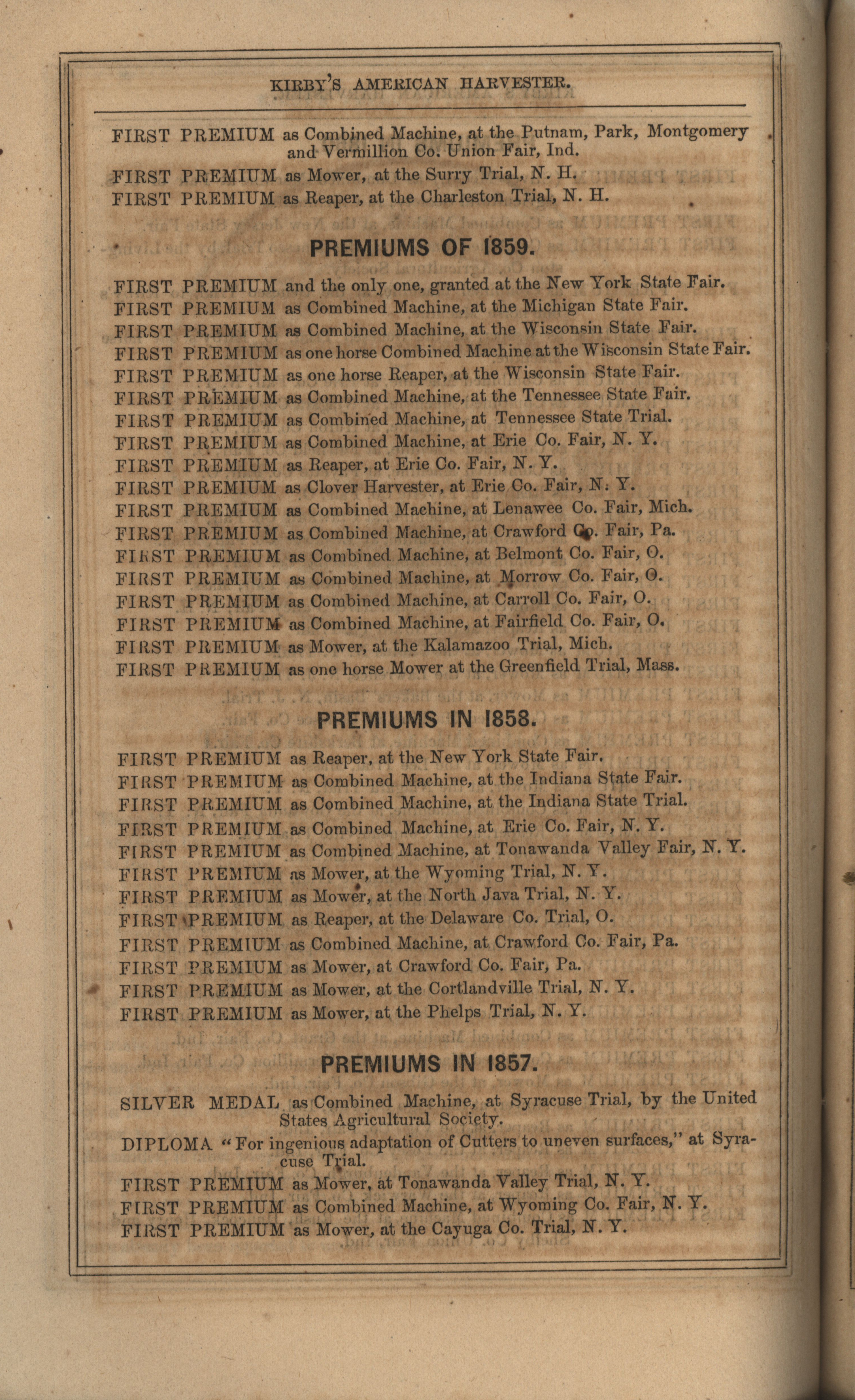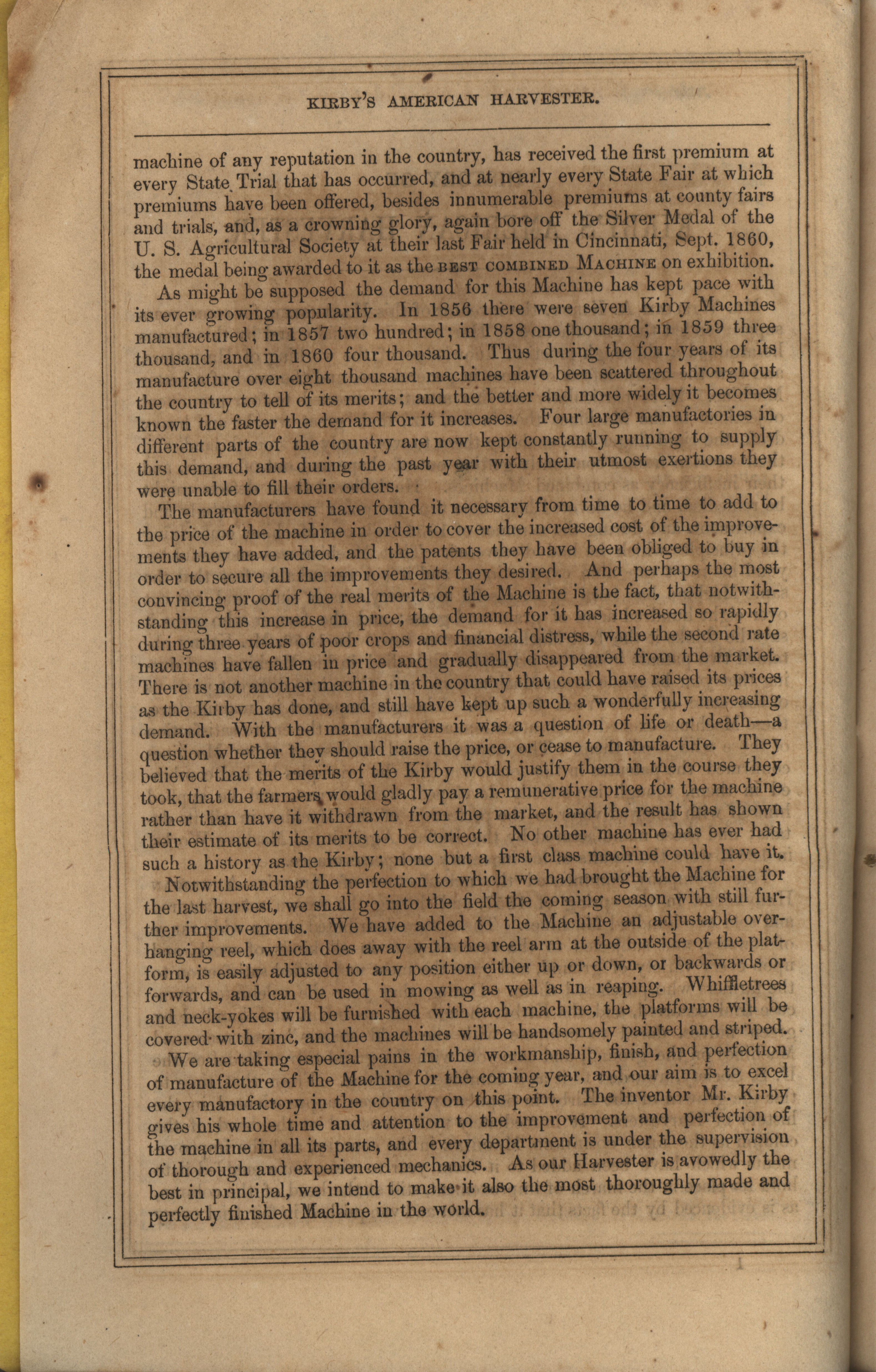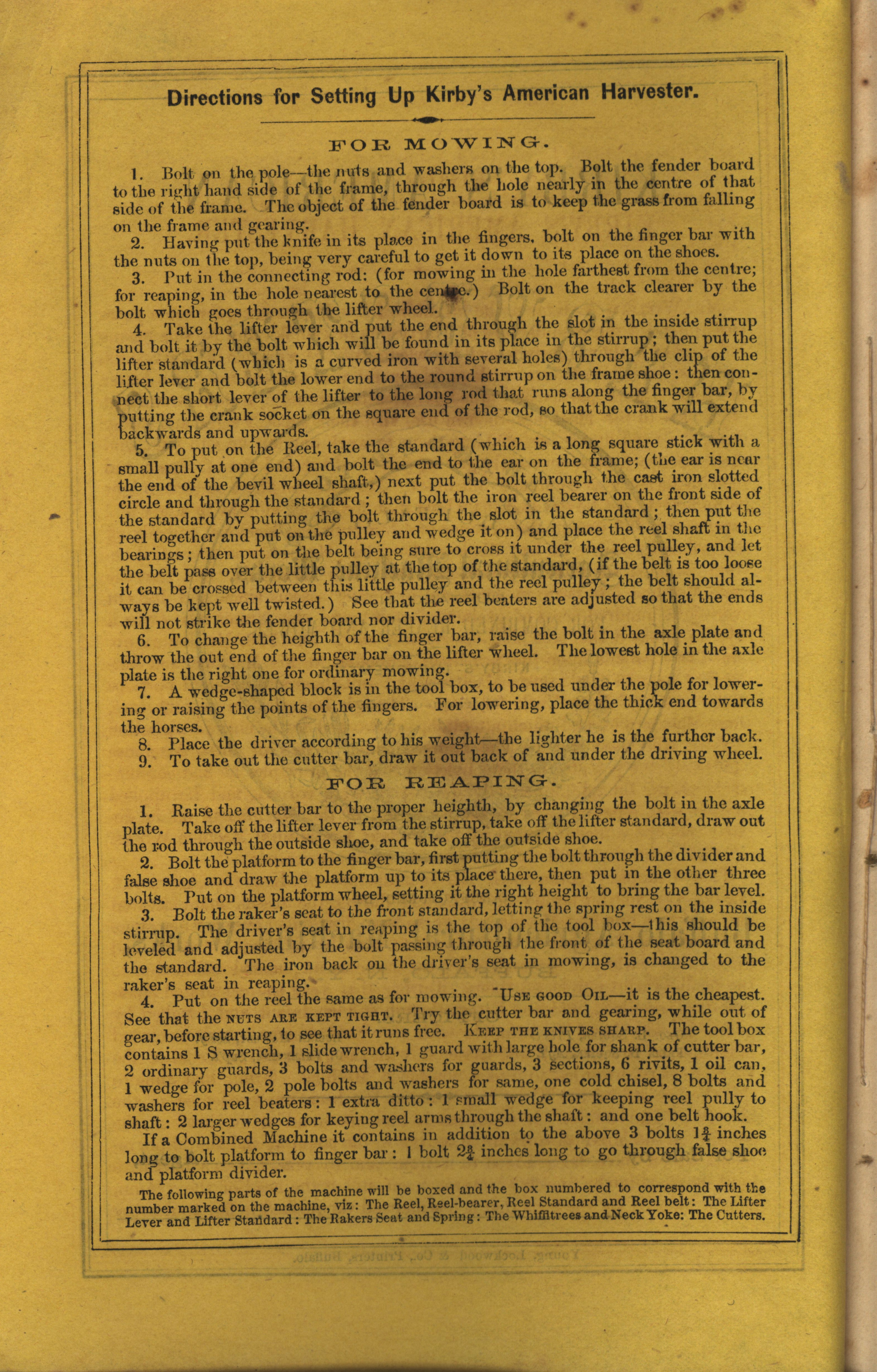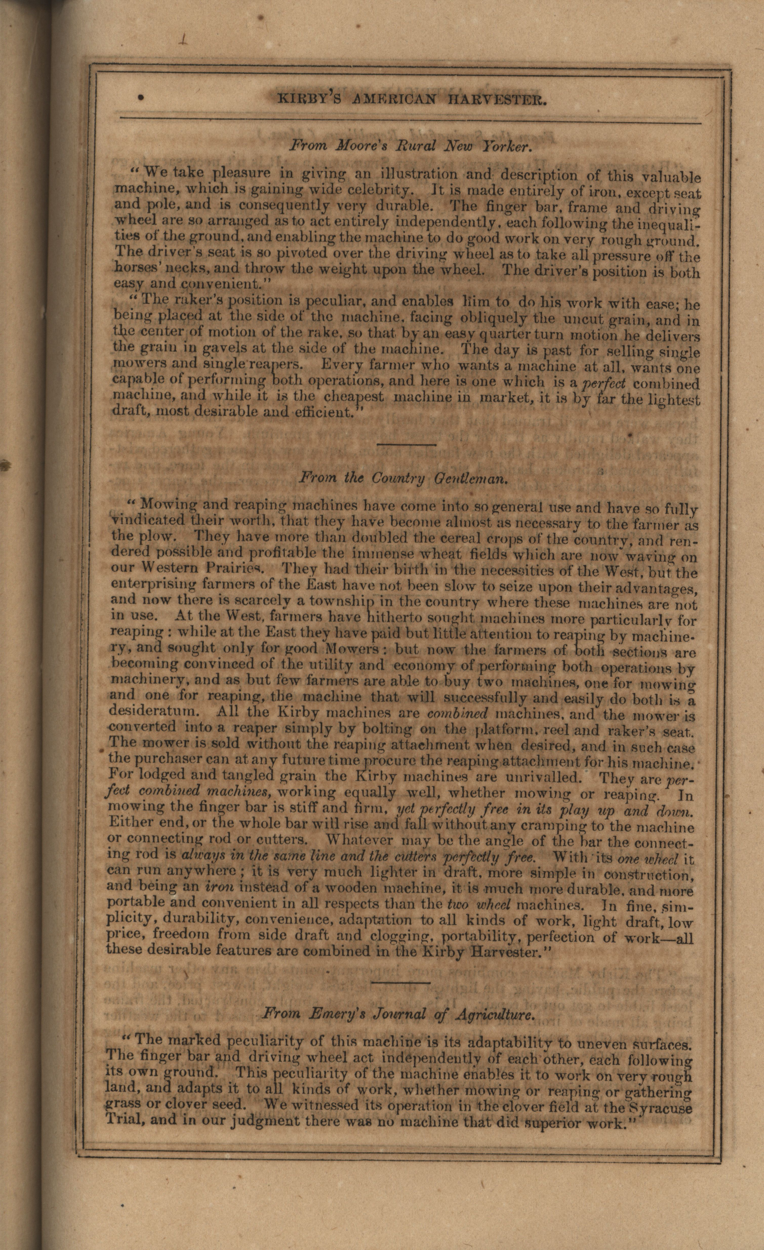 - Catalog describing Kirby's American Harvester product line offered by Buffalo Agricultural Machine, Works includes illustrations.