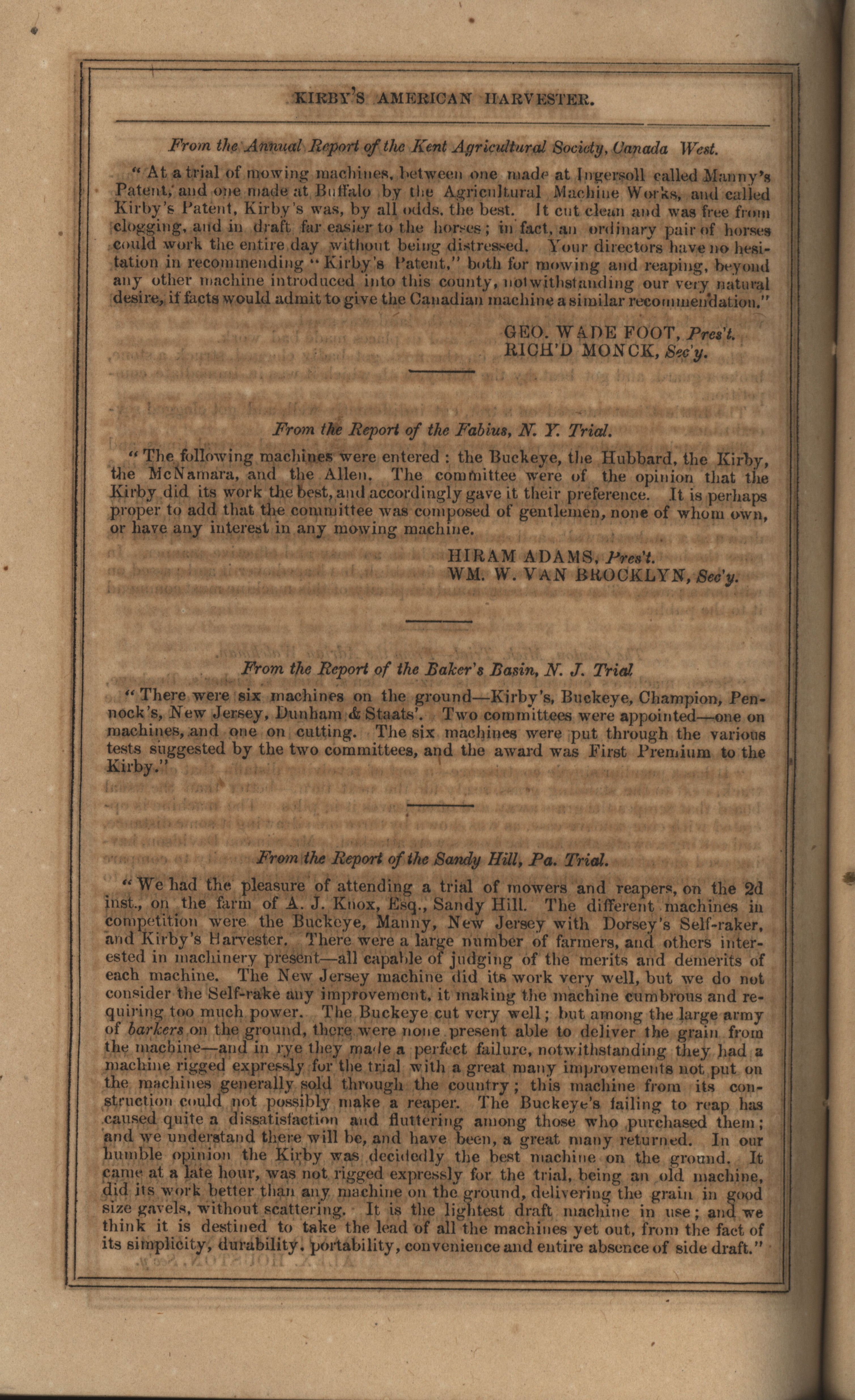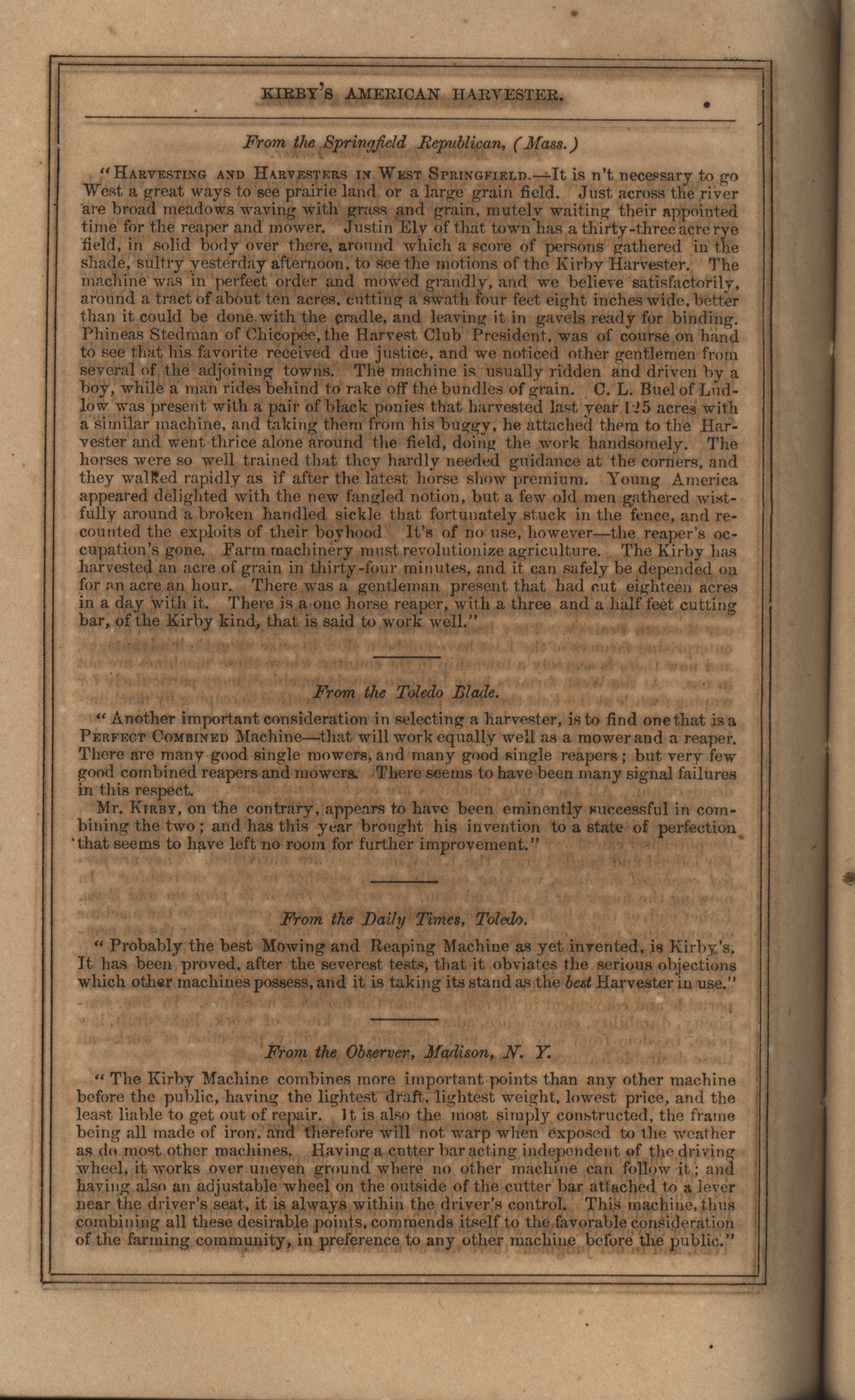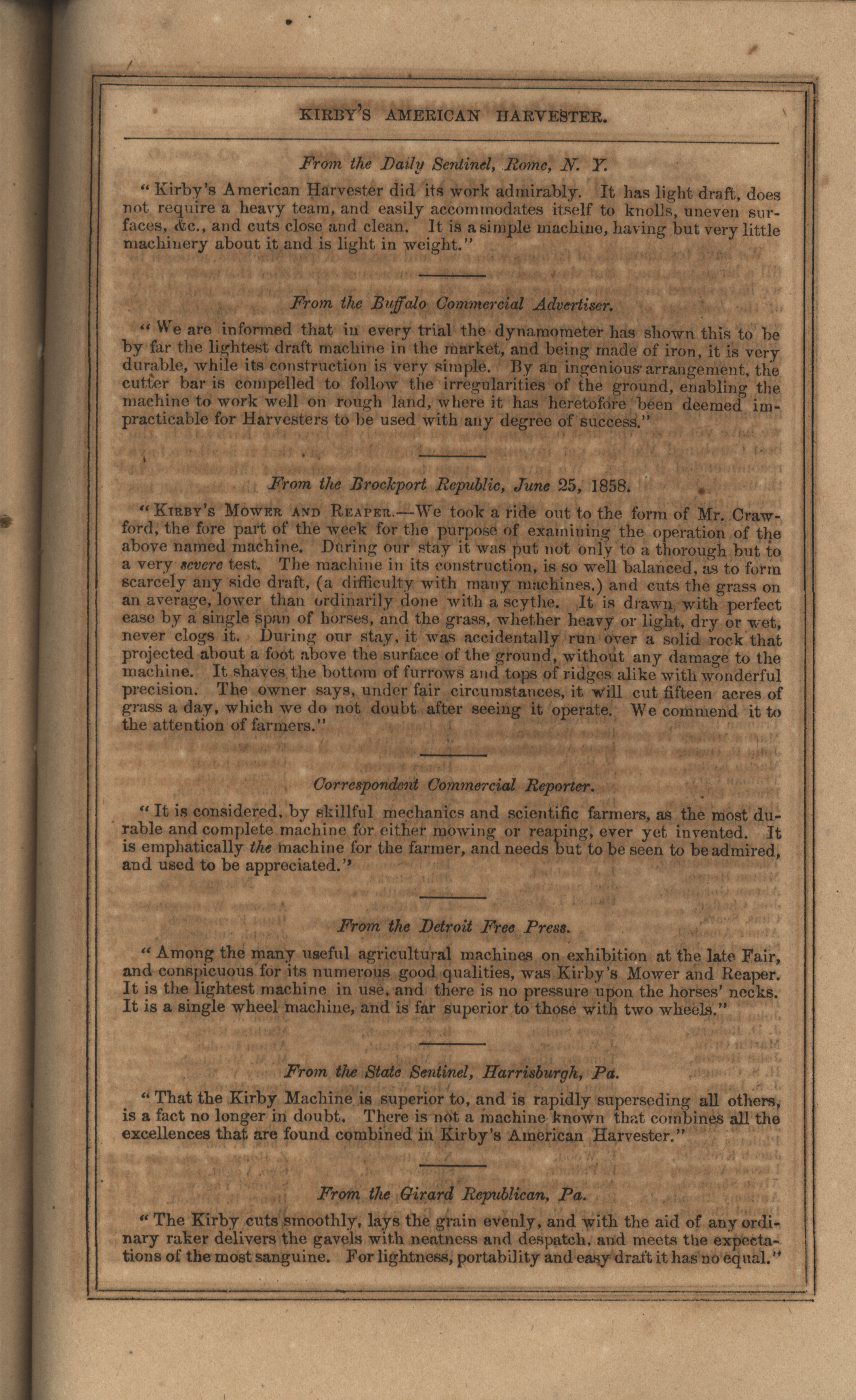- "Buffalo Agricultural Machine Works Kirby's American Harvester catalog", Agricultural Machinery Literature Collection, Iowa State University Library Digital Collections